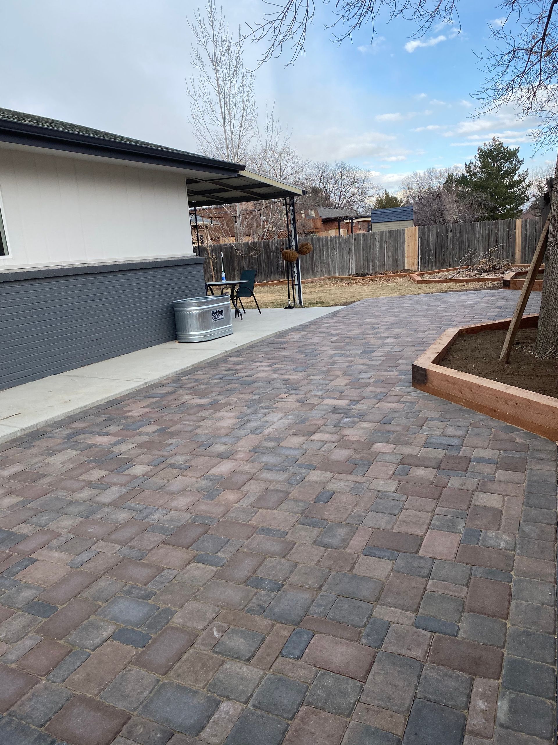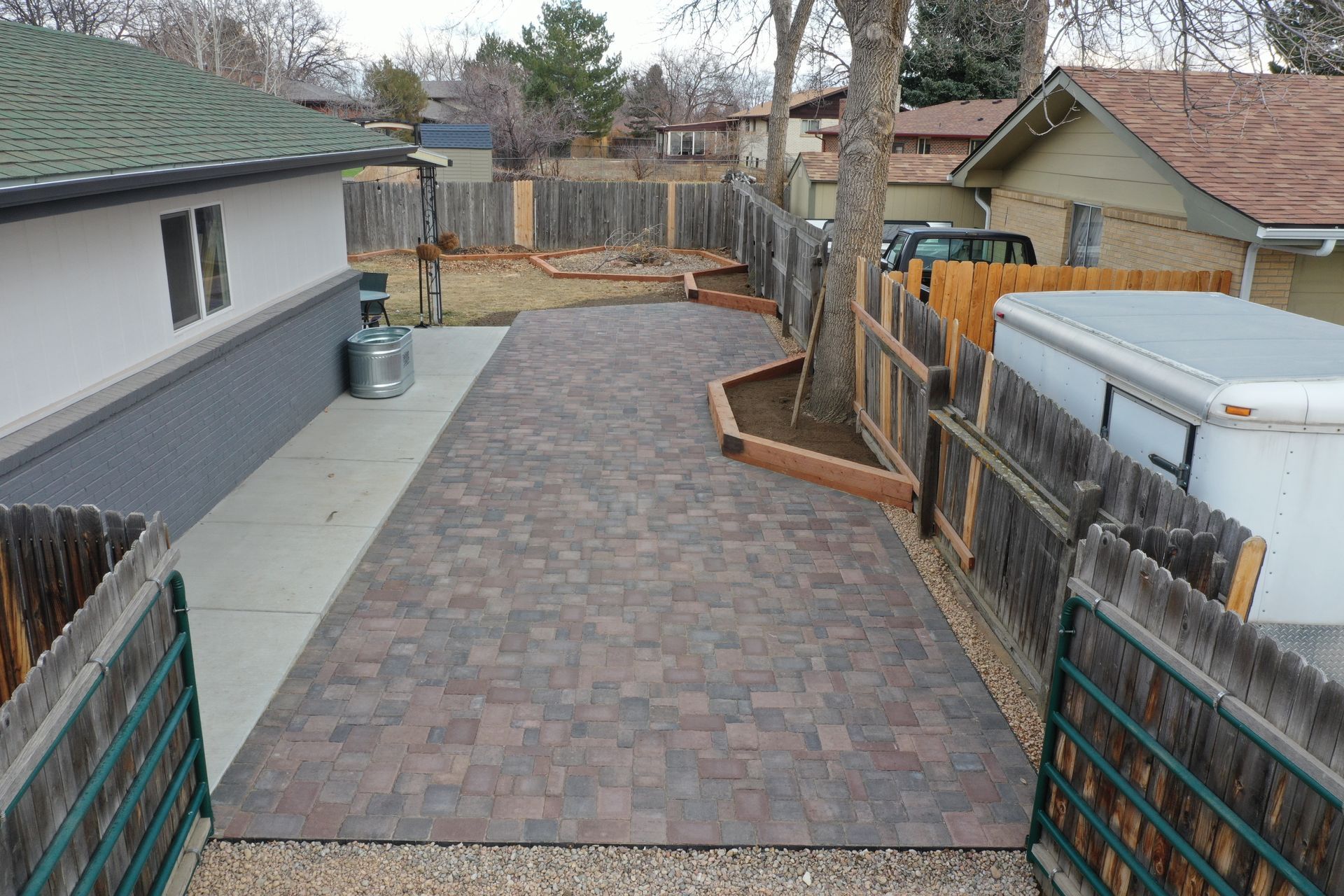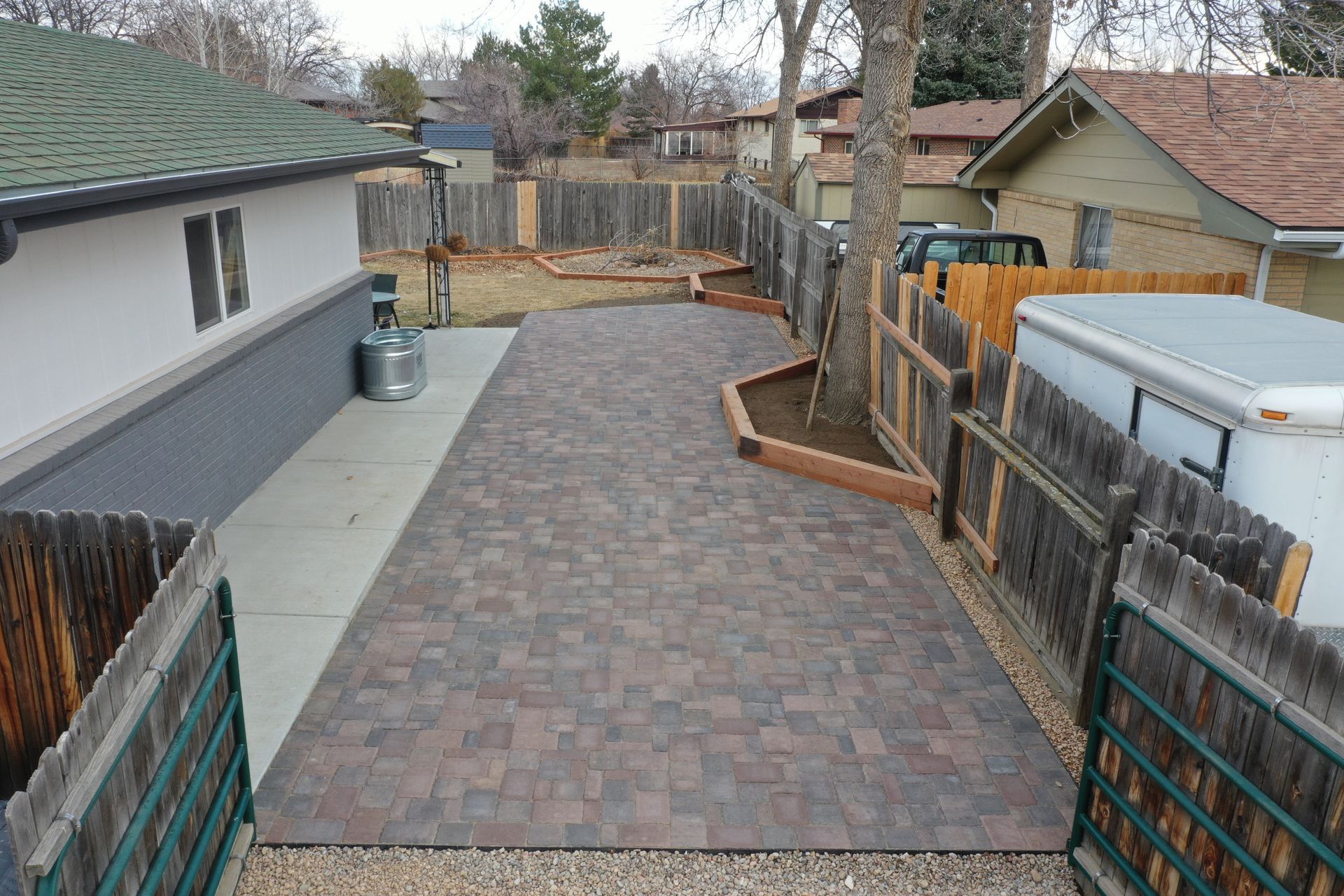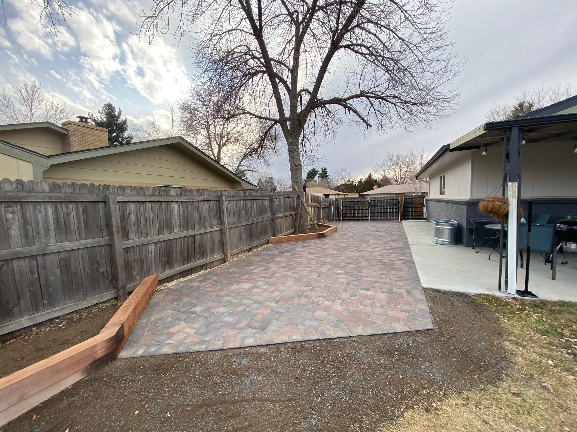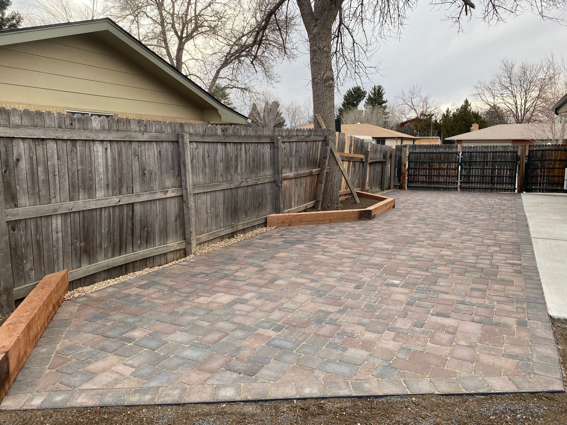 Install of paver patio and driveway that could be used for vehicular use. Planting boxes around trees using pine timbers. Planting and amending of soil areas in front yard. Longmont, CO 2021 & 2022