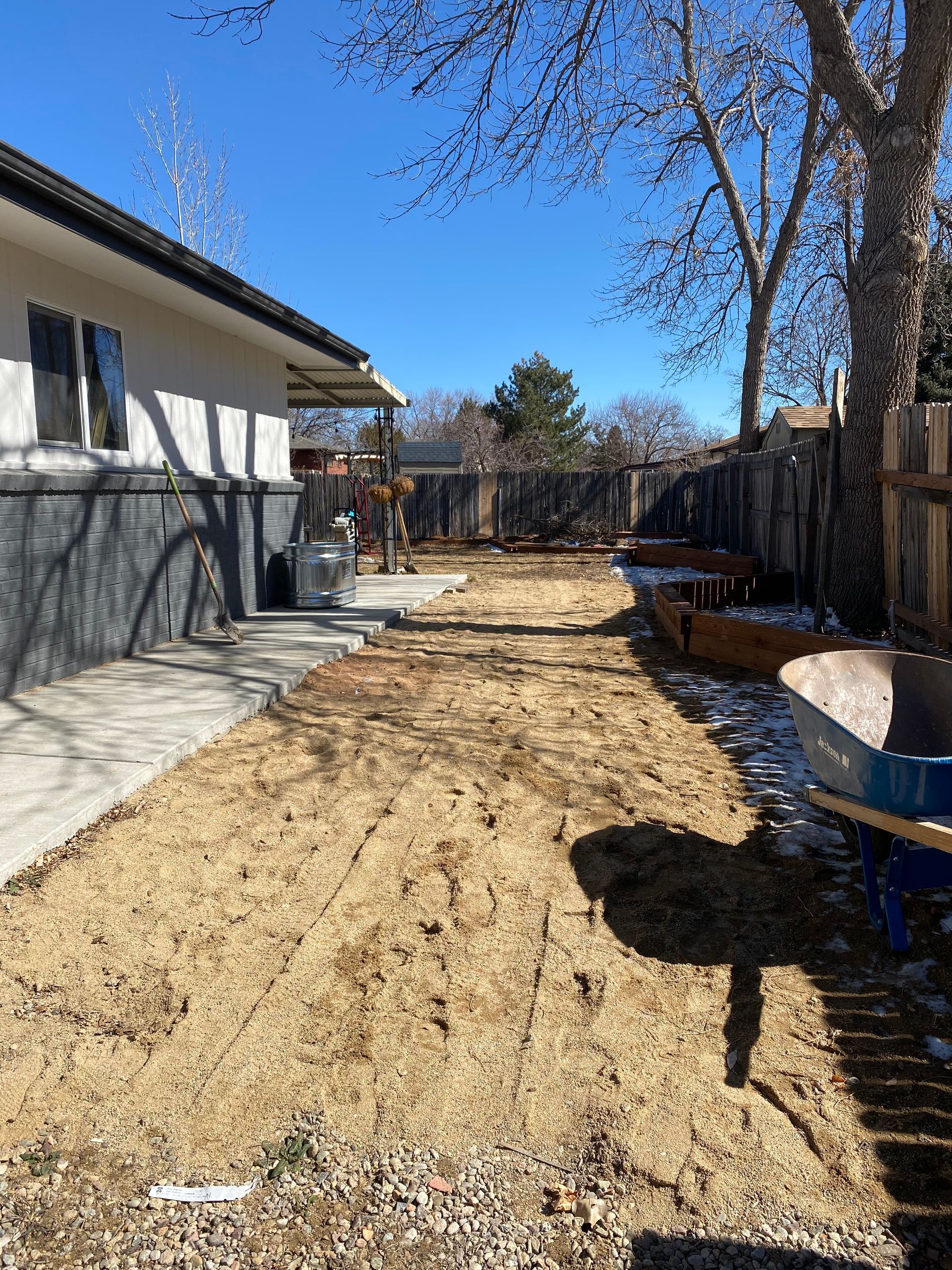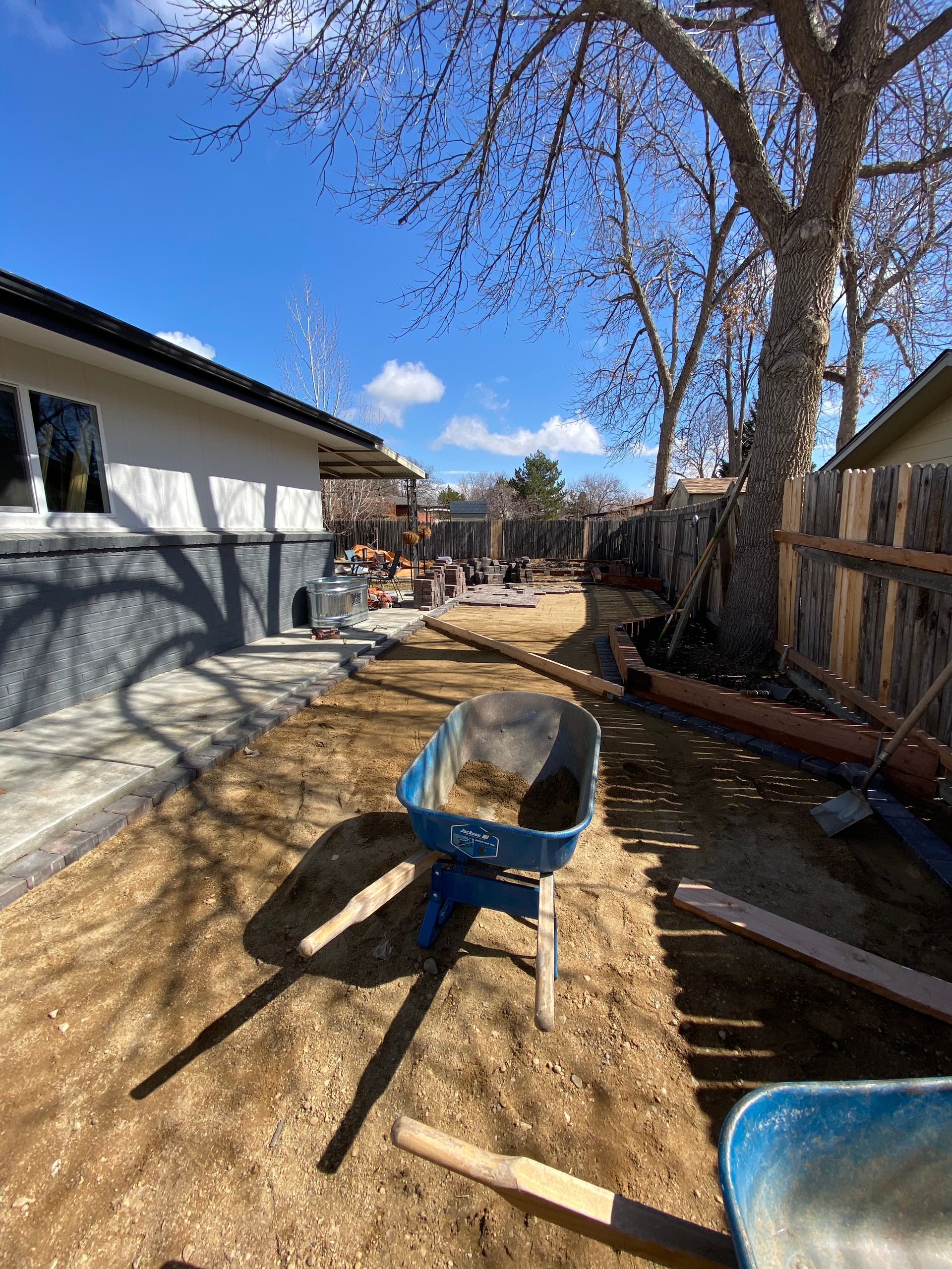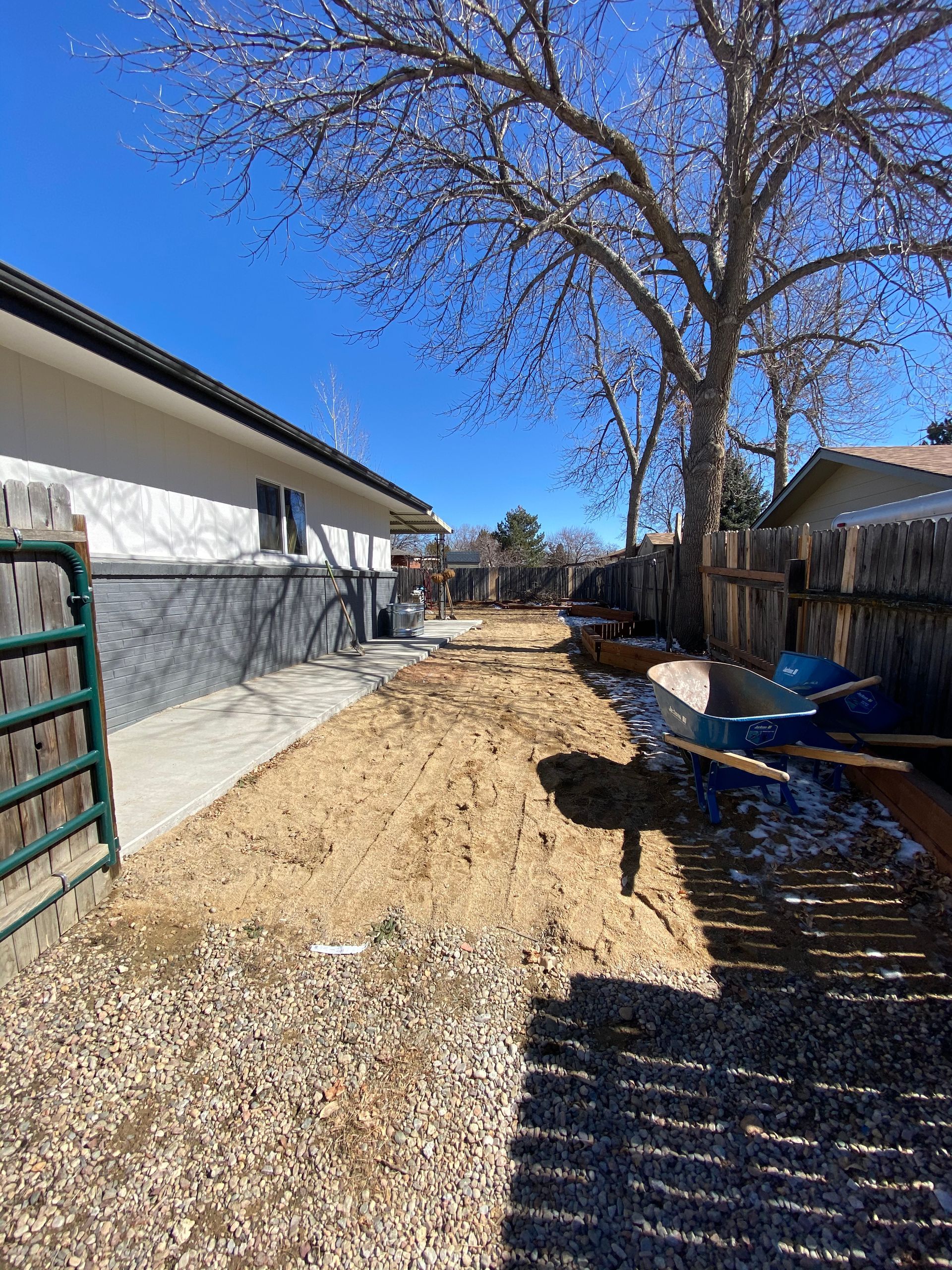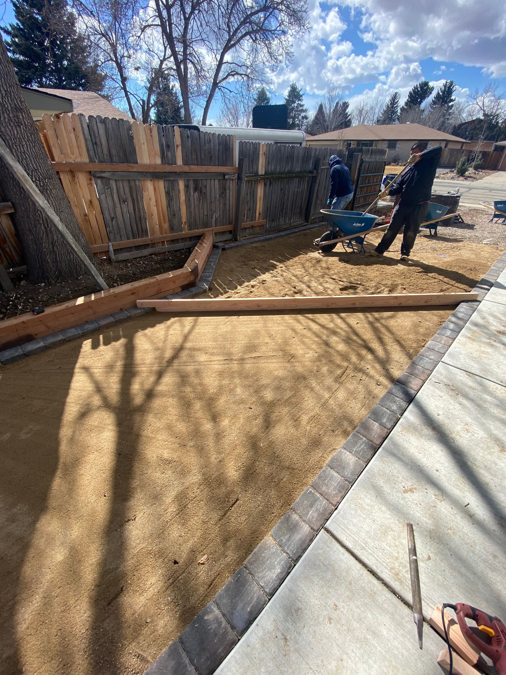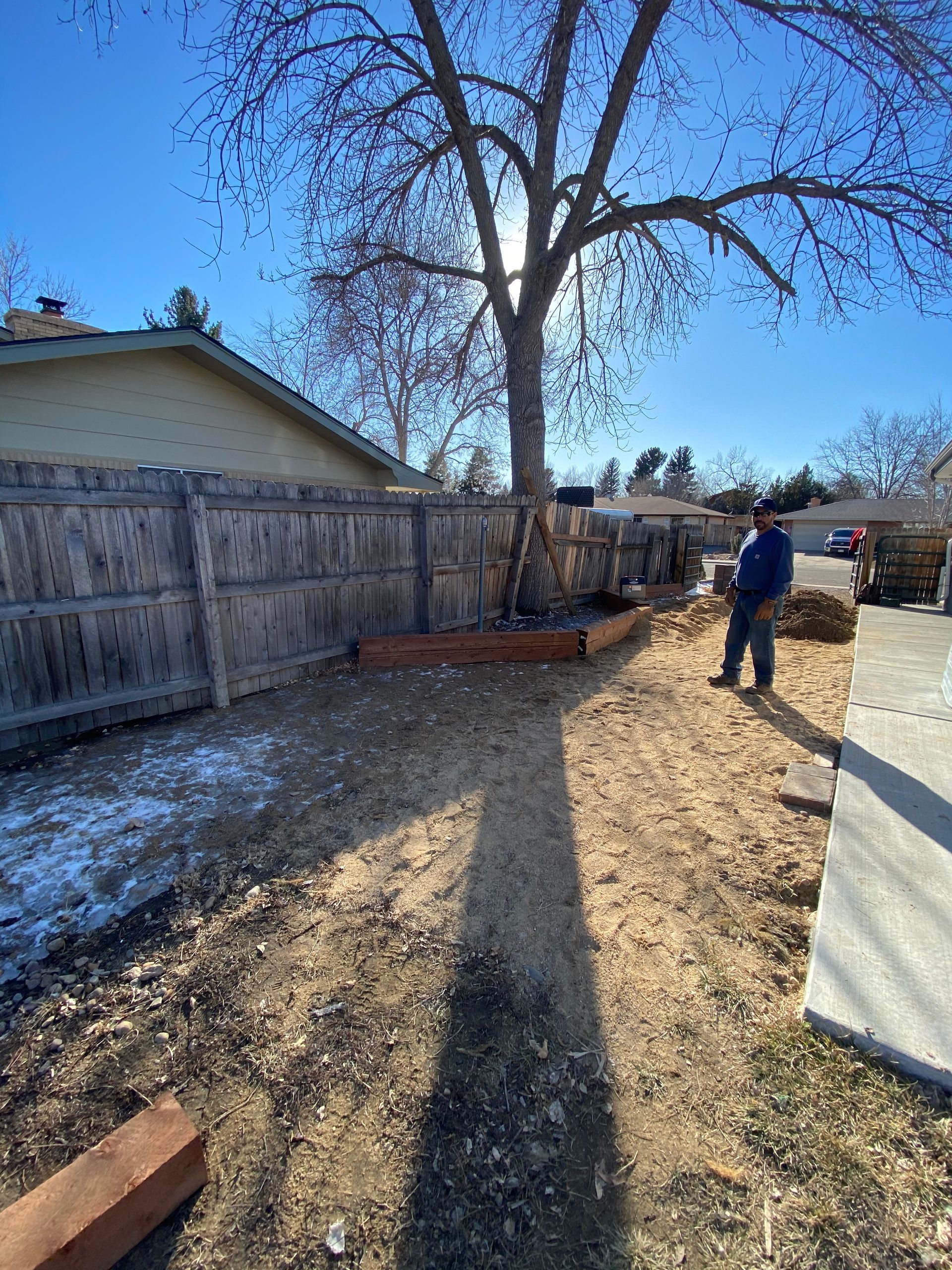 Install of paver patio and driveway that could be used for vehicular use. Planting boxes around trees using pine timbers. Planting and amending of soil areas in front yard. Longmont, CO 2021 & 2022