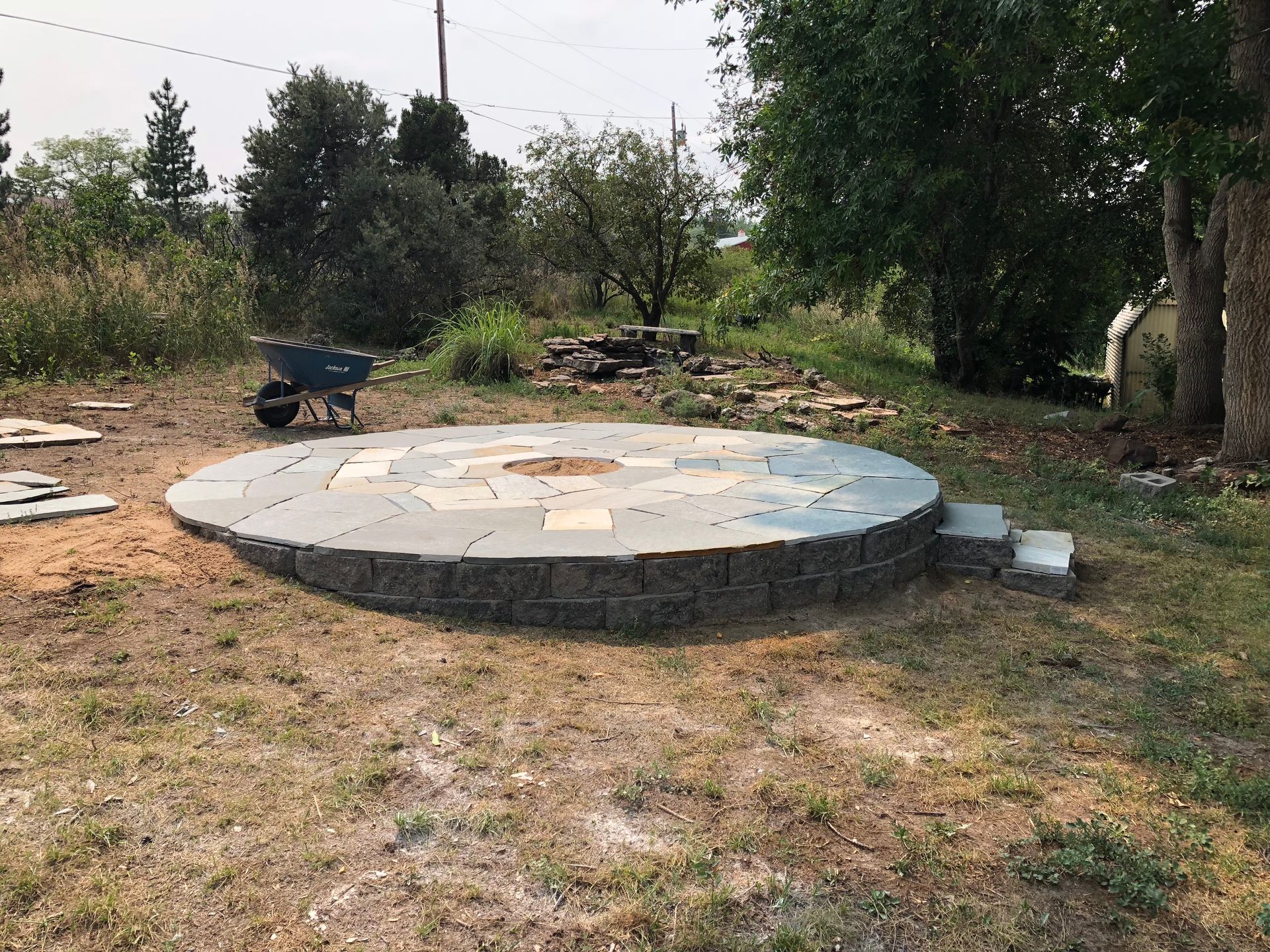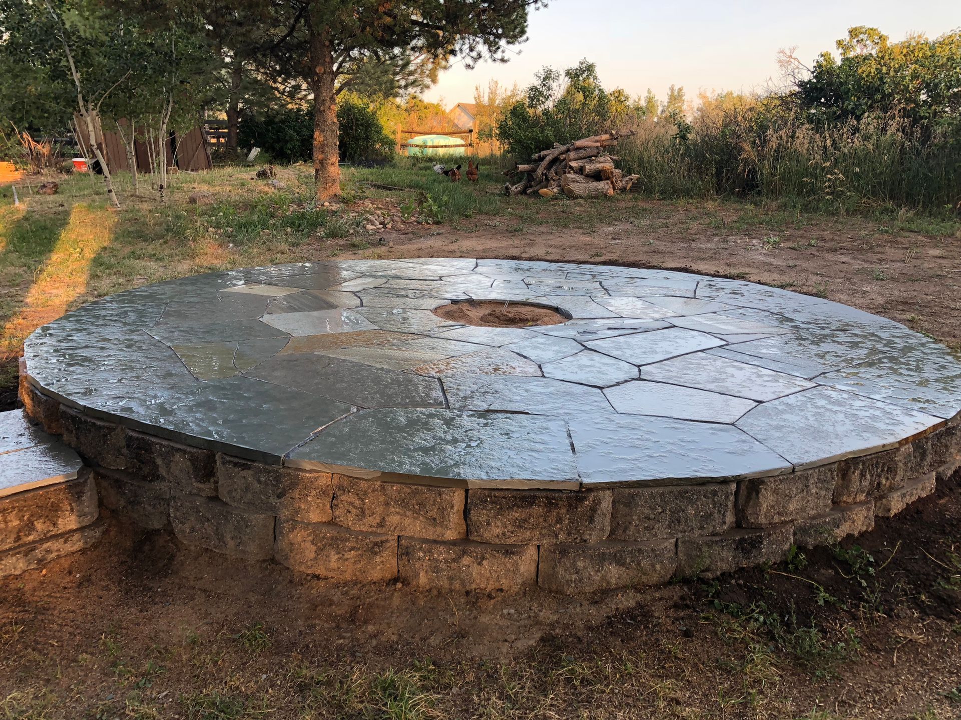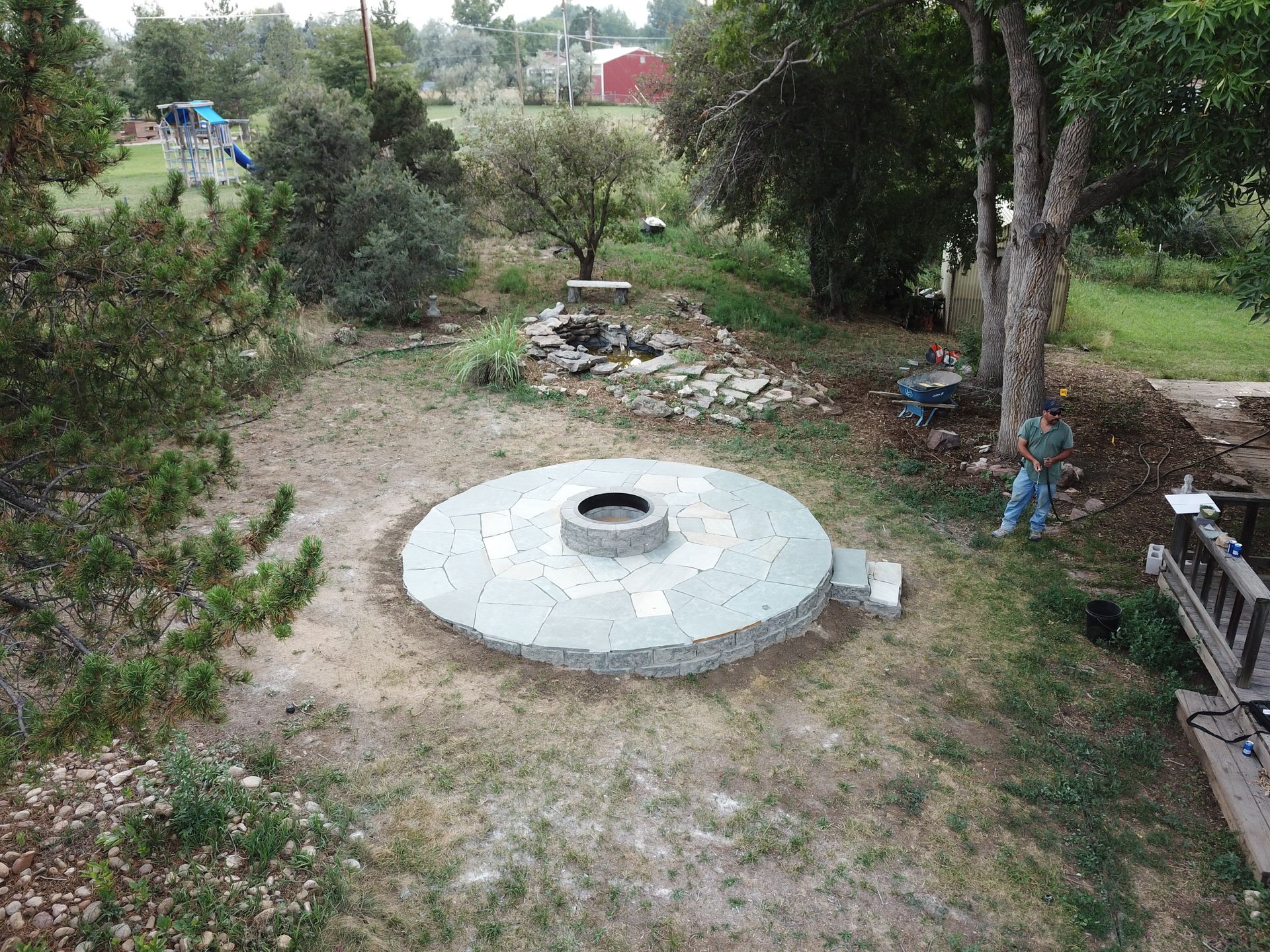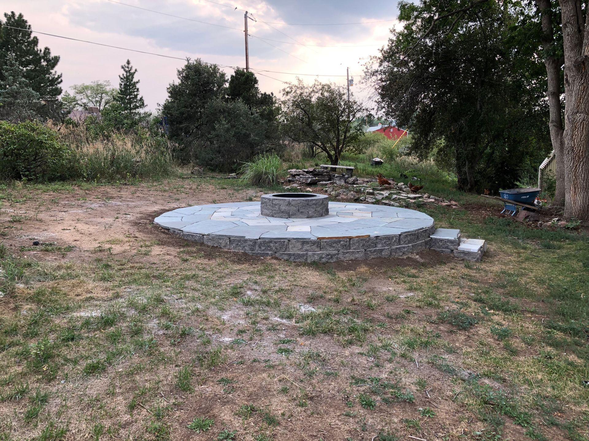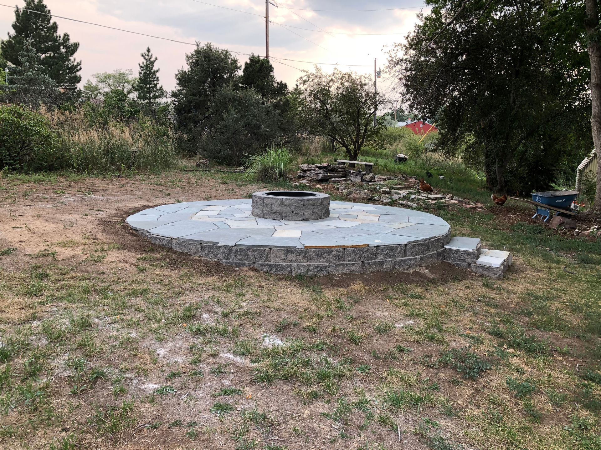 Beautiful circular mixed flagstone patio with wood burning fire pit. Two different flagstones used for design. Major cleanup in other areas. Playground grading and weed fabric with rubber mulch over. Niwot, CO 2019-2022
