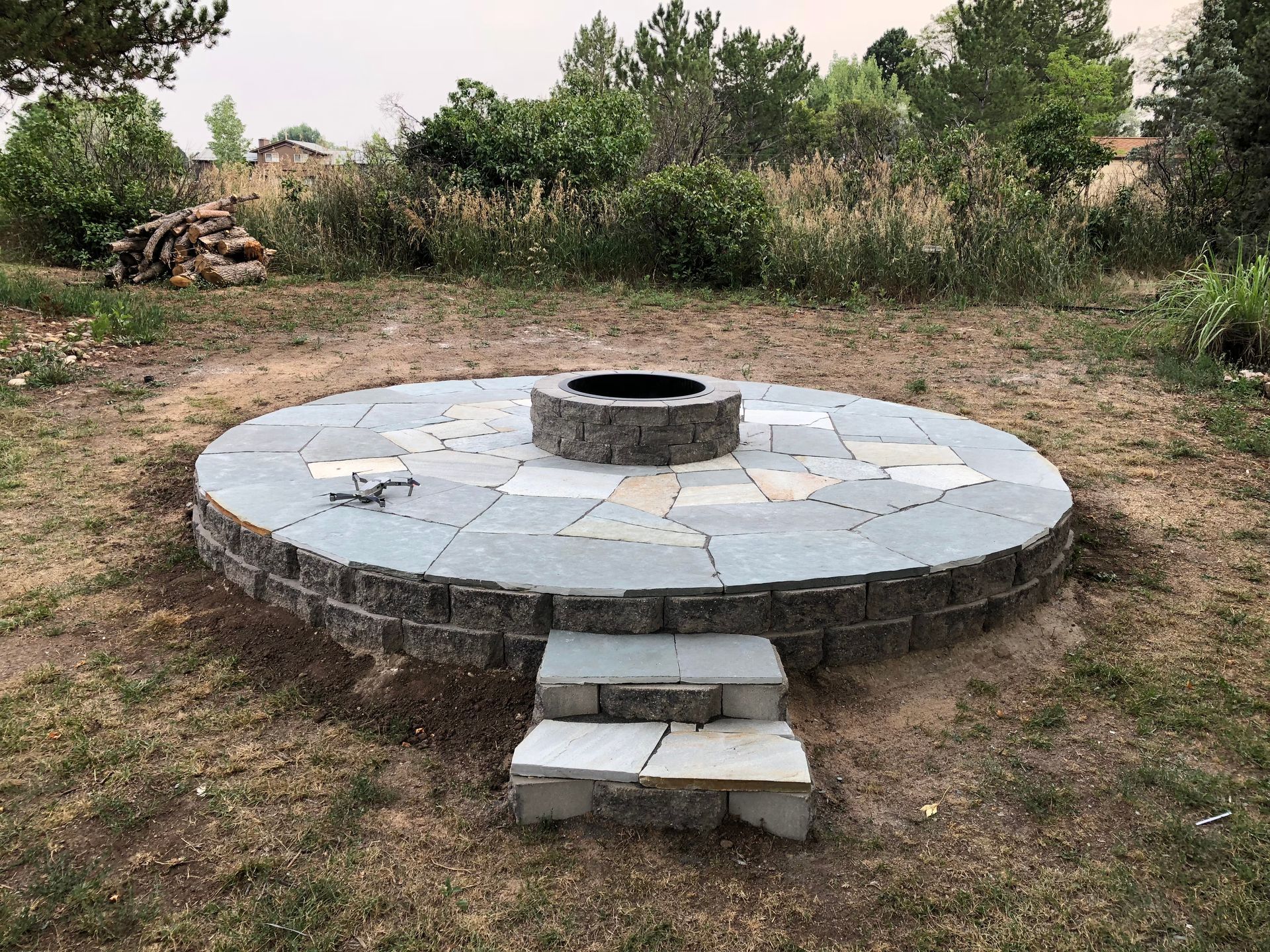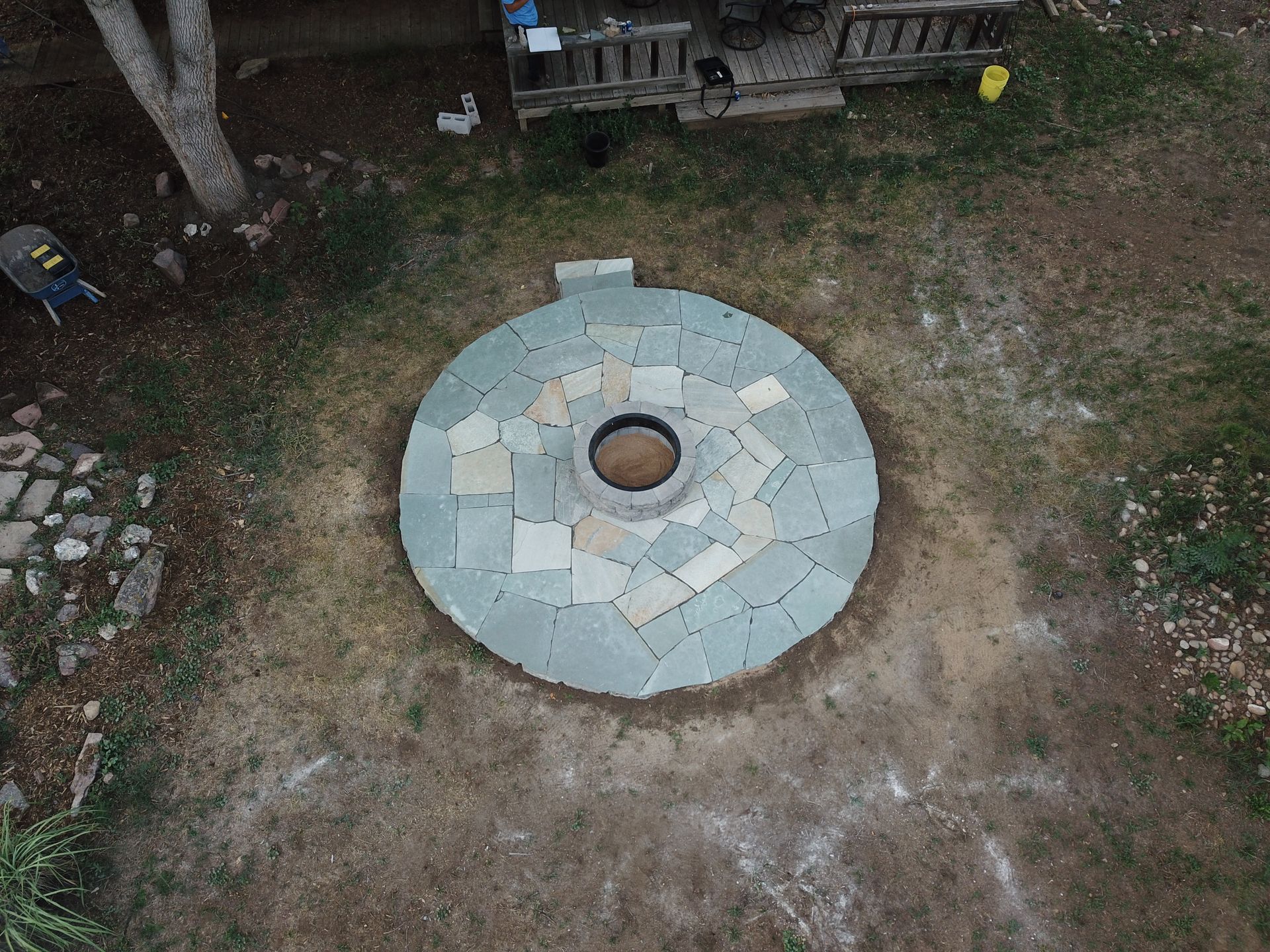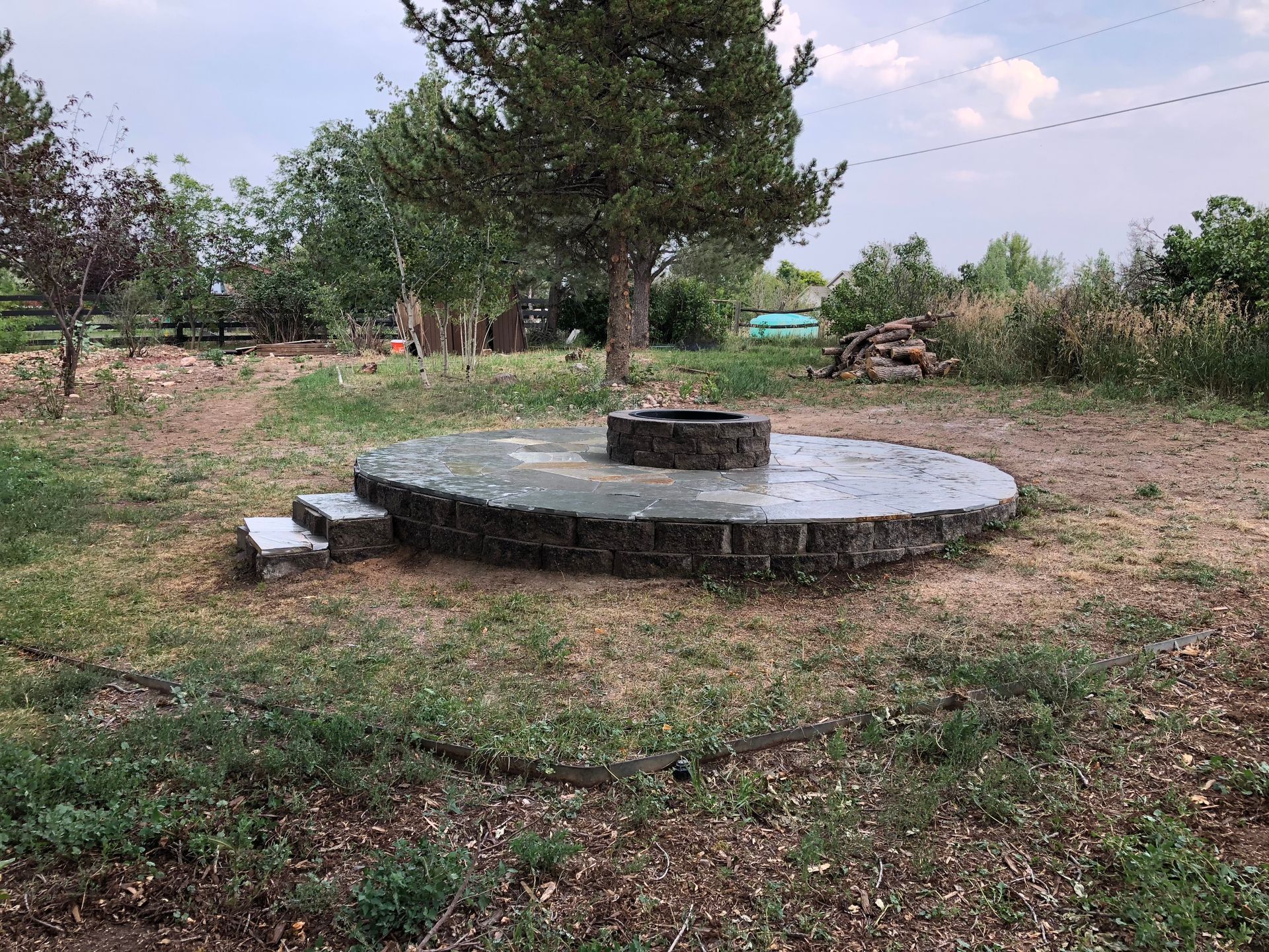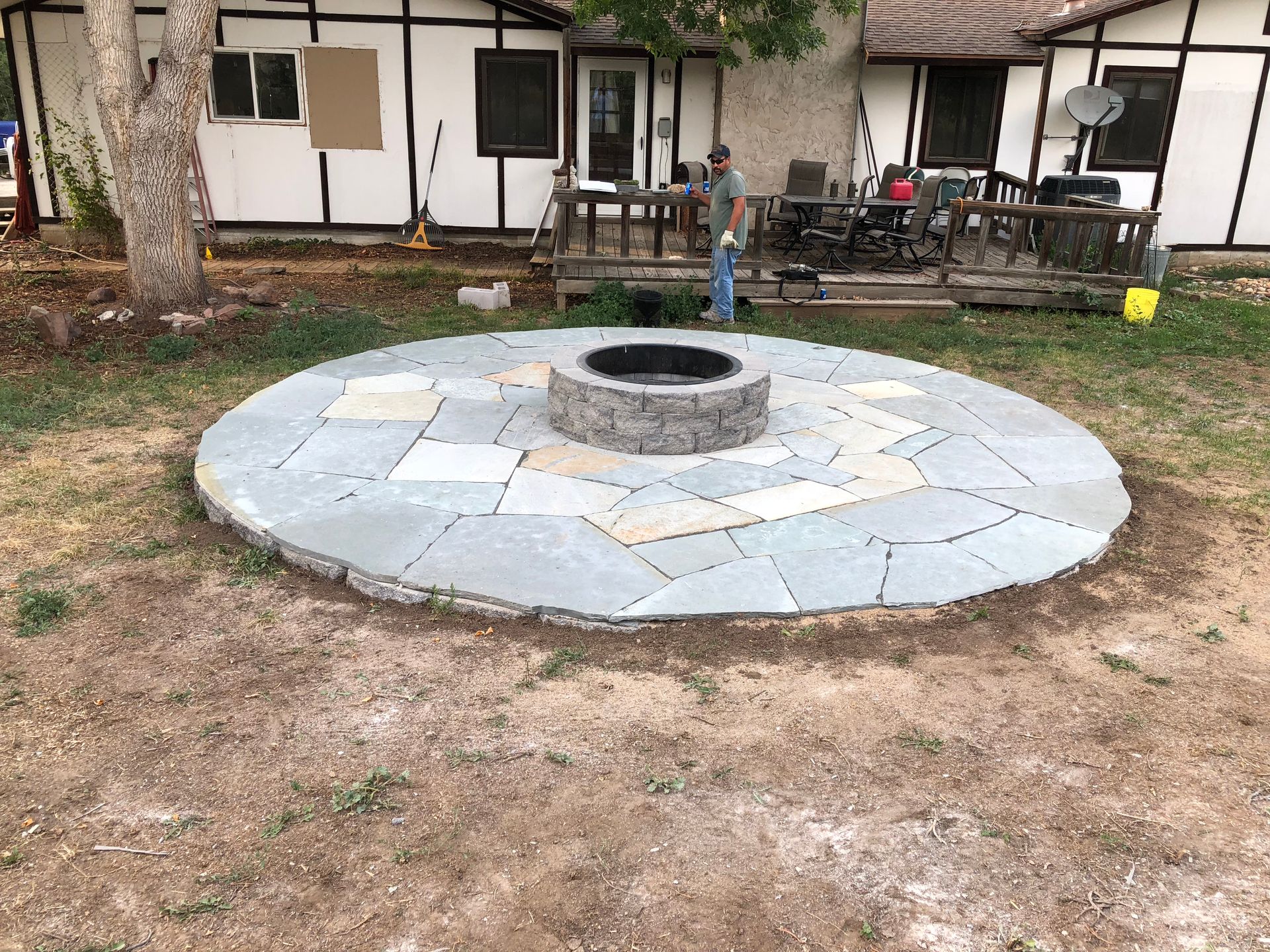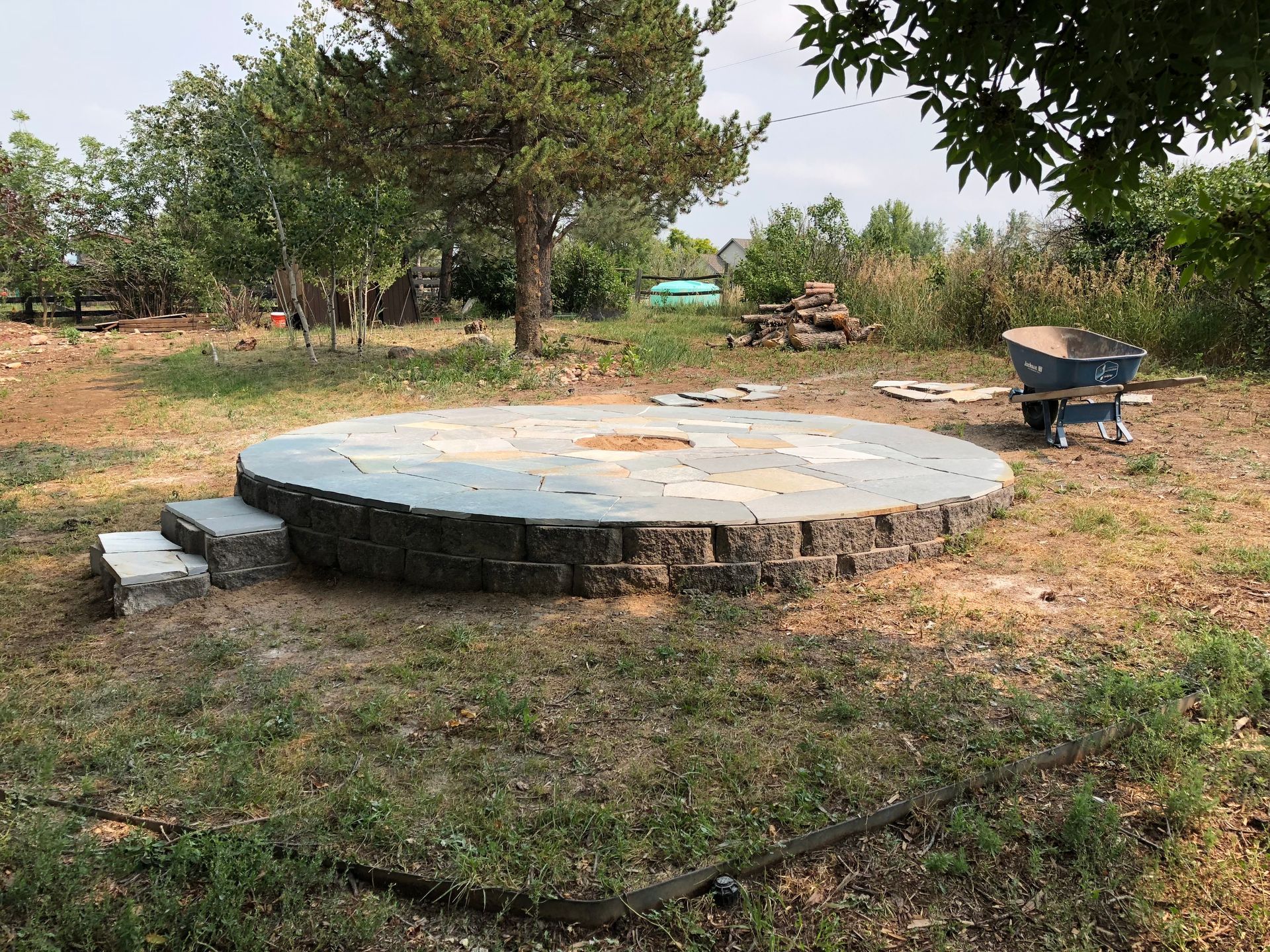 Beautiful circular mixed flagstone patio with wood burning fire pit. Two different flagstones used for design. Major cleanup in other areas. Playground grading and weed fabric with rubber mulch over. Niwot, CO 2019-2022