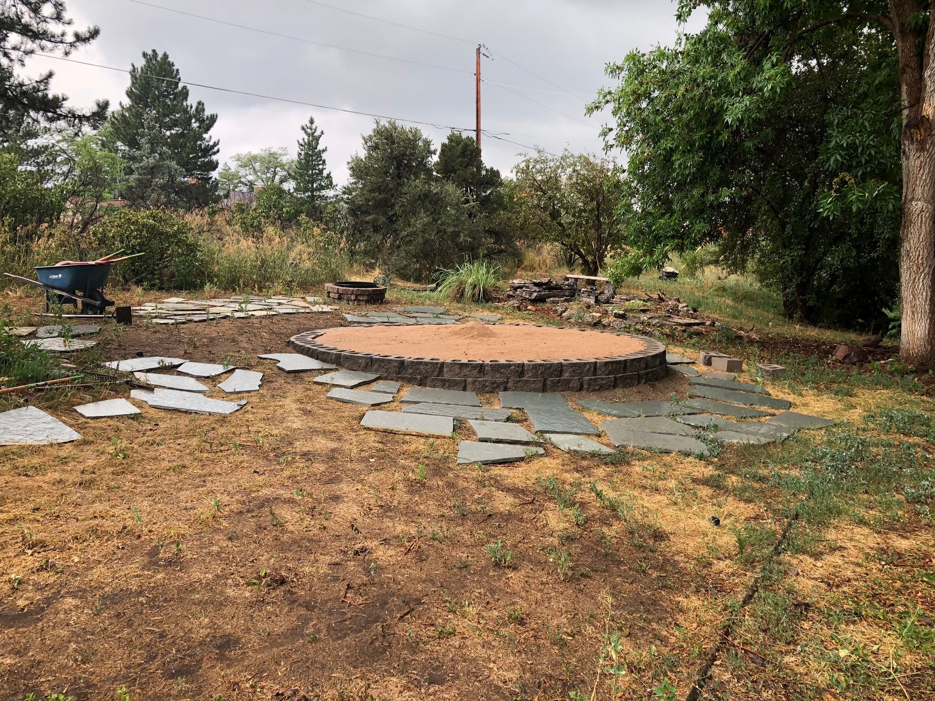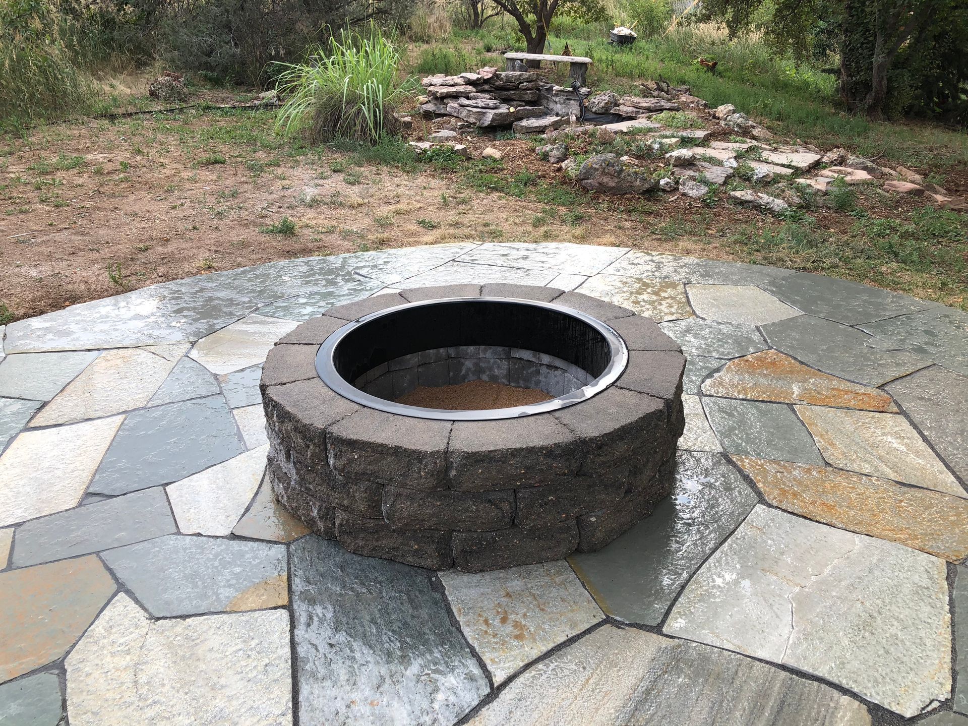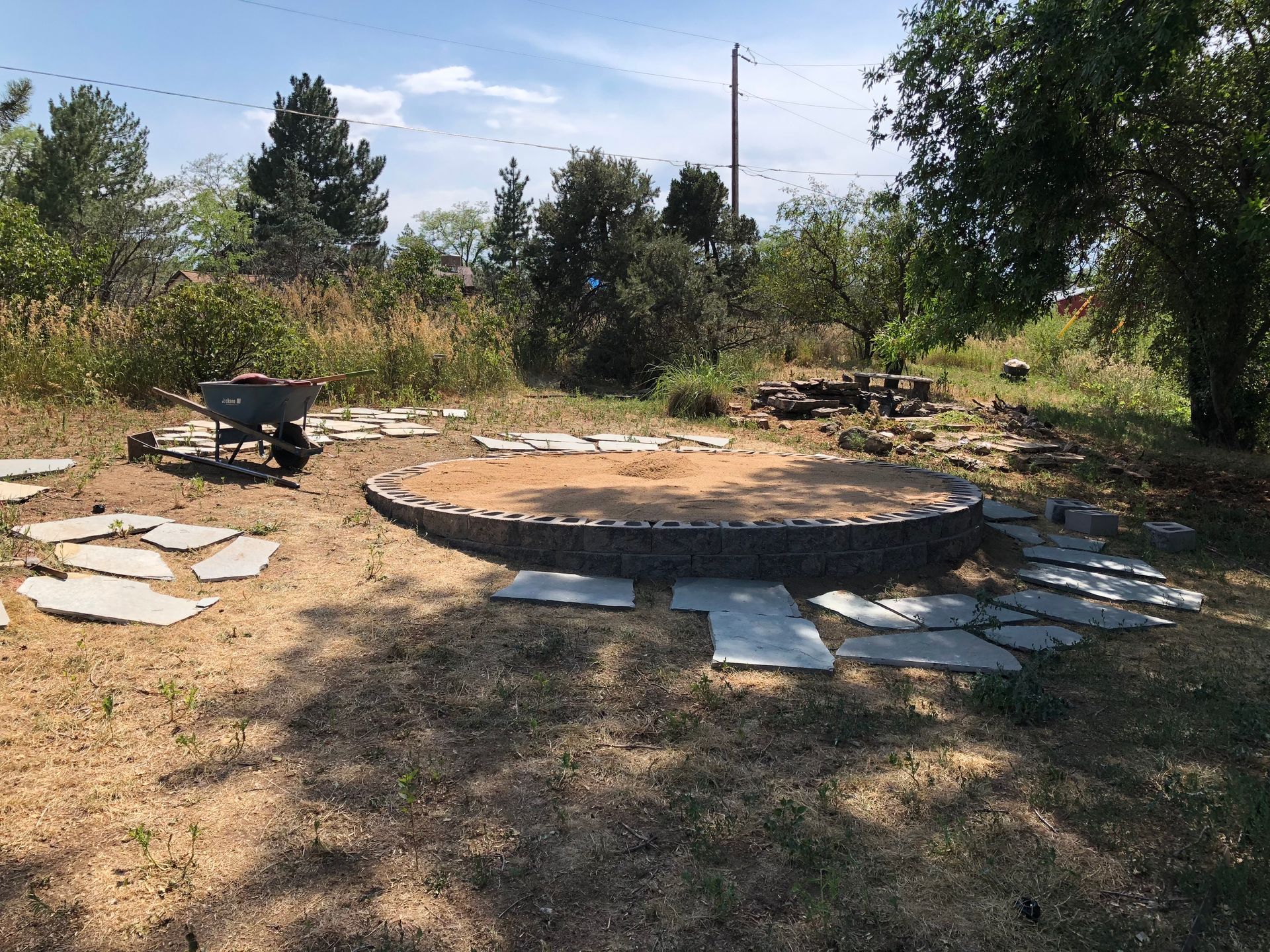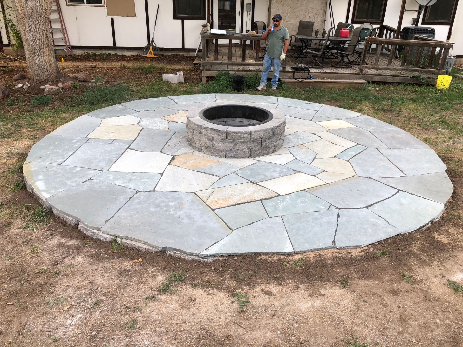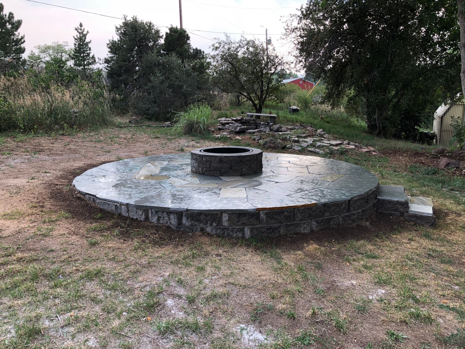 Beautiful circular mixed flagstone patio with wood burning fire pit. Two different flagstones used for design. Major cleanup in other areas. Playground grading and weed fabric with rubber mulch over. Niwot, CO 2019-2022