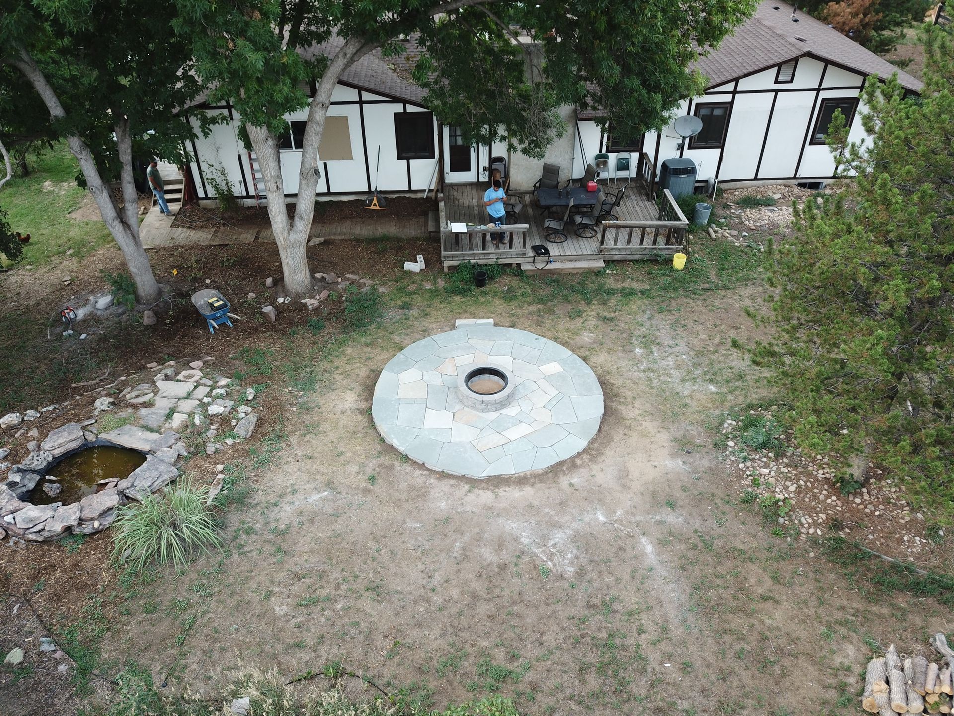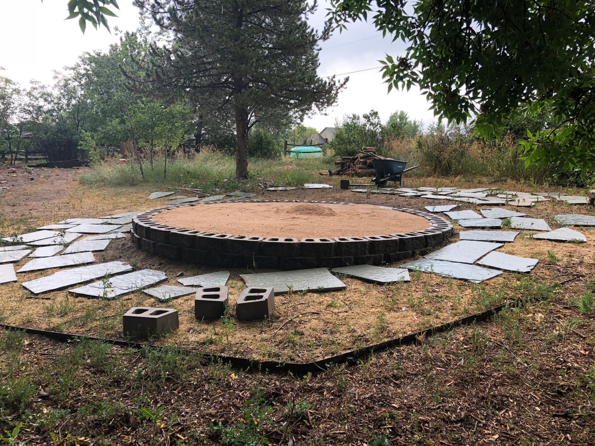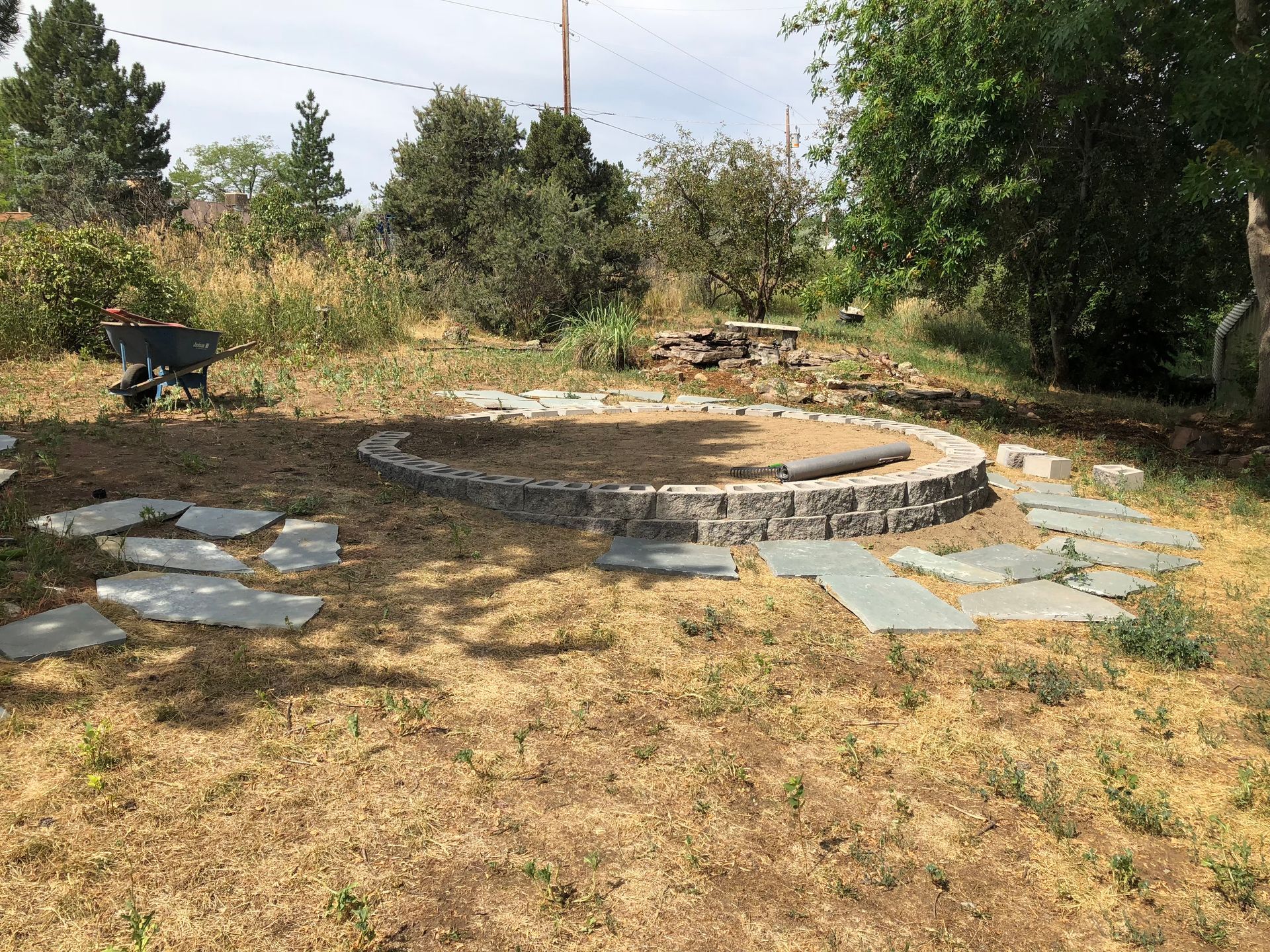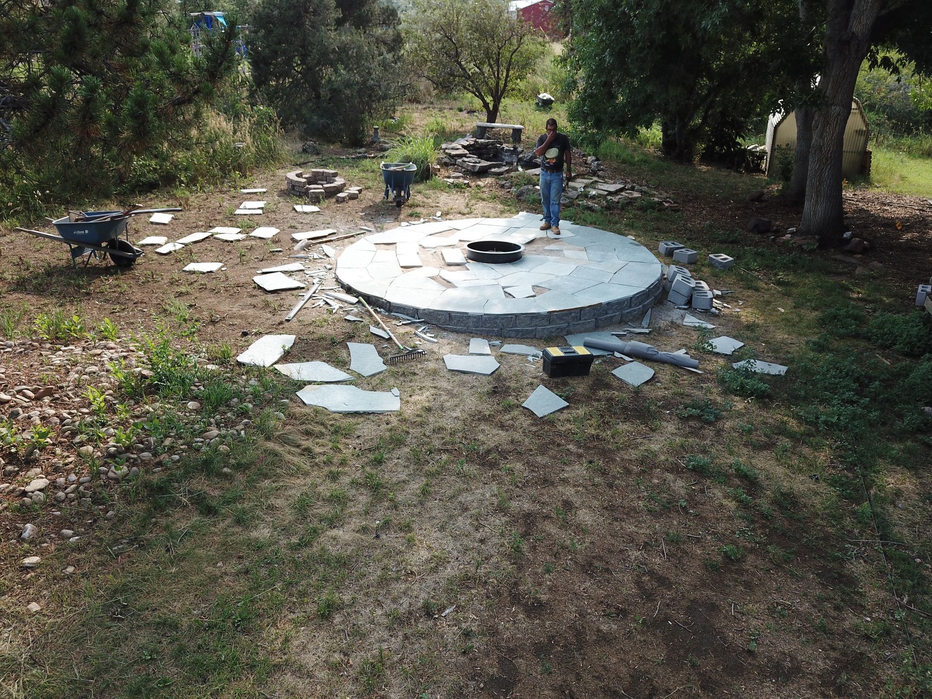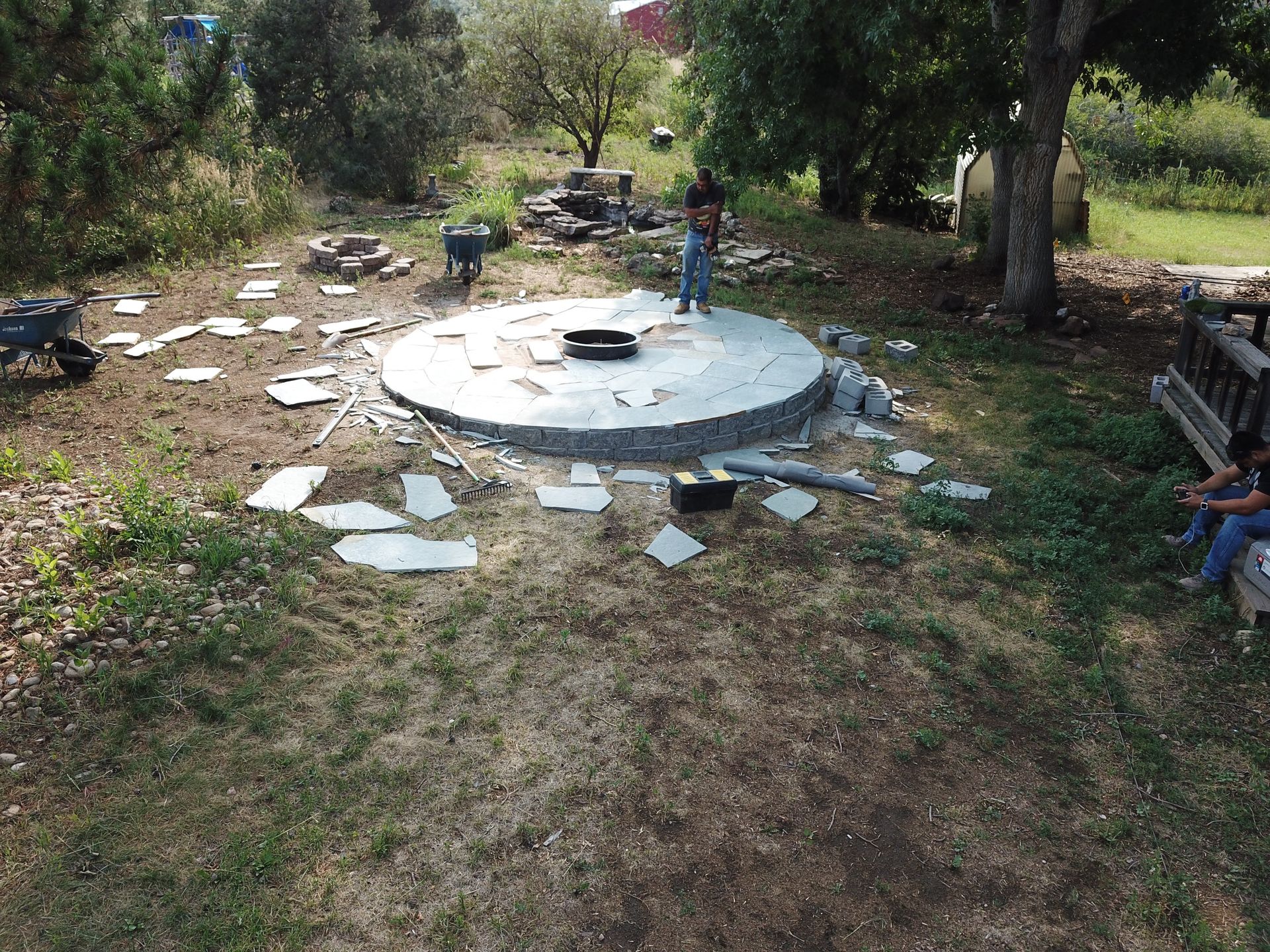 Beautiful circular mixed flagstone patio with wood burning fire pit. Two different flagstones used for design. Major cleanup in other areas. Playground grading and weed fabric with rubber mulch over. Niwot, CO 2019-2022