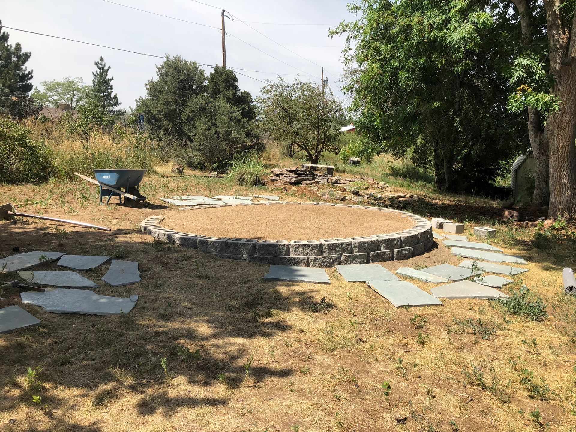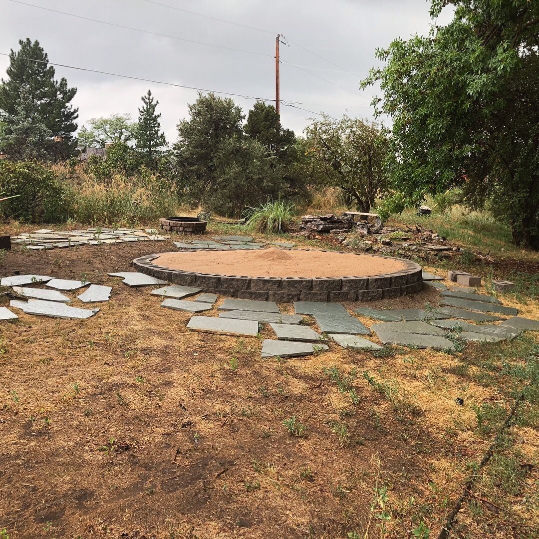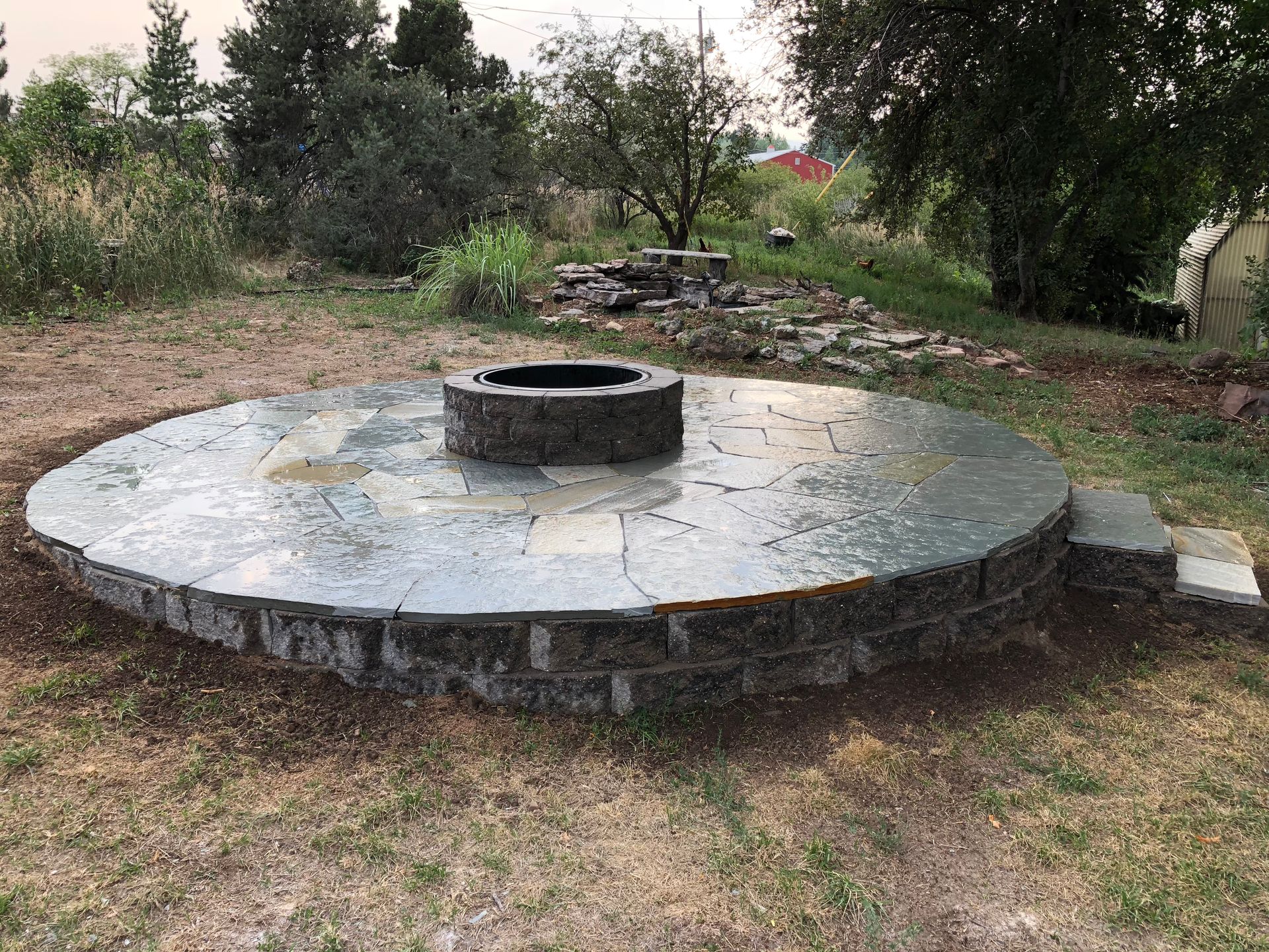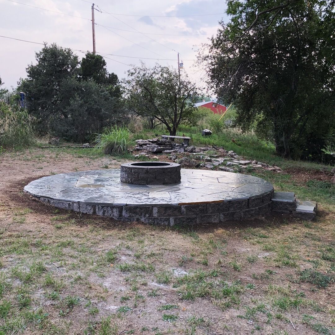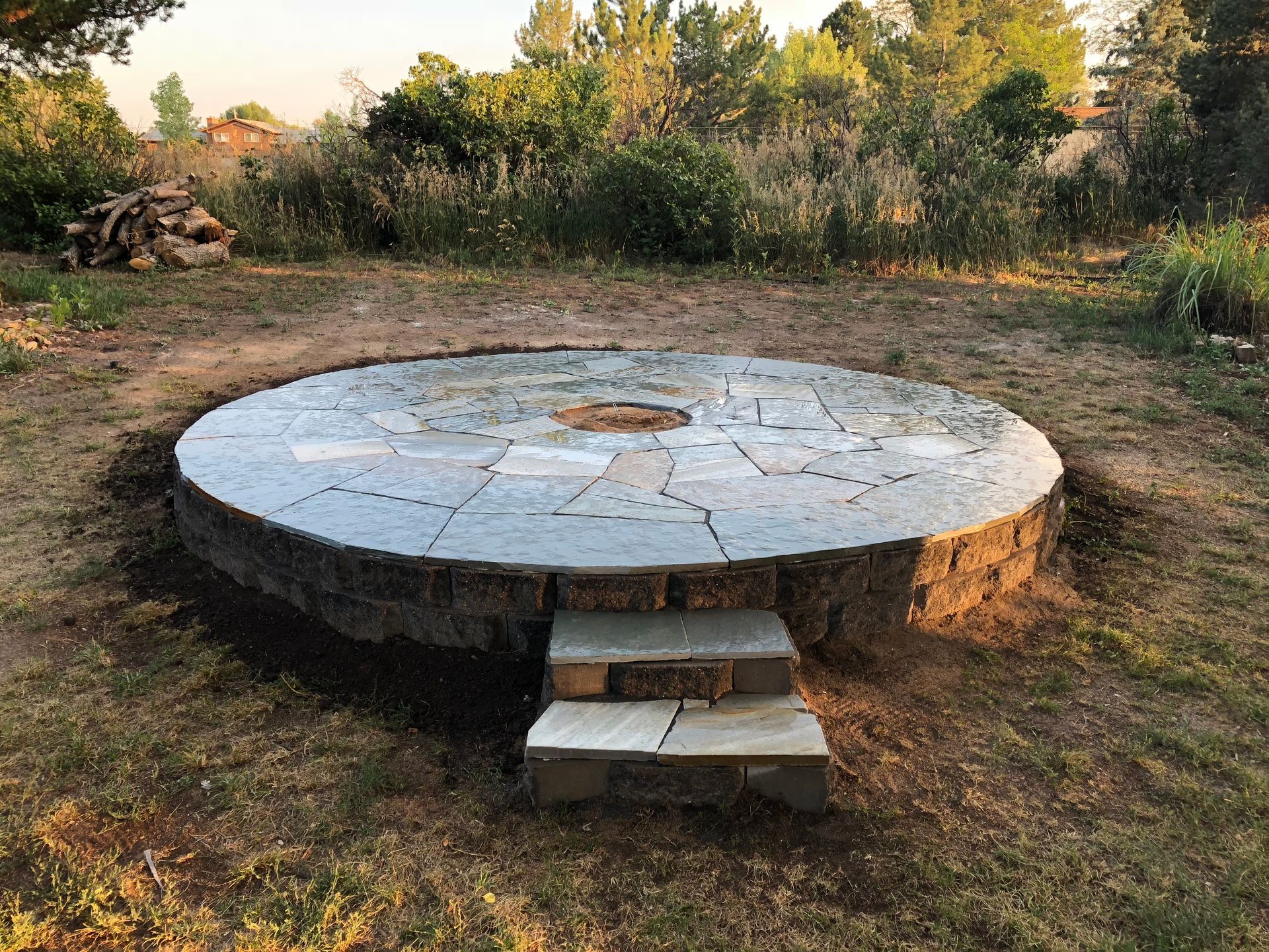 Beautiful circular mixed flagstone patio with wood burning fire pit. Two different flagstones used for design. Major cleanup in other areas. Playground grading and weed fabric with rubber mulch over. Niwot, CO 2019-2022