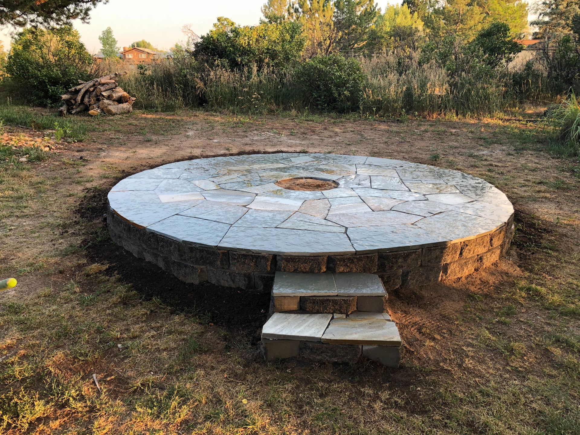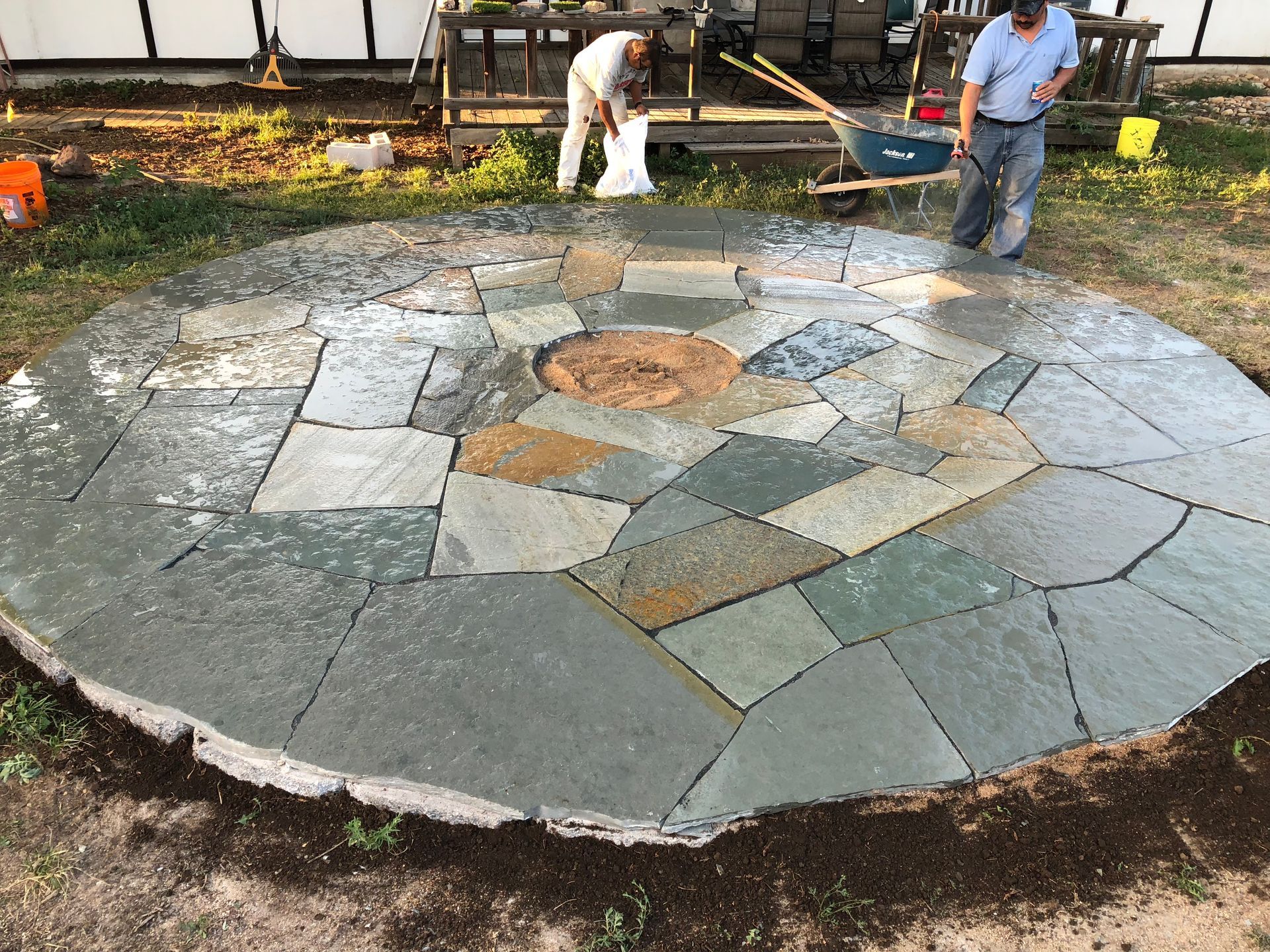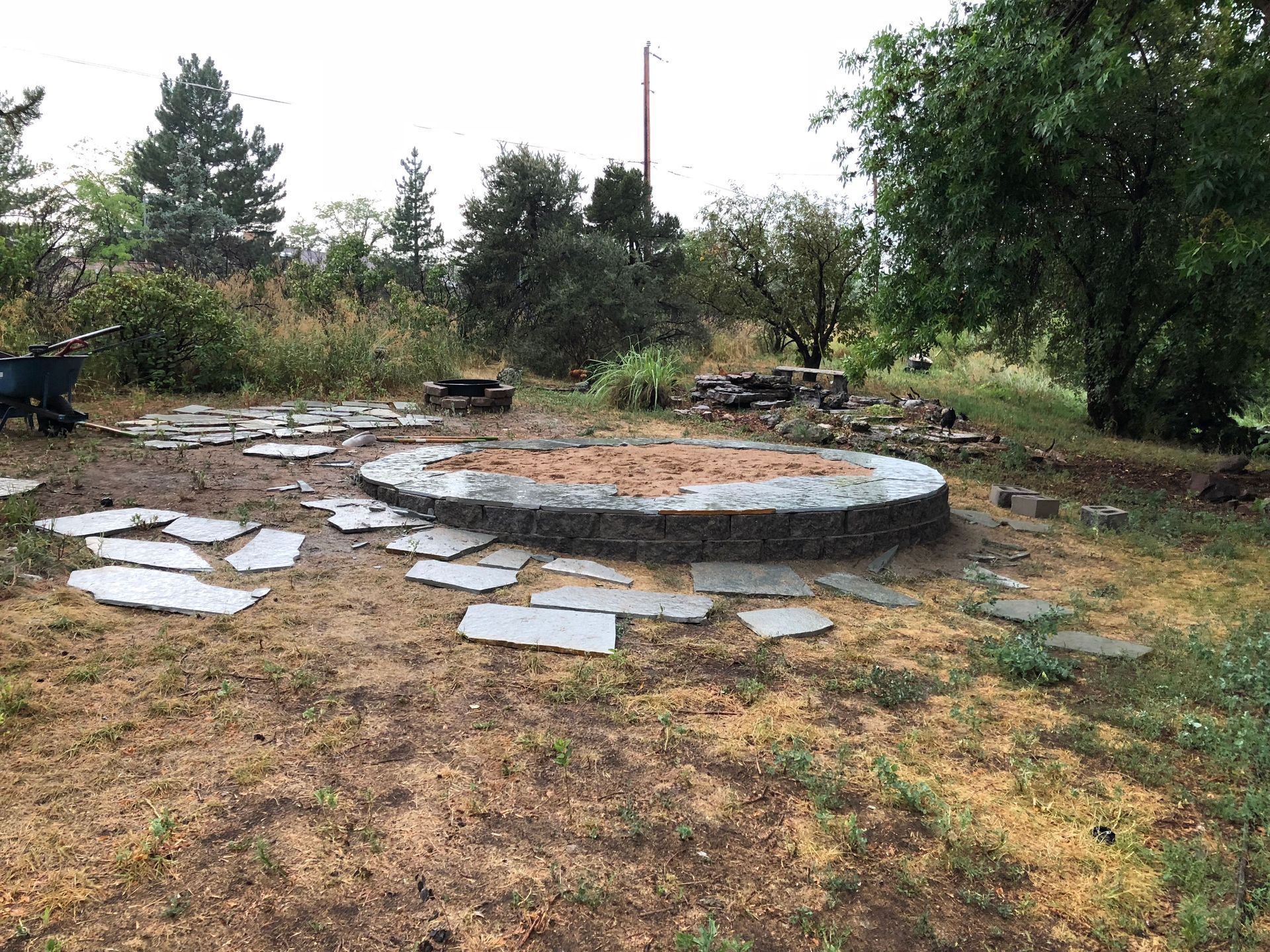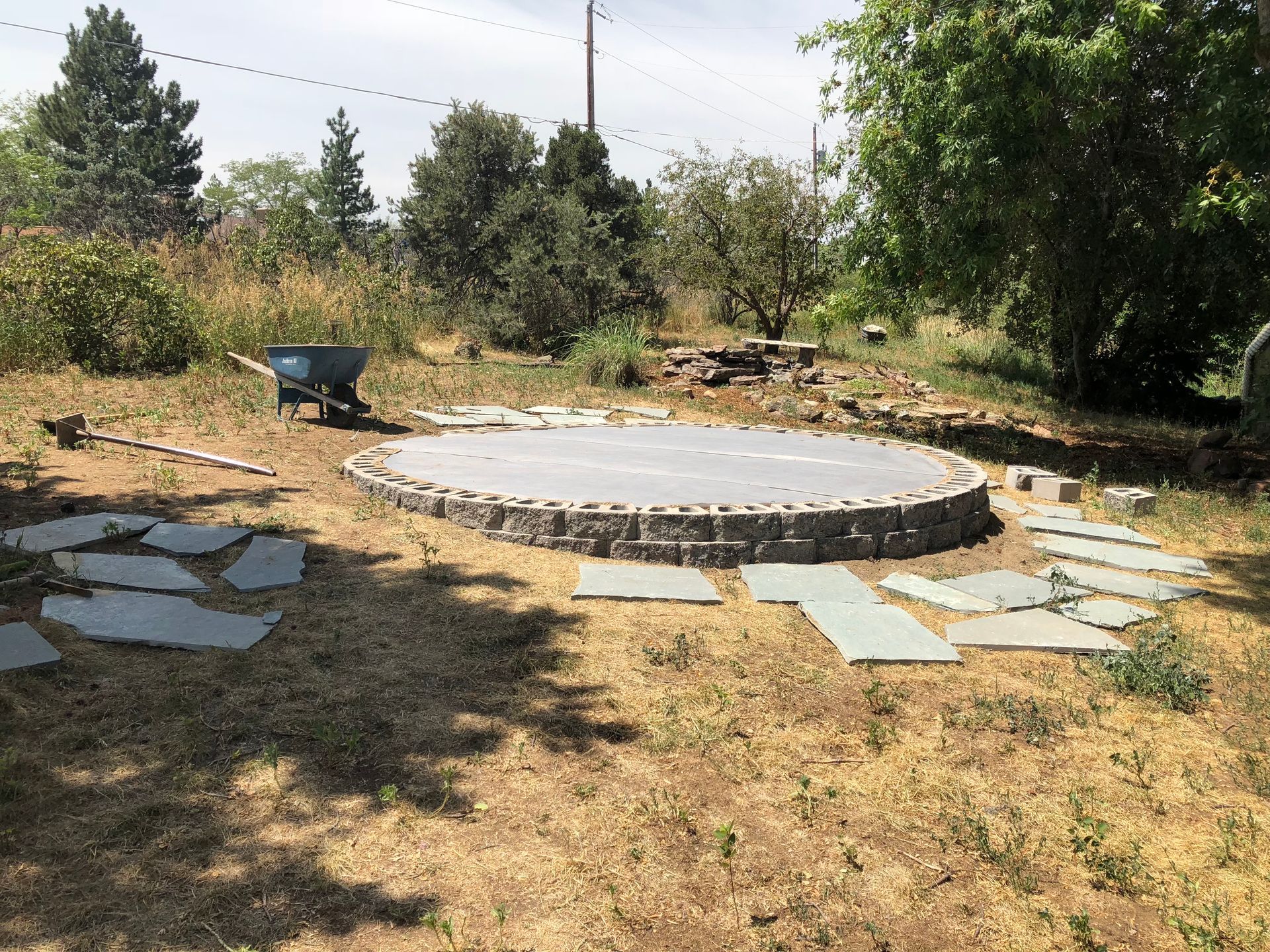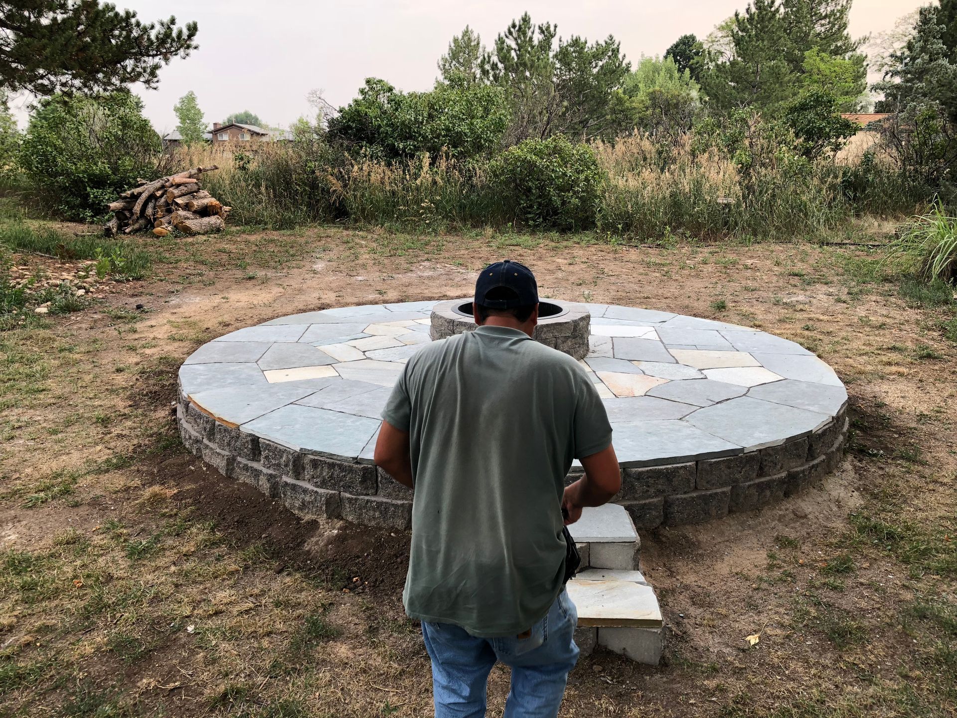 Beautiful circular mixed flagstone patio with wood burning fire pit. Two different flagstones used for design. Major cleanup in other areas. Playground grading and weed fabric with rubber mulch over. Niwot, CO 2019-2022
