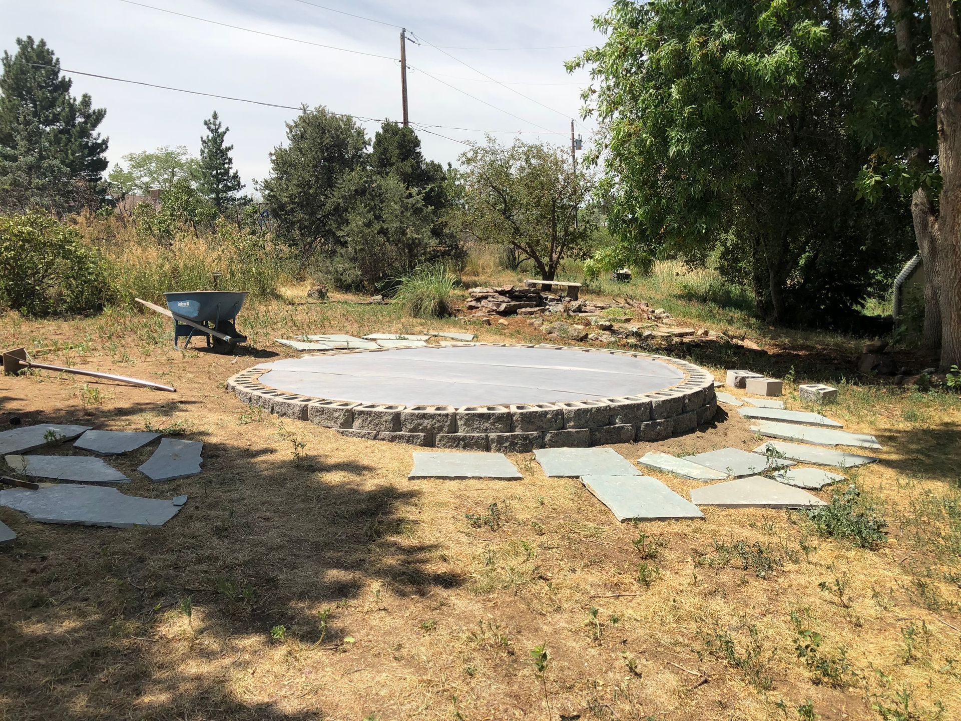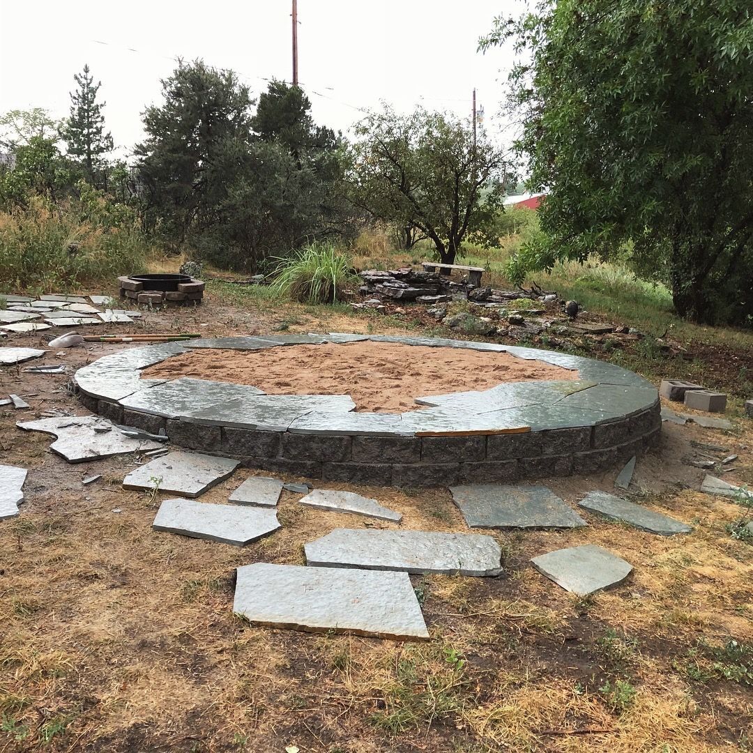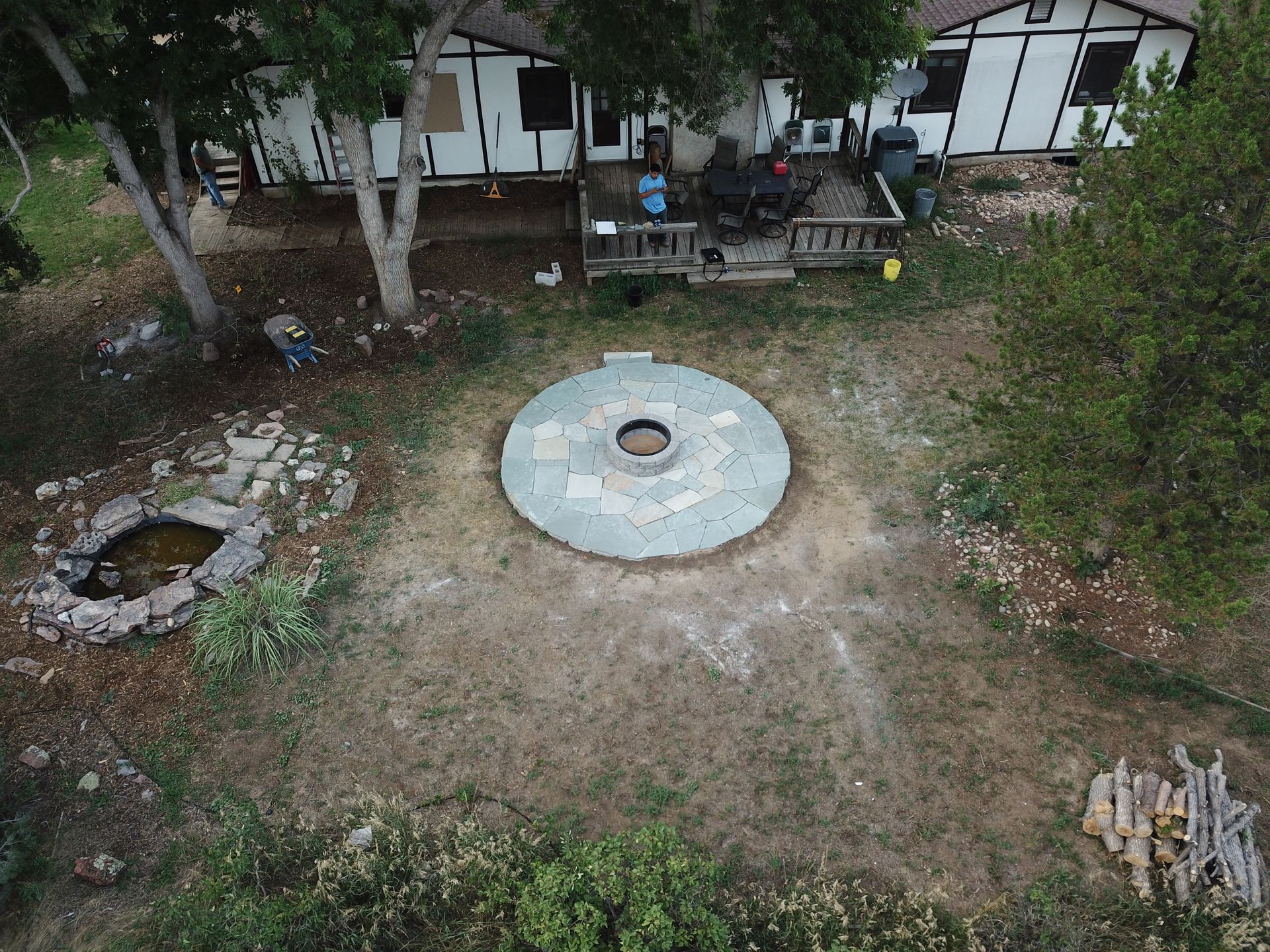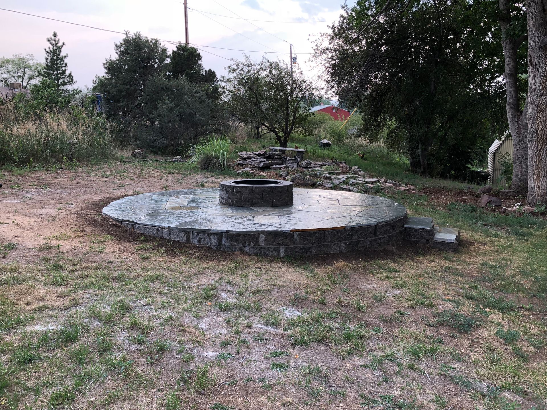 Beautiful circular mixed flagstone patio with wood burning fire pit. Two different flagstones used for design. Major cleanup in other areas. Playground grading and weed fabric with rubber mulch over. Niwot, CO 2019-2022
