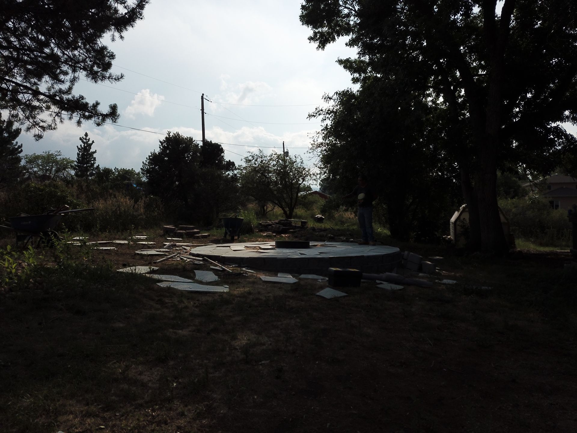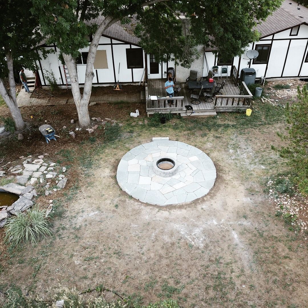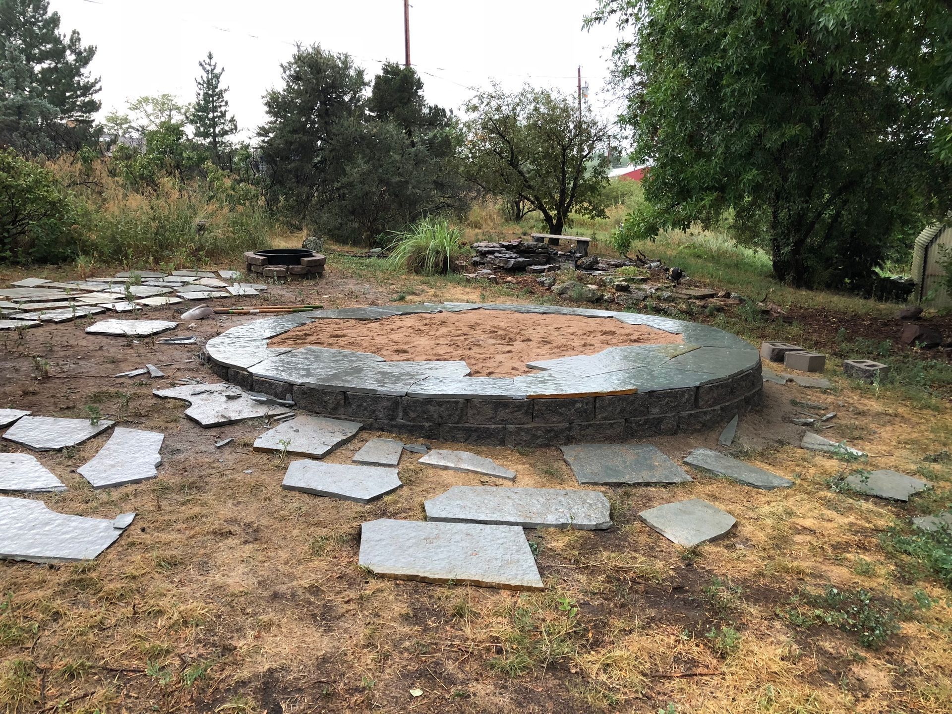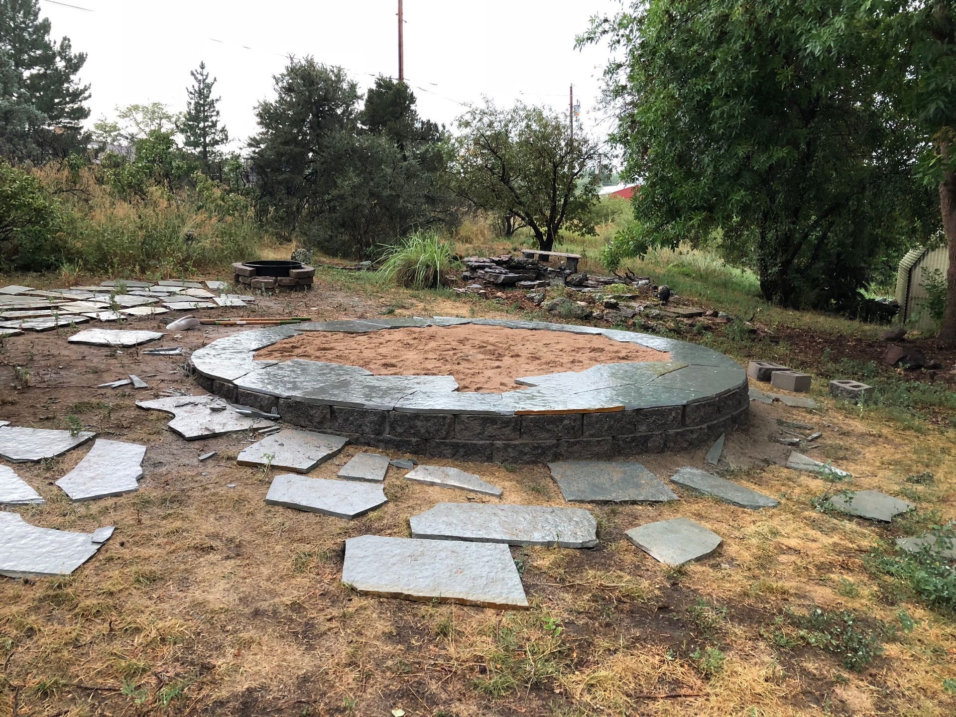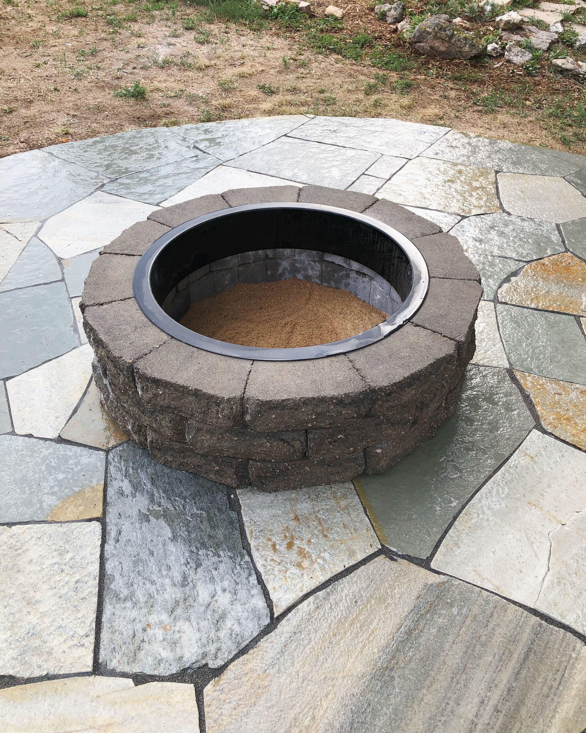 Beautiful circular mixed flagstone patio with wood burning fire pit. Two different flagstones used for design. Major cleanup in other areas. Playground grading and weed fabric with rubber mulch over. Niwot, CO 2019-2022