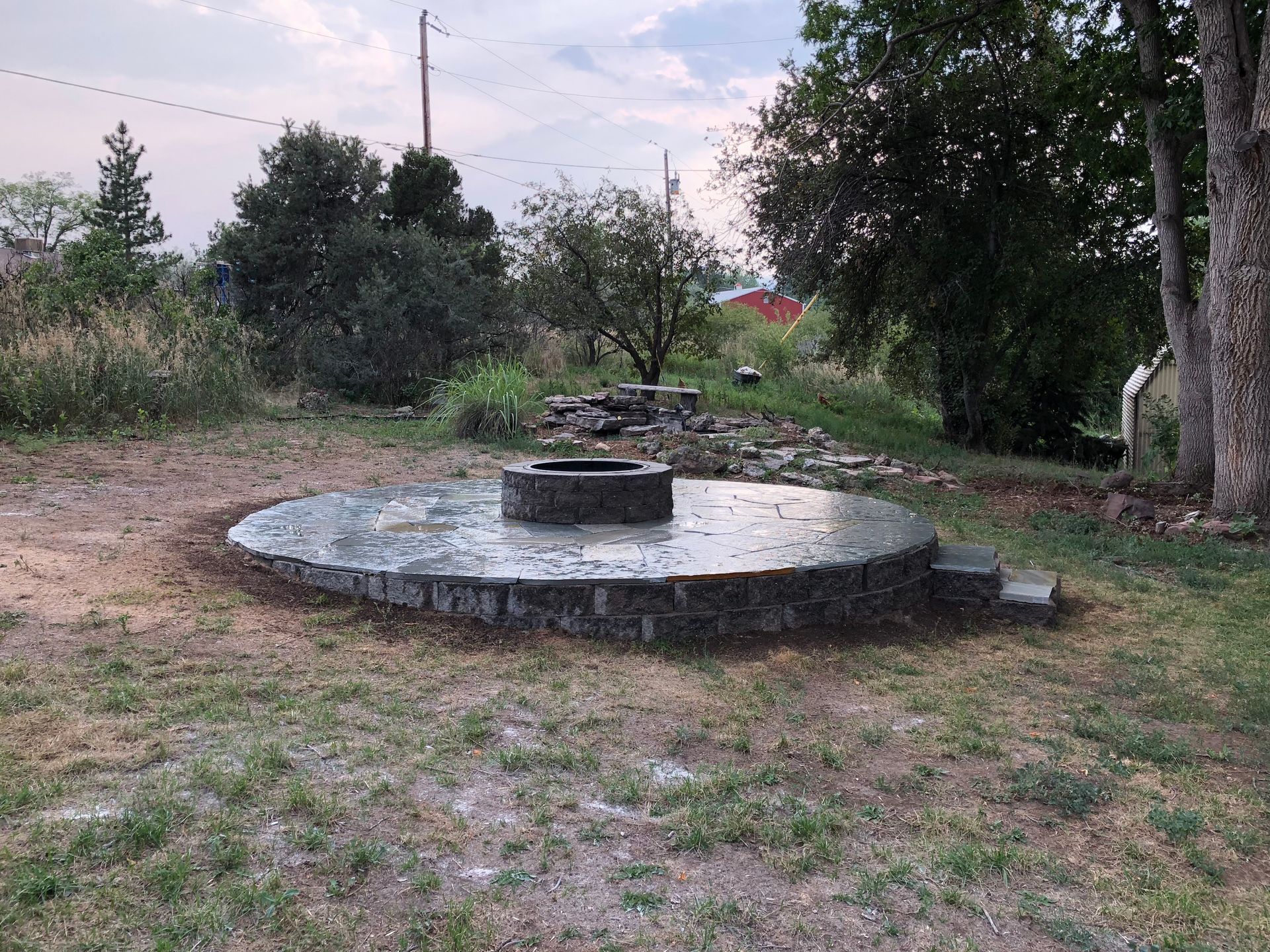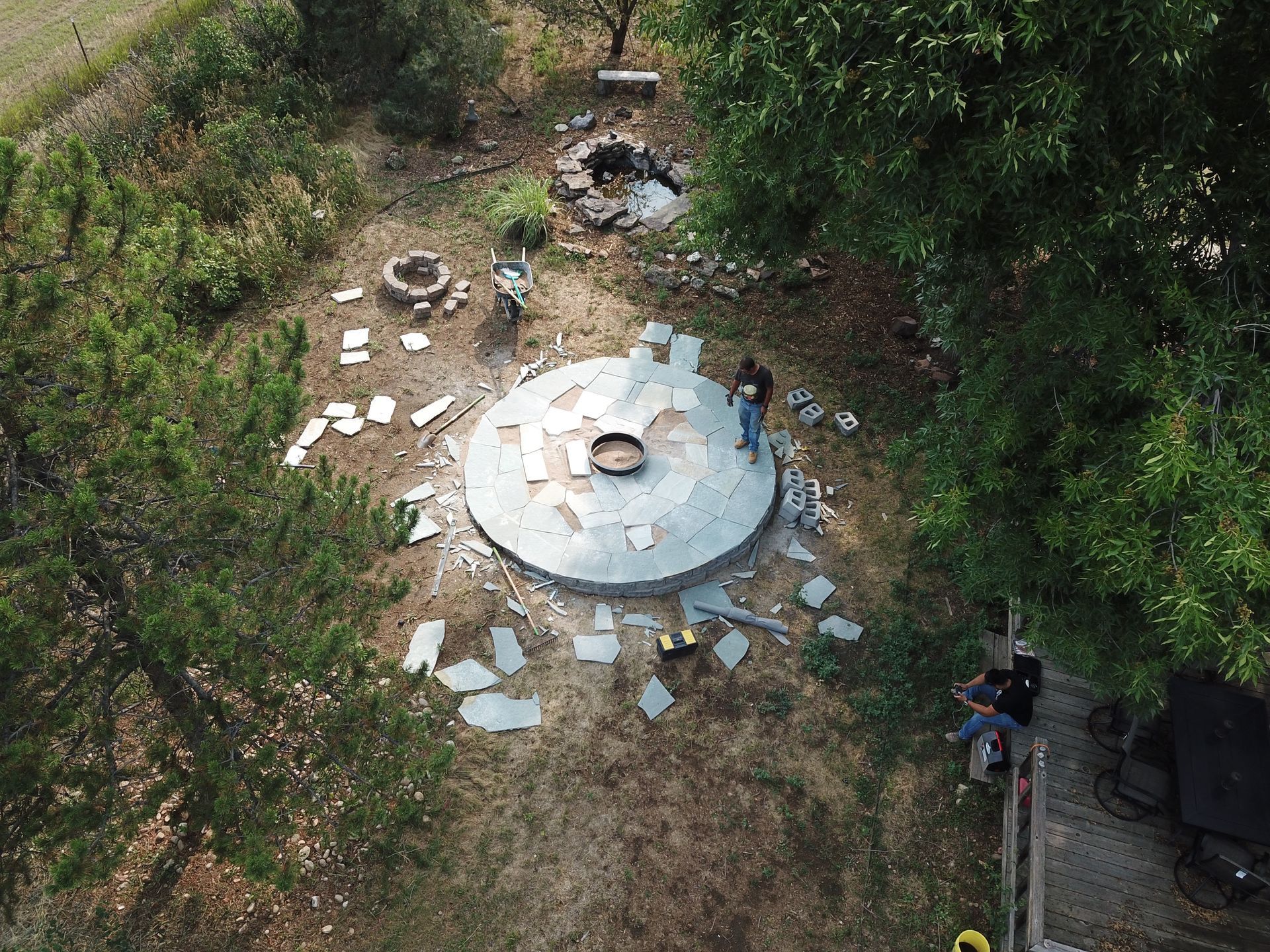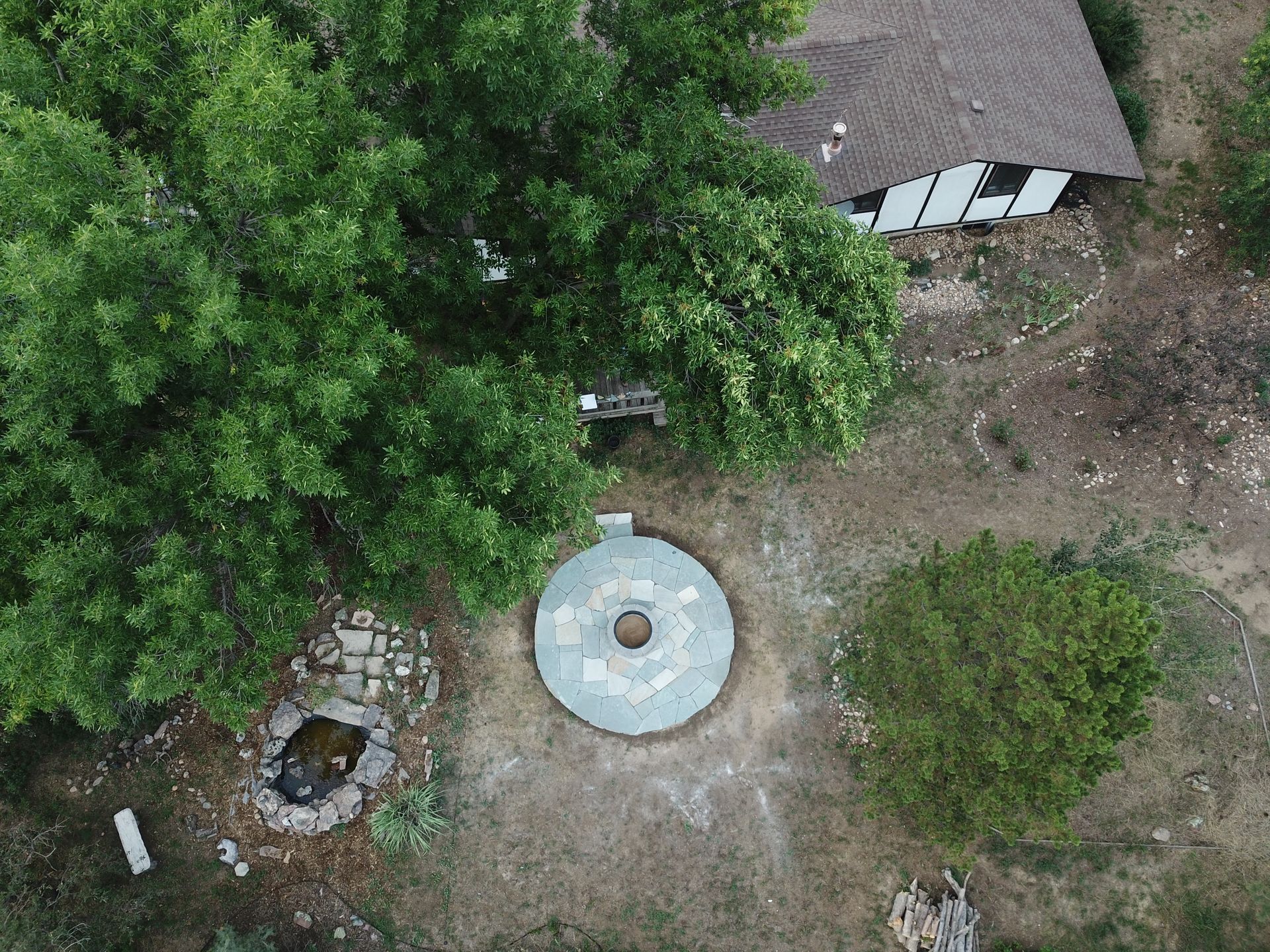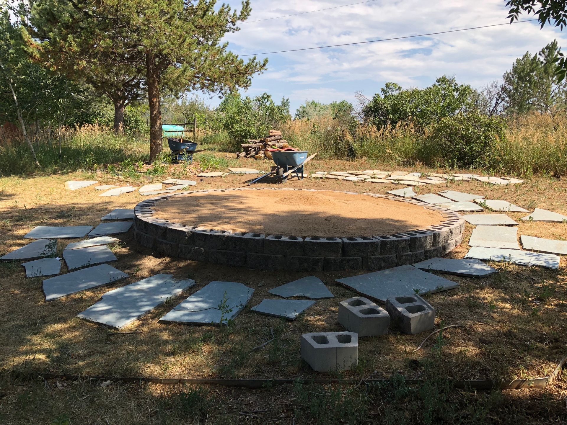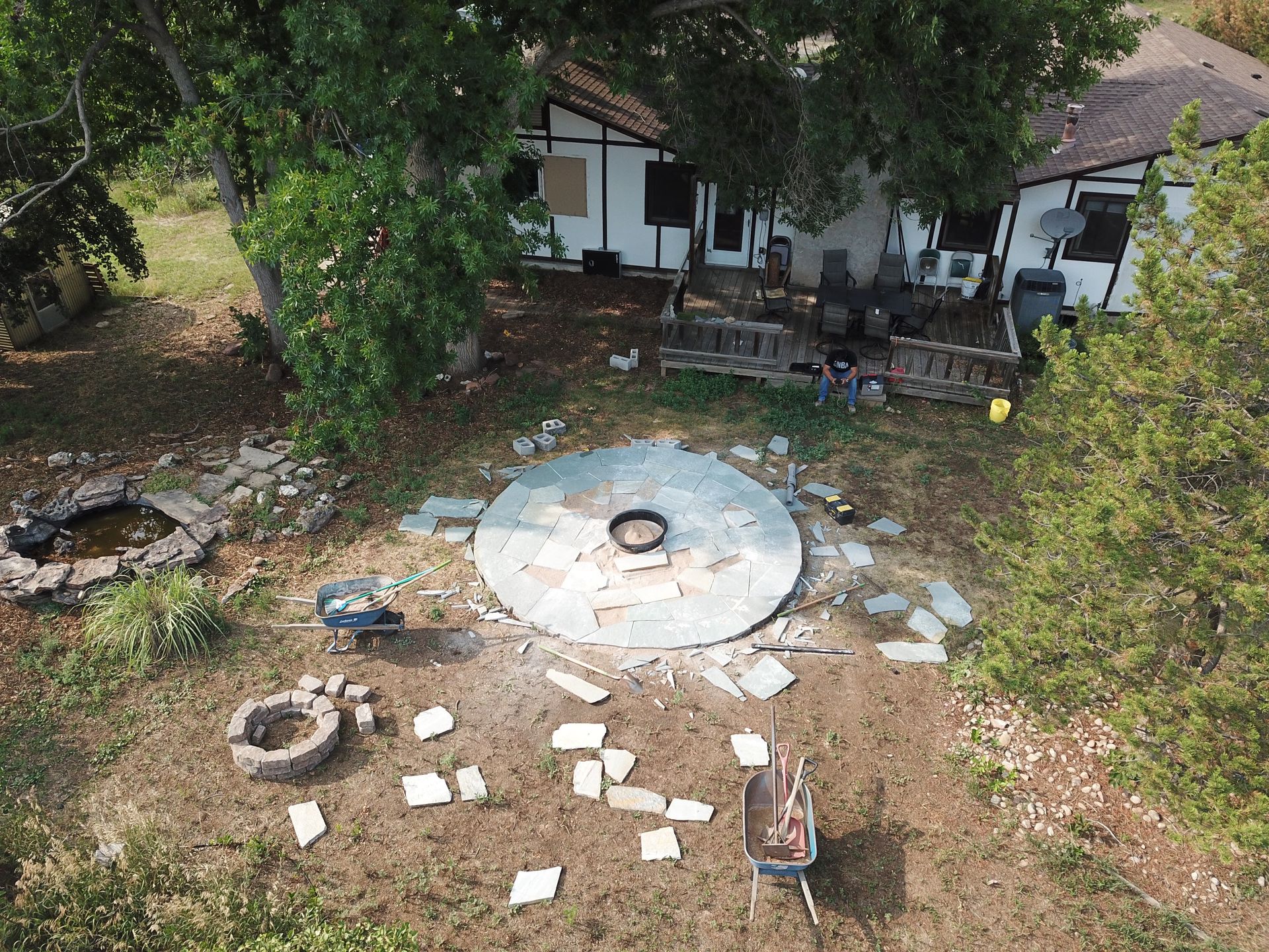 Beautiful circular mixed flagstone patio with wood burning fire pit. Two different flagstones used for design. Major cleanup in other areas. Playground grading and weed fabric with rubber mulch over. Niwot, CO 2019-2022