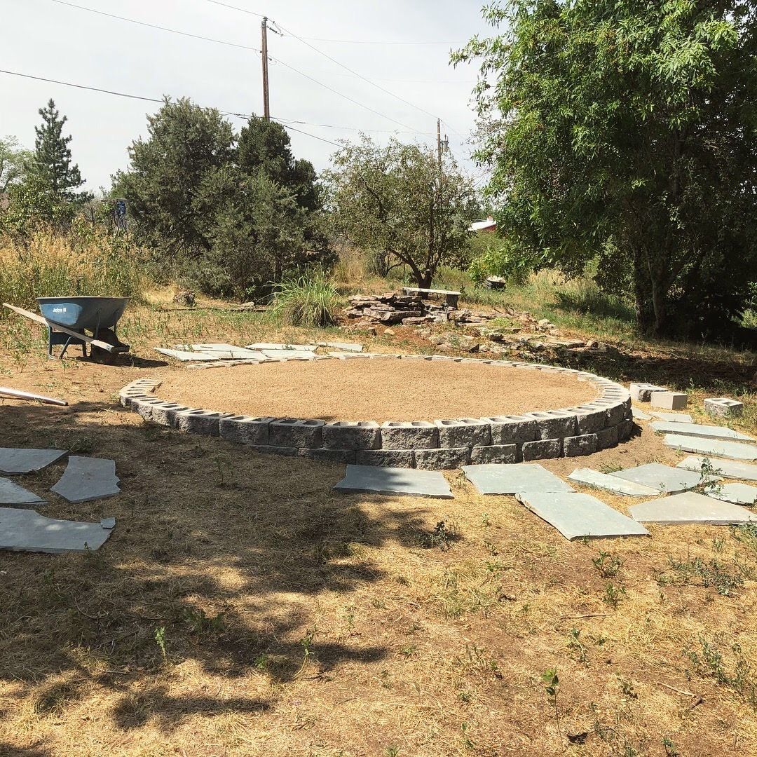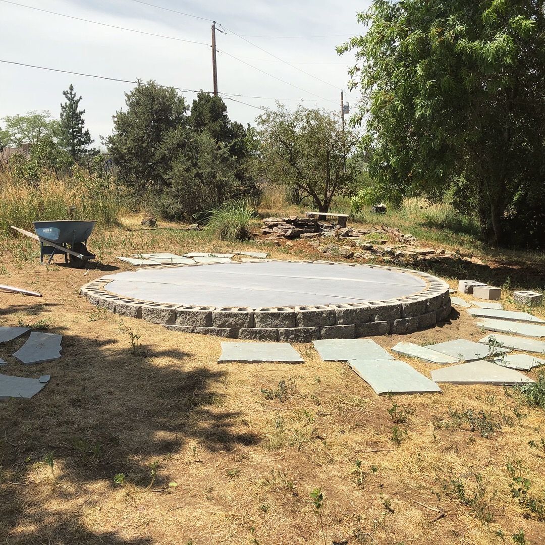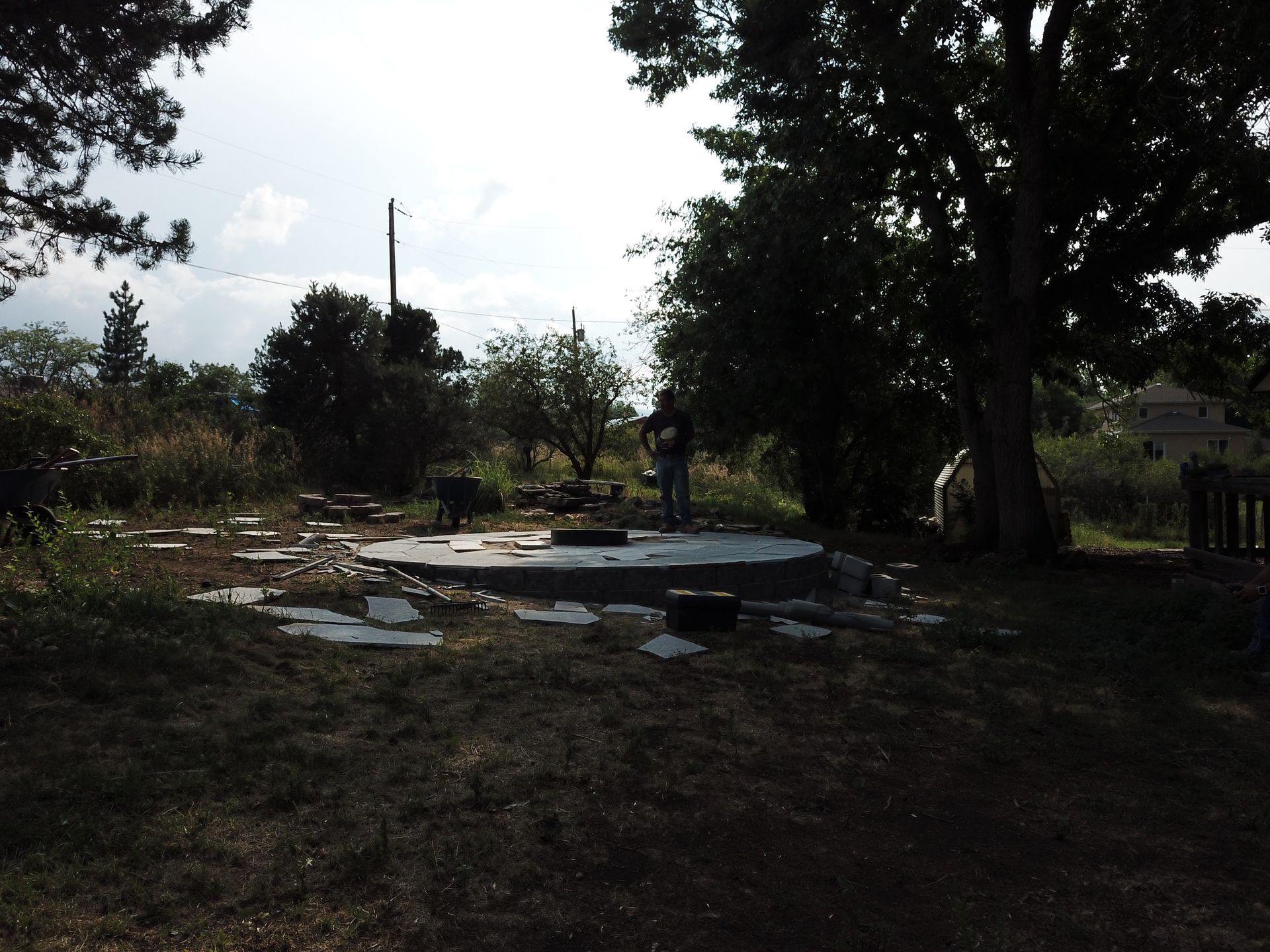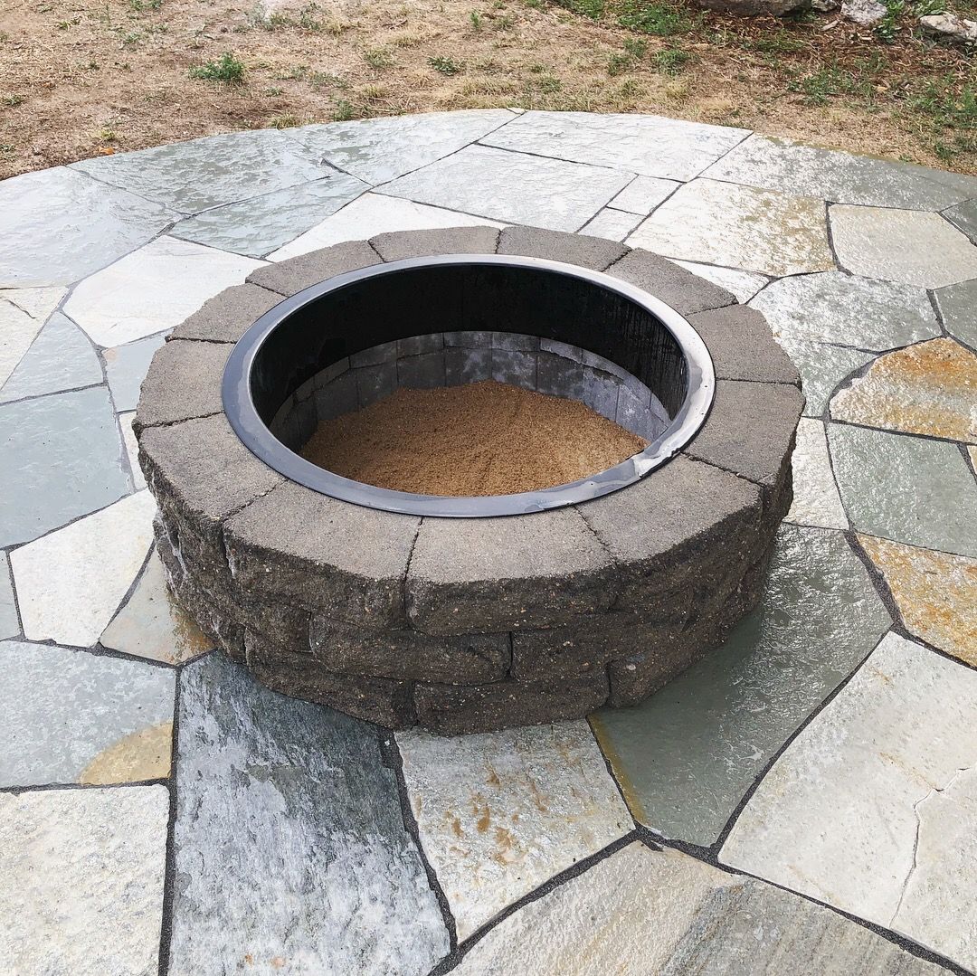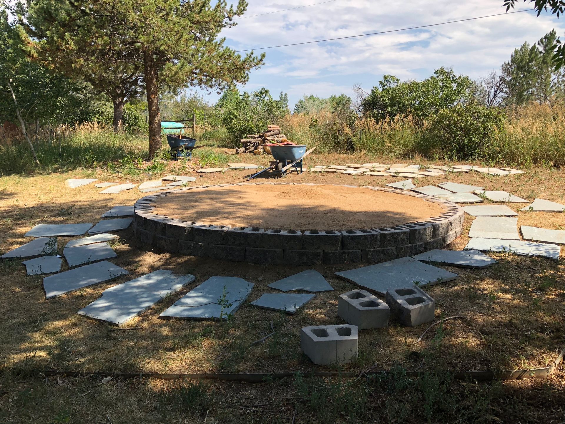 Beautiful circular mixed flagstone patio with wood burning fire pit. Two different flagstones used for design. Major cleanup in other areas. Playground grading and weed fabric with rubber mulch over. Niwot, CO 2019-2022