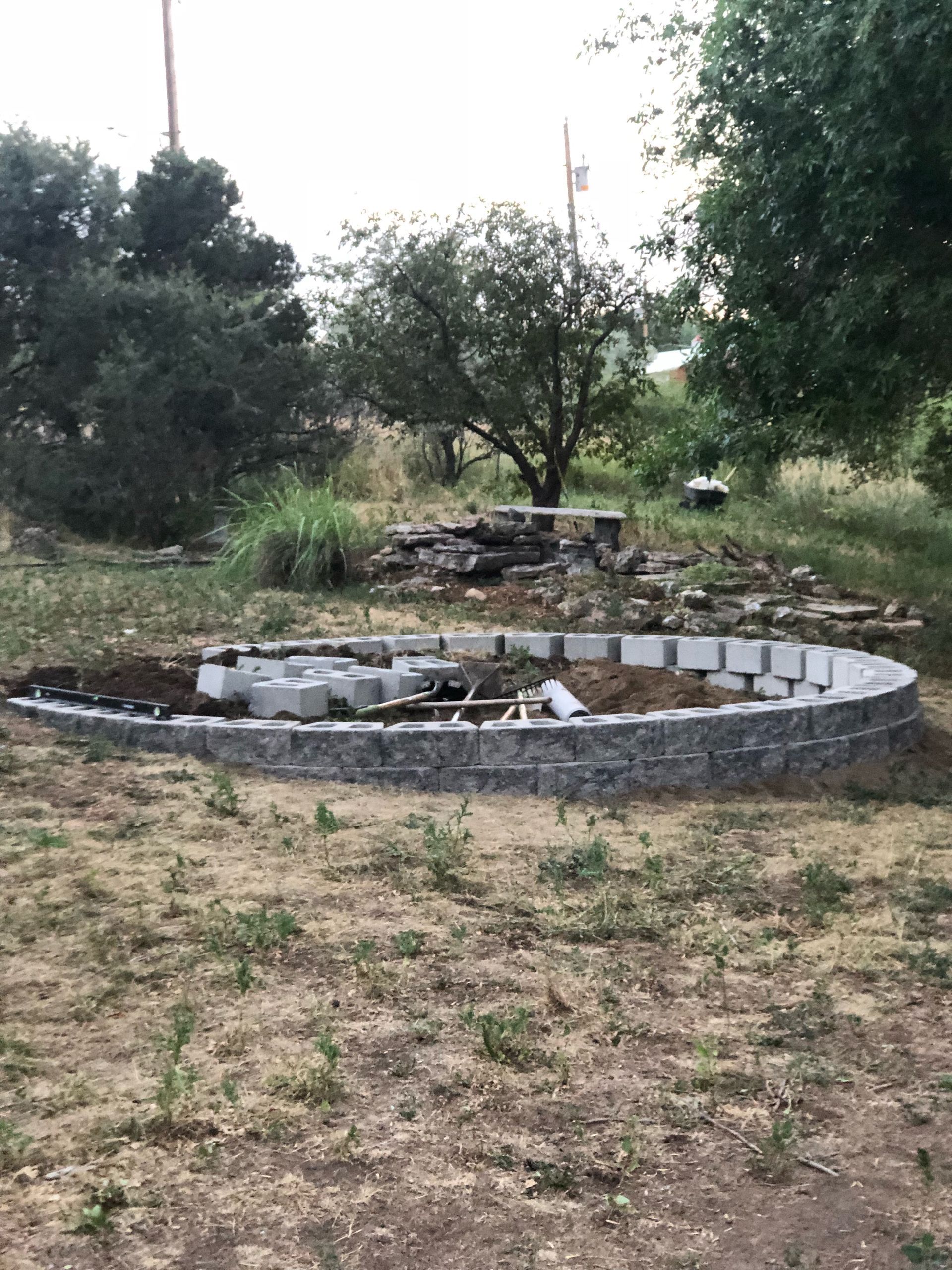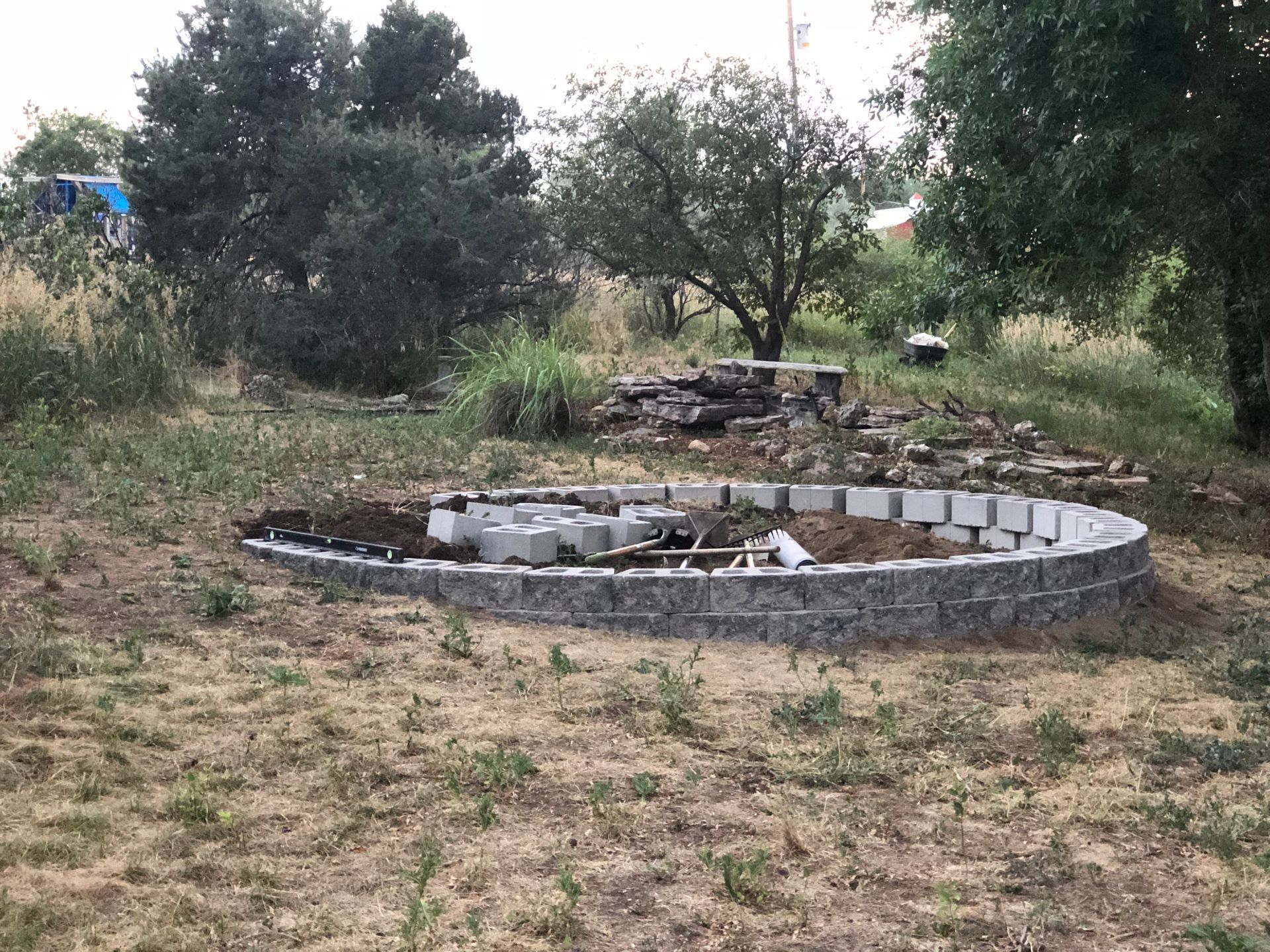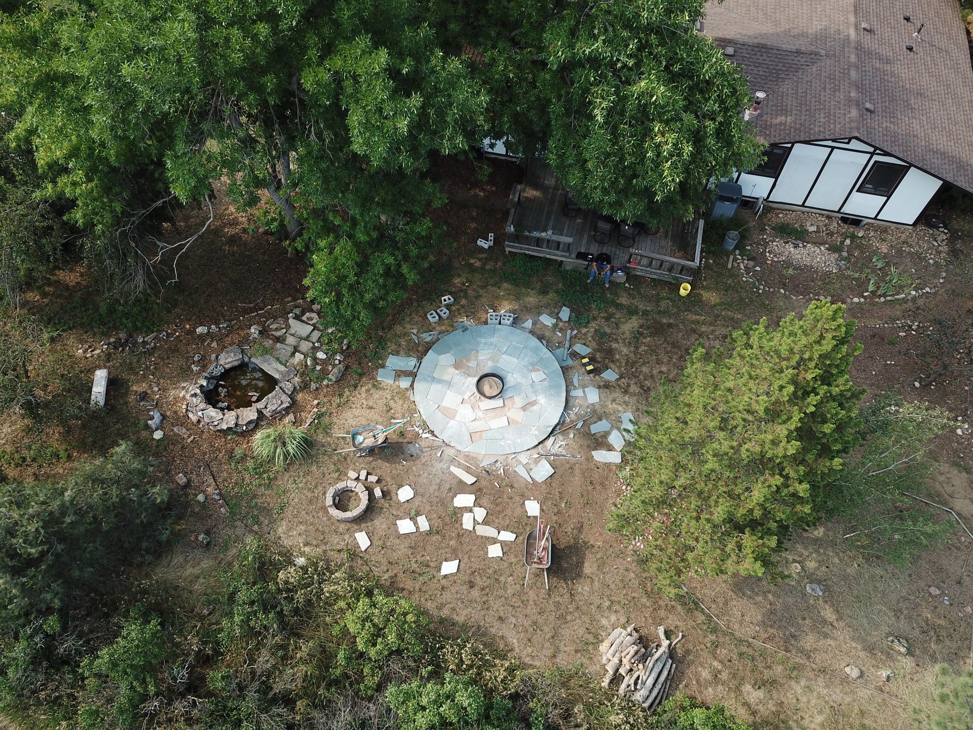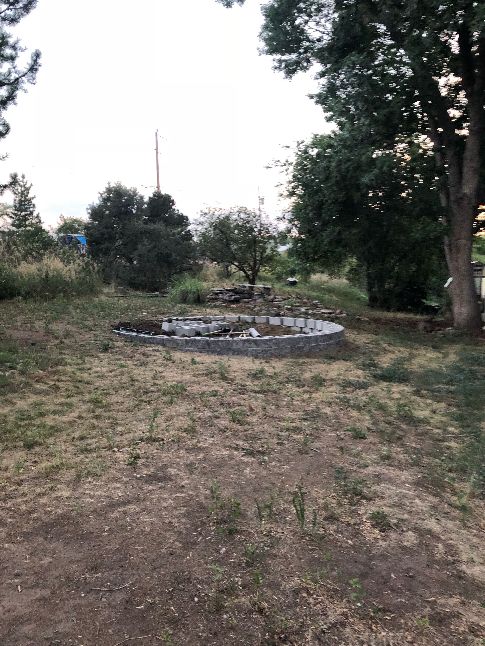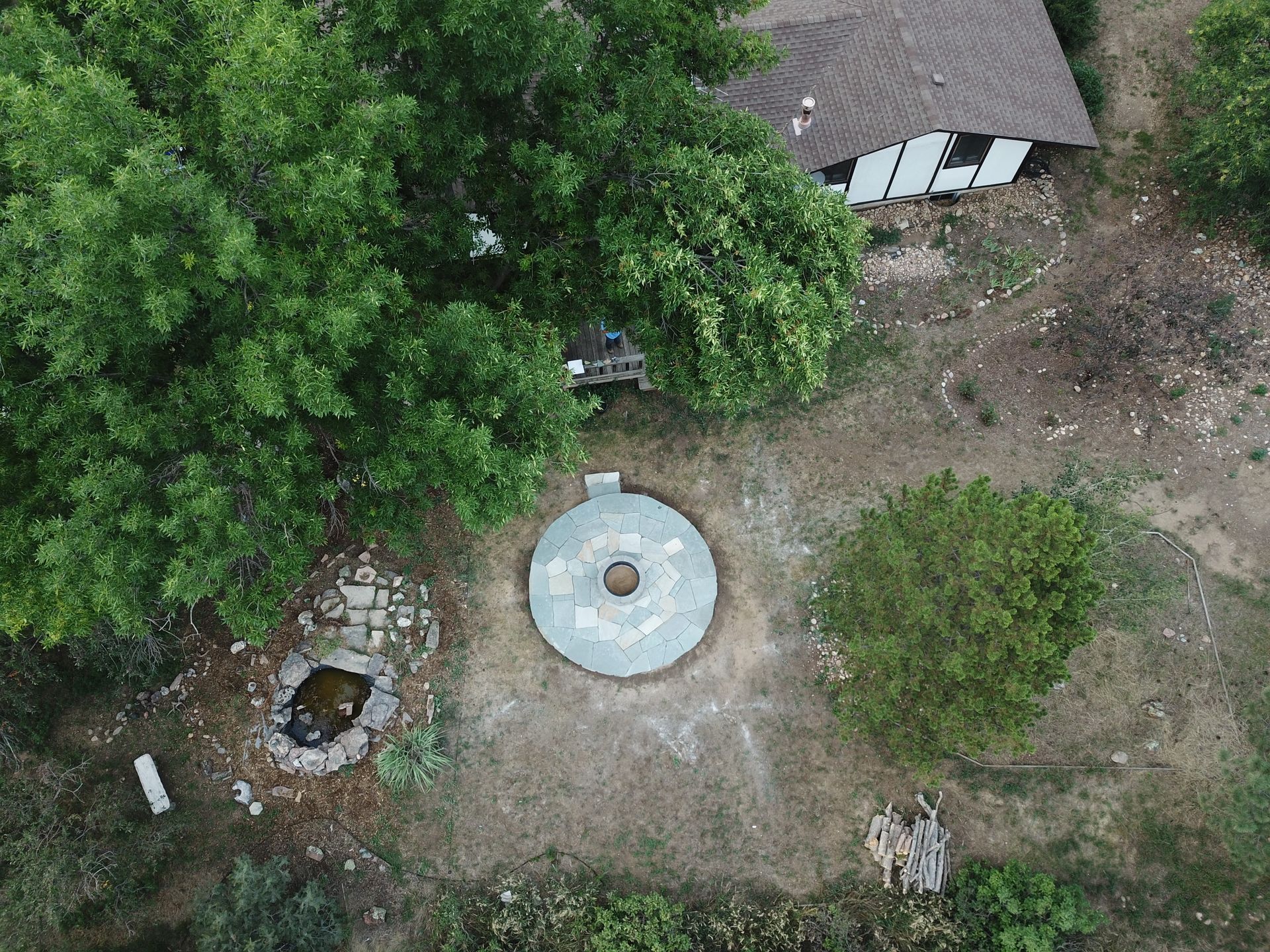 Beautiful circular mixed flagstone patio with wood burning fire pit. Two different flagstones used for design. Major cleanup in other areas. Playground grading and weed fabric with rubber mulch over. Niwot, CO 2019-2022