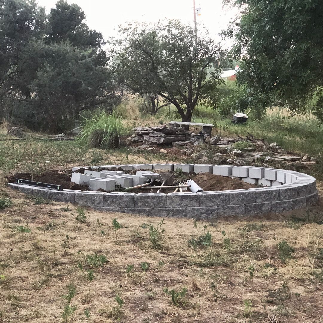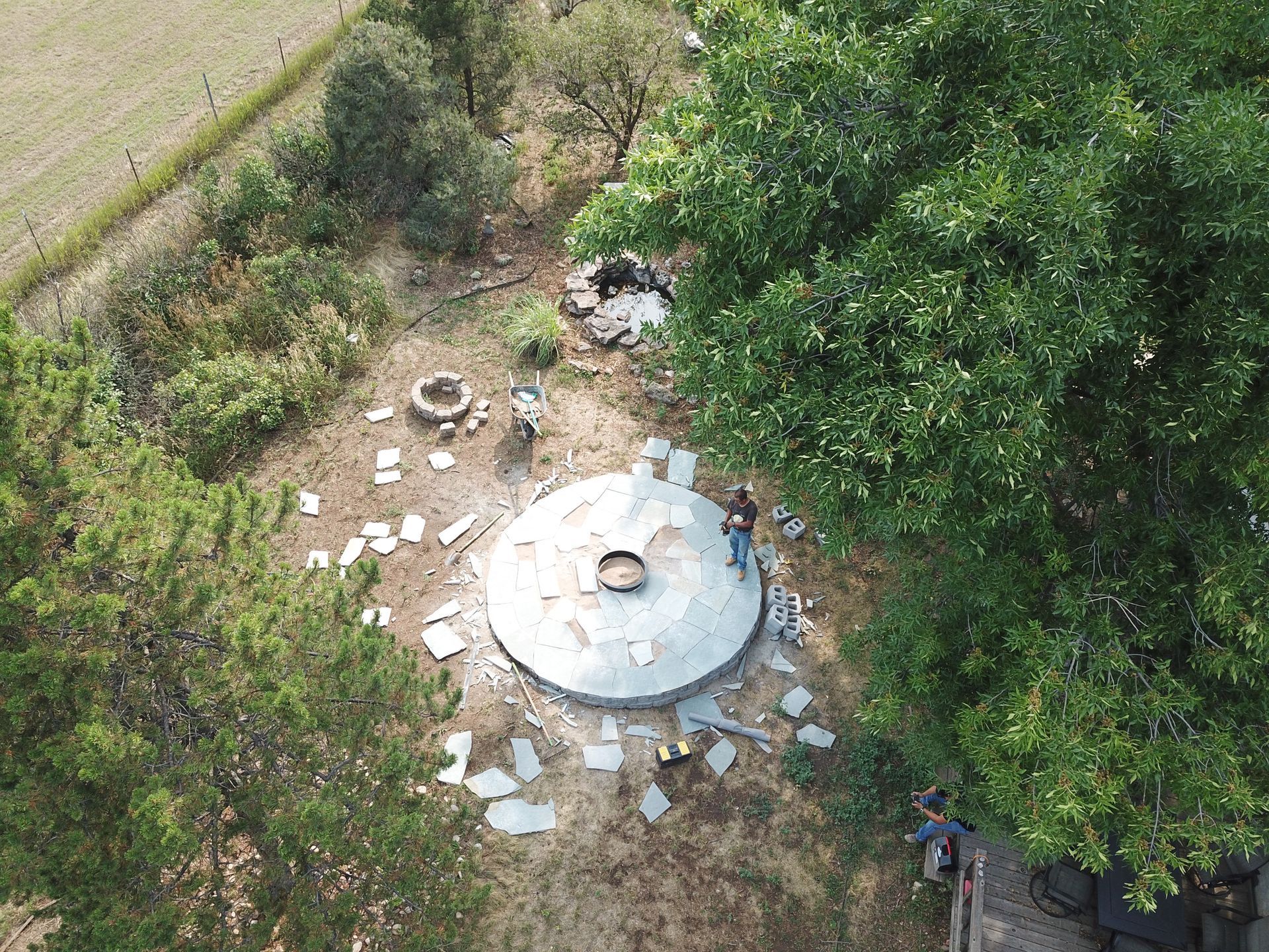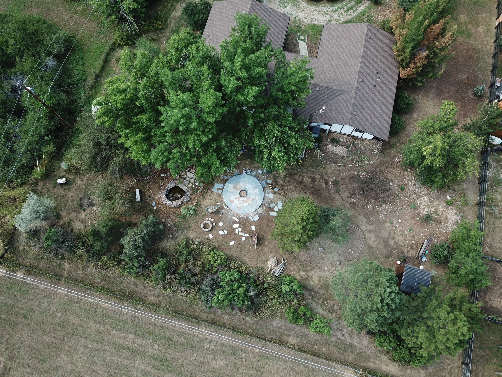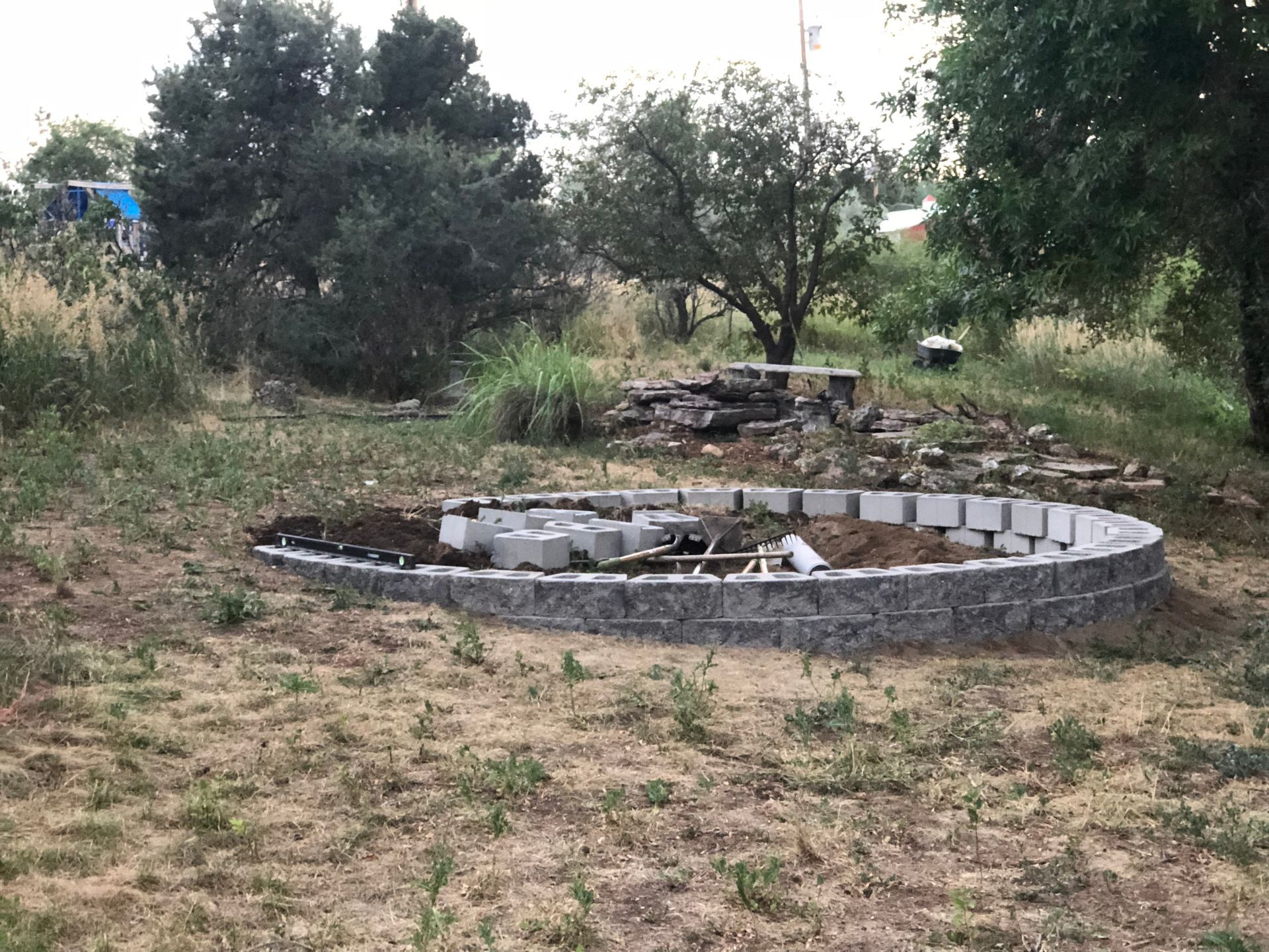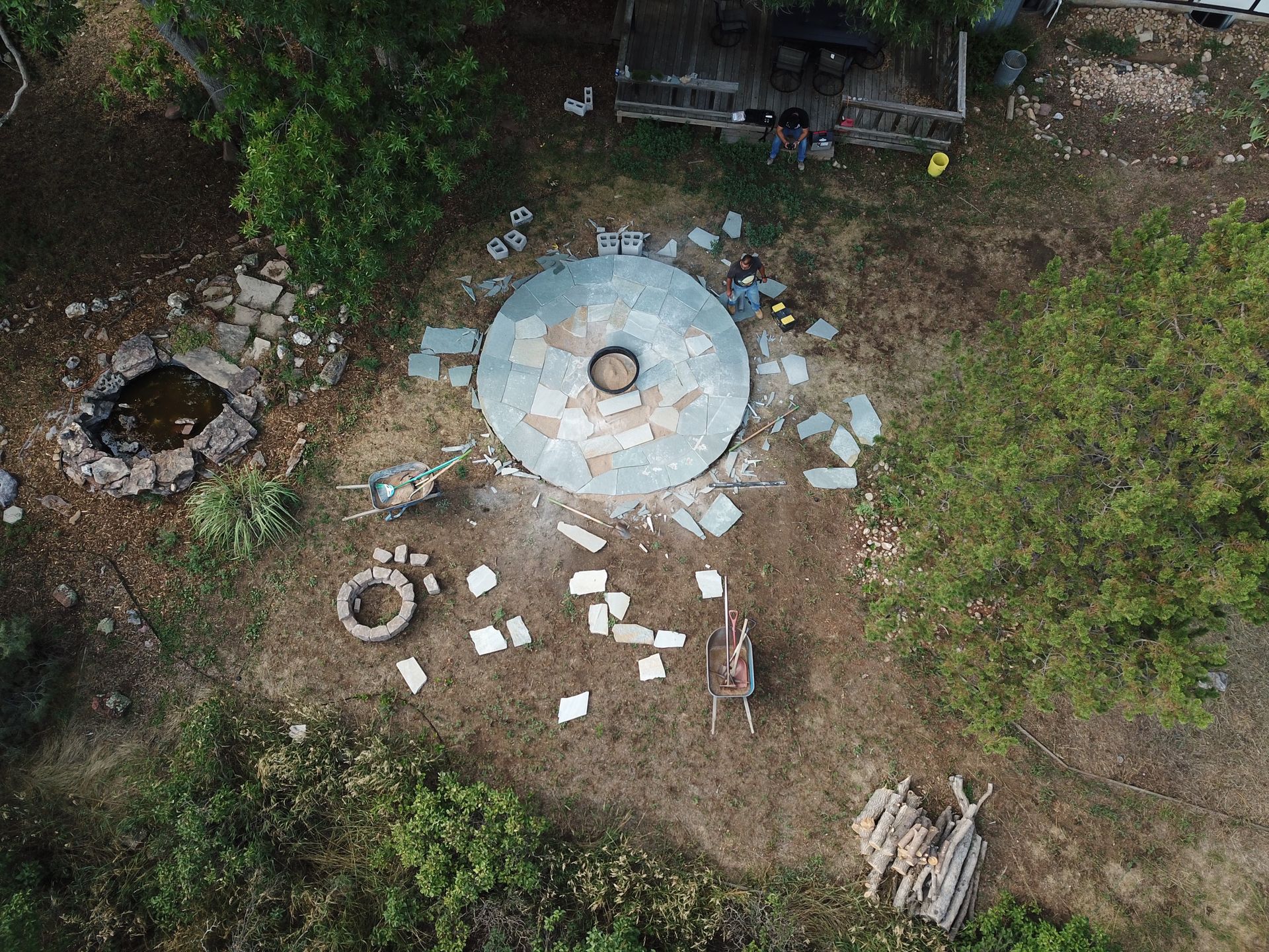 Beautiful circular mixed flagstone patio with wood burning fire pit. Two different flagstones used for design. Major cleanup in other areas. Playground grading and weed fabric with rubber mulch over. Niwot, CO 2019-2022
