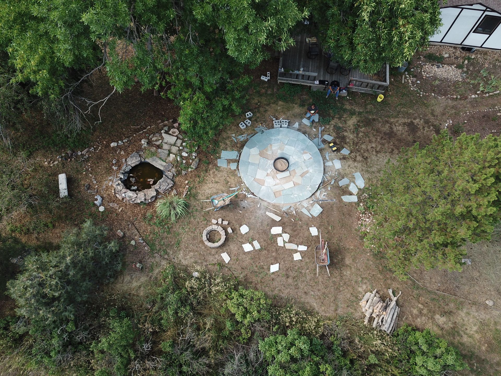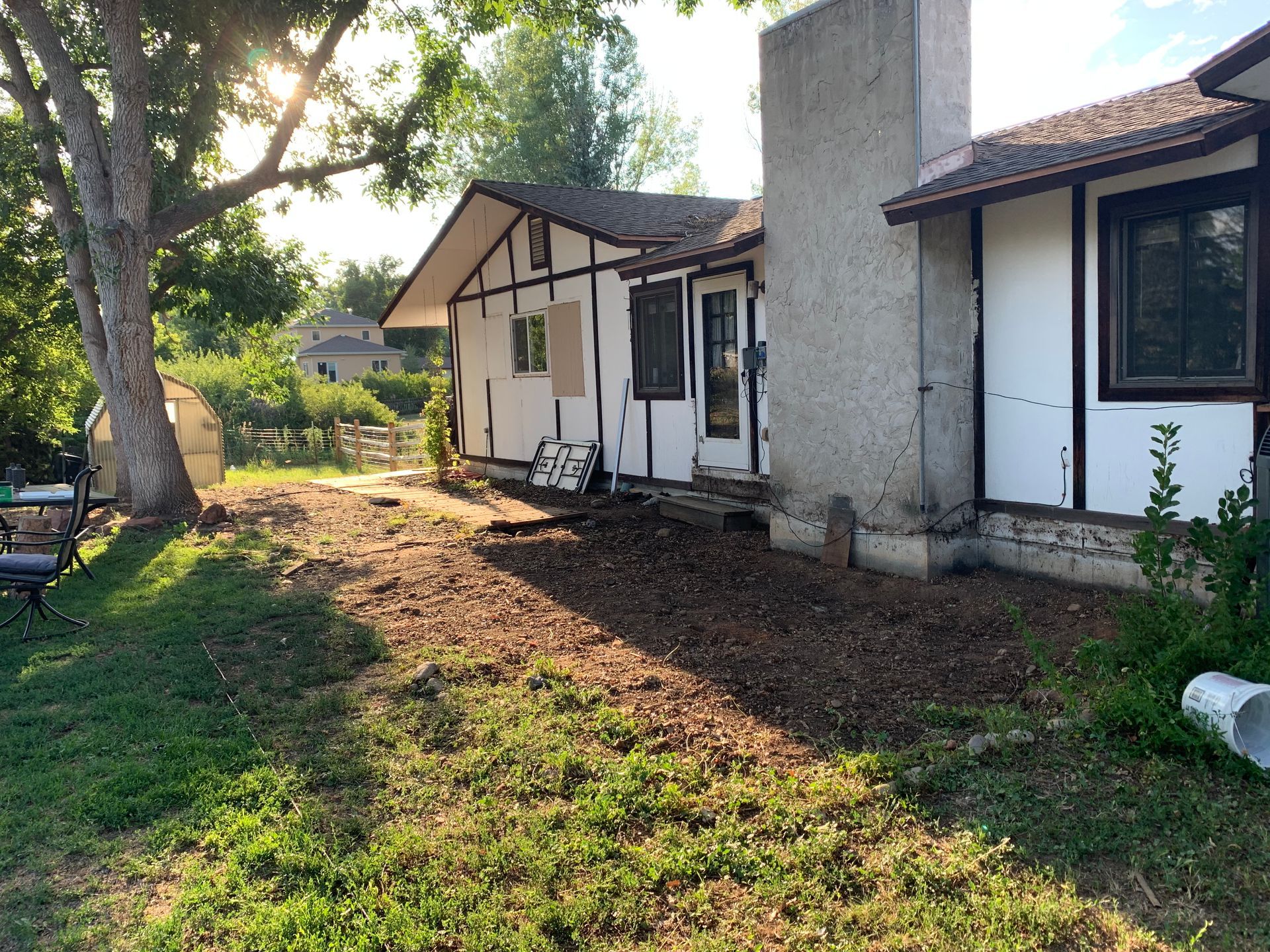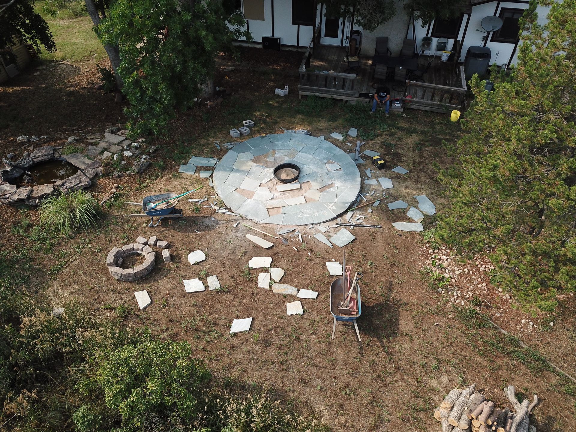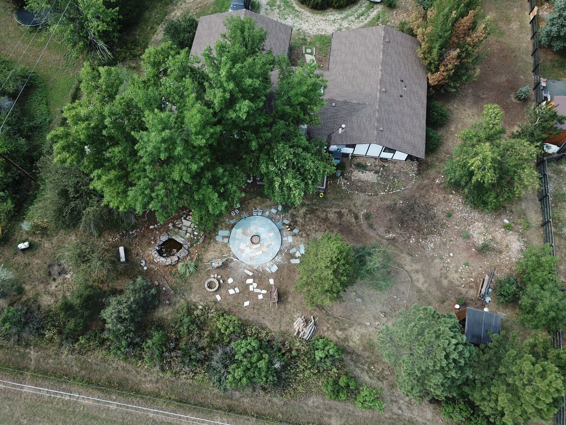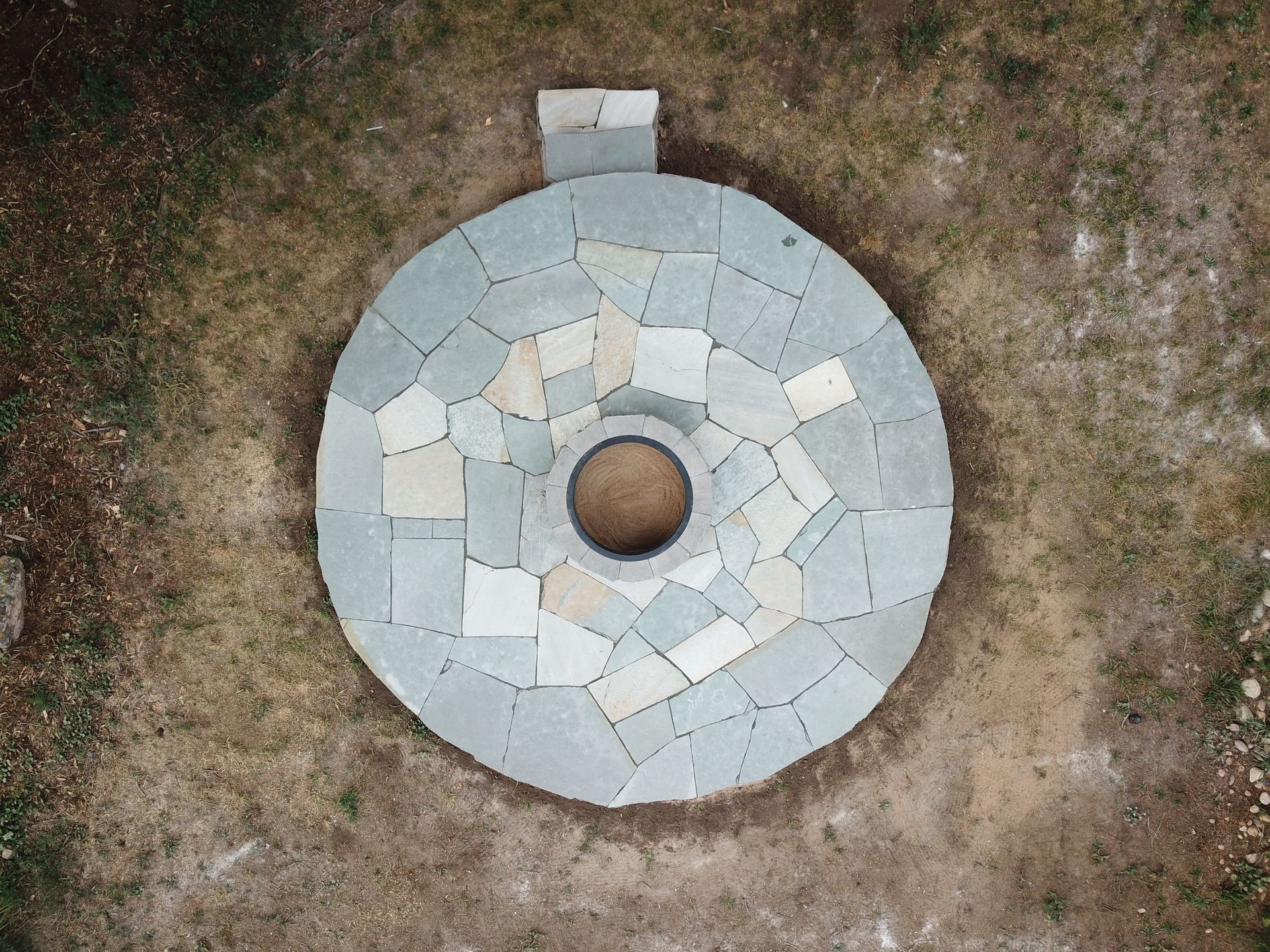 Beautiful circular mixed flagstone patio with wood burning fire pit. Two different flagstones used for design. Major cleanup in other areas. Playground grading and weed fabric with rubber mulch over. Niwot, CO 2019-2022