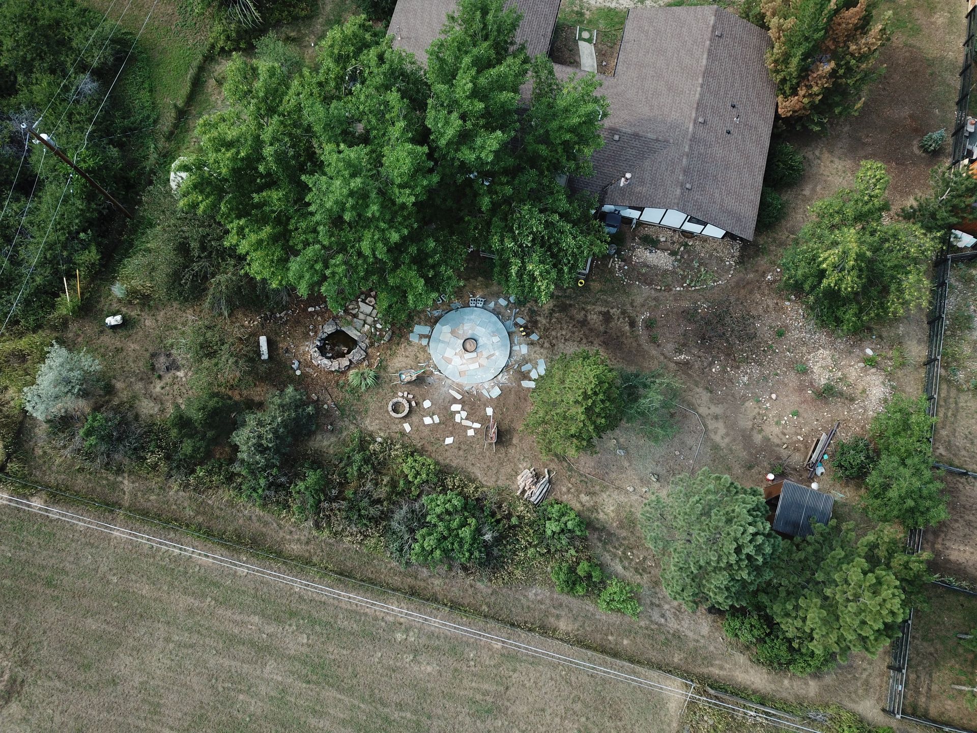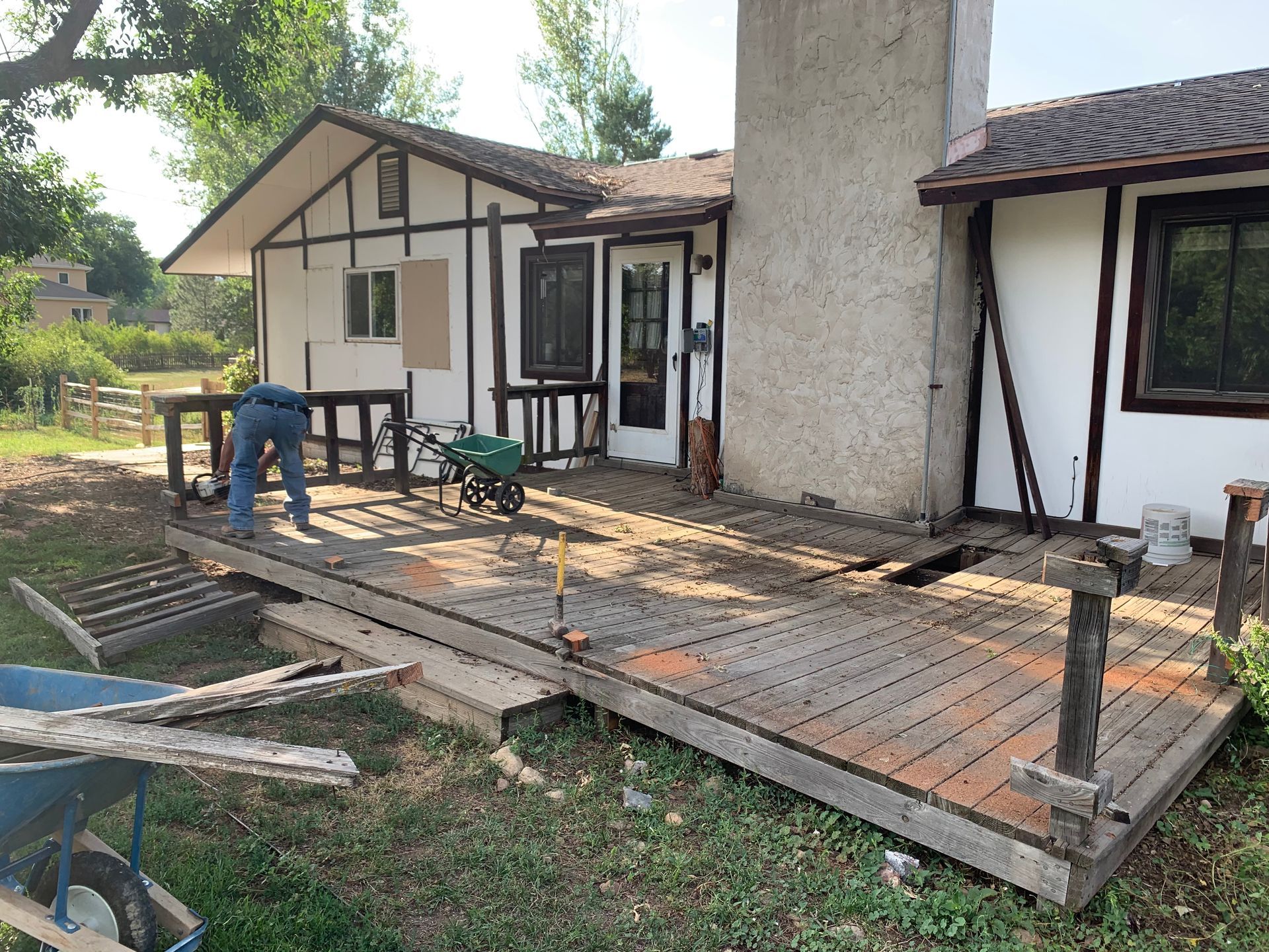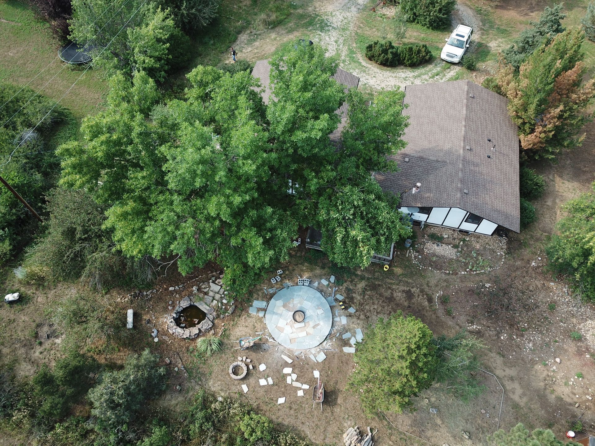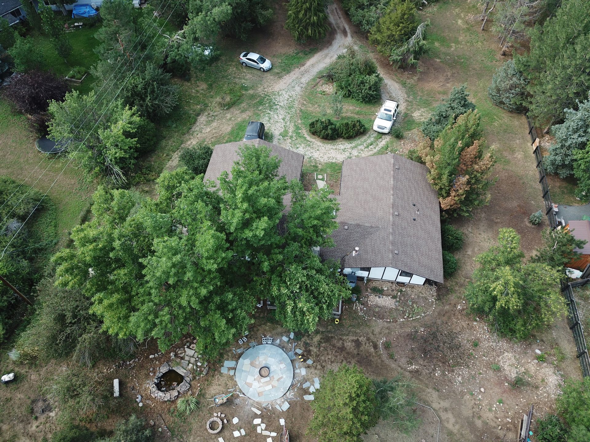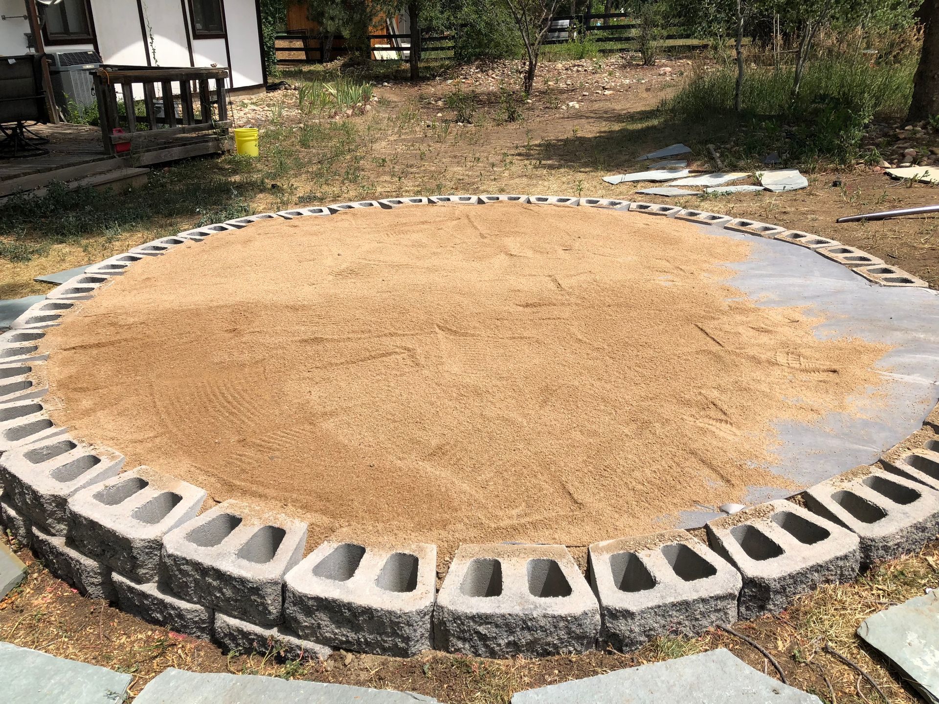 Beautiful circular mixed flagstone patio with wood burning fire pit. Two different flagstones used for design. Major cleanup in other areas. Playground grading and weed fabric with rubber mulch over. Niwot, CO 2019-2022