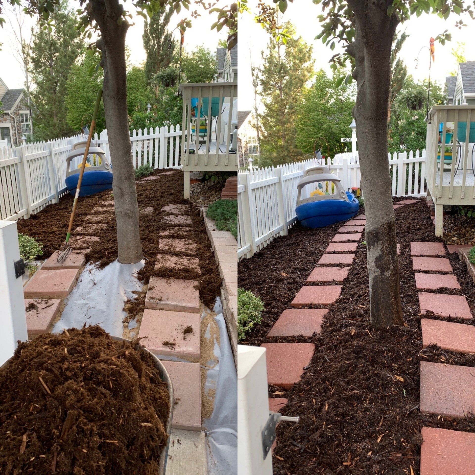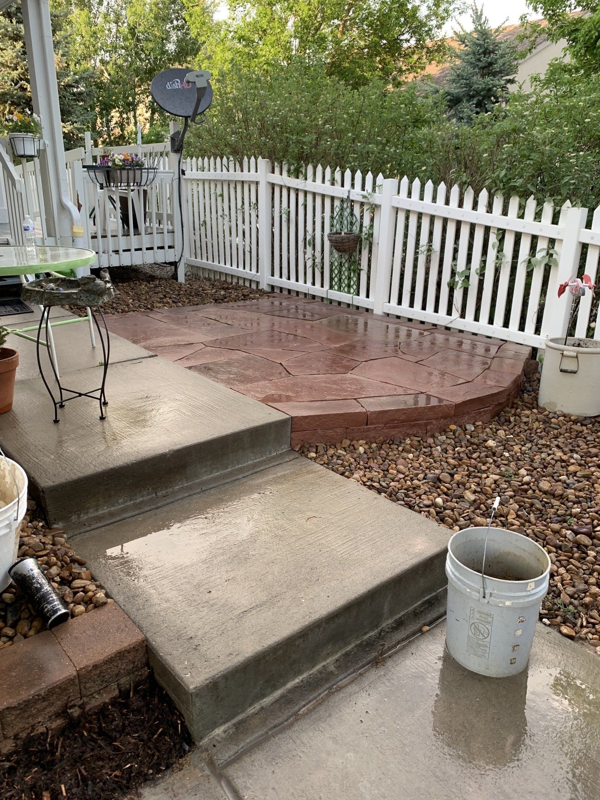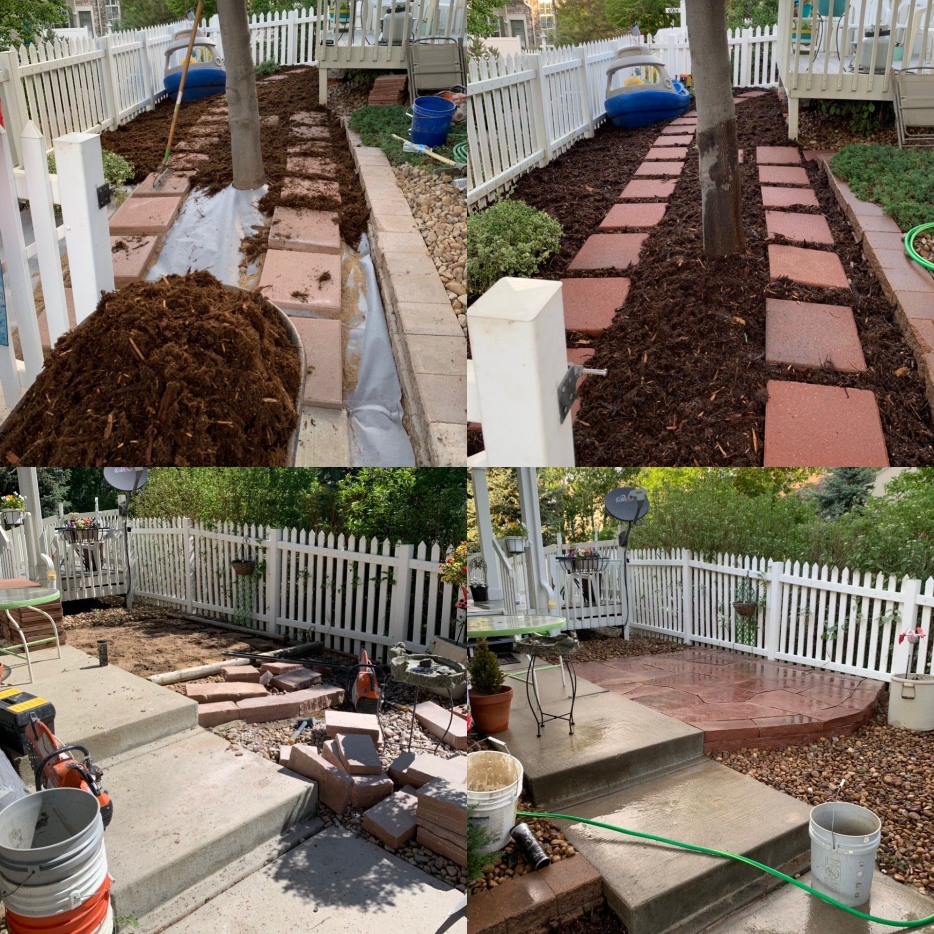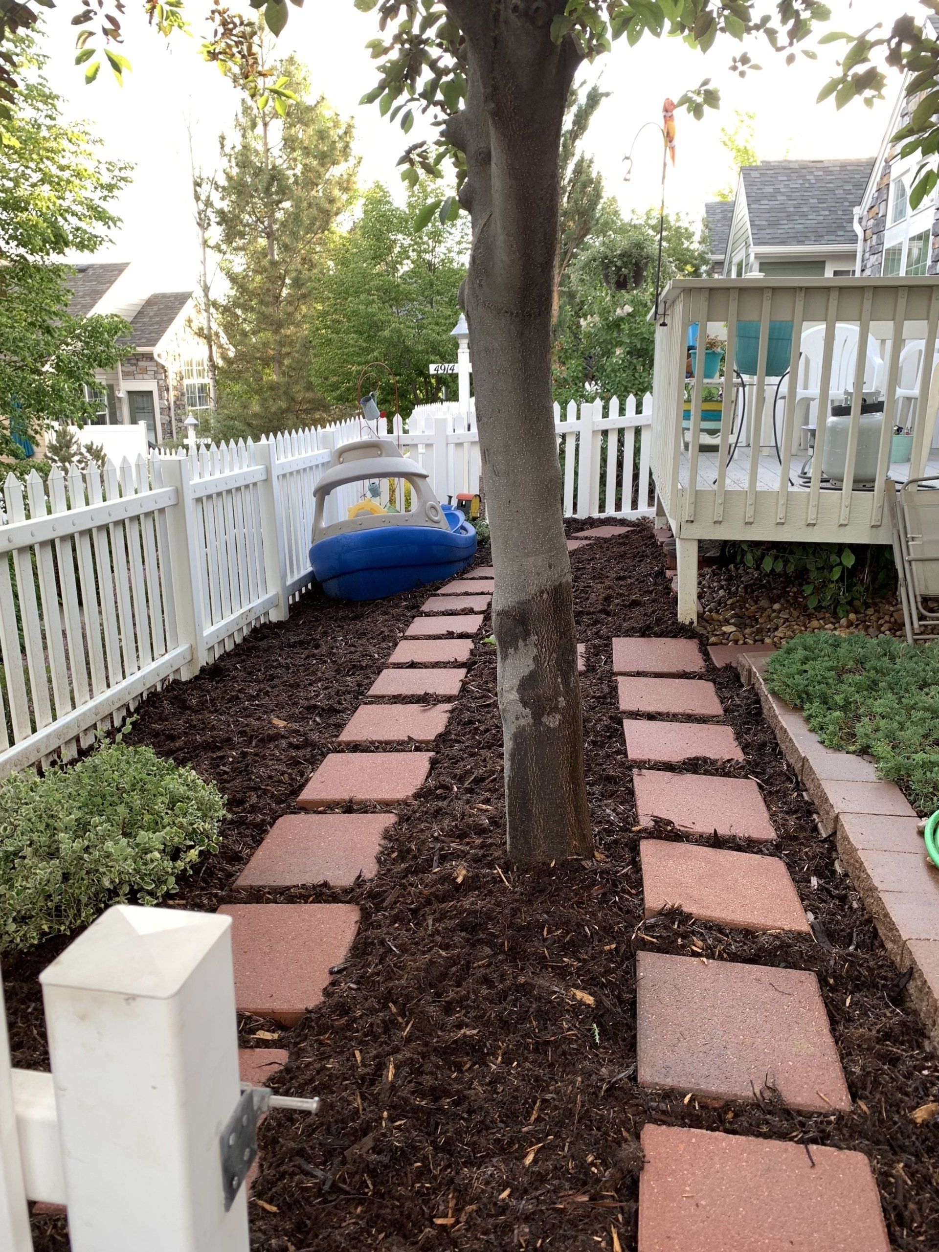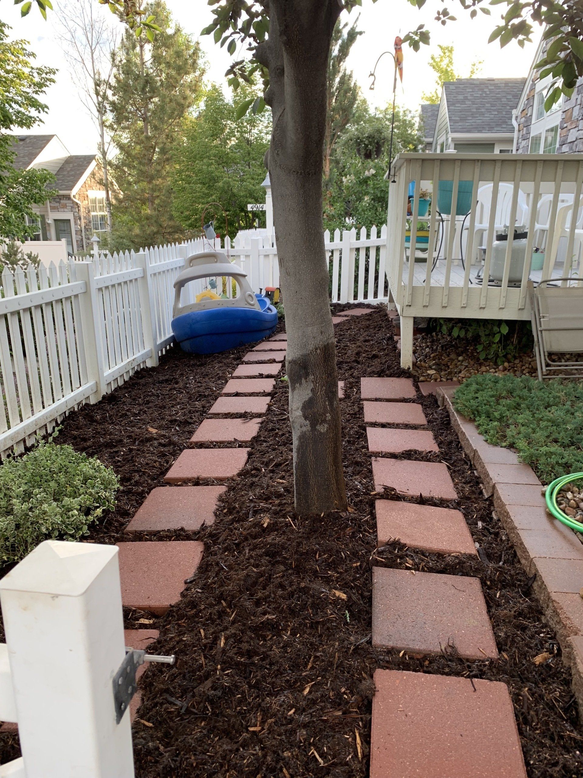 One of our trademark Colorado red flagstone patios to allow for afternoon gatherings. Walkway with mulch to reduce grass areas installed additionally.