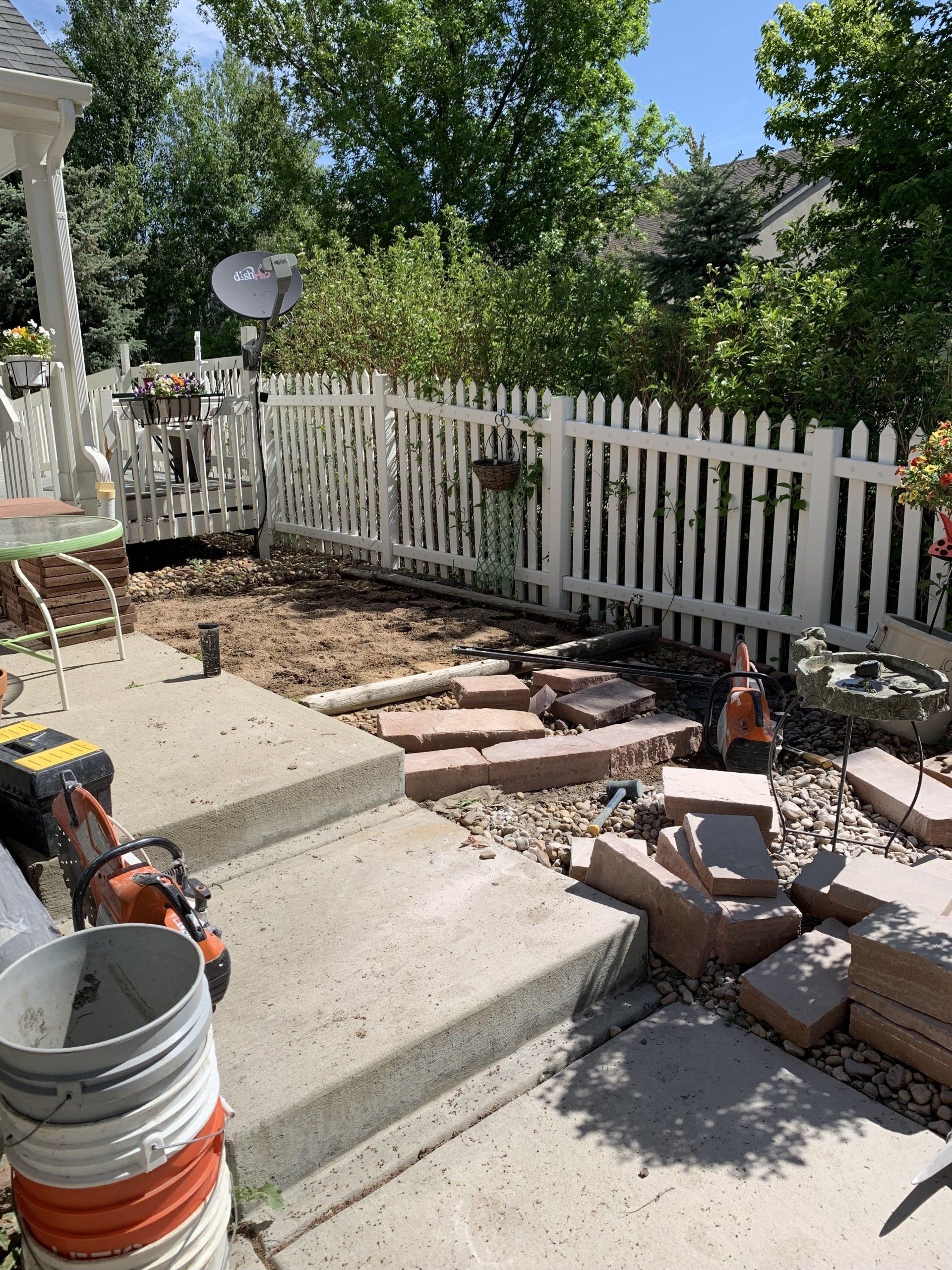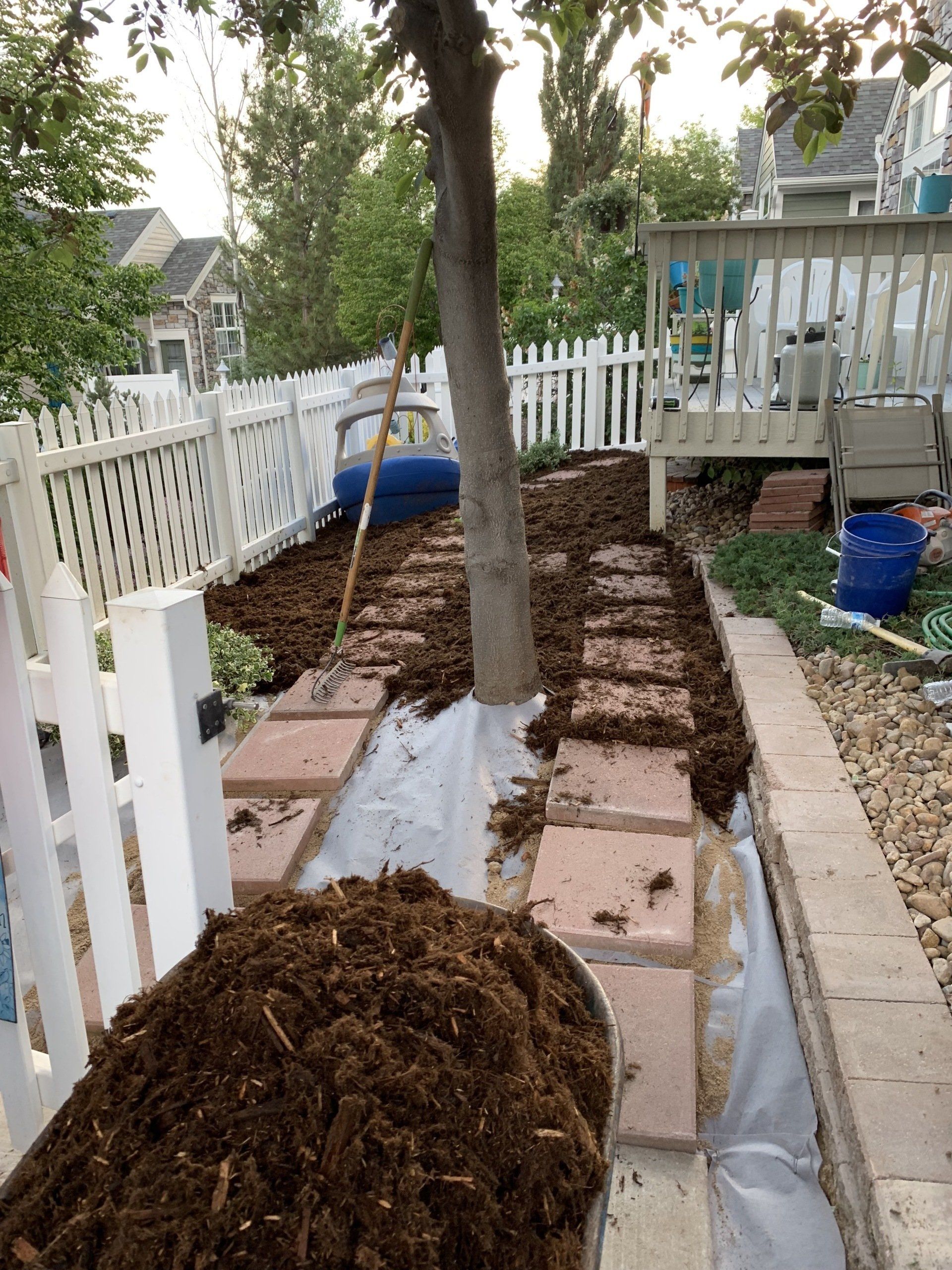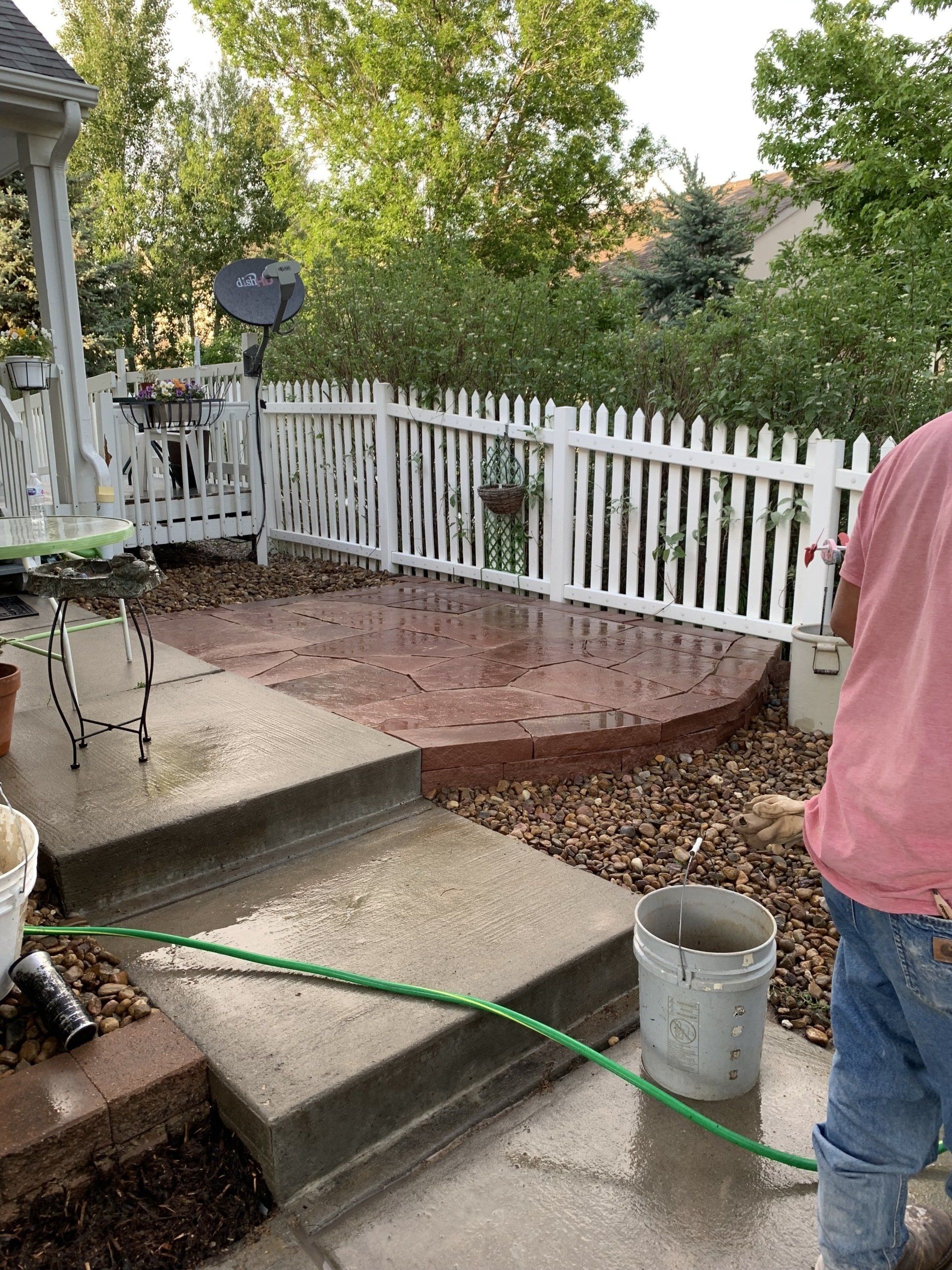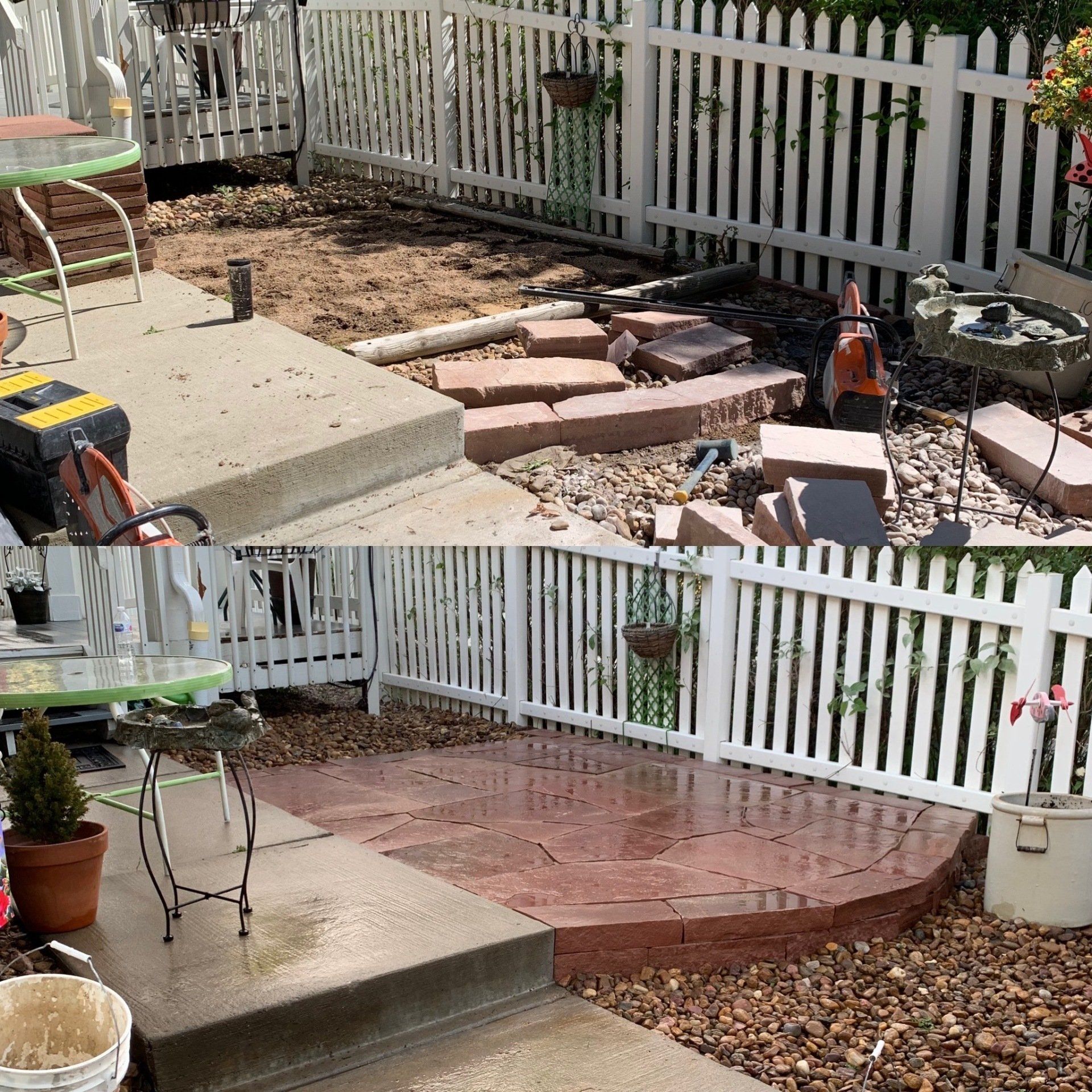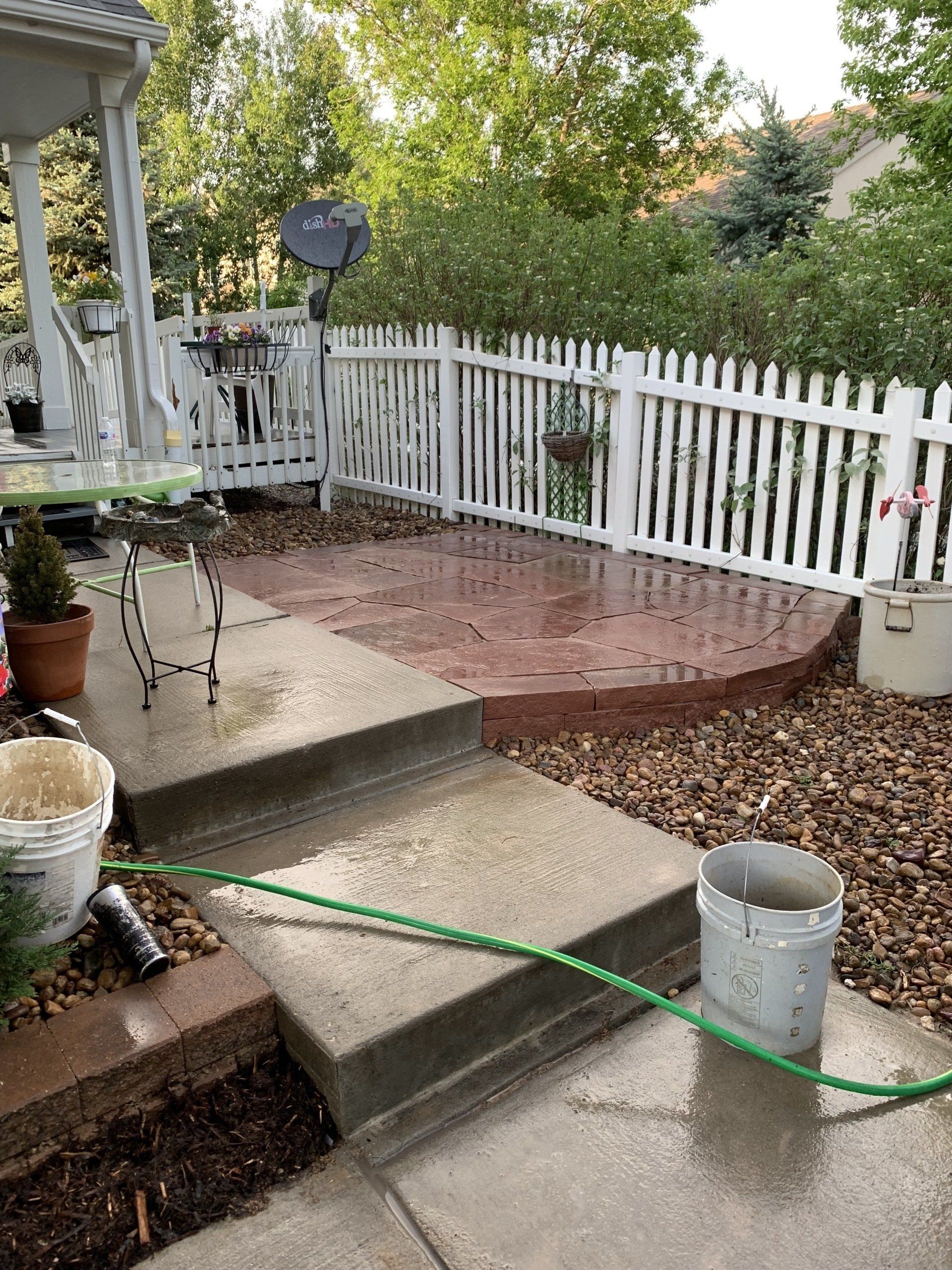 One of our trademark Colorado red flagstone patios to allow for afternoon gatherings. Walkway with mulch to reduce grass areas installed additionally.