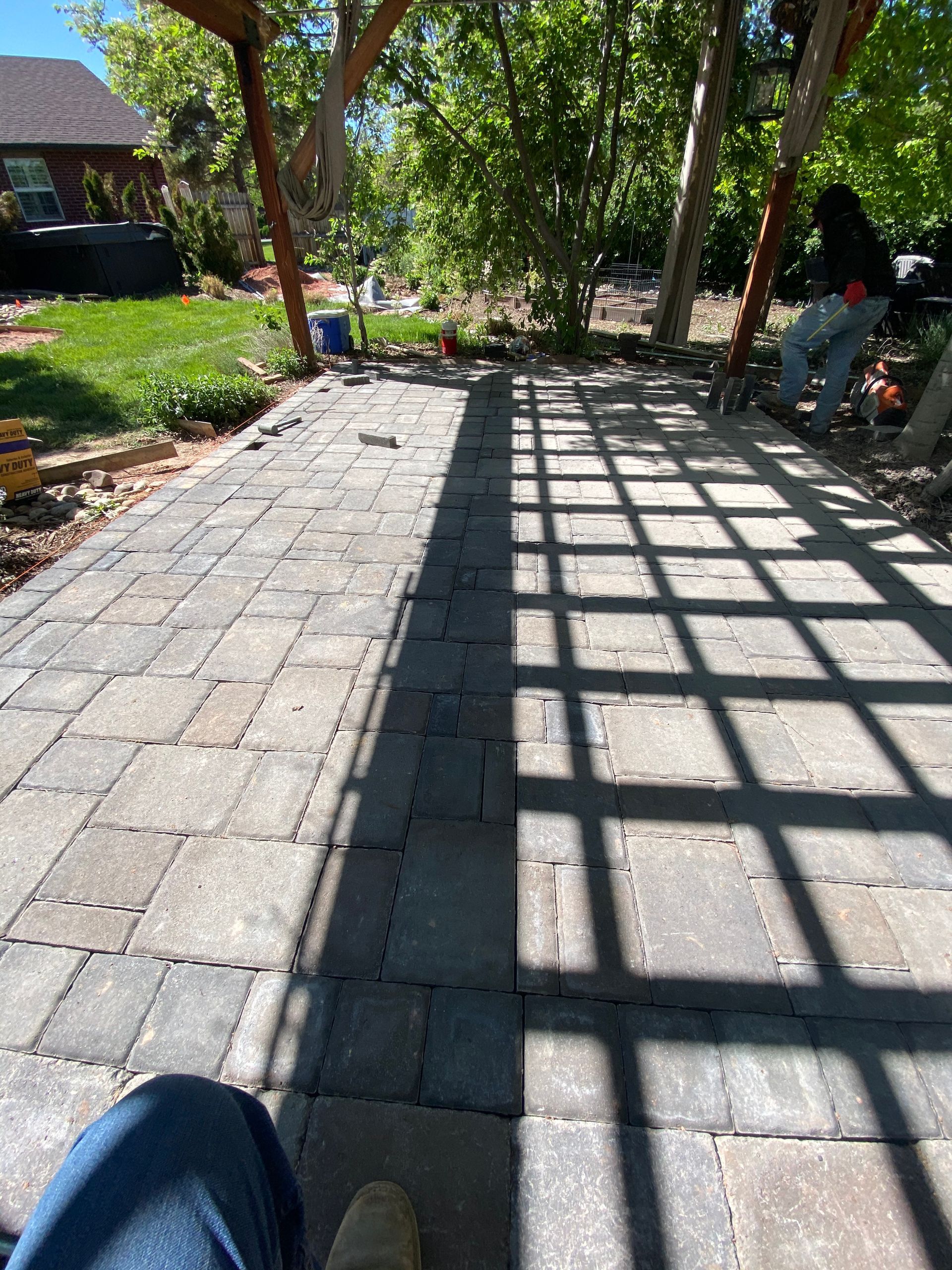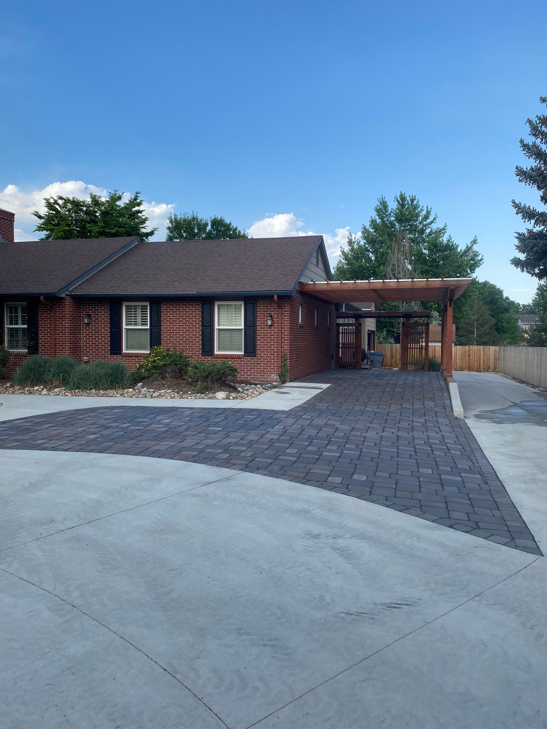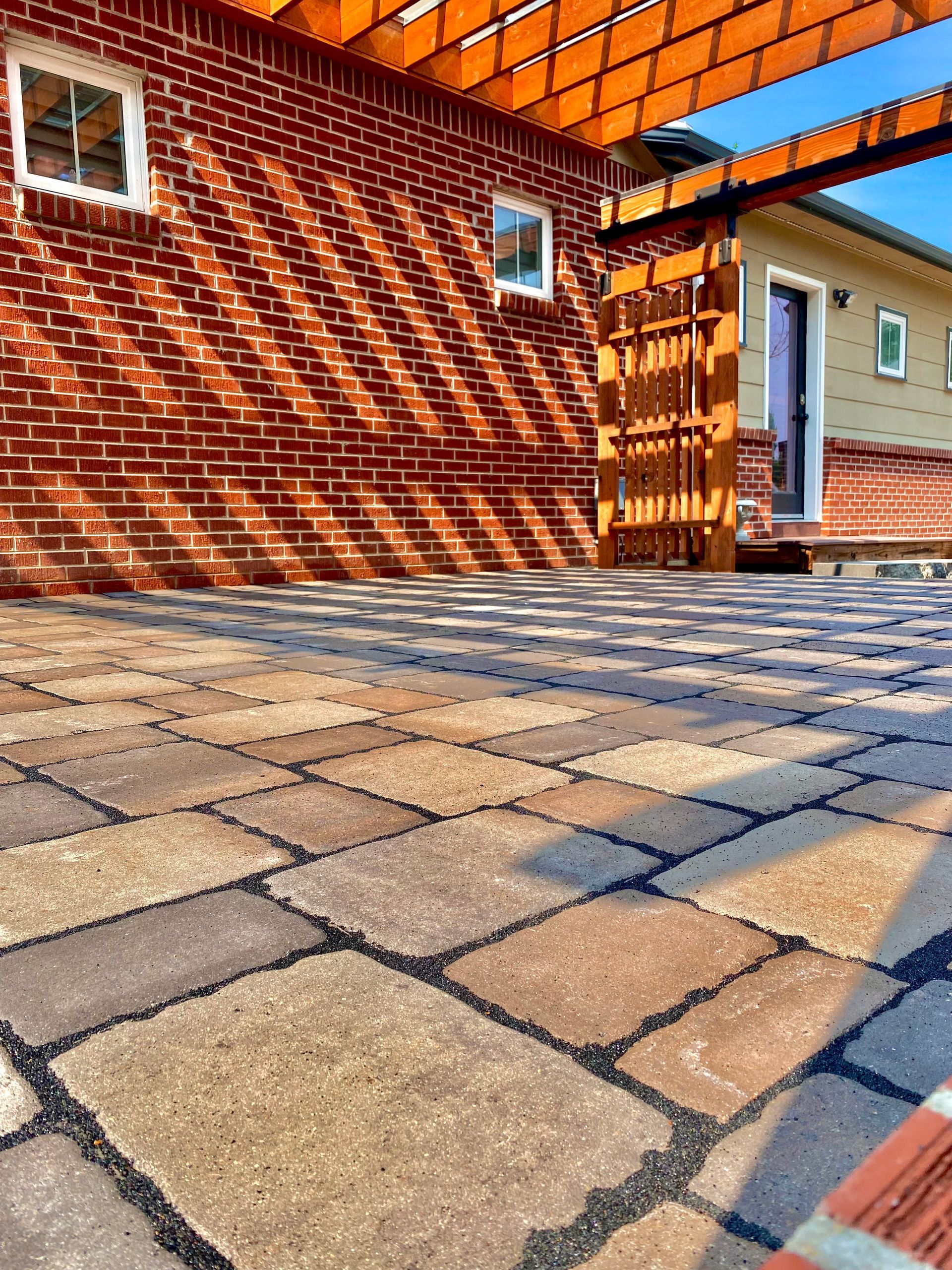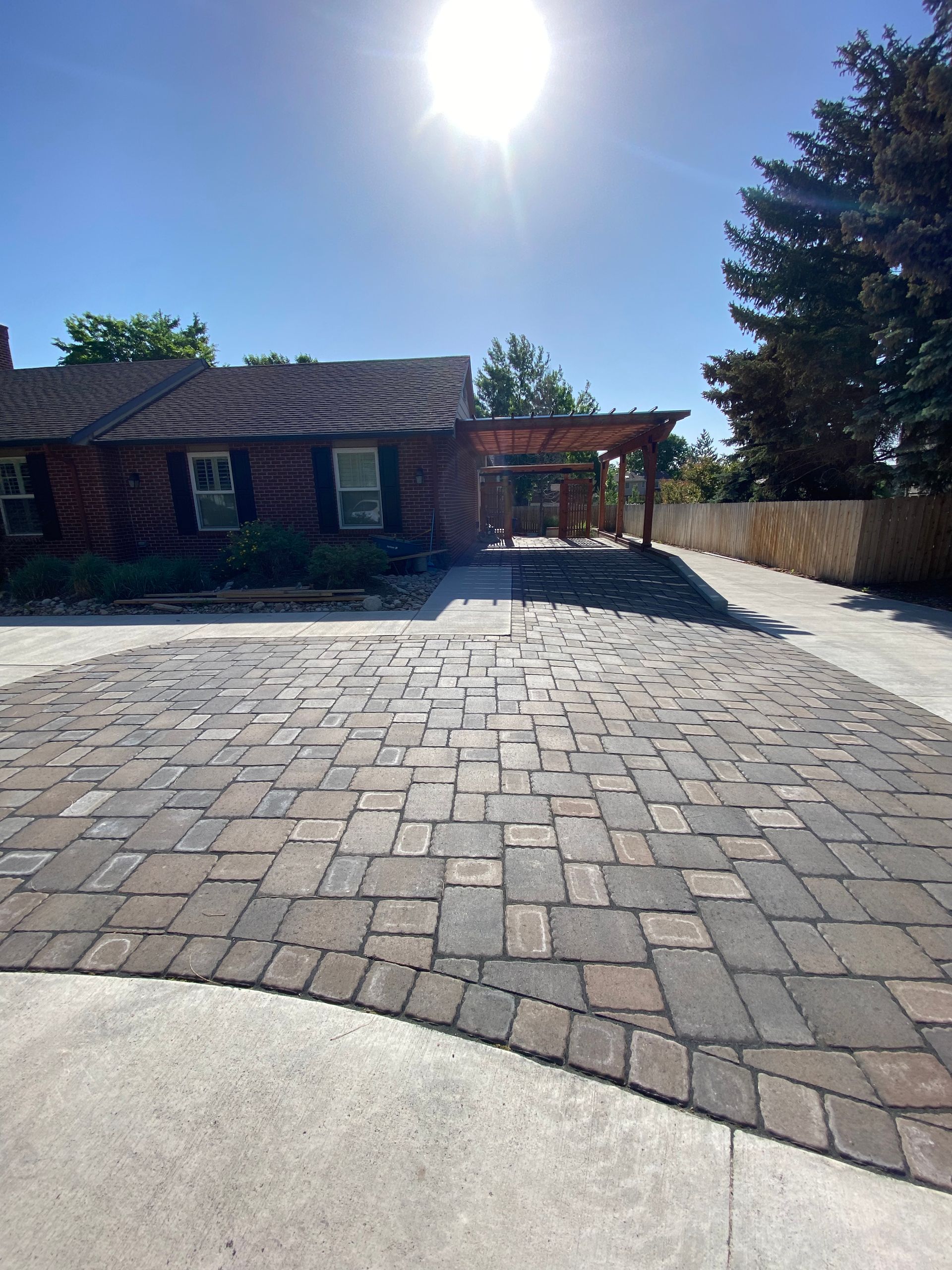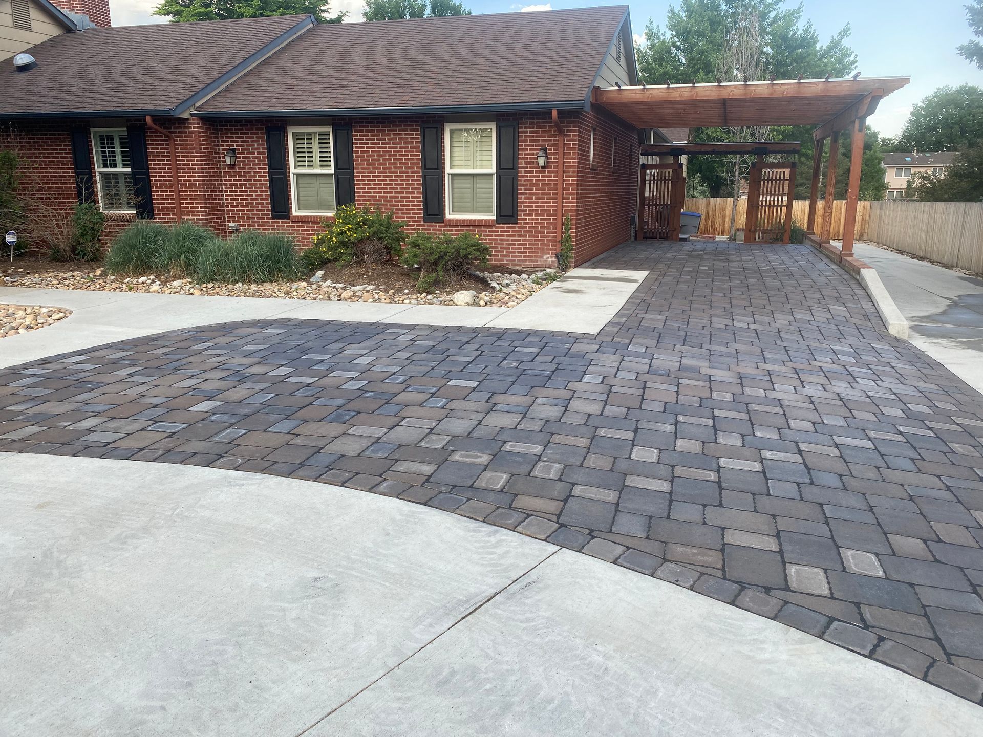 Patio areas that used to be Colorado red flagstone were changed to pavers with a new paver driveway addition. Borgert cobble series pavers. Longmont, CO 2021
