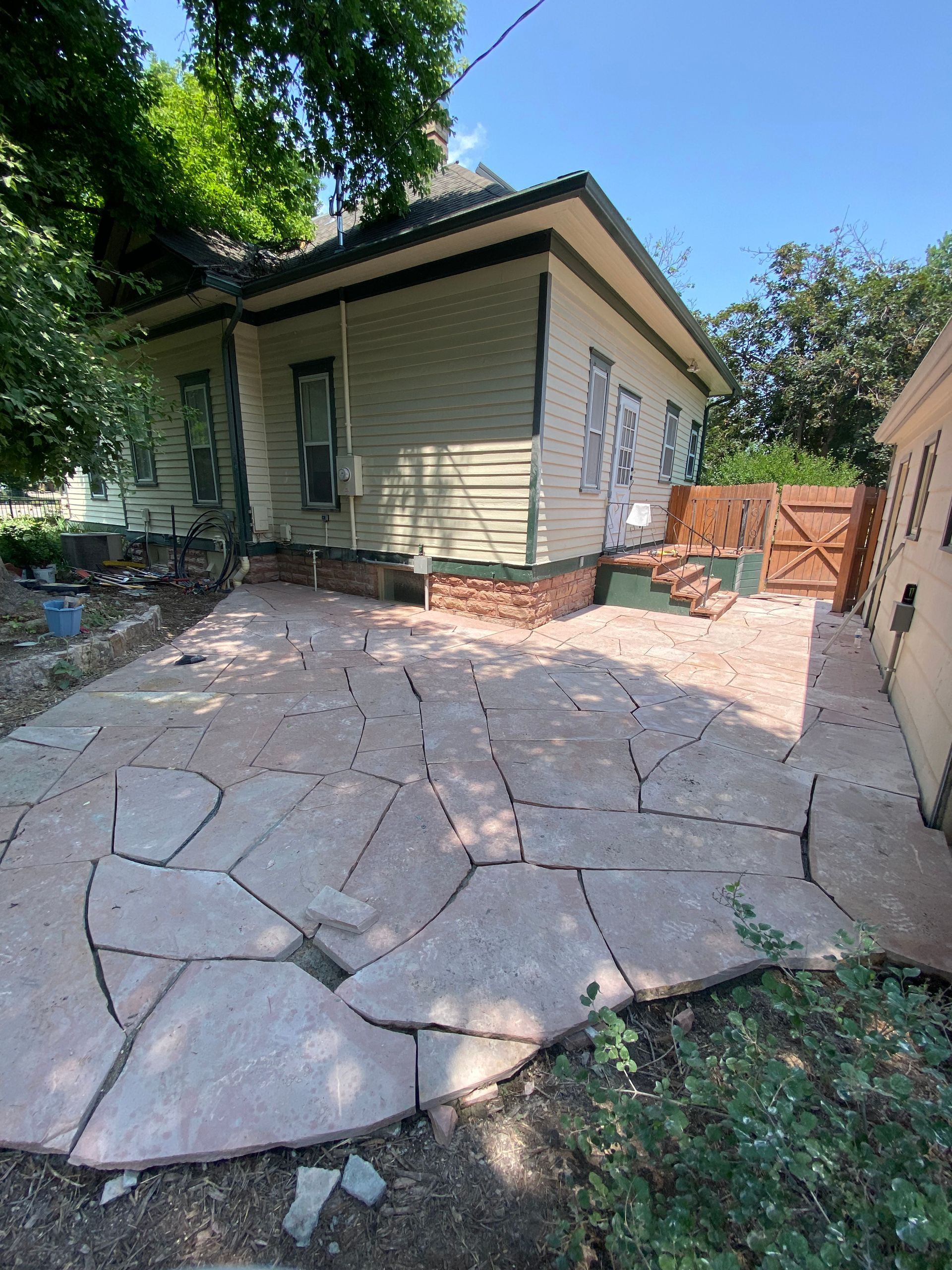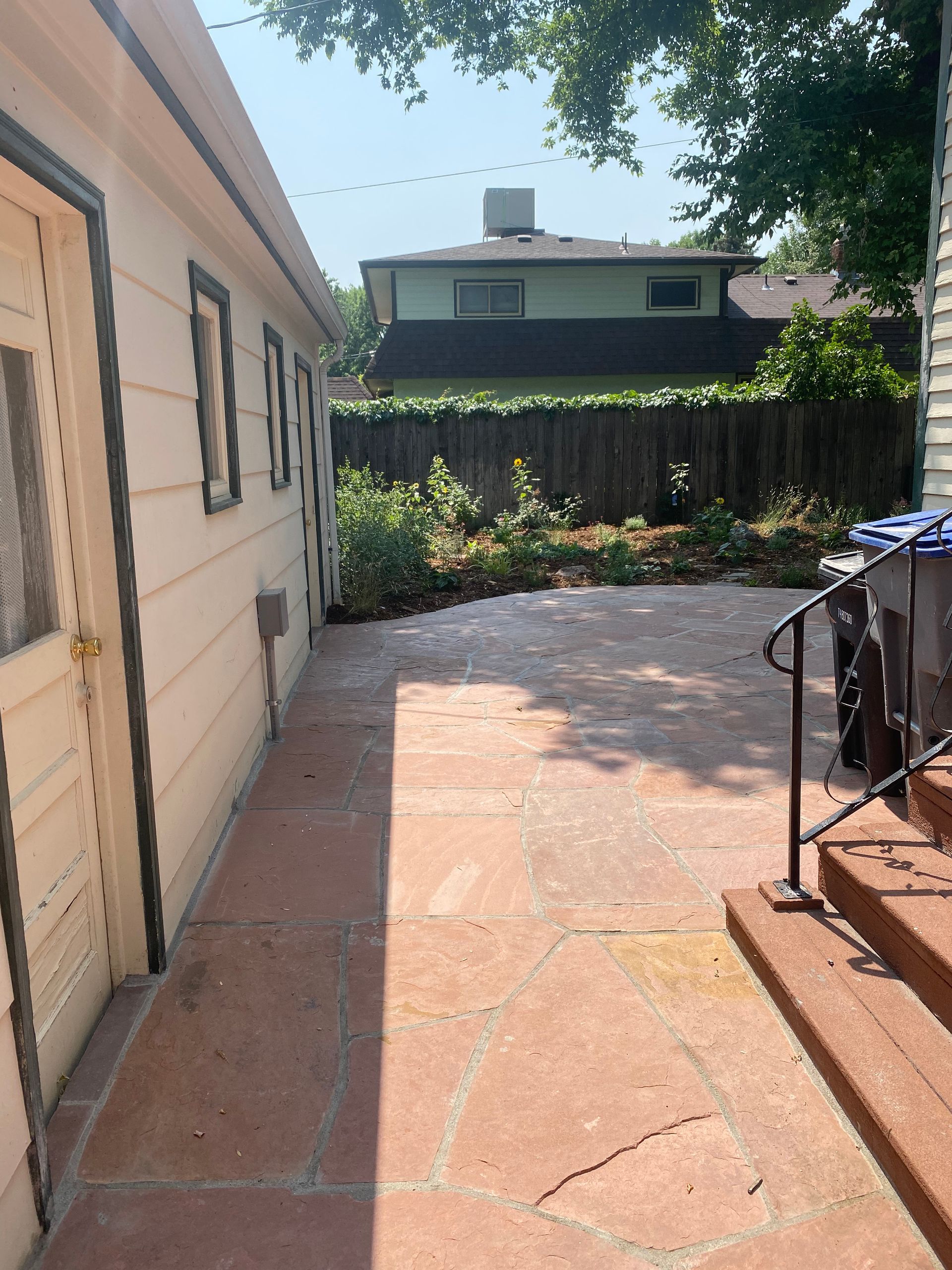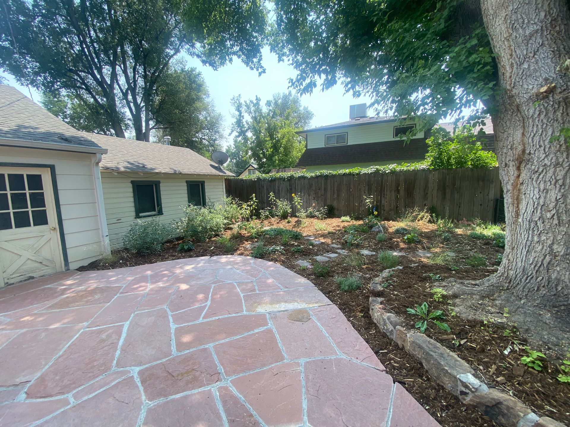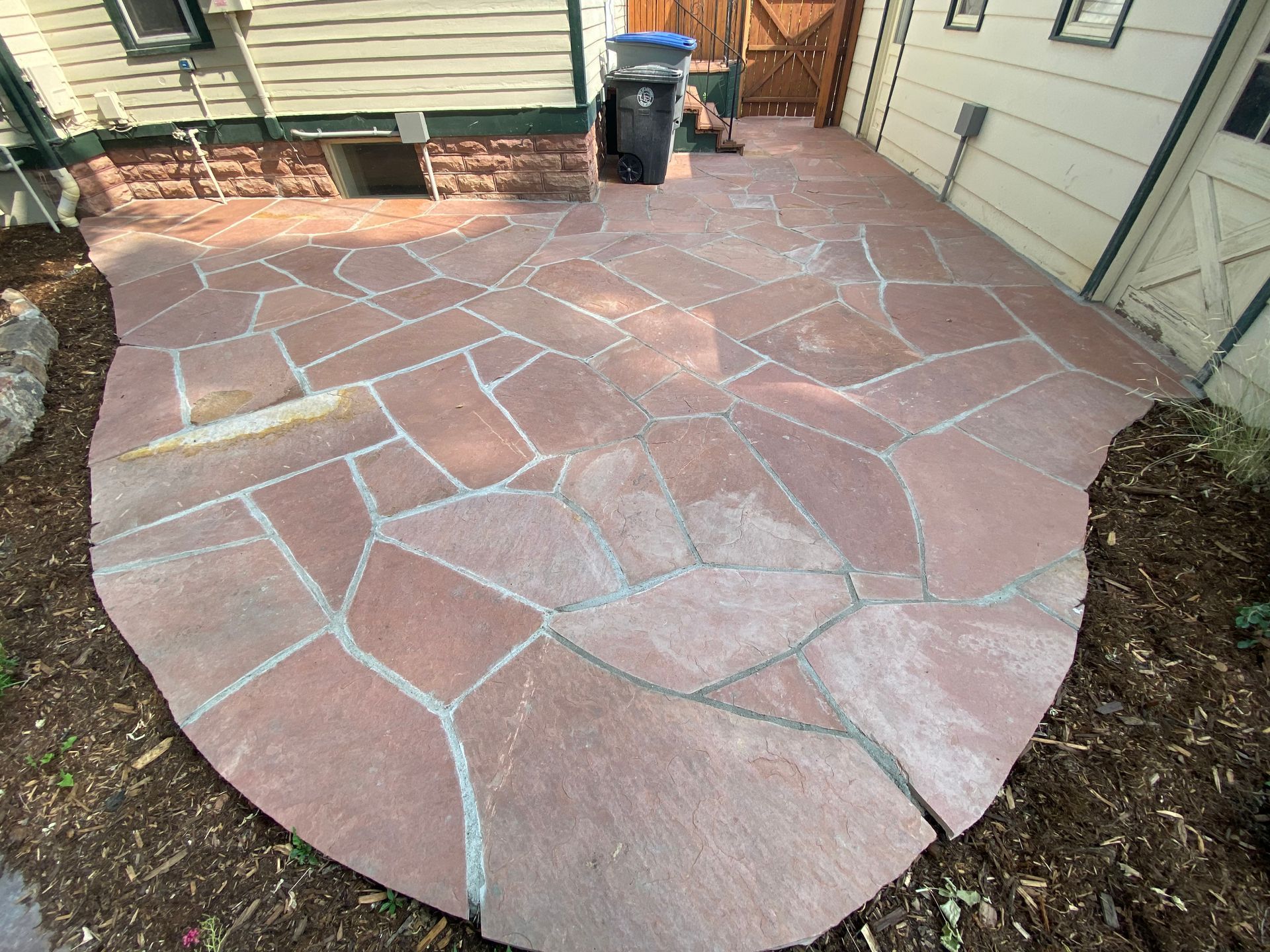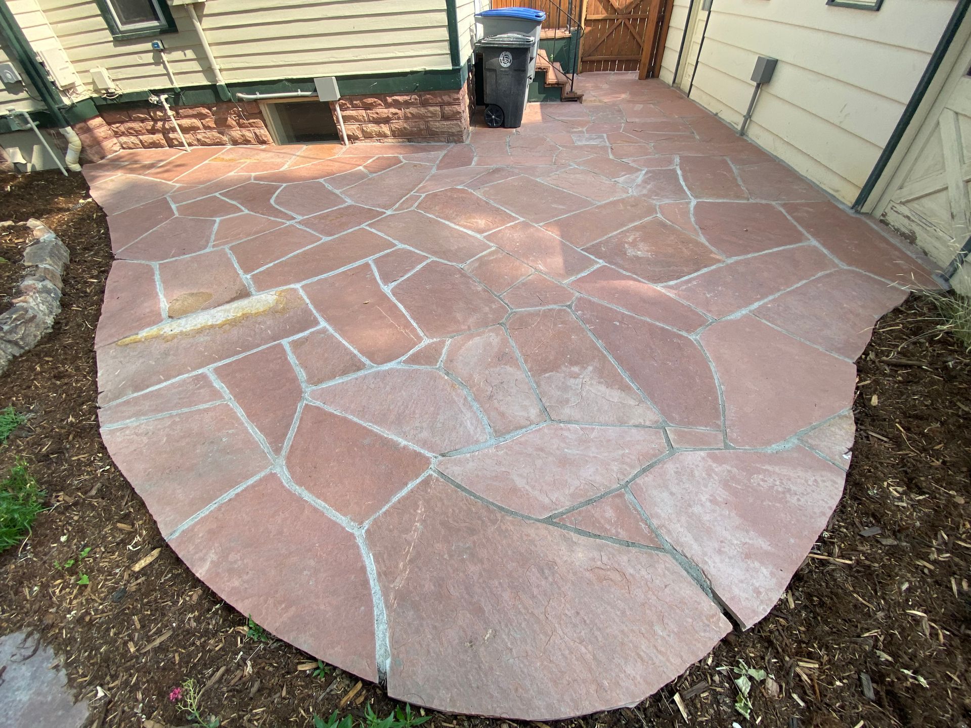 Colorado red flagstone patio set in mortar and in joints with previously concrete base. Matches color of house with addition of color in plantings. Longmont, CO 2021