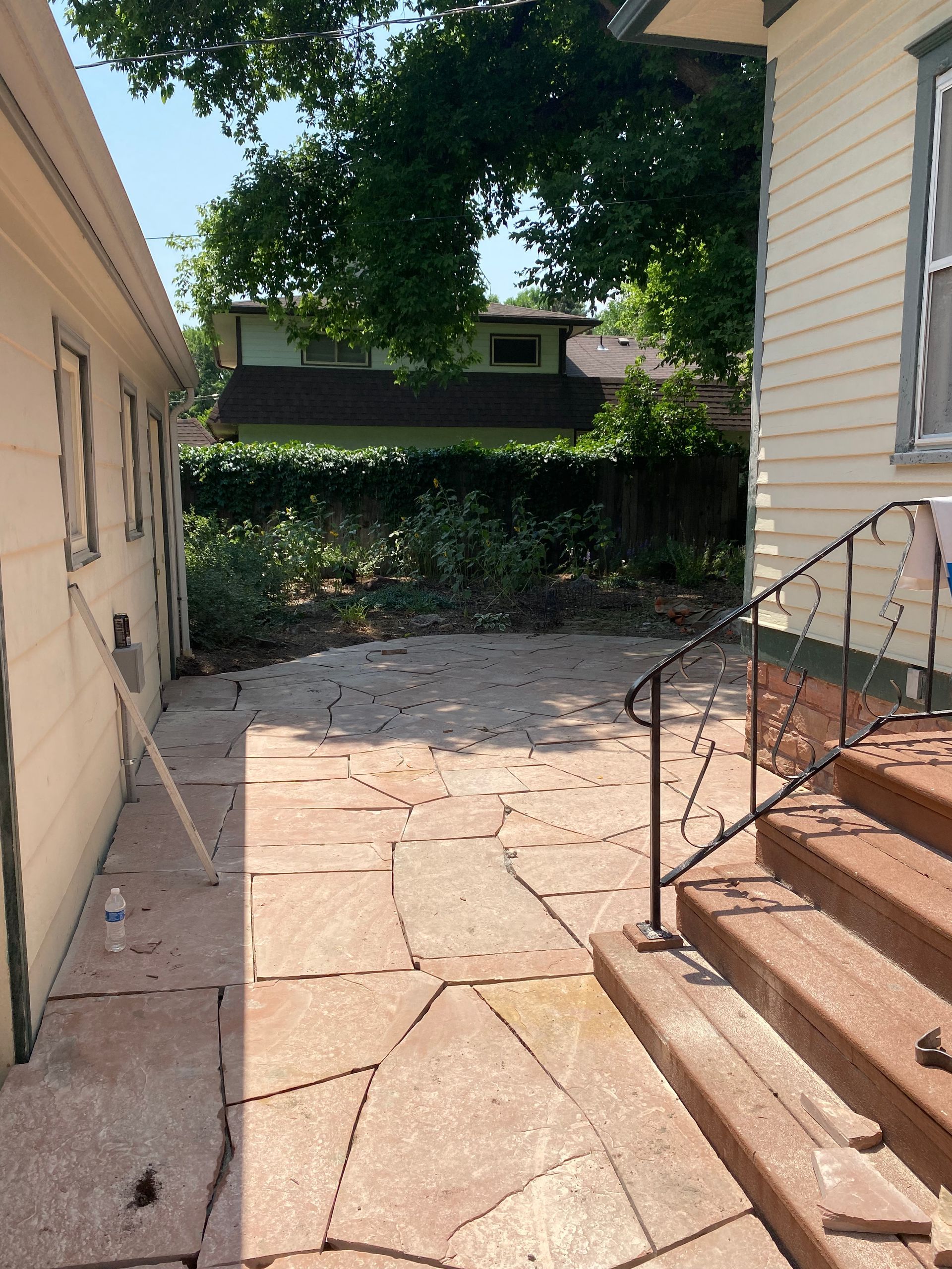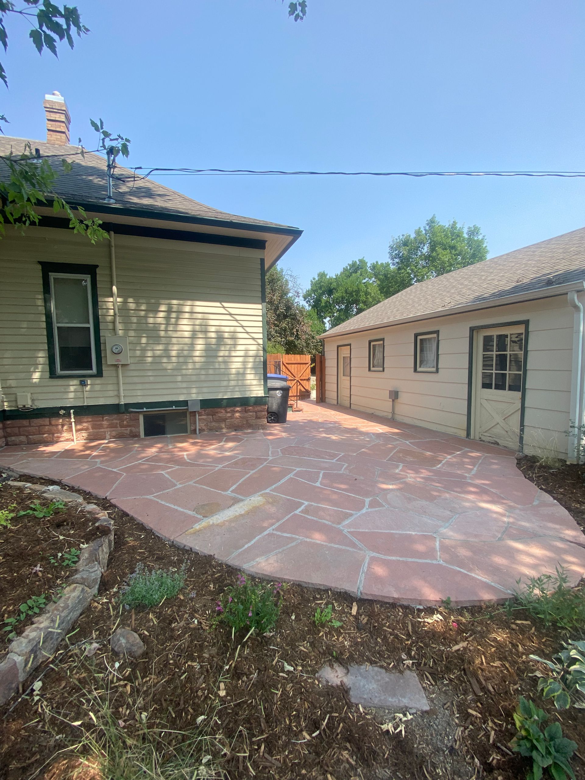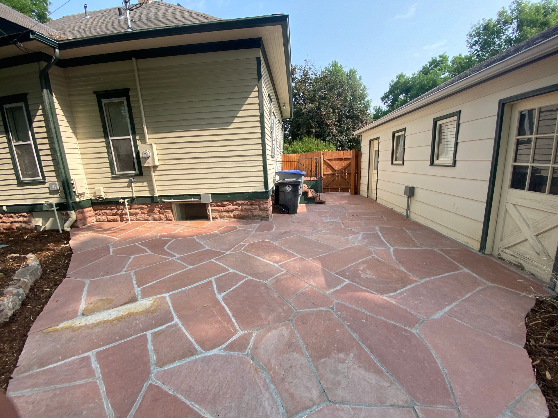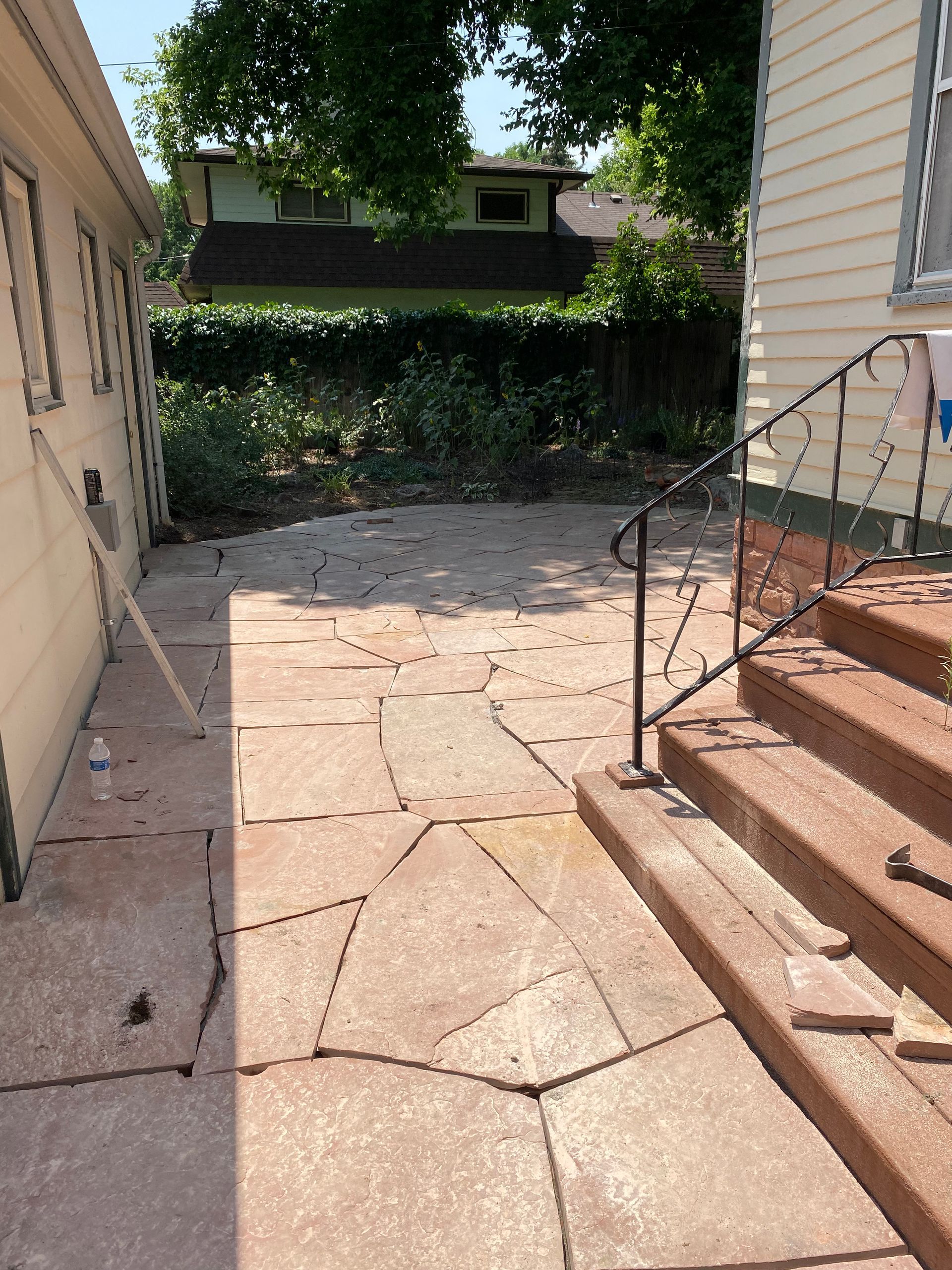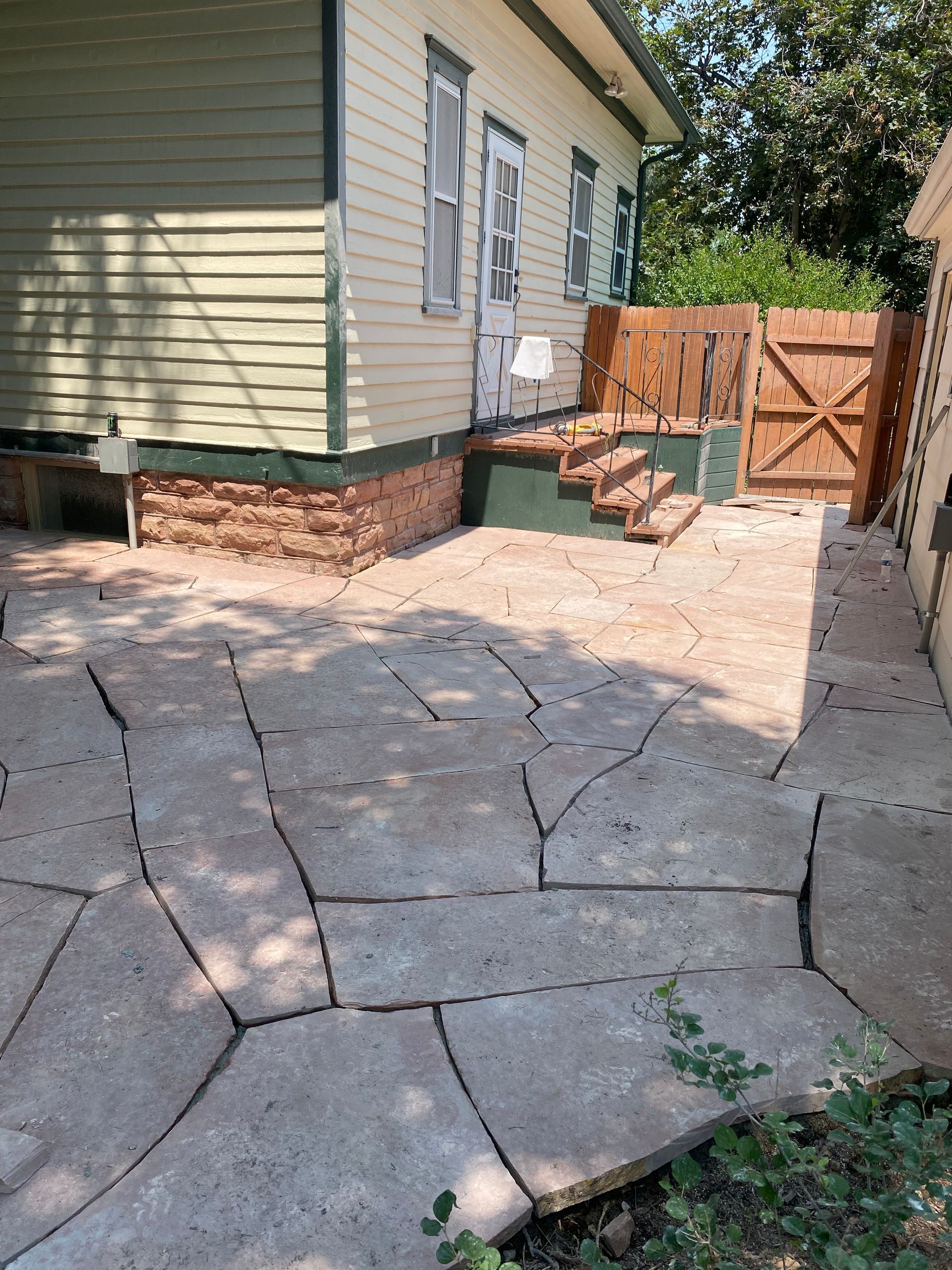 Colorado red flagstone patio set in mortar and in joints with previously concrete base. Matches color of house with addition of color in plantings. Longmont, CO 2021