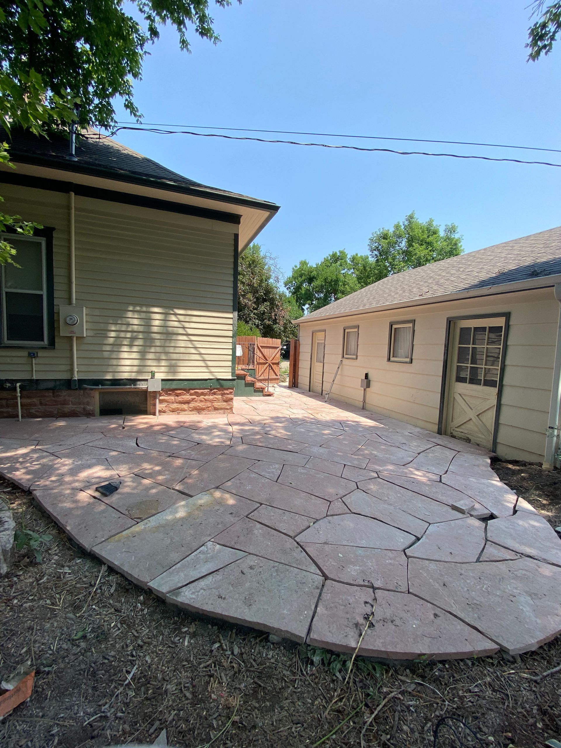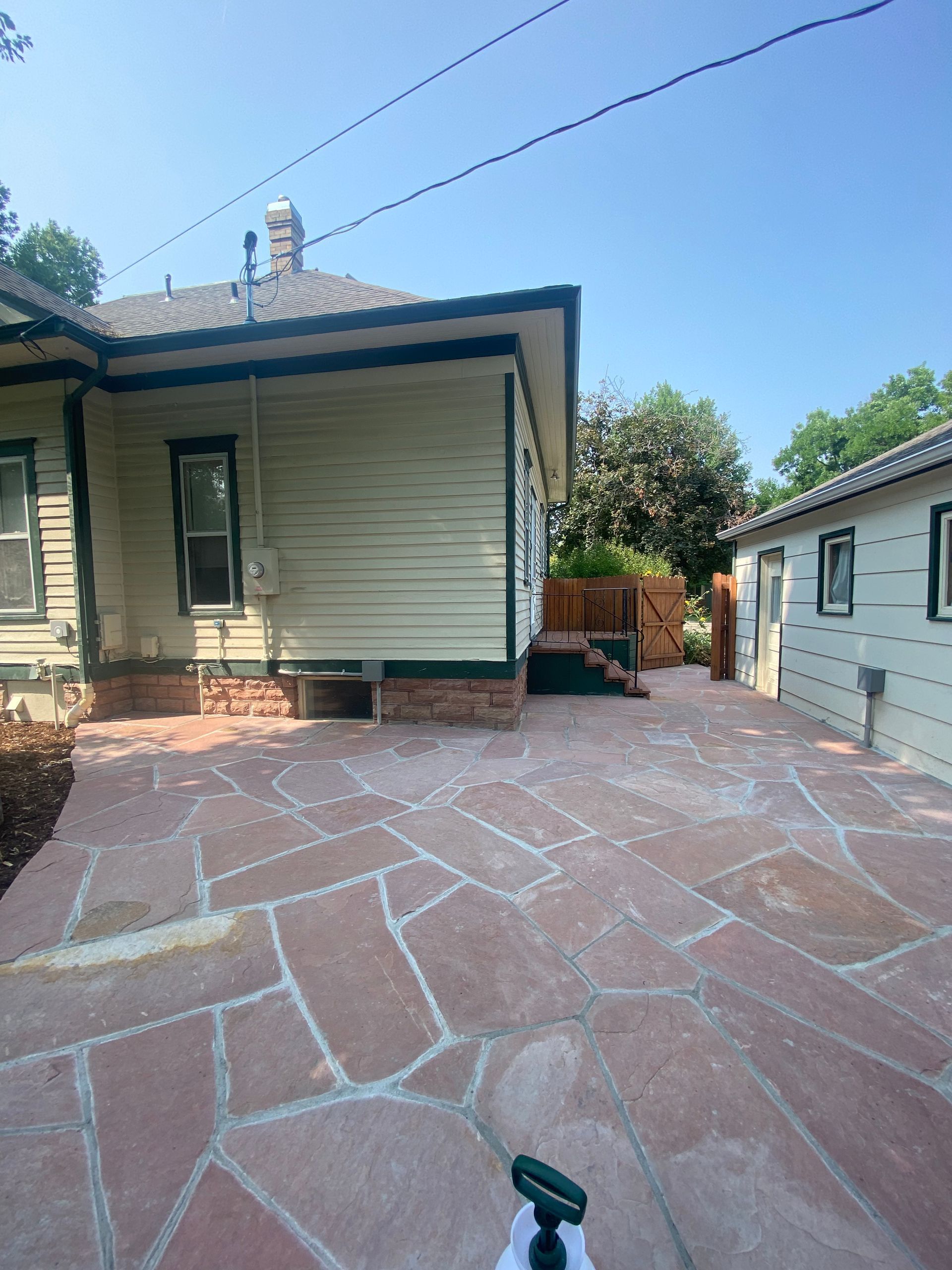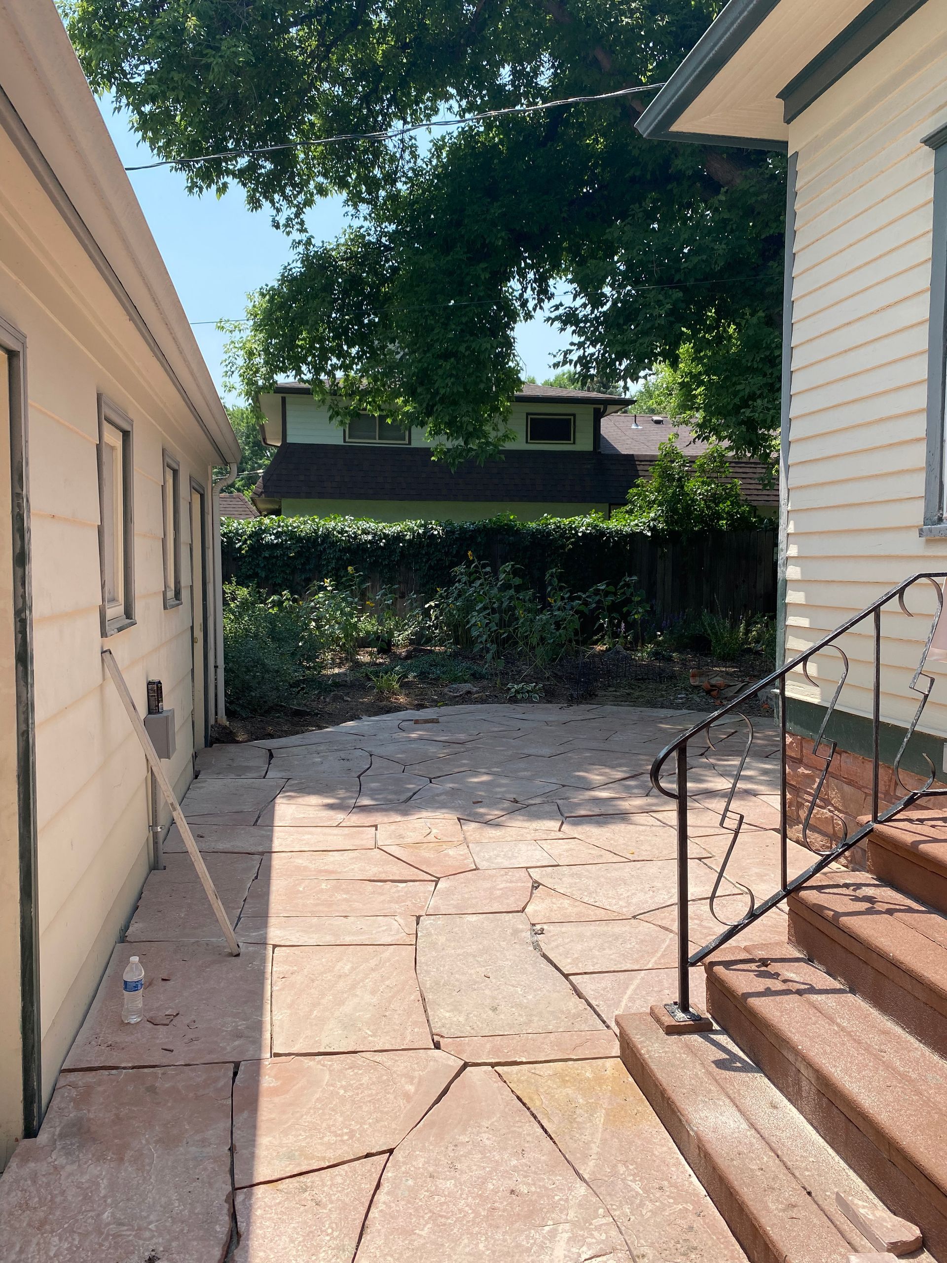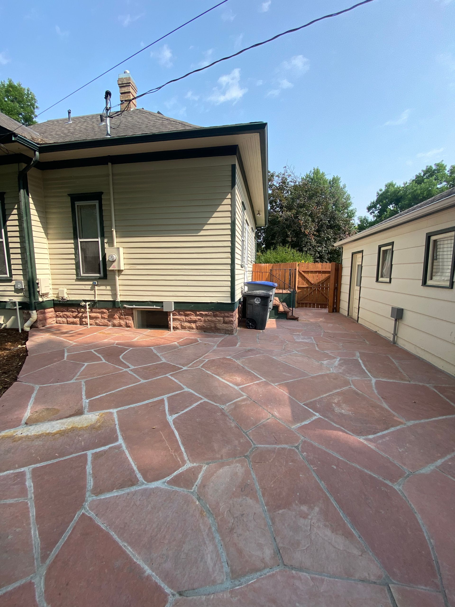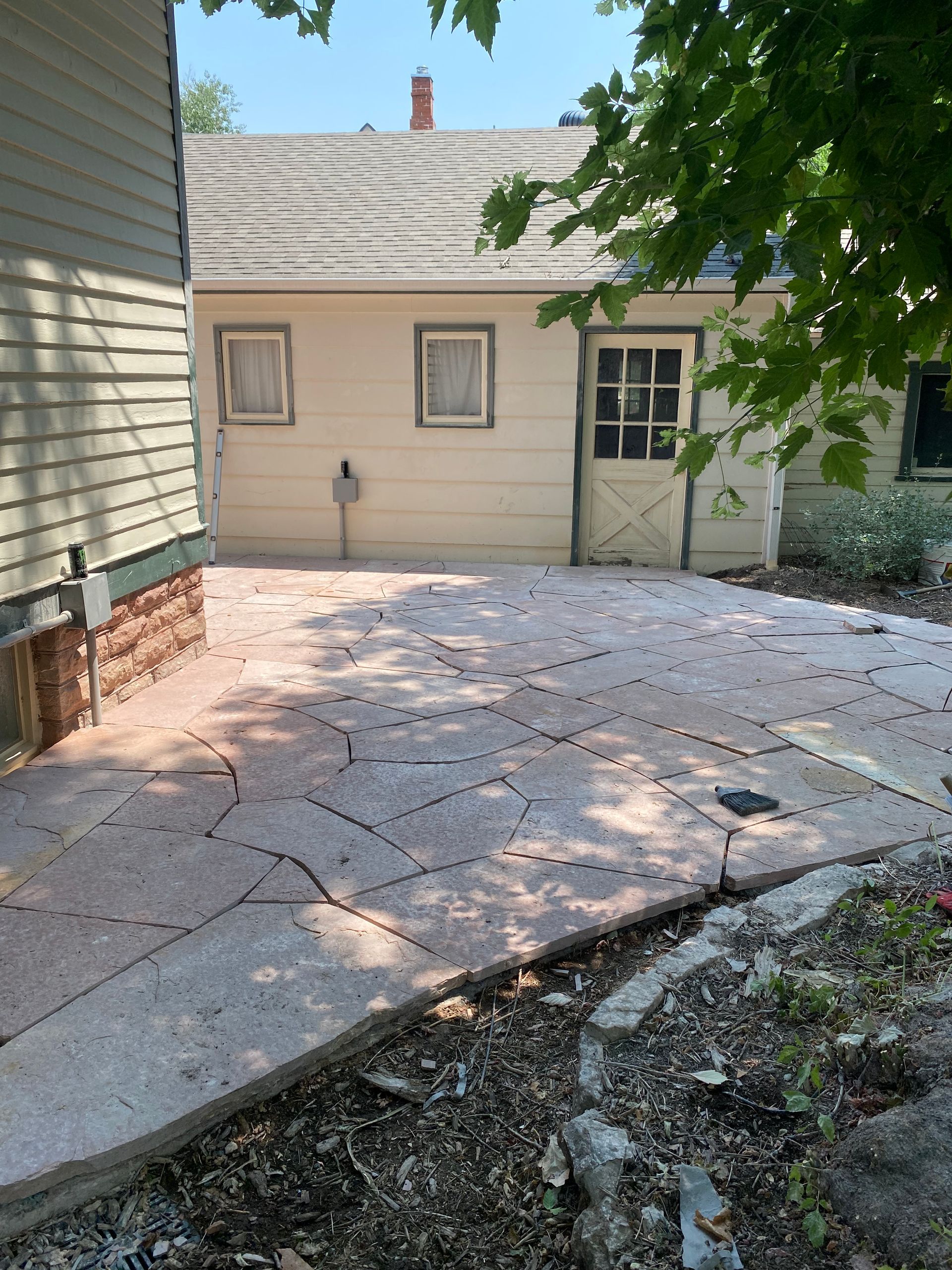 Colorado red flagstone patio set in mortar and in joints with previously concrete base. Matches color of house with addition of color in plantings. Longmont, CO 2021
