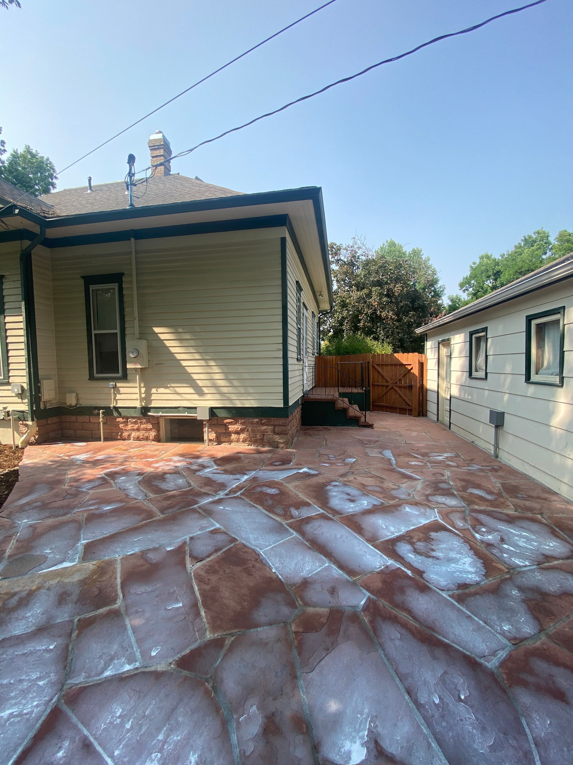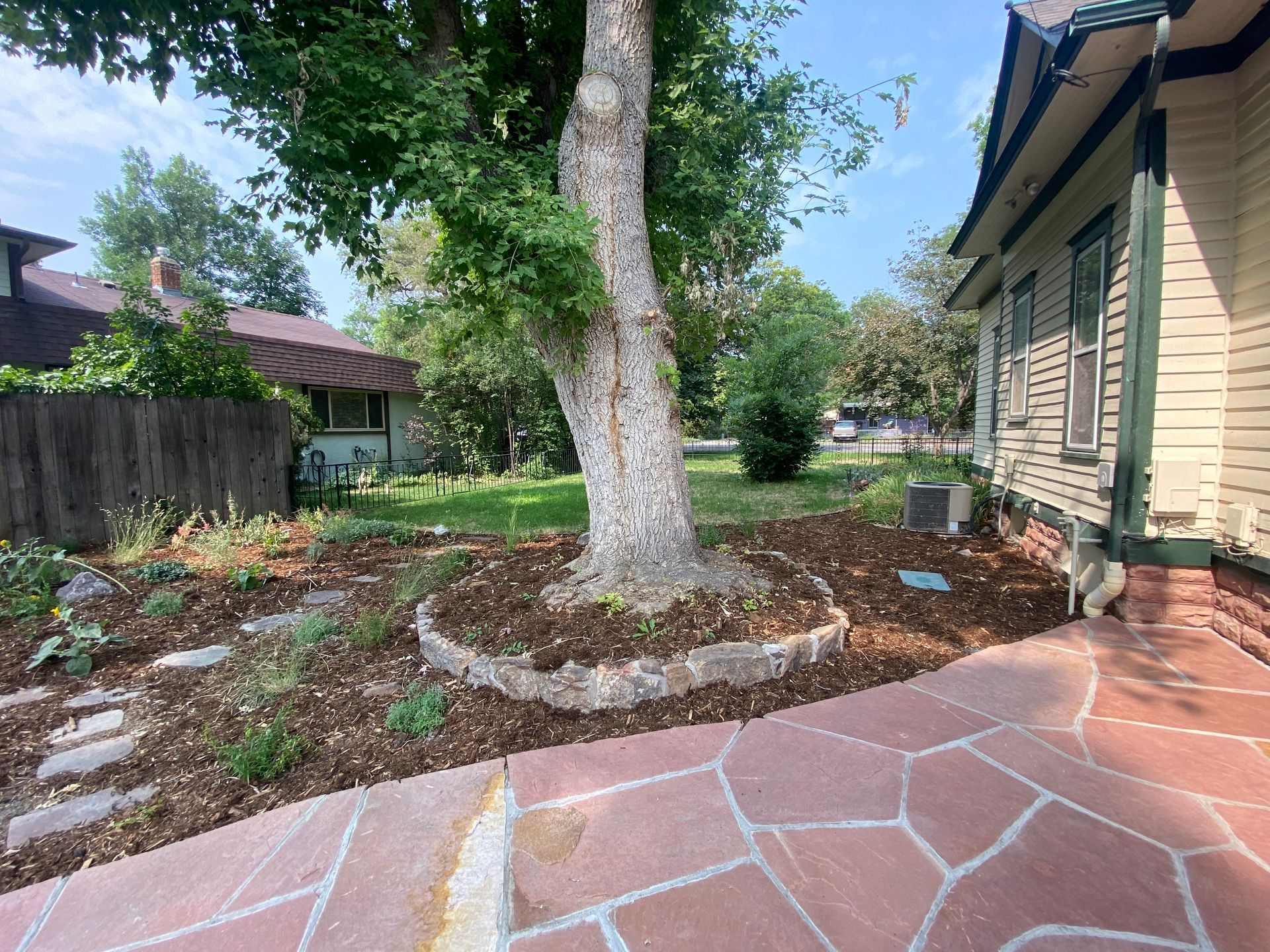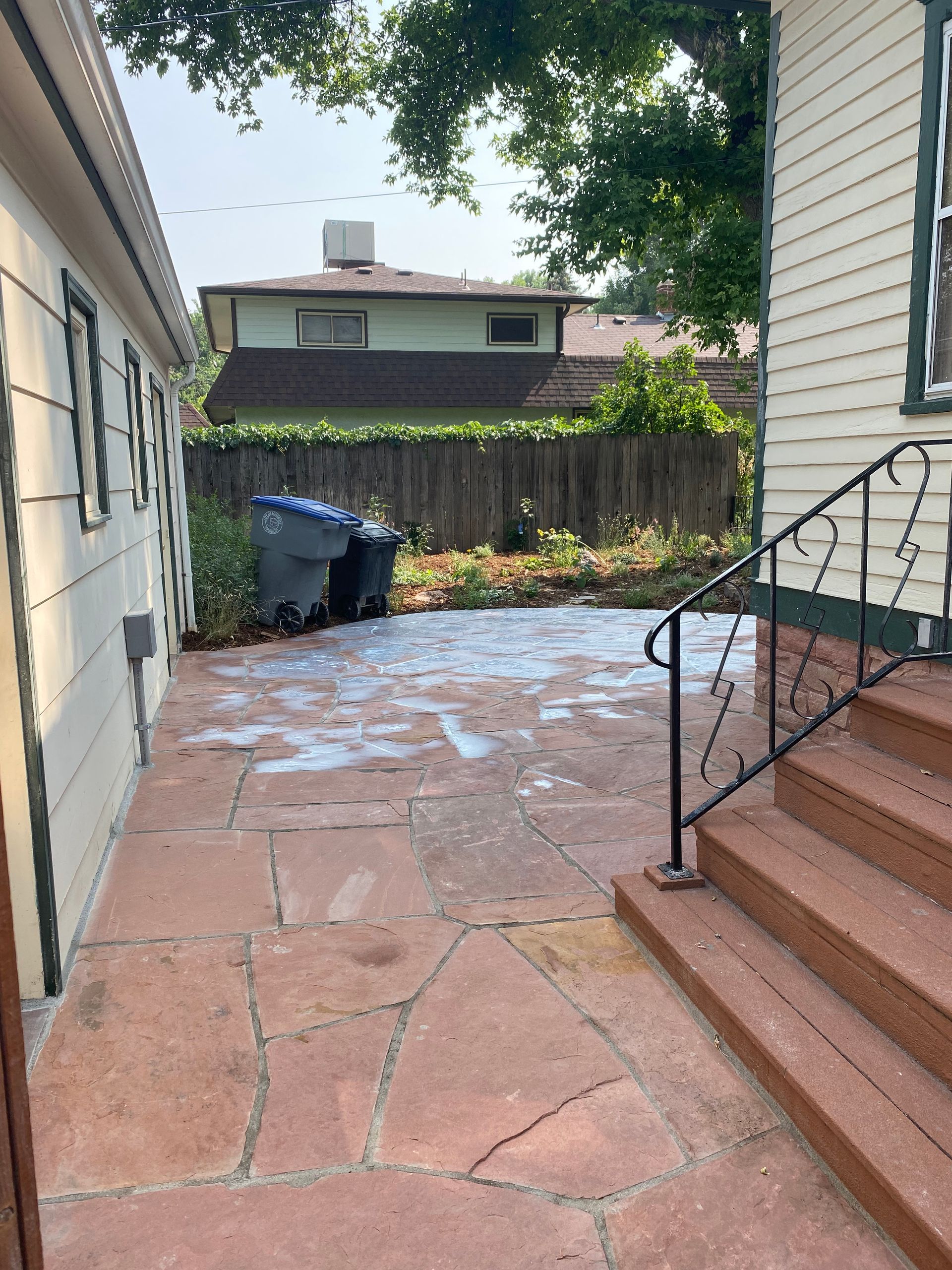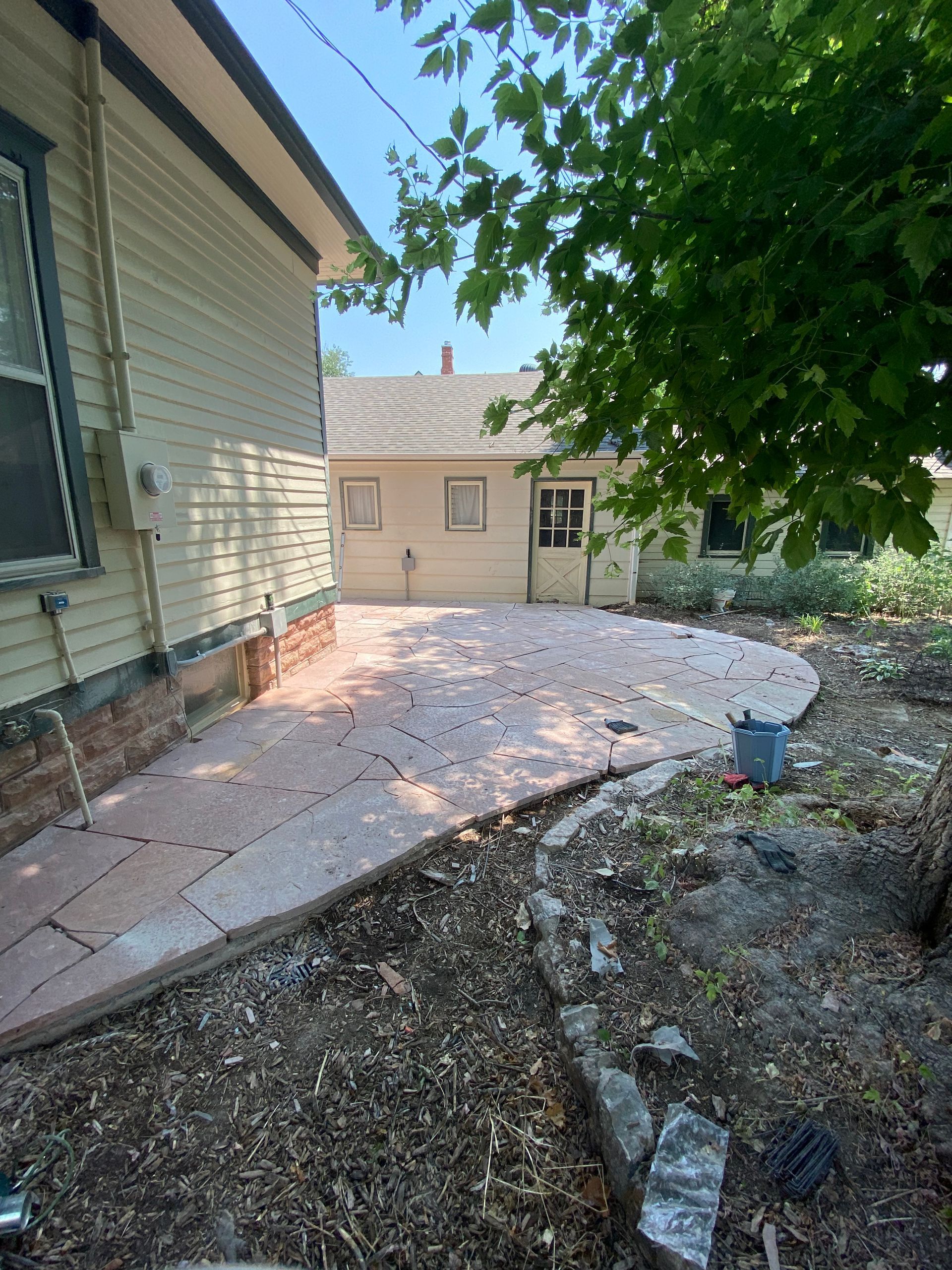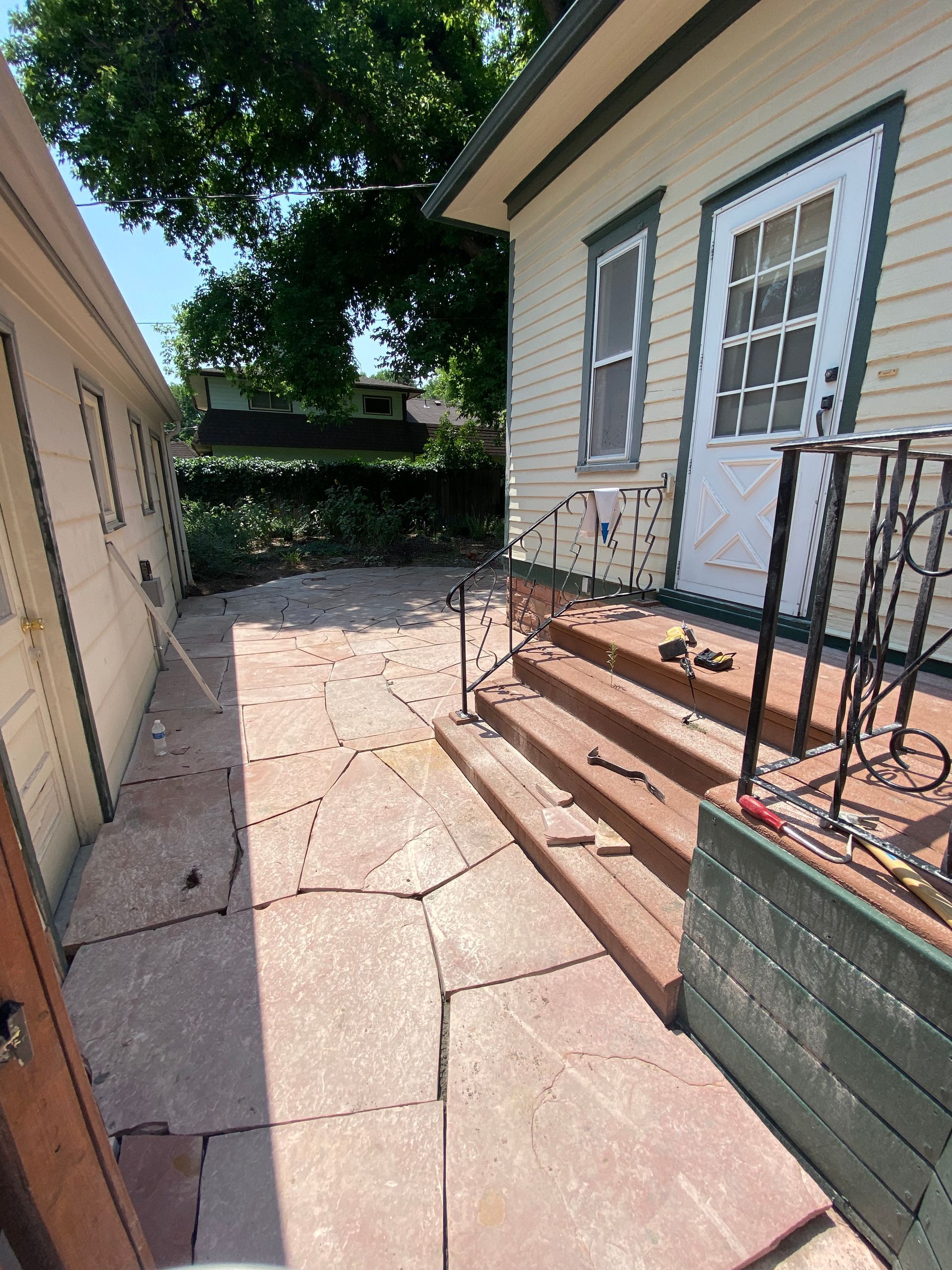 Colorado red flagstone patio set in mortar and in joints with previously concrete base. Matches color of house with addition of color in plantings. Longmont, CO 2021