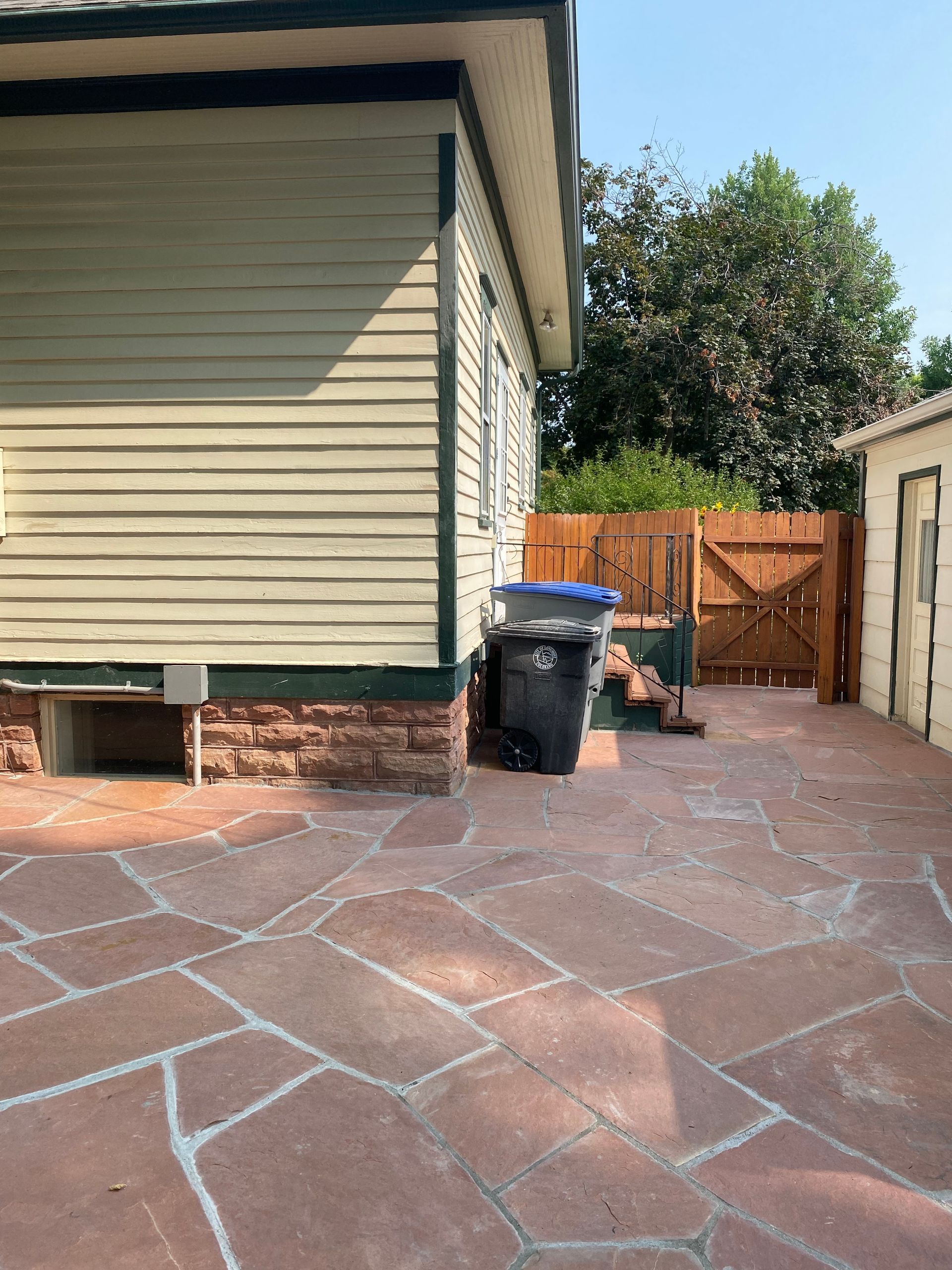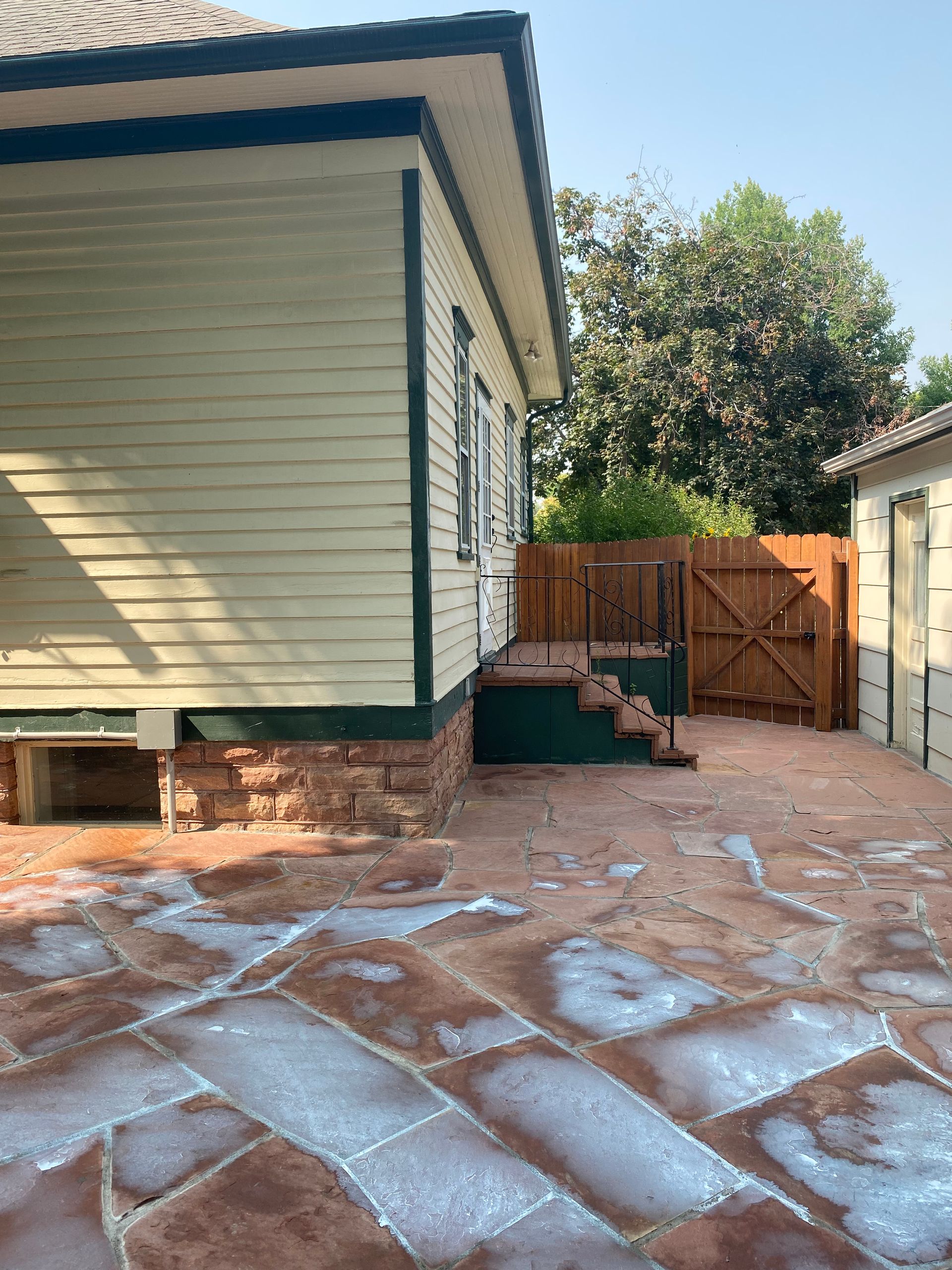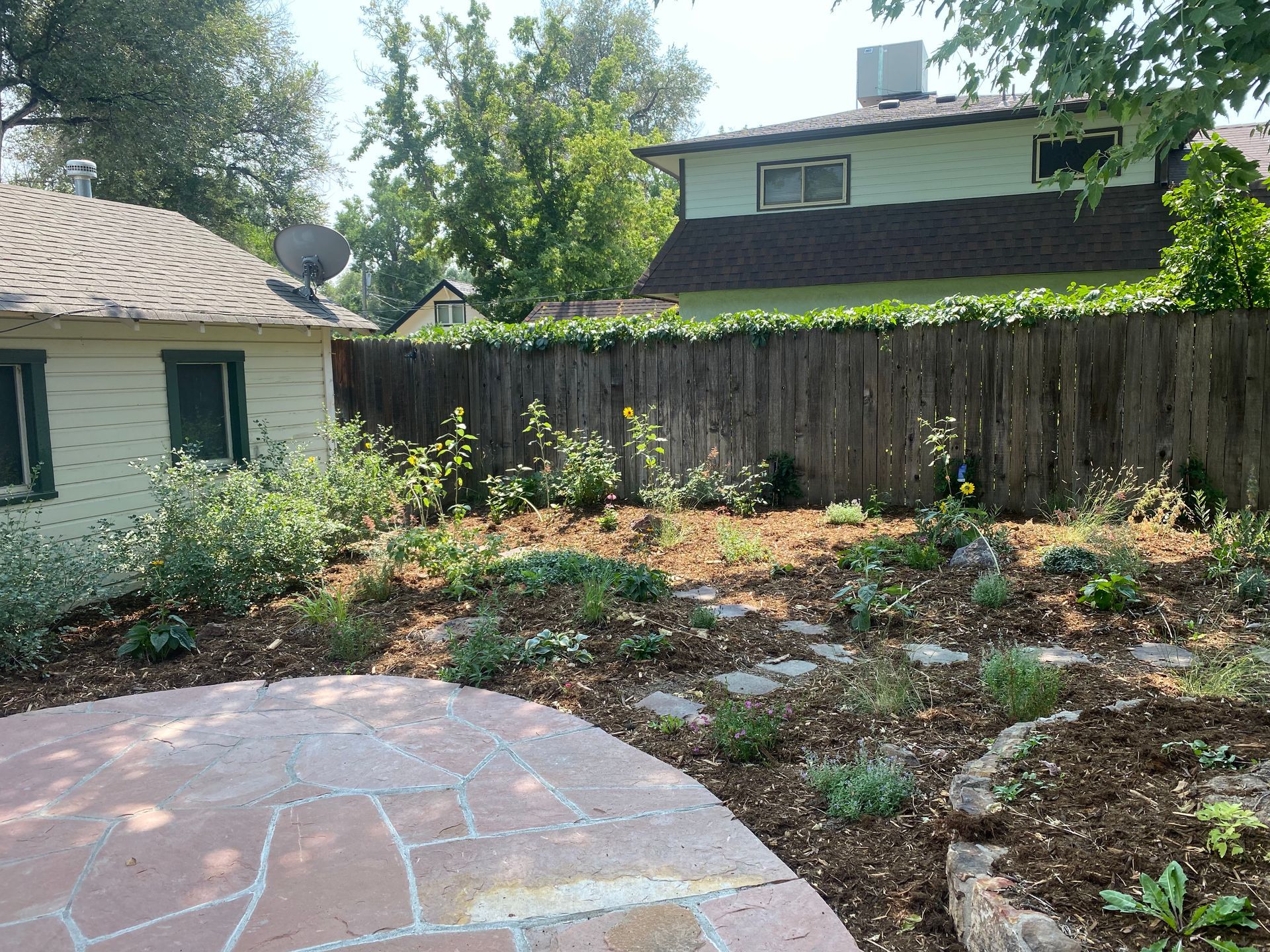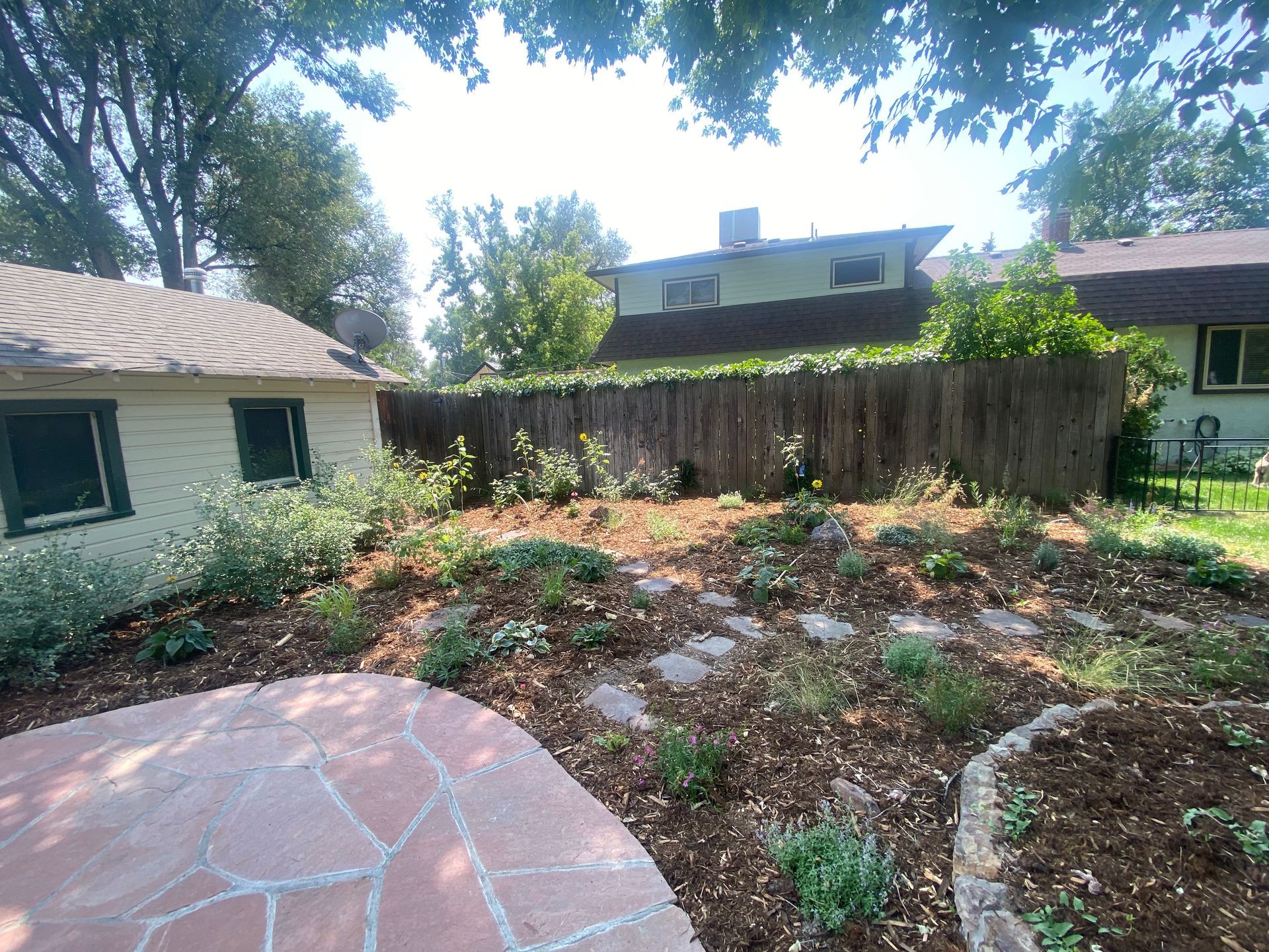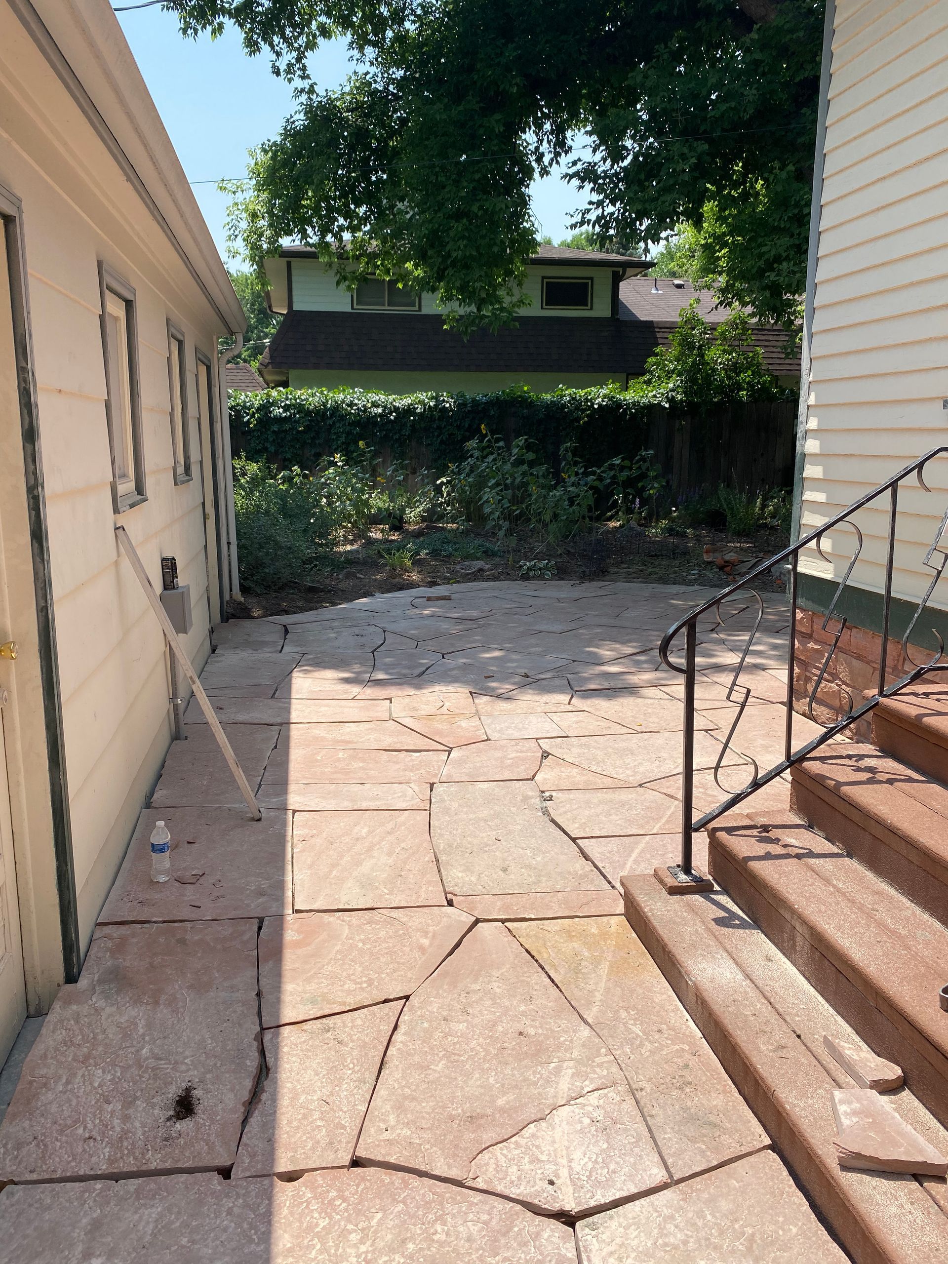 Colorado red flagstone patio set in mortar and in joints with previously concrete base. Matches color of house with addition of color in plantings. Longmont, CO 2021