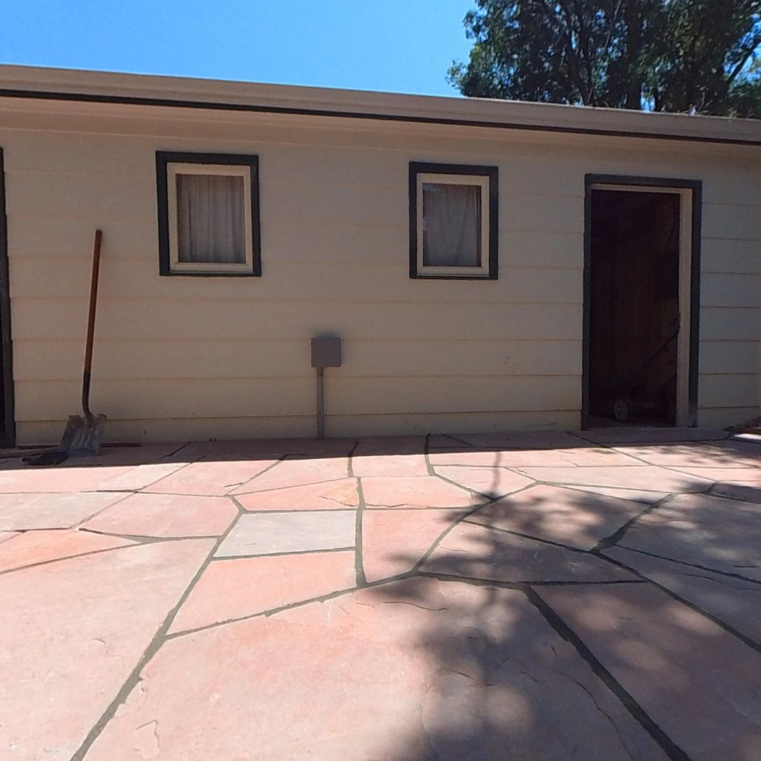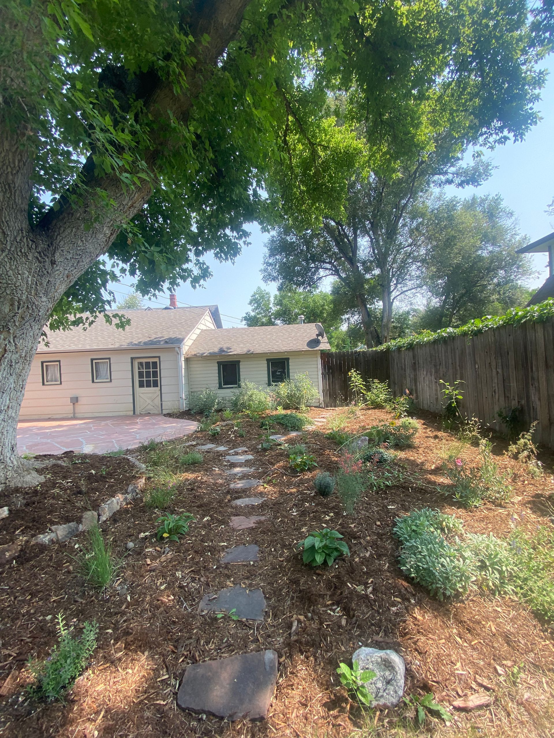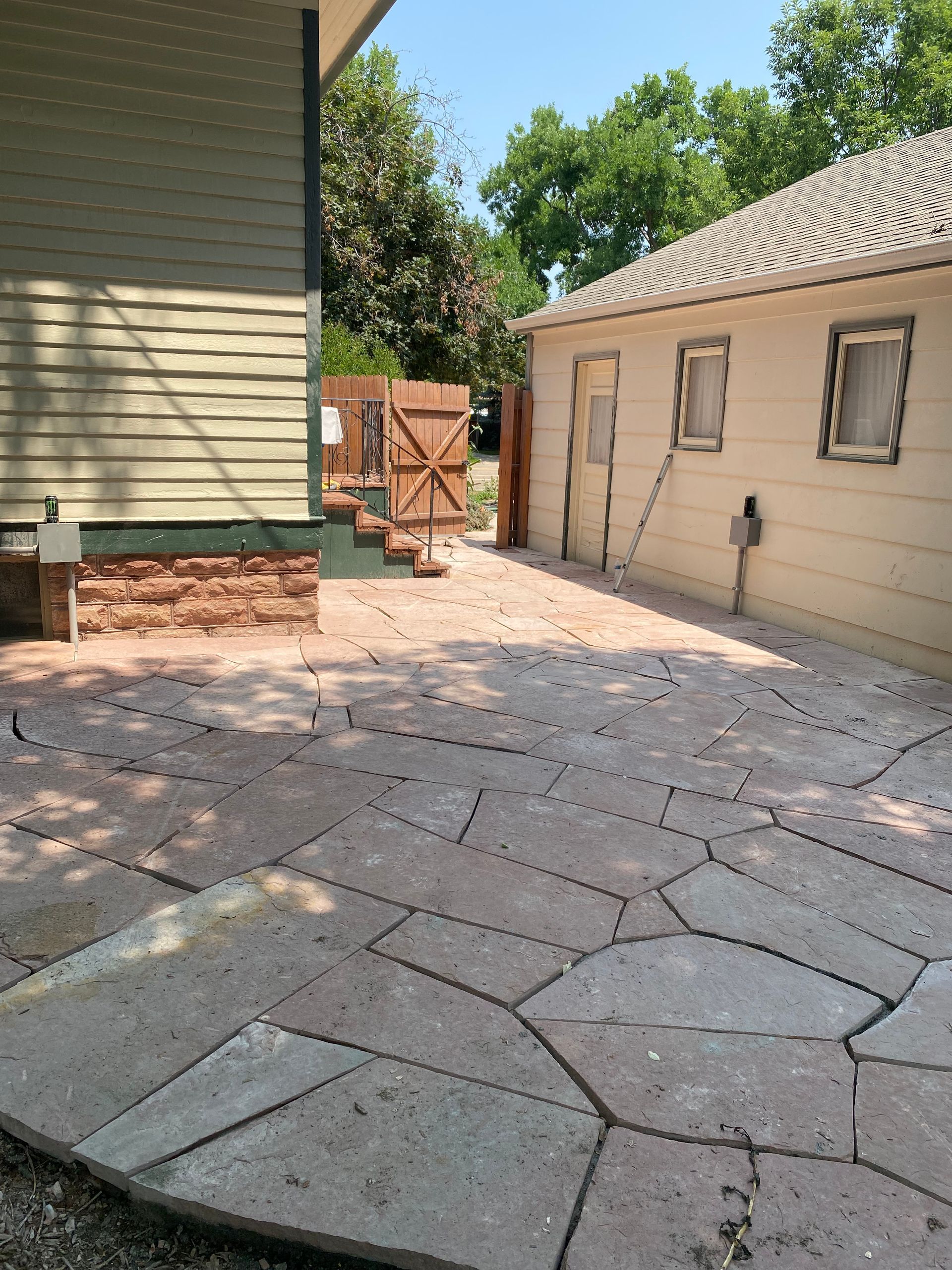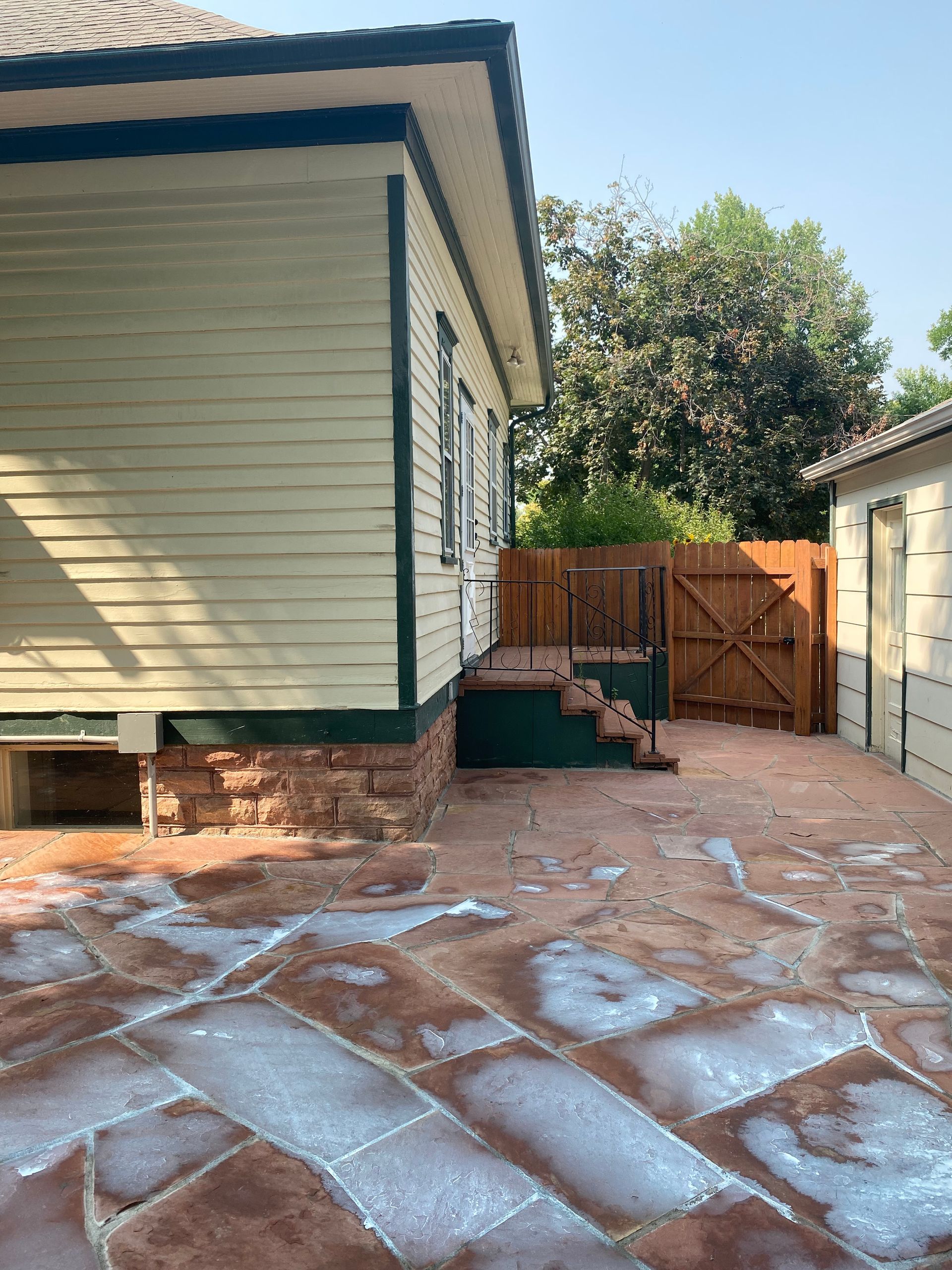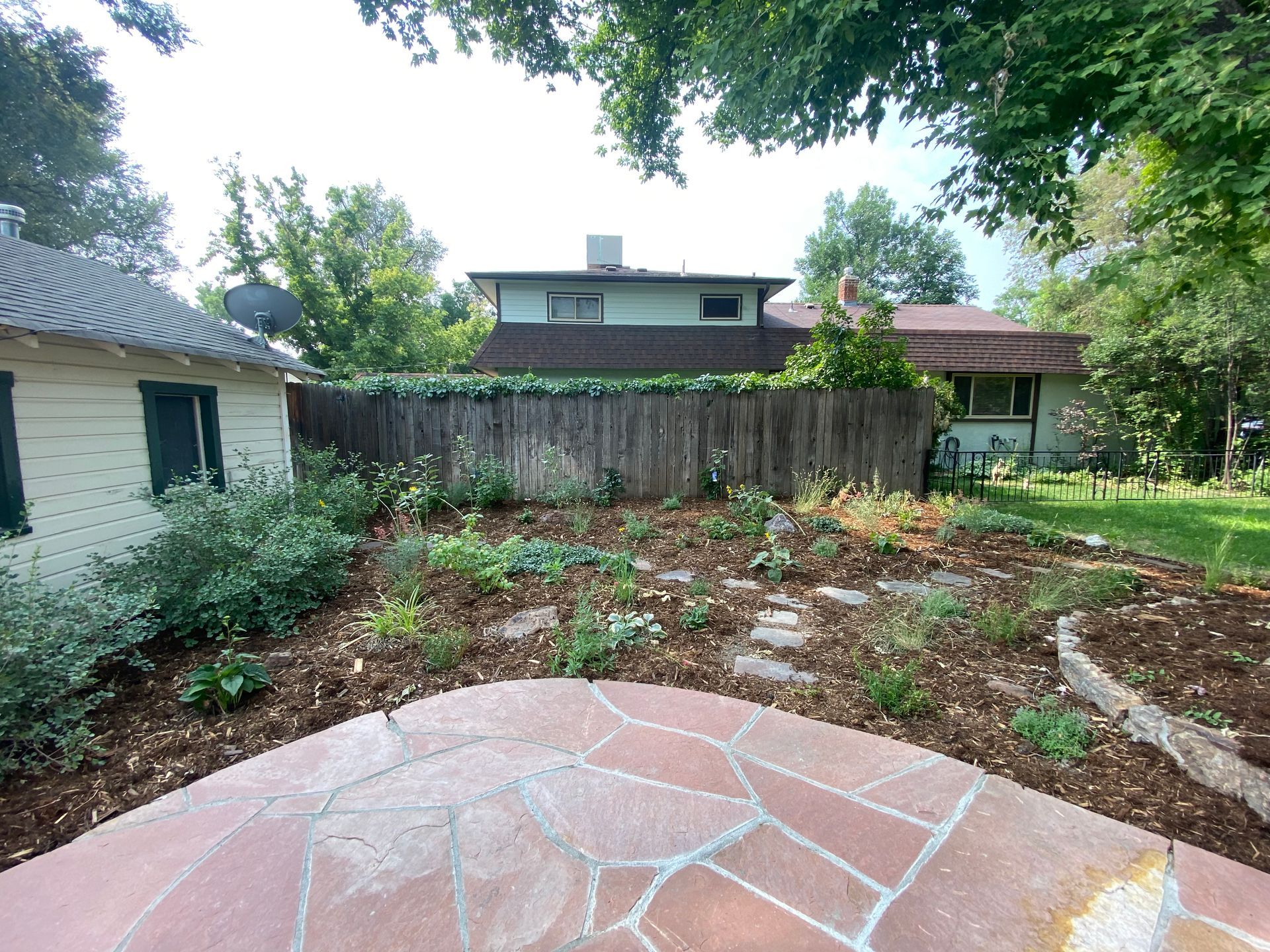 Colorado red flagstone patio set in mortar and in joints with previously concrete base. Matches color of house with addition of color in plantings. Longmont, CO 2021