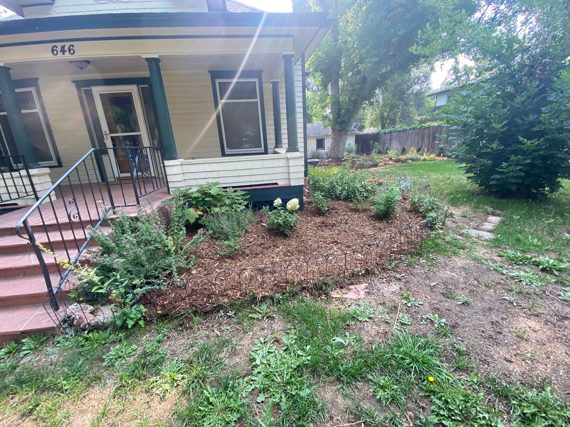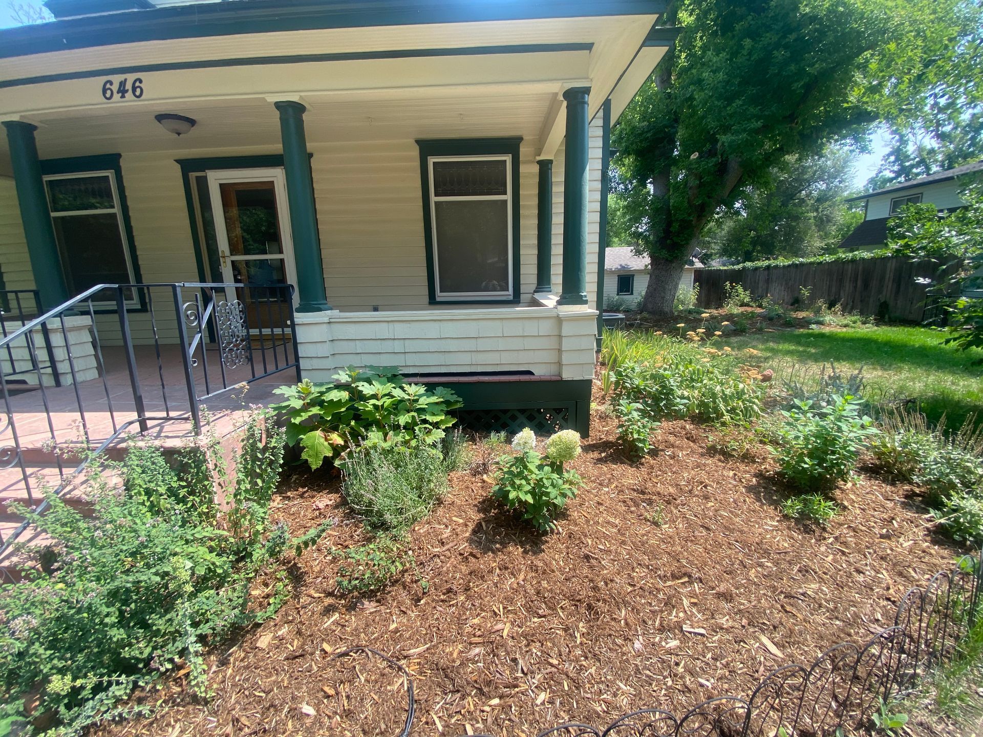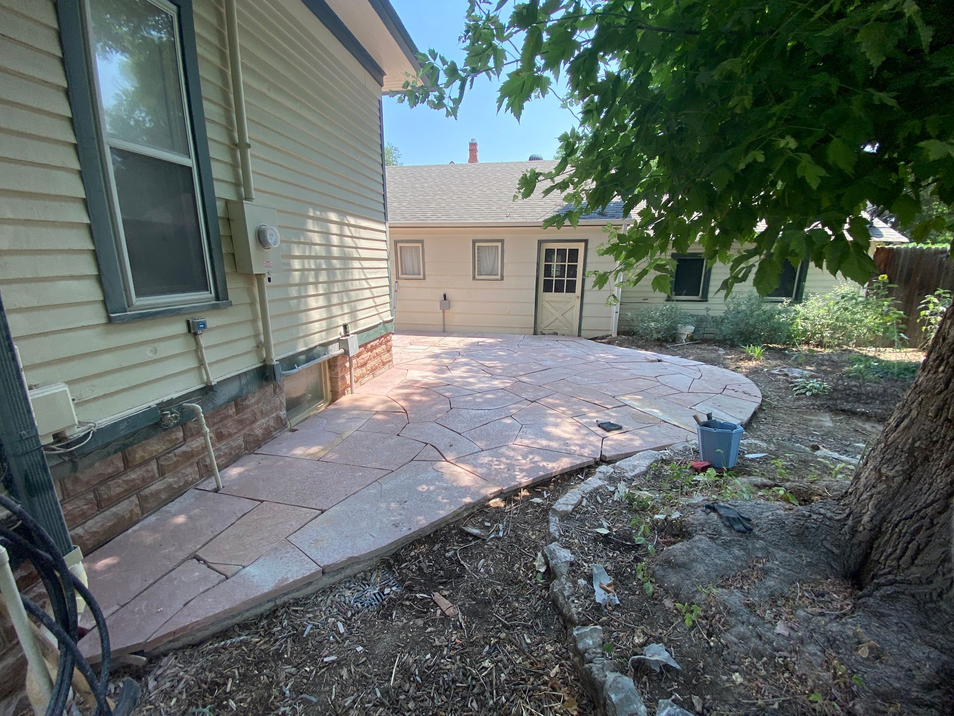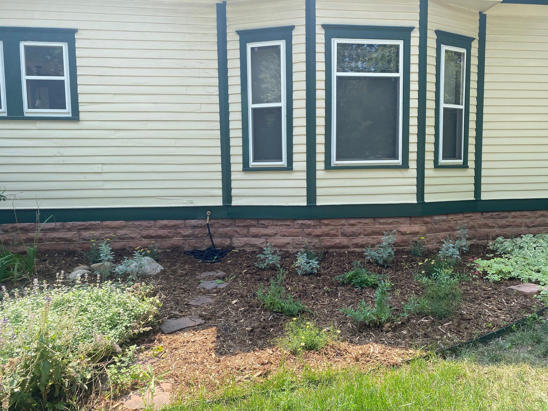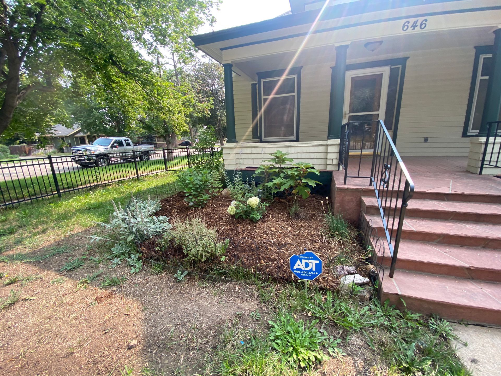 Colorado red flagstone patio set in mortar and in joints with previously concrete base. Matches color of house with addition of color in plantings. Longmont, CO 2021