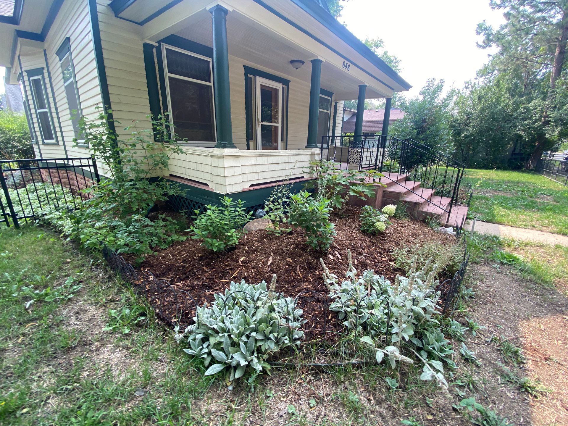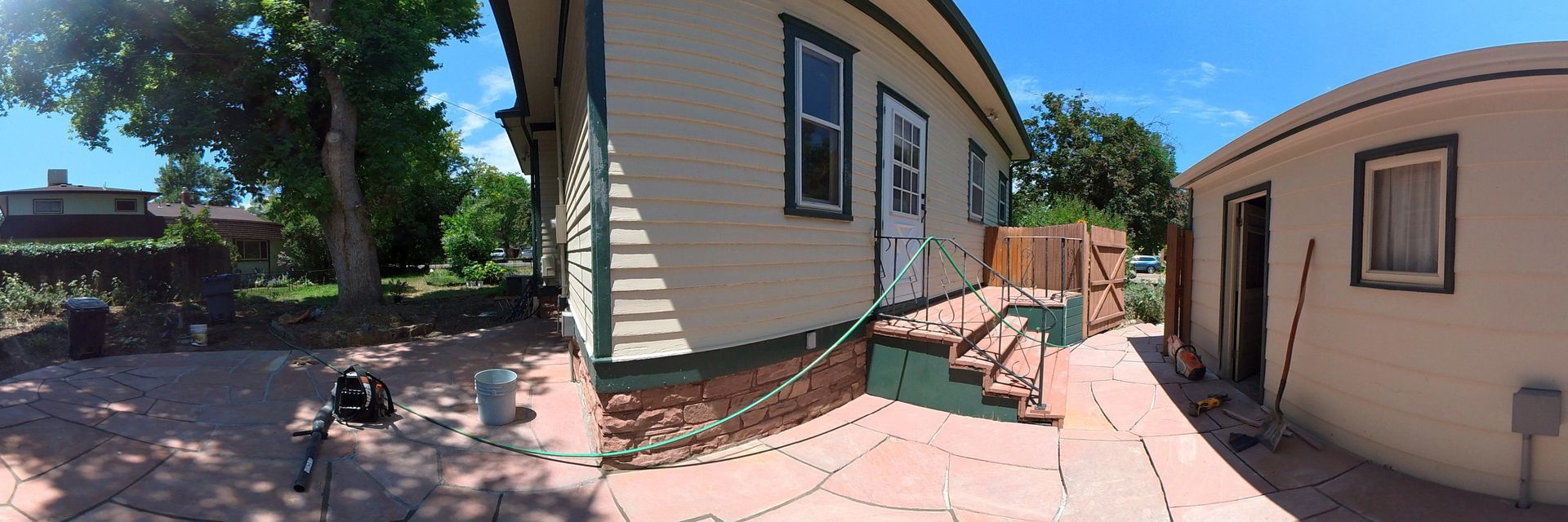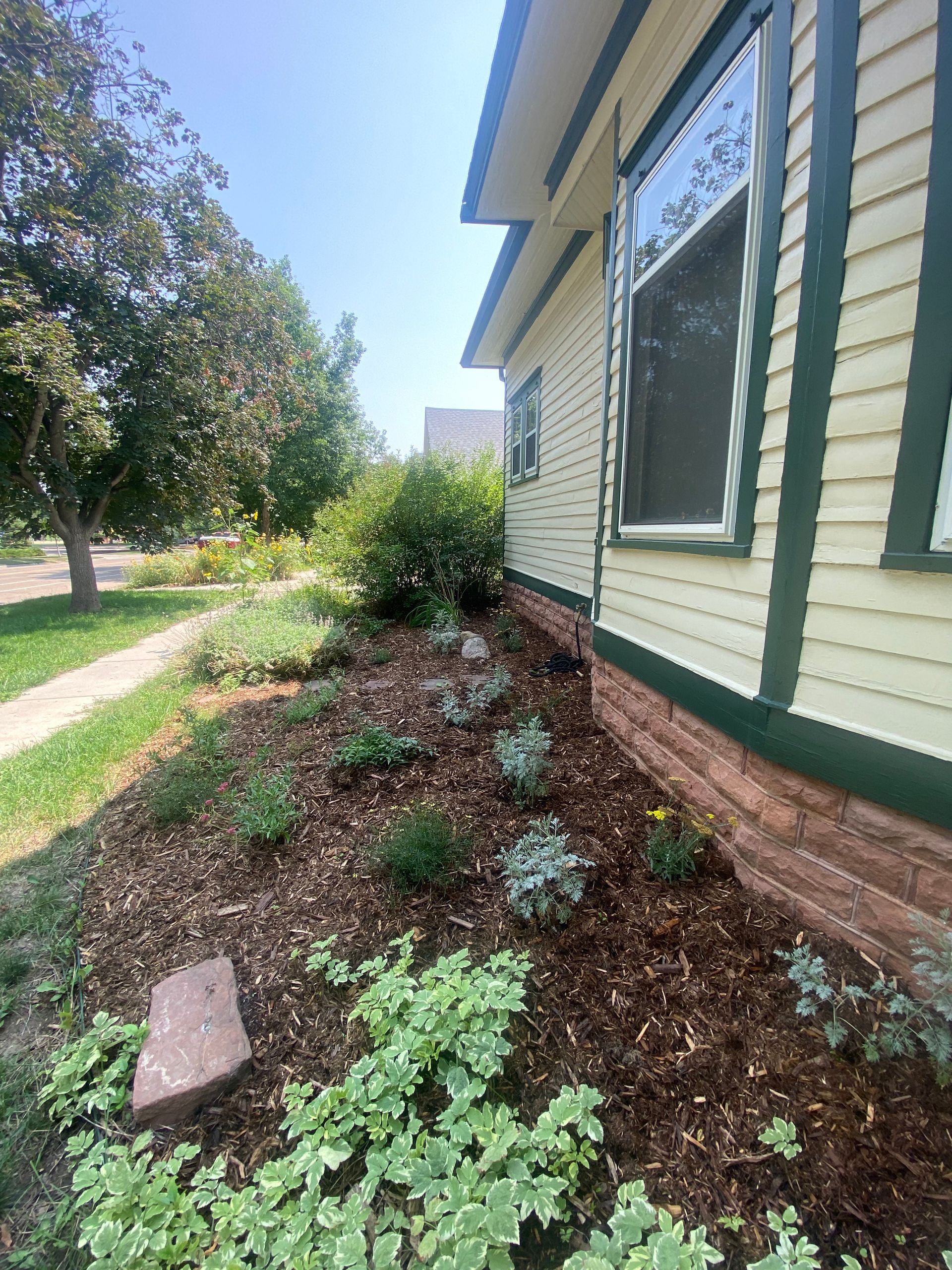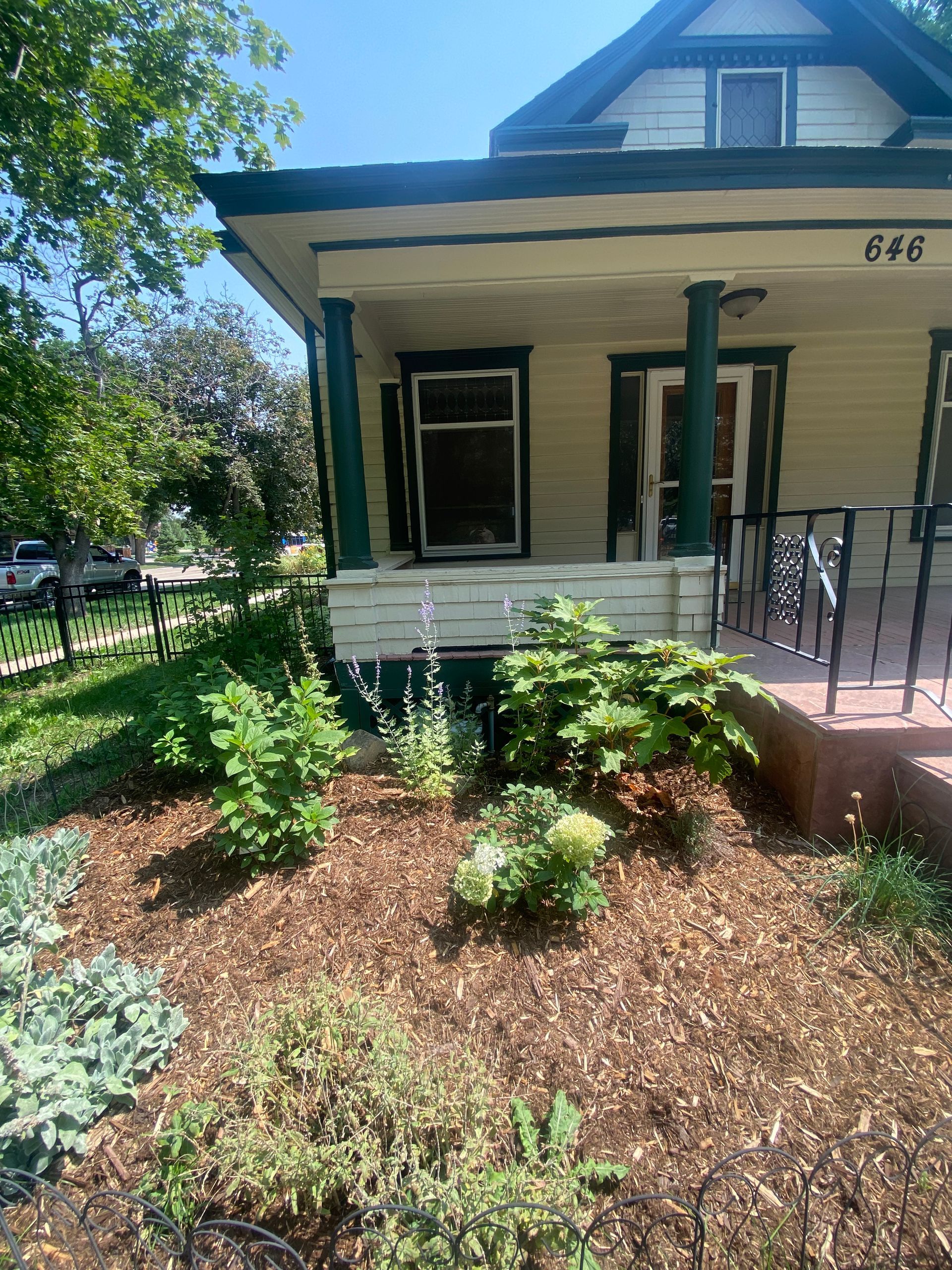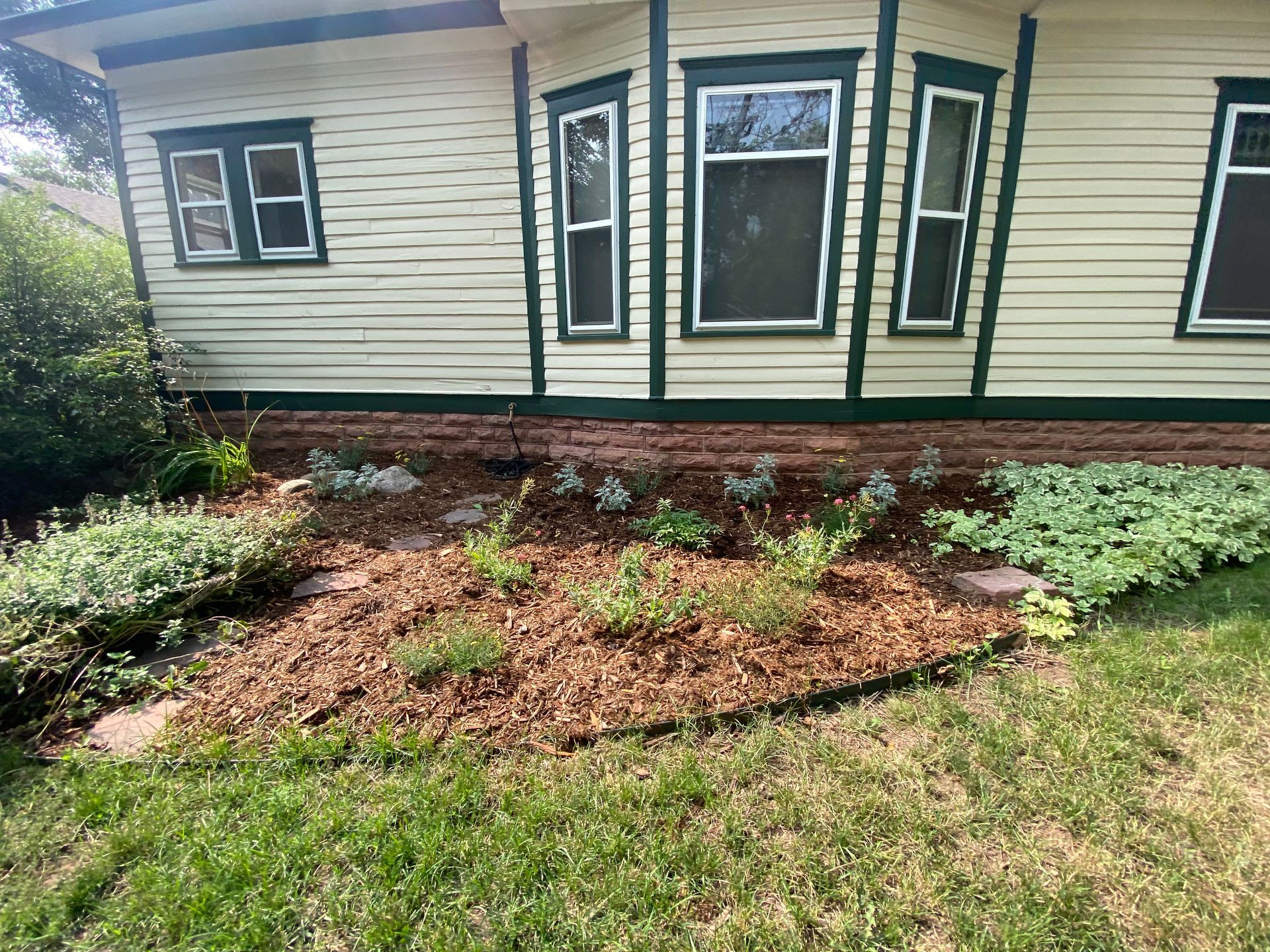 Colorado red flagstone patio set in mortar and in joints with previously concrete base. Matches color of house with addition of color in plantings. Longmont, CO 2021