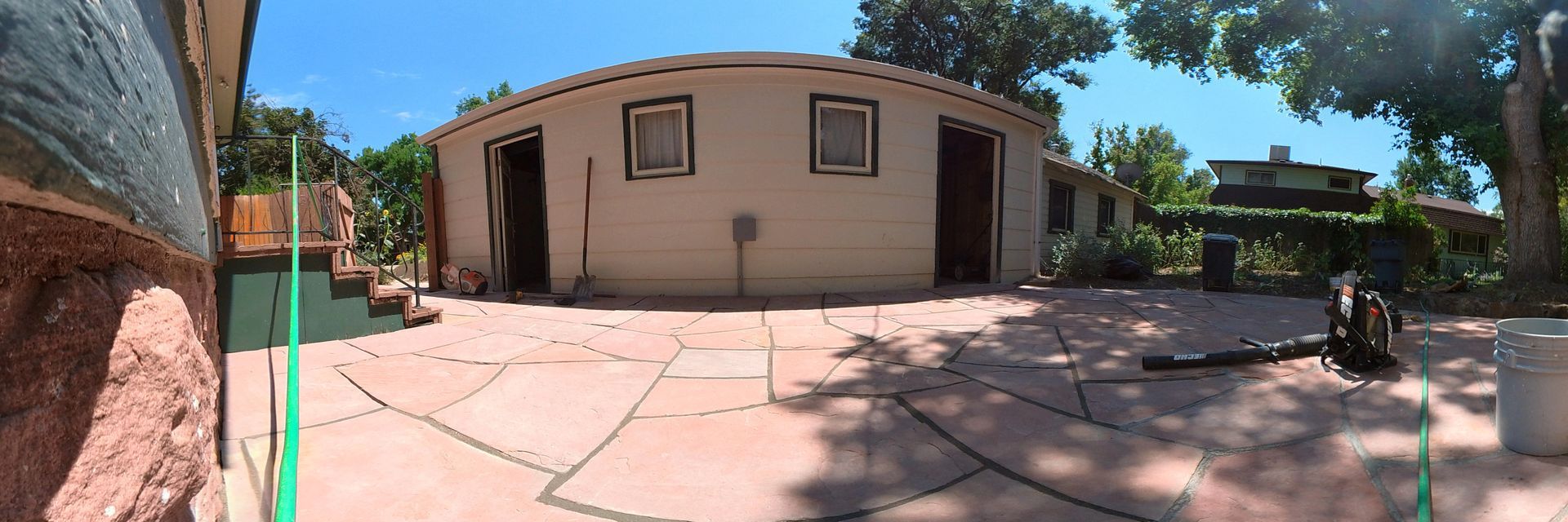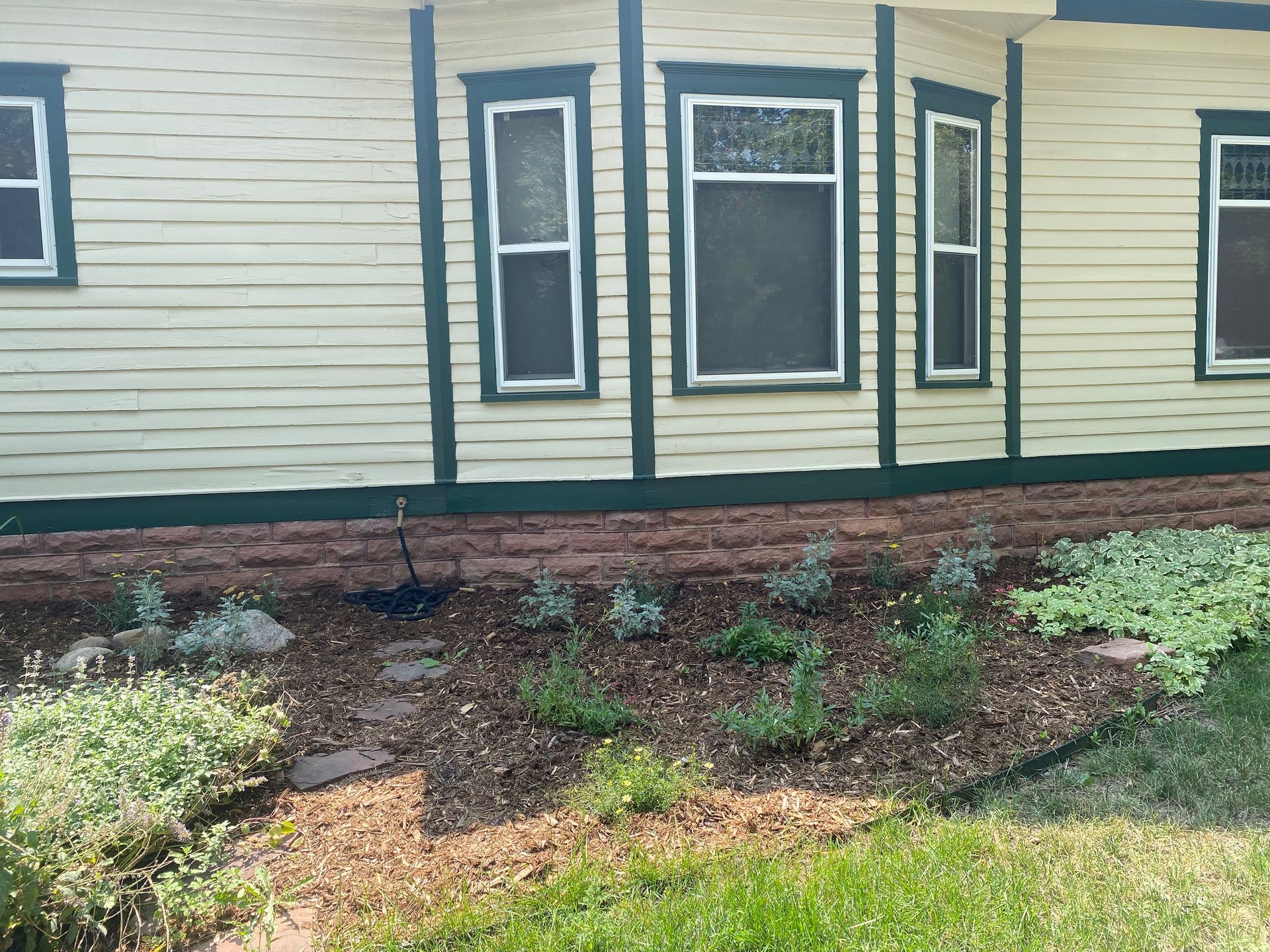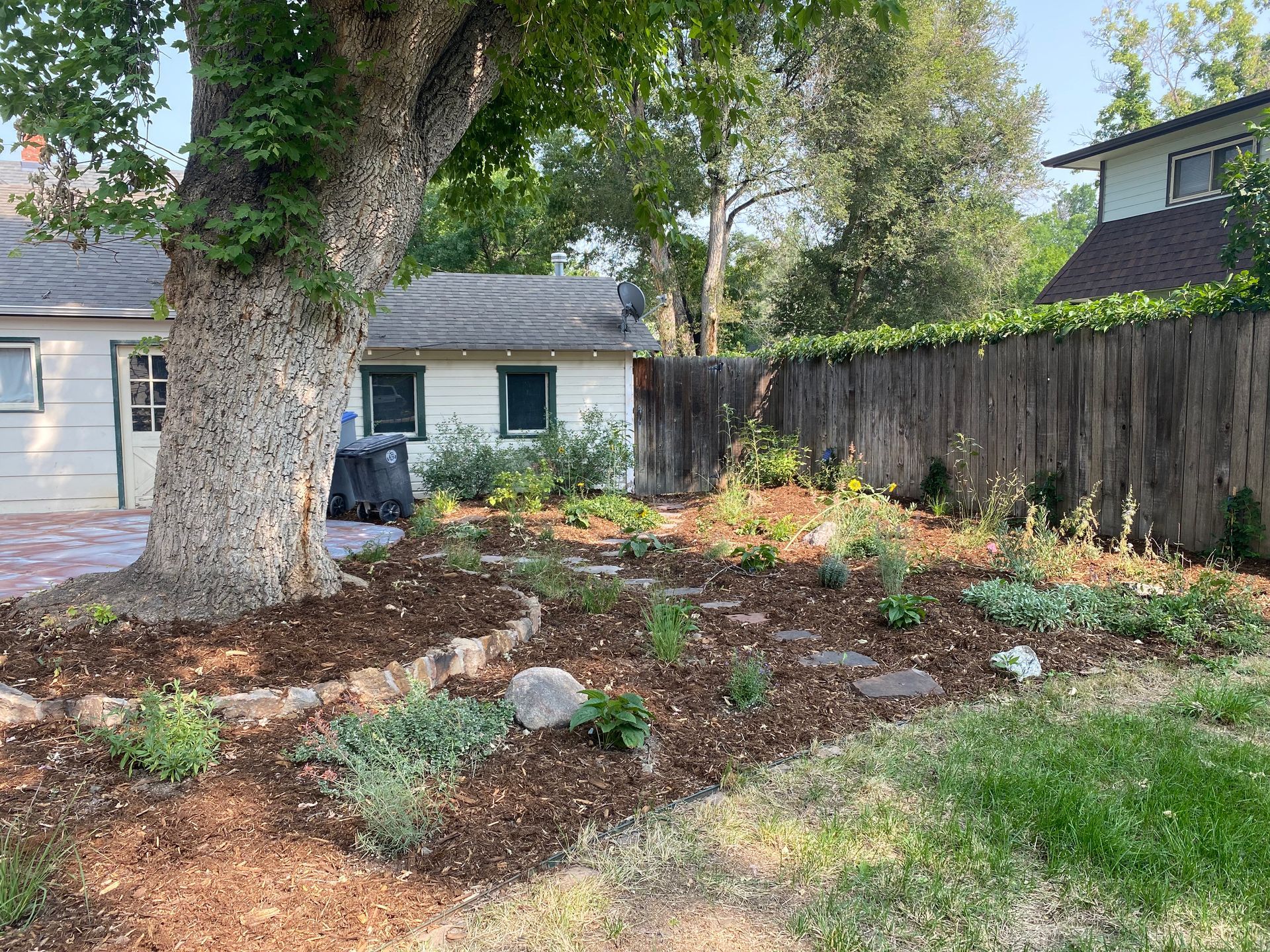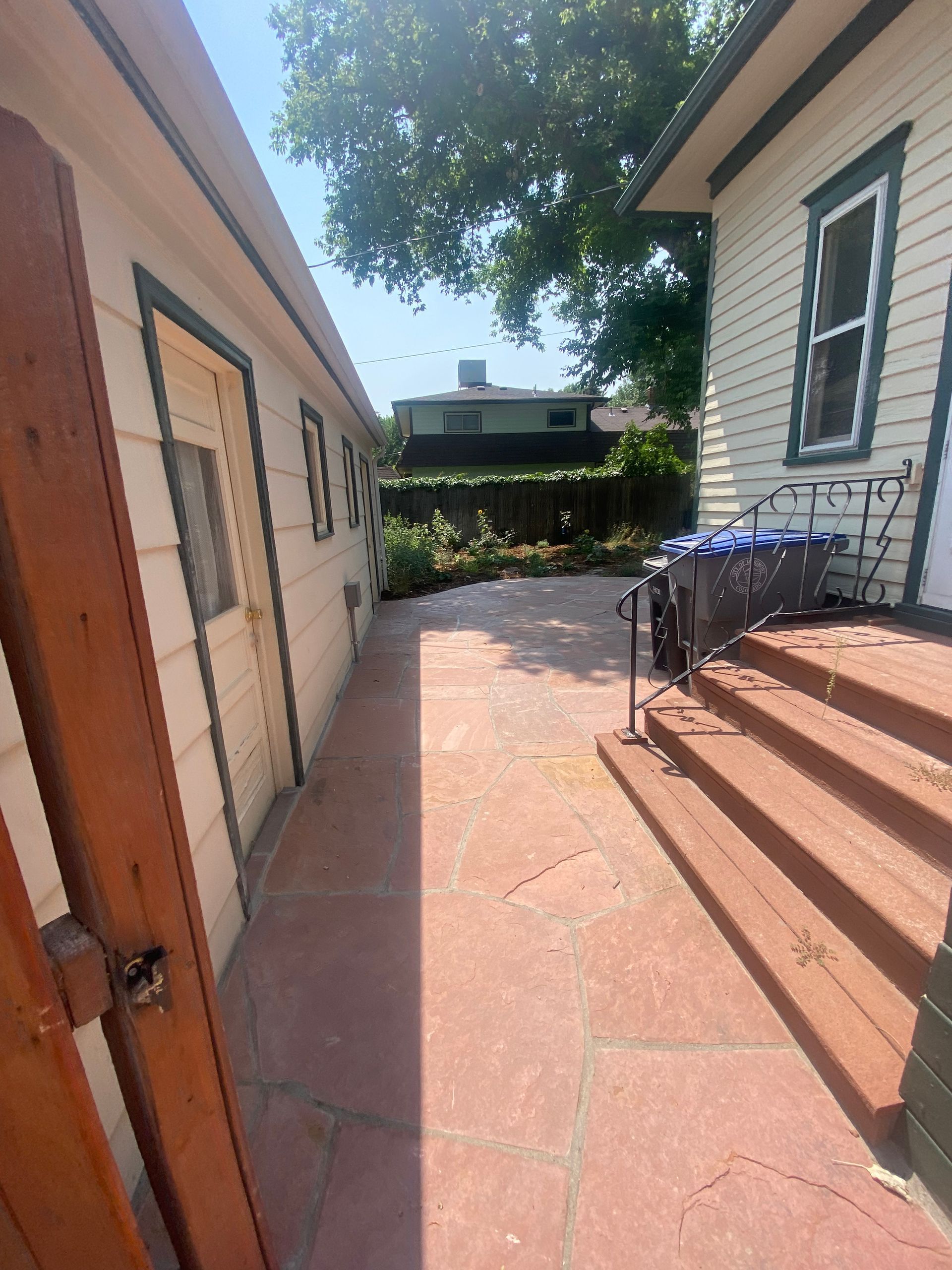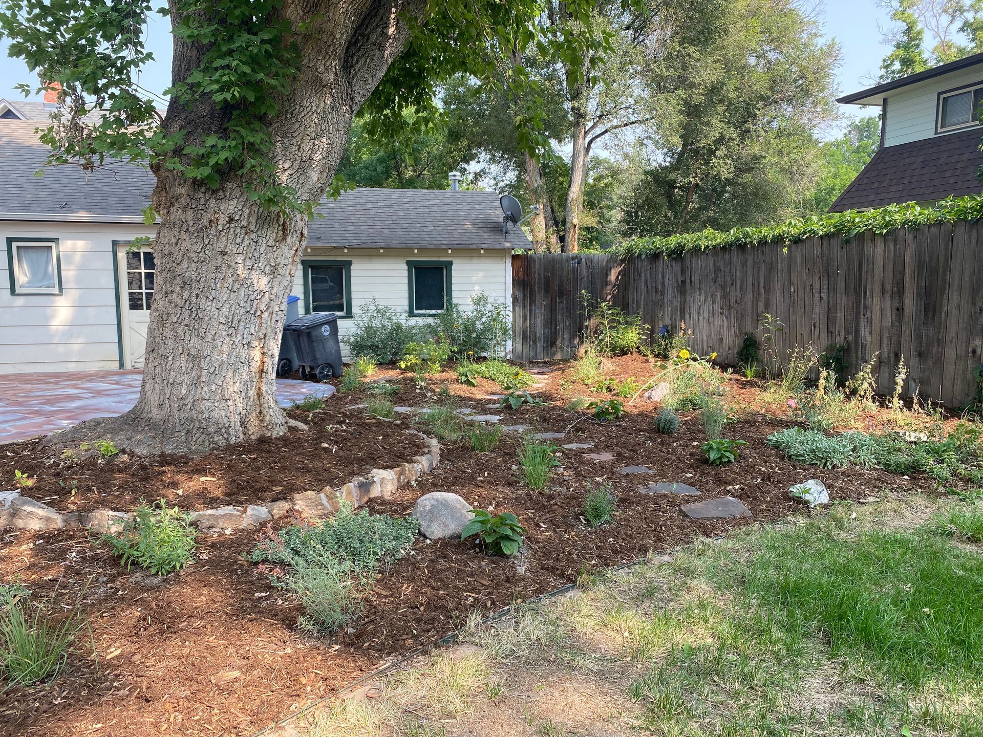 Colorado red flagstone patio set in mortar and in joints with previously concrete base. Matches color of house with addition of color in plantings. Longmont, CO 2021