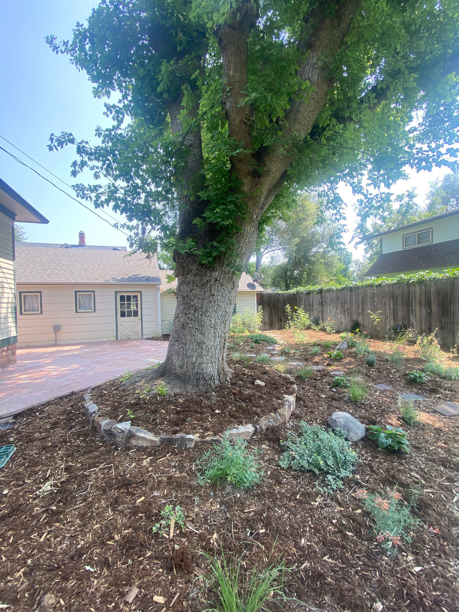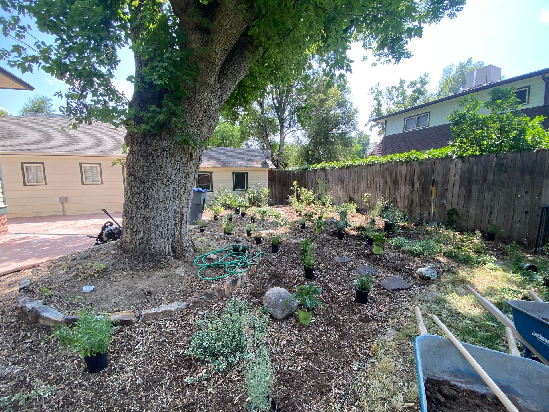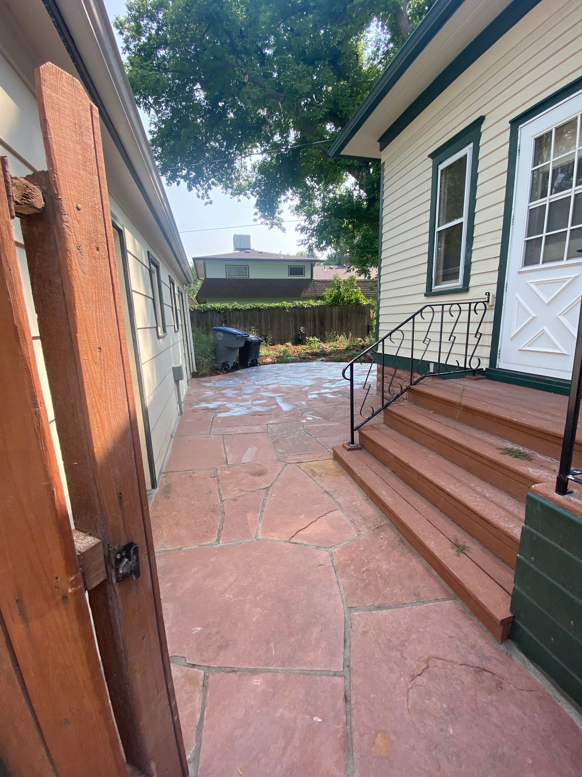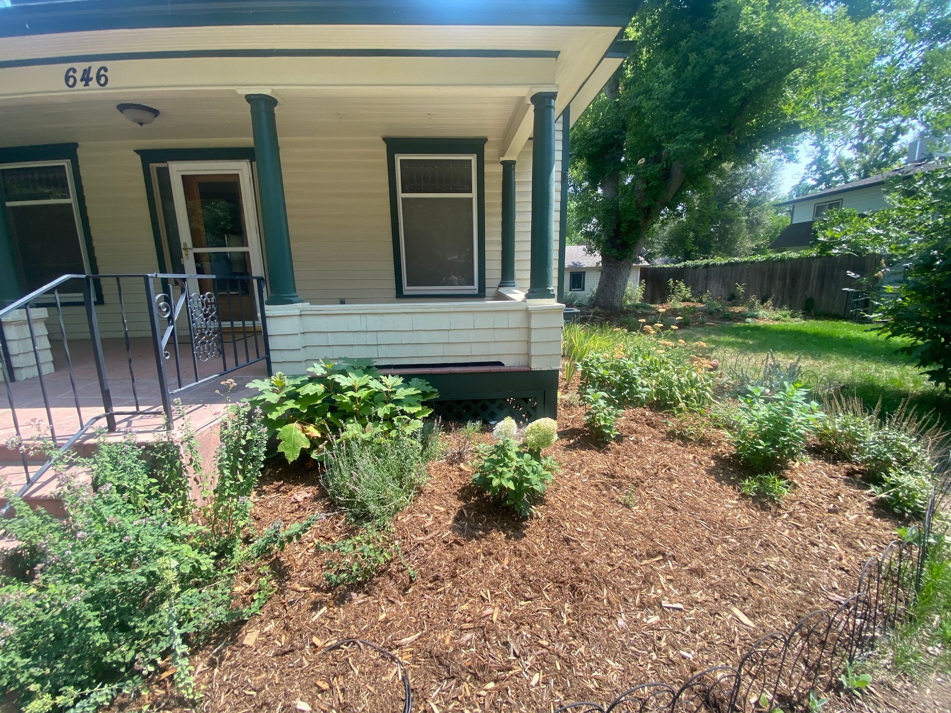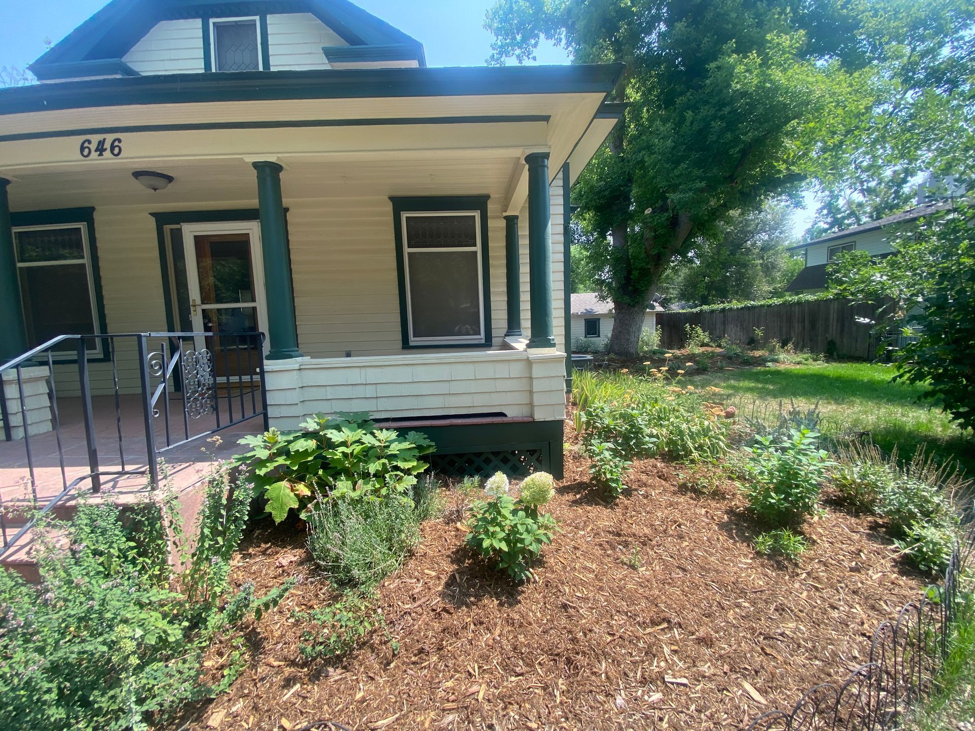 Colorado red flagstone patio set in mortar and in joints with previously concrete base. Matches color of house with addition of color in plantings. Longmont, CO 2021