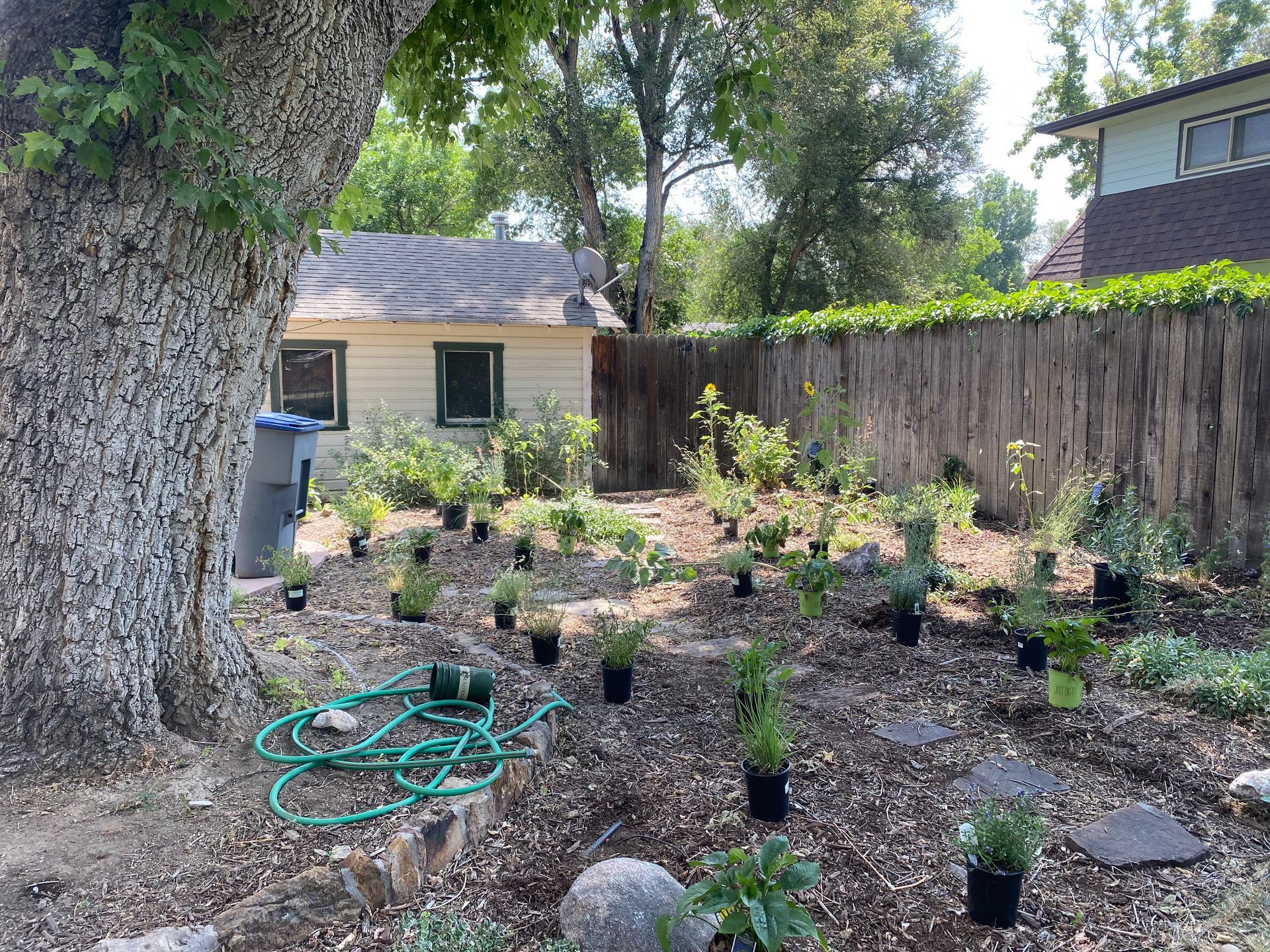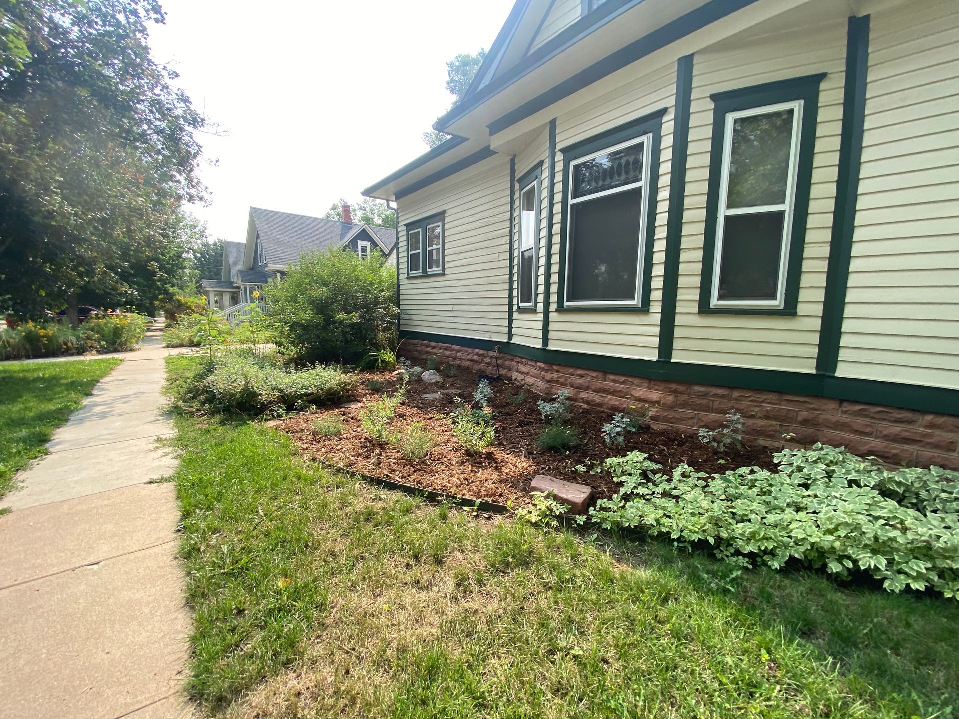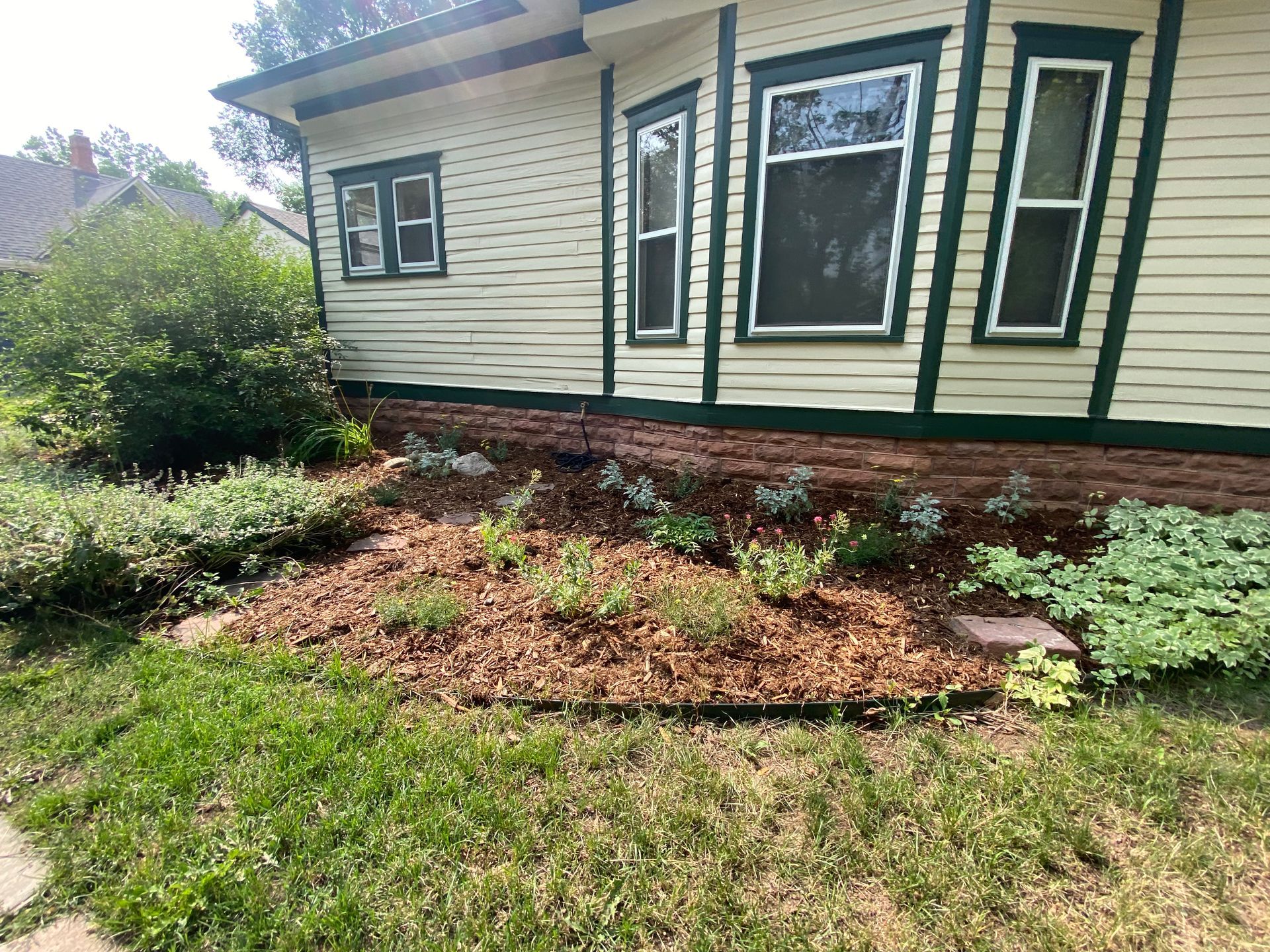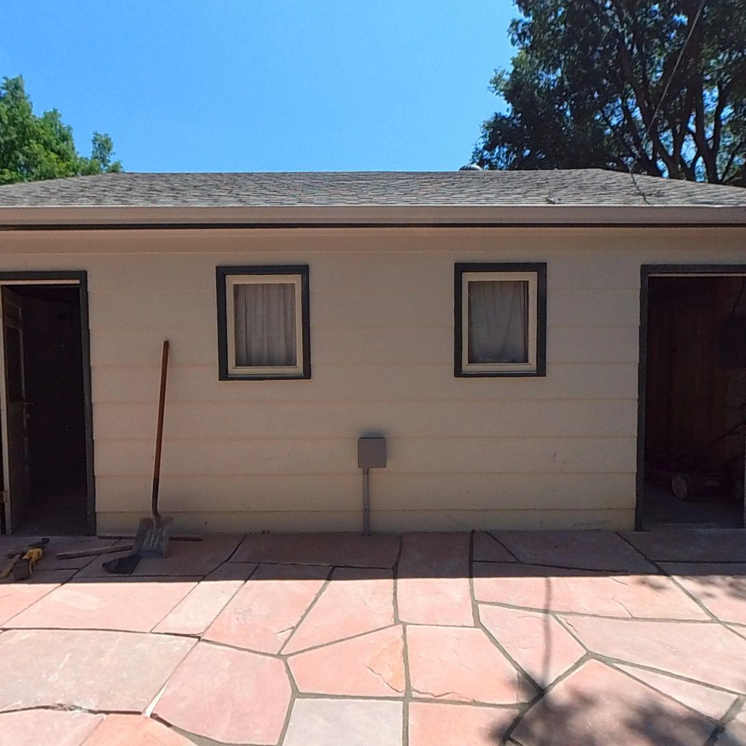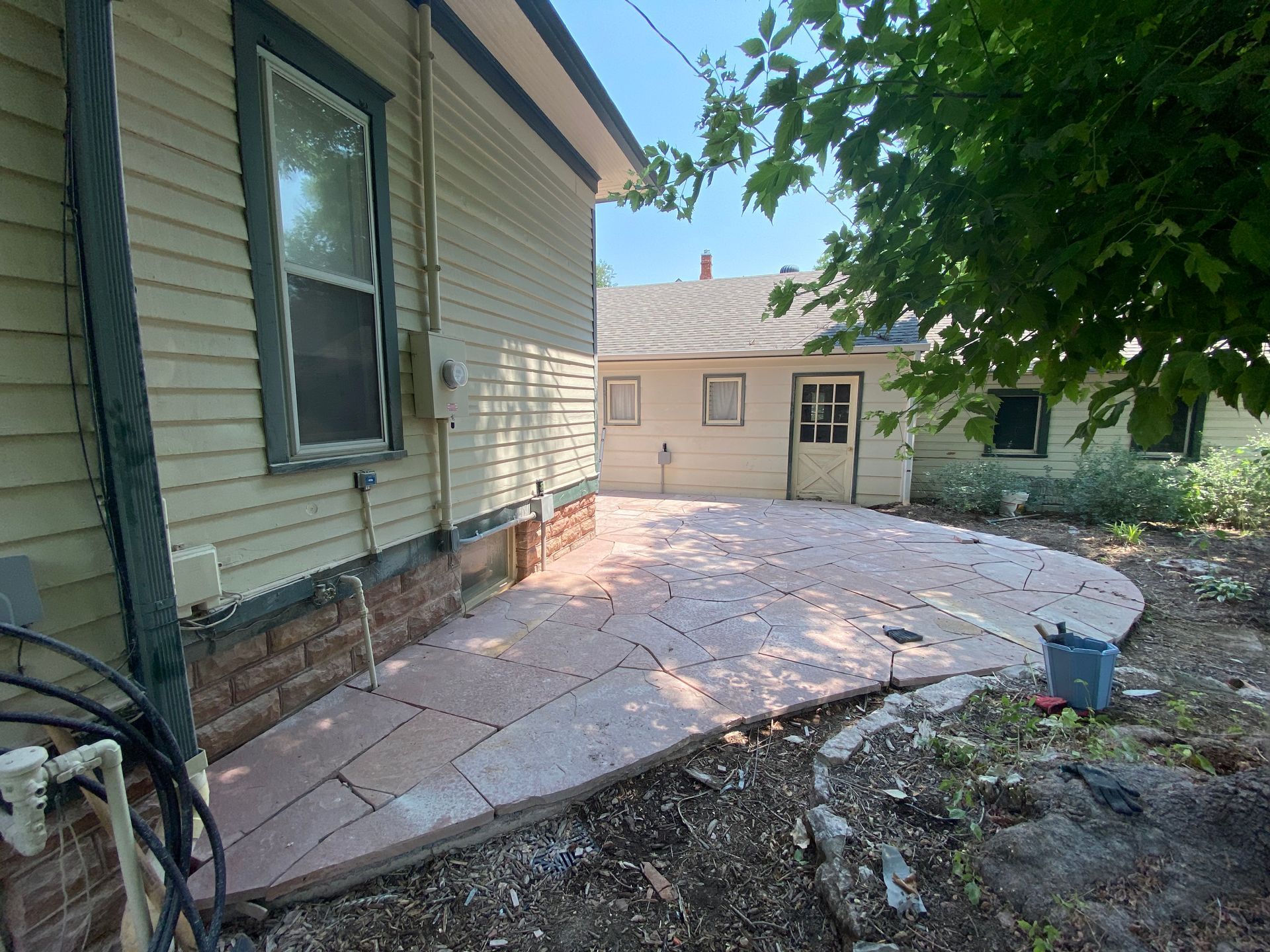 Colorado red flagstone patio set in mortar and in joints with previously concrete base. Matches color of house with addition of color in plantings. Longmont, CO 2021