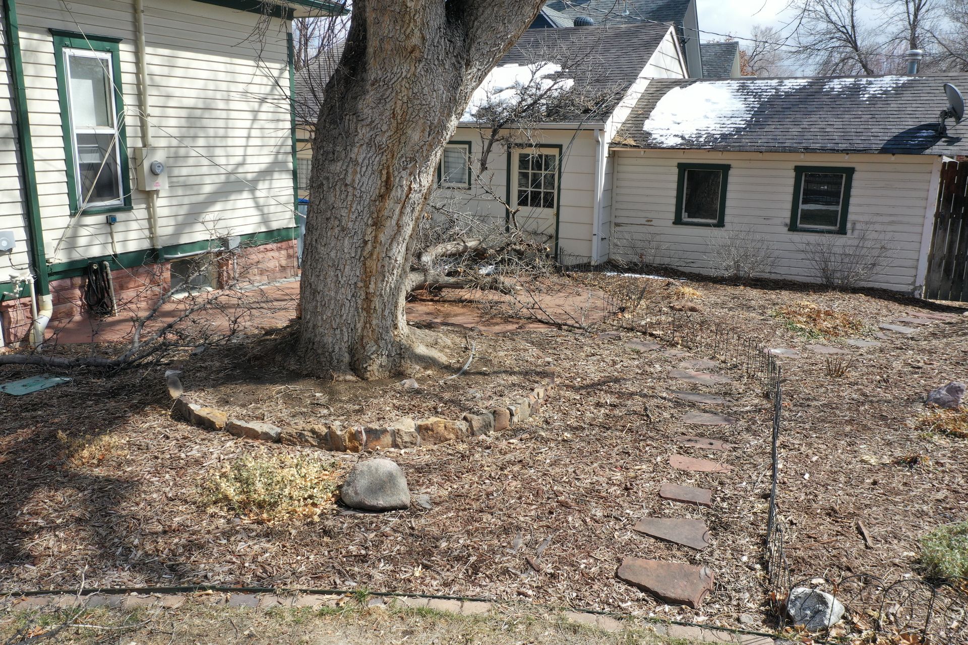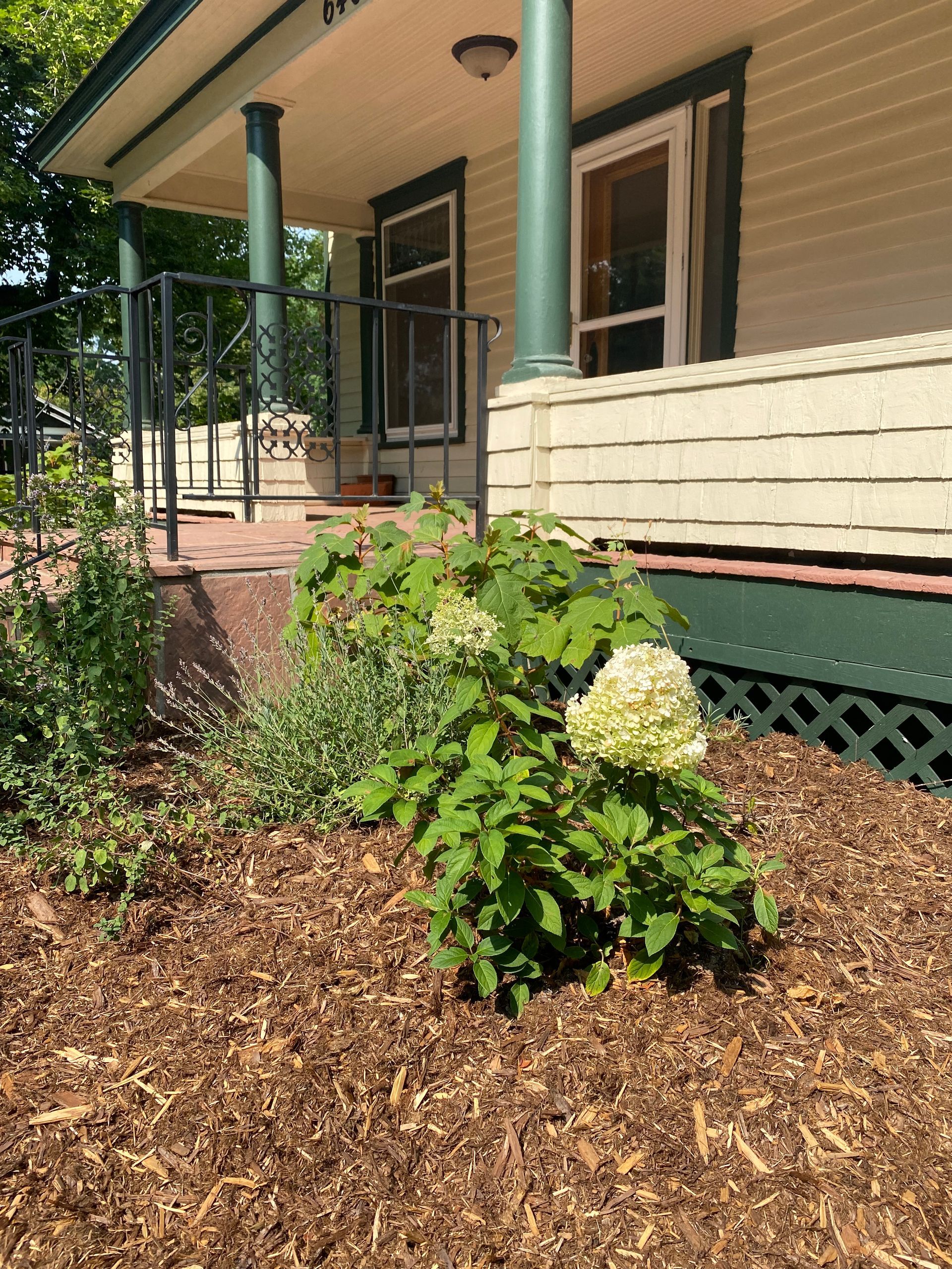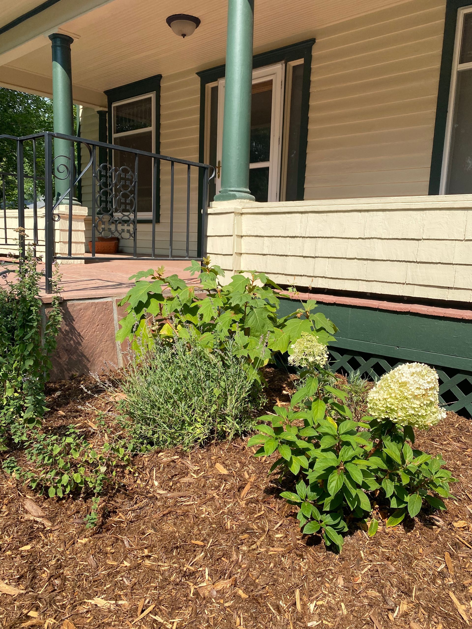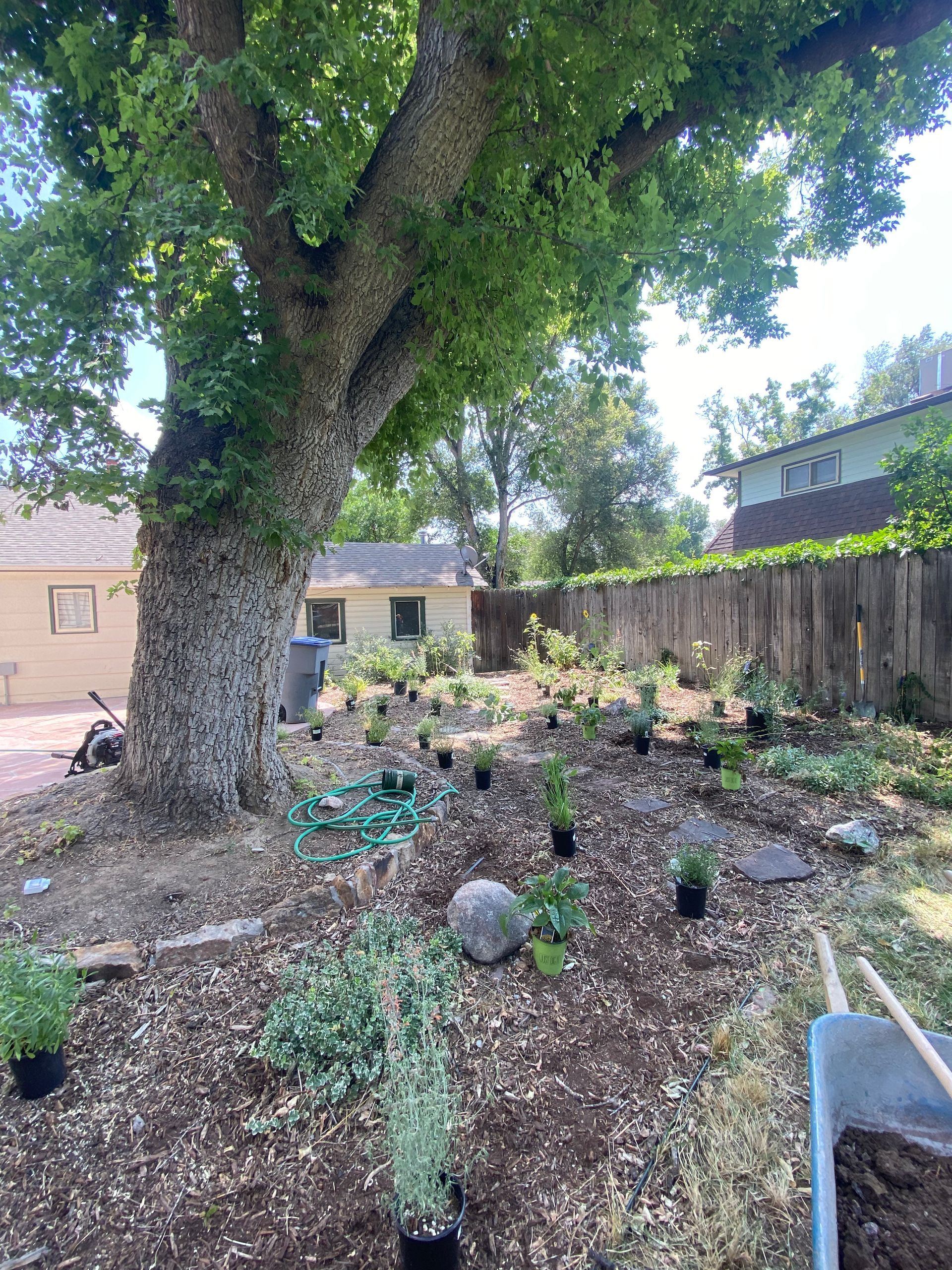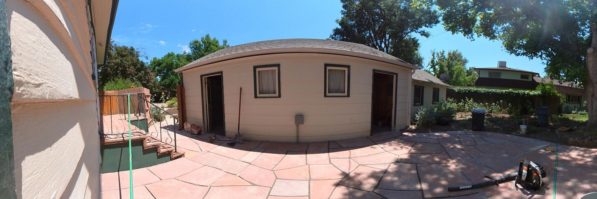 Colorado red flagstone patio set in mortar and in joints with previously concrete base. Matches color of house with addition of color in plantings. Longmont, CO 2021
