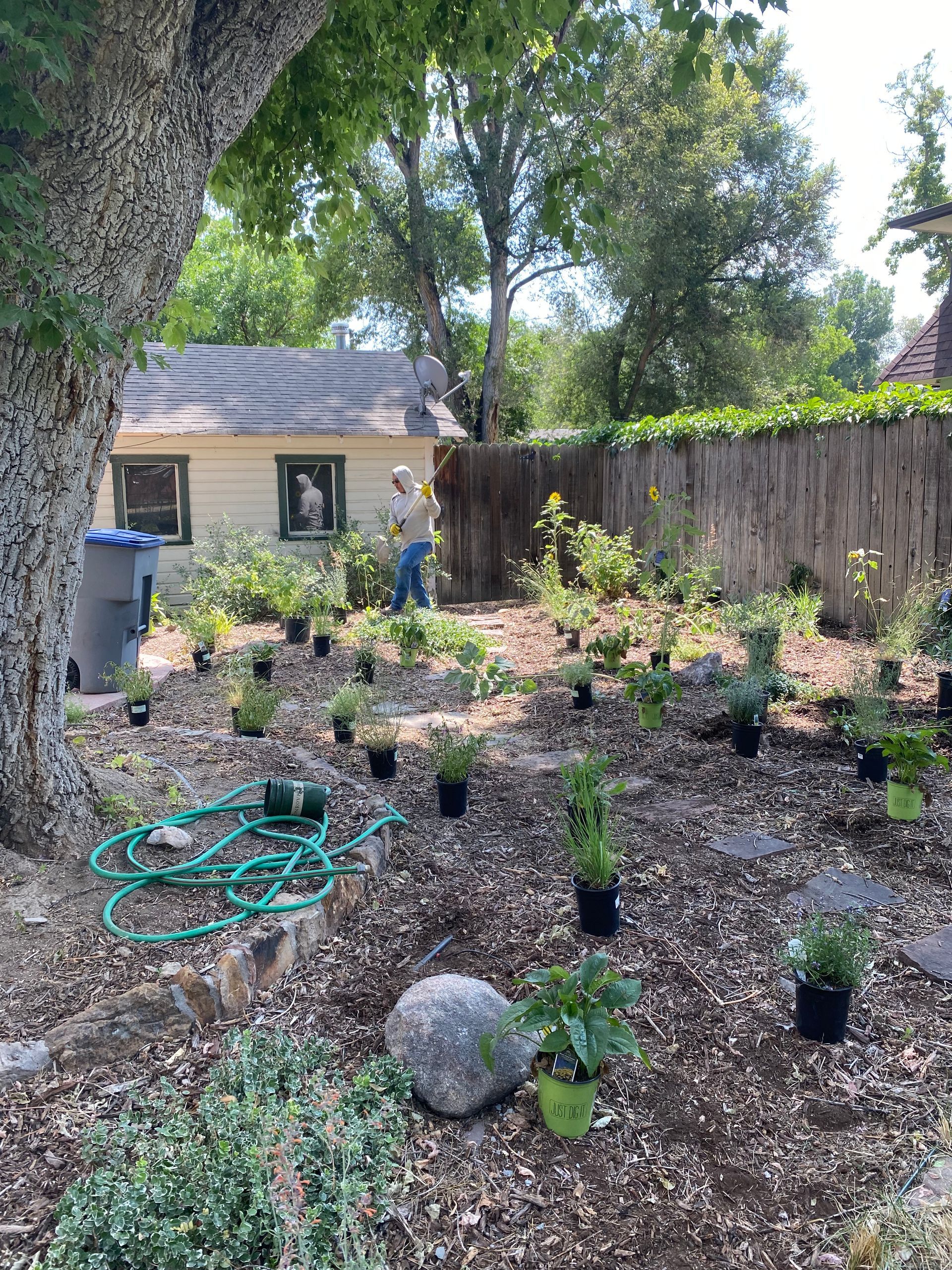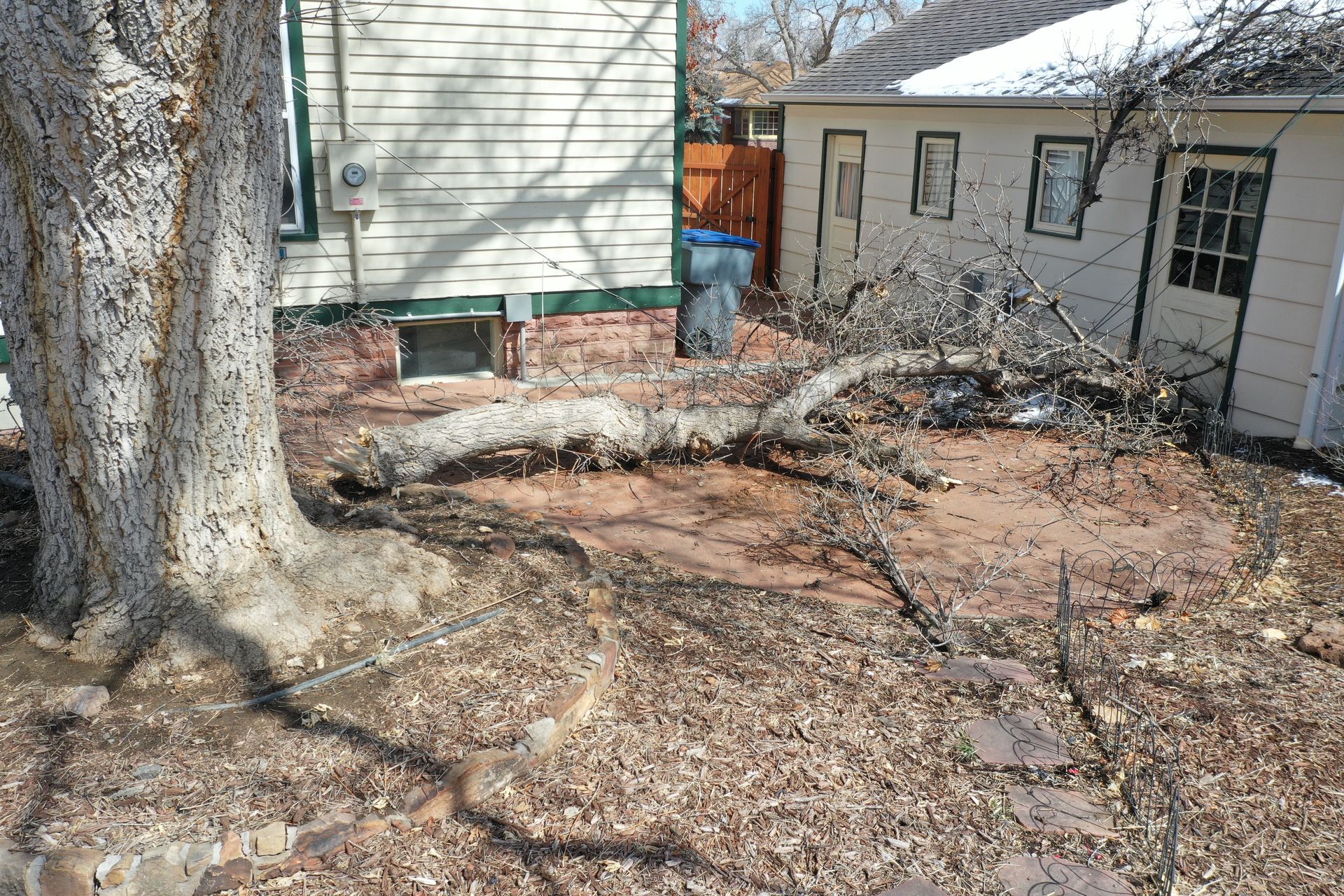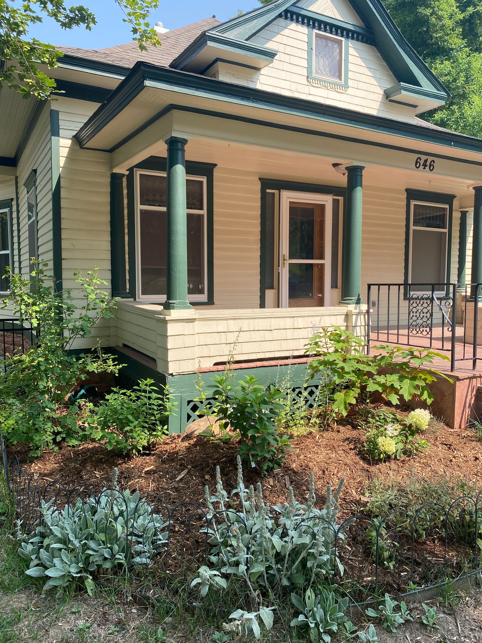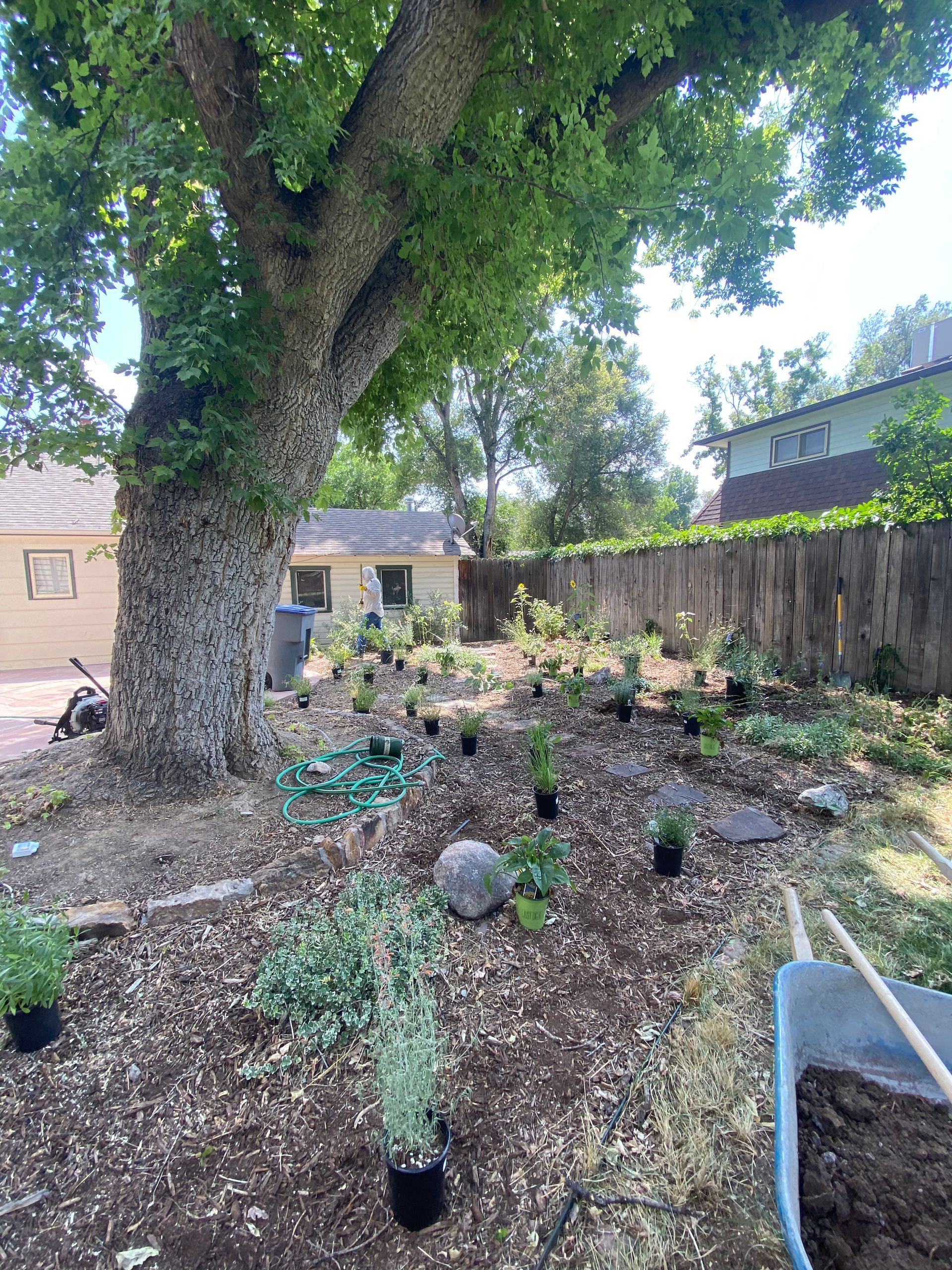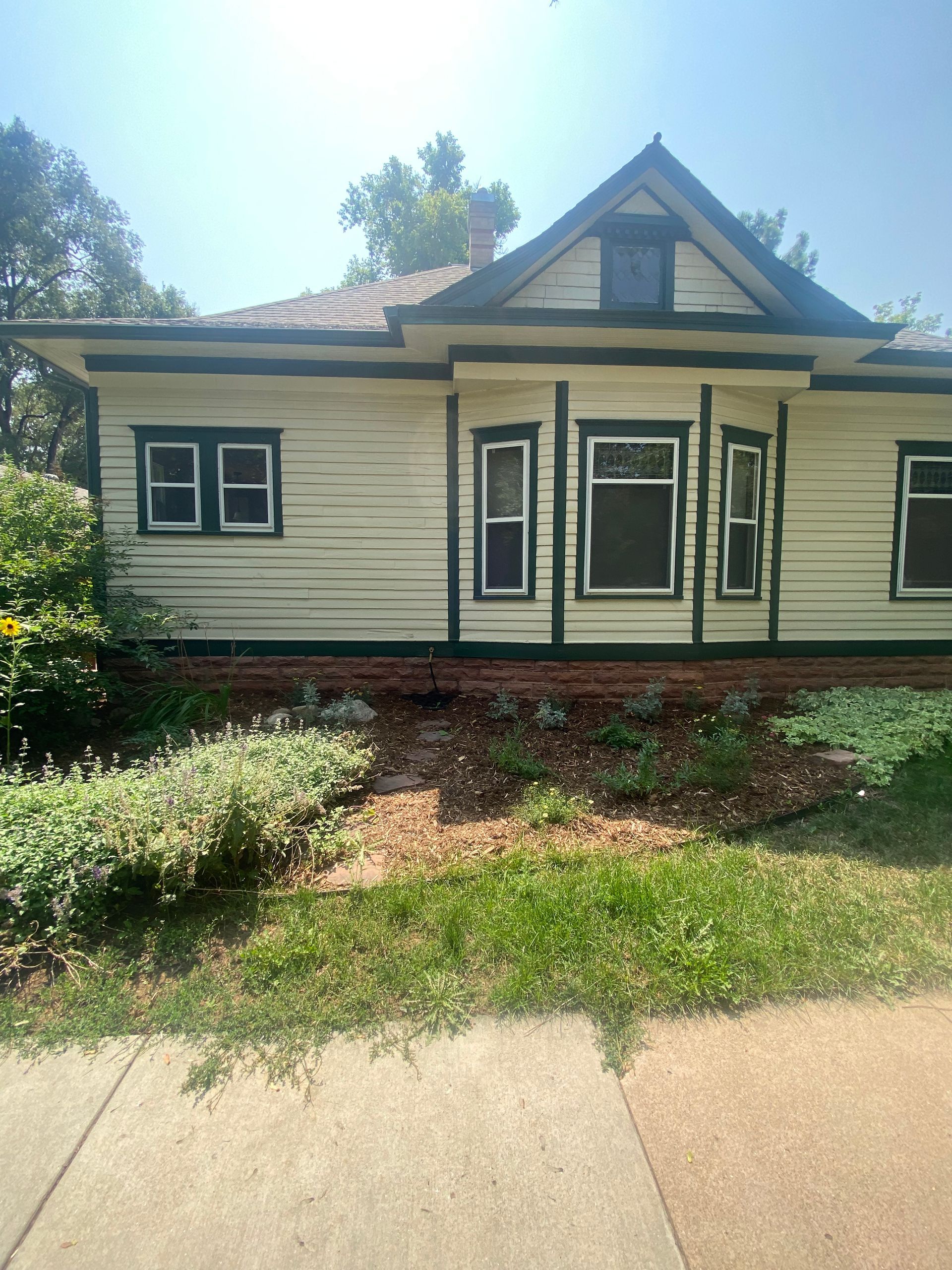 Colorado red flagstone patio set in mortar and in joints with previously concrete base. Matches color of house with addition of color in plantings. Longmont, CO 2021