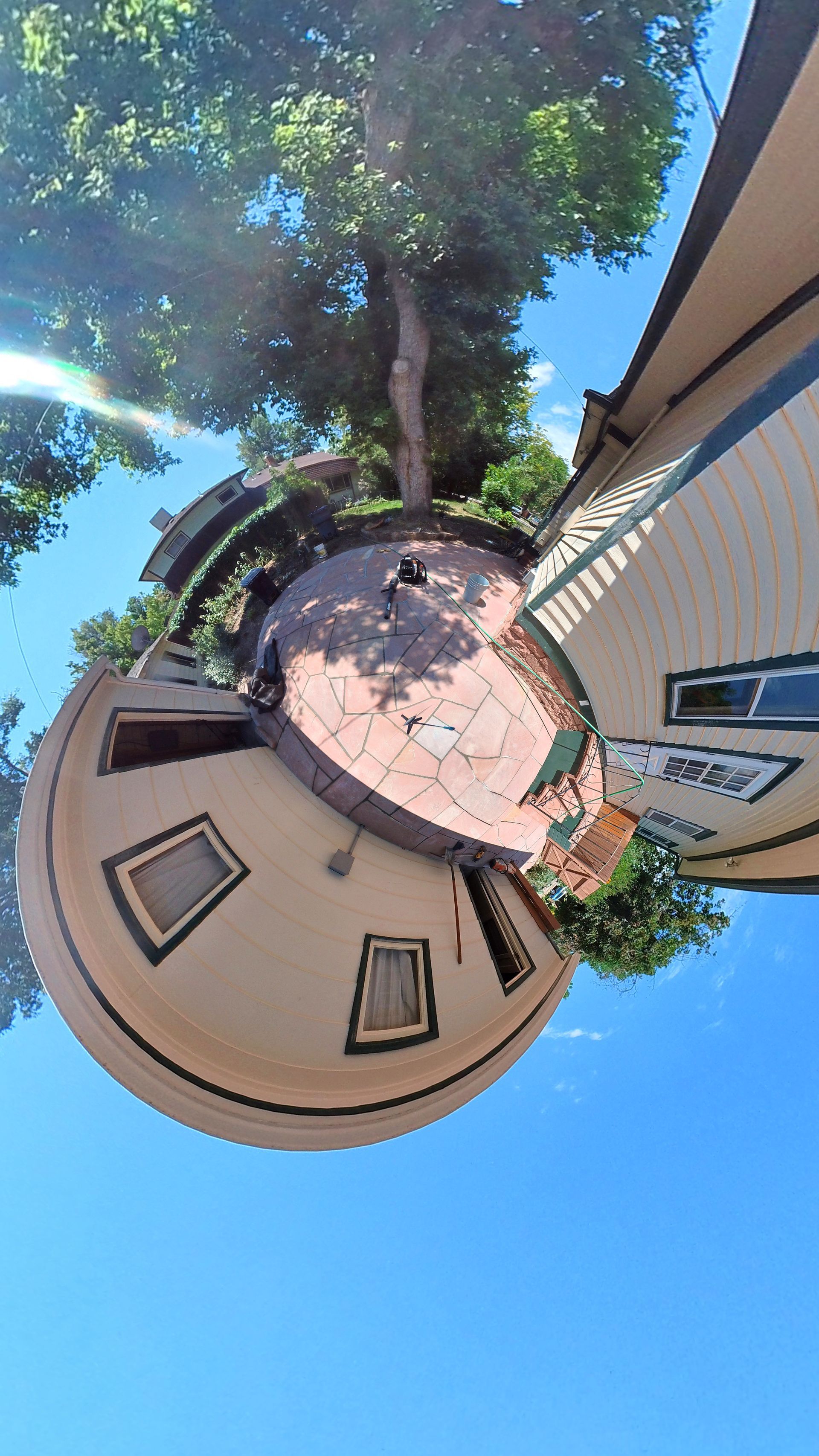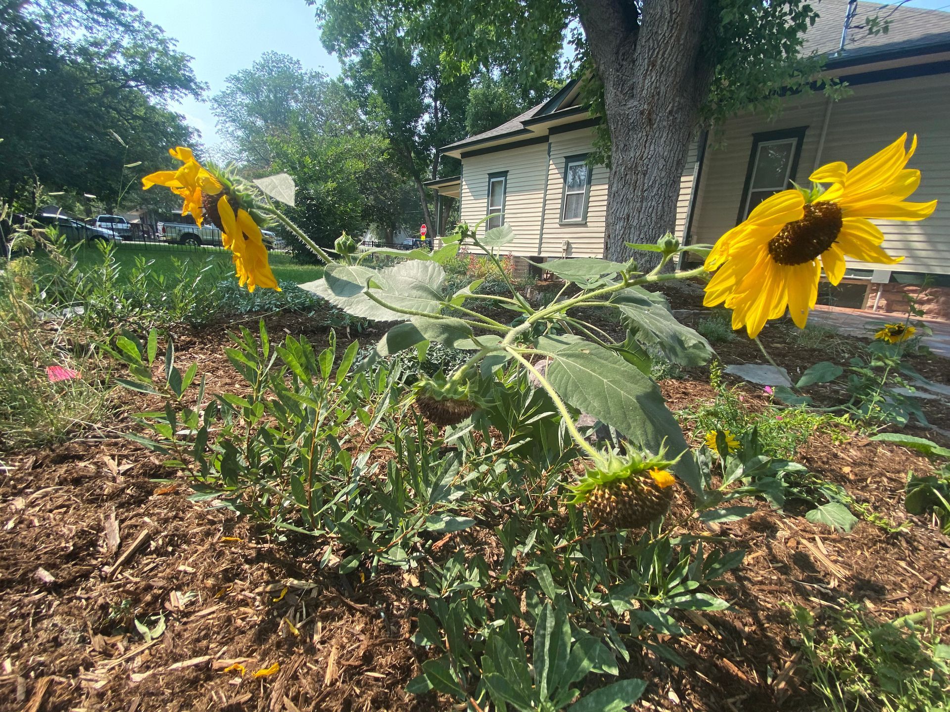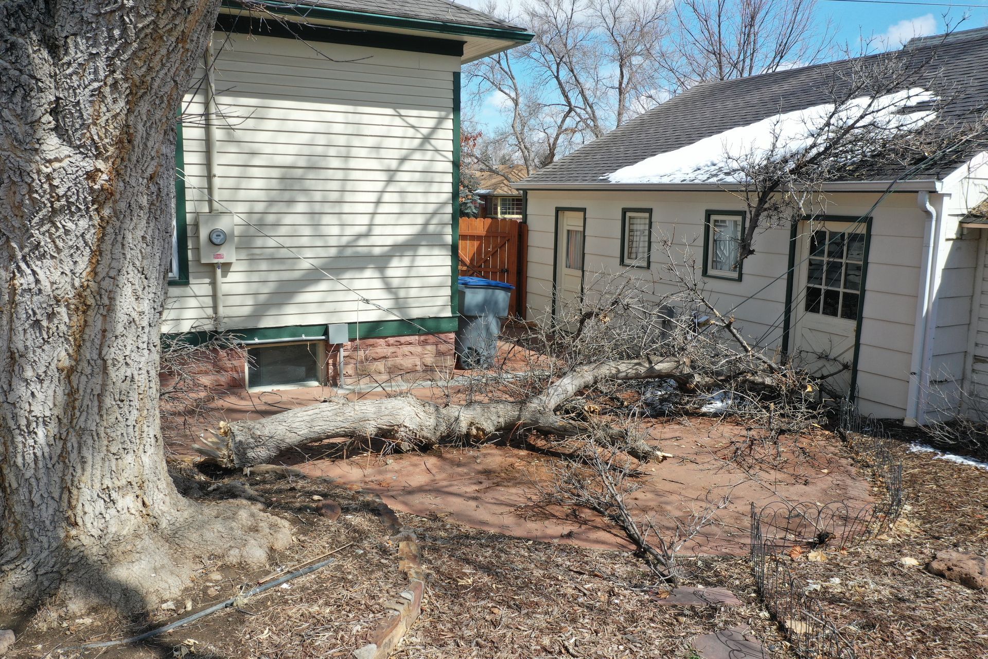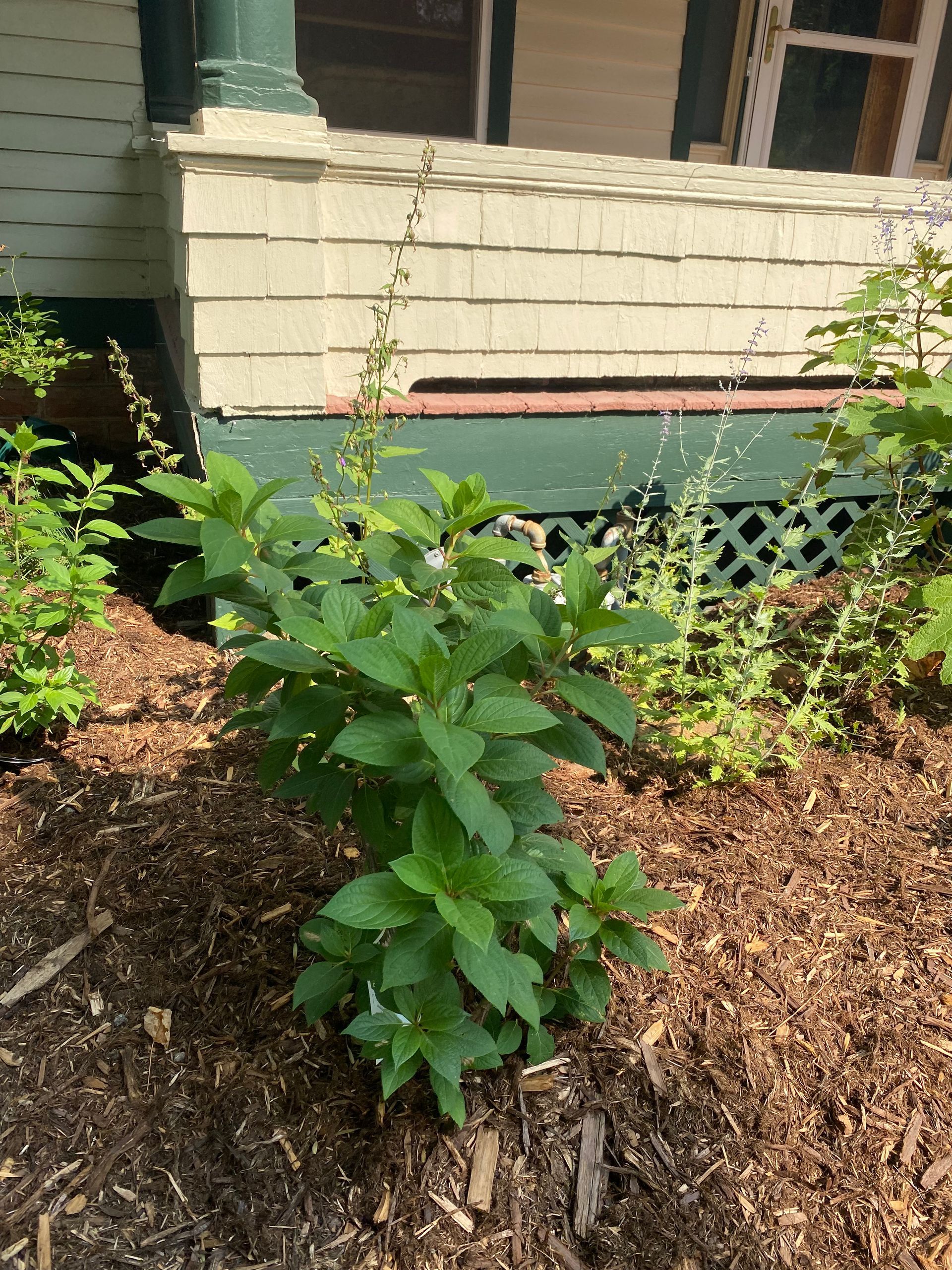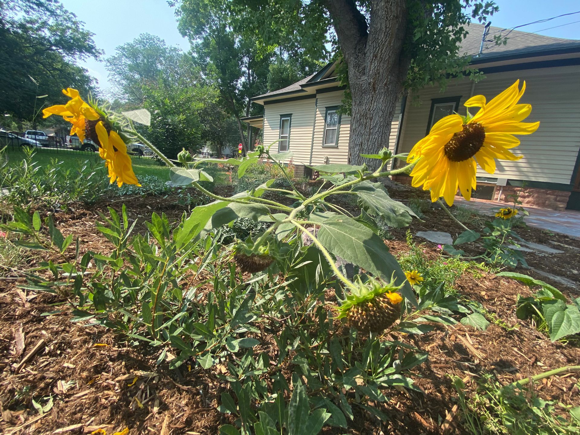 Colorado red flagstone patio set in mortar and in joints with previously concrete base. Matches color of house with addition of color in plantings. Longmont, CO 2021