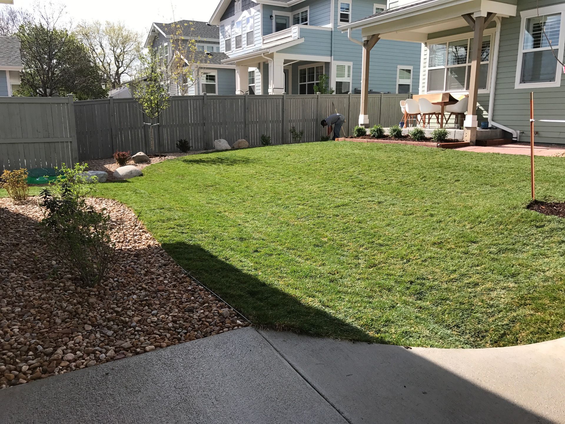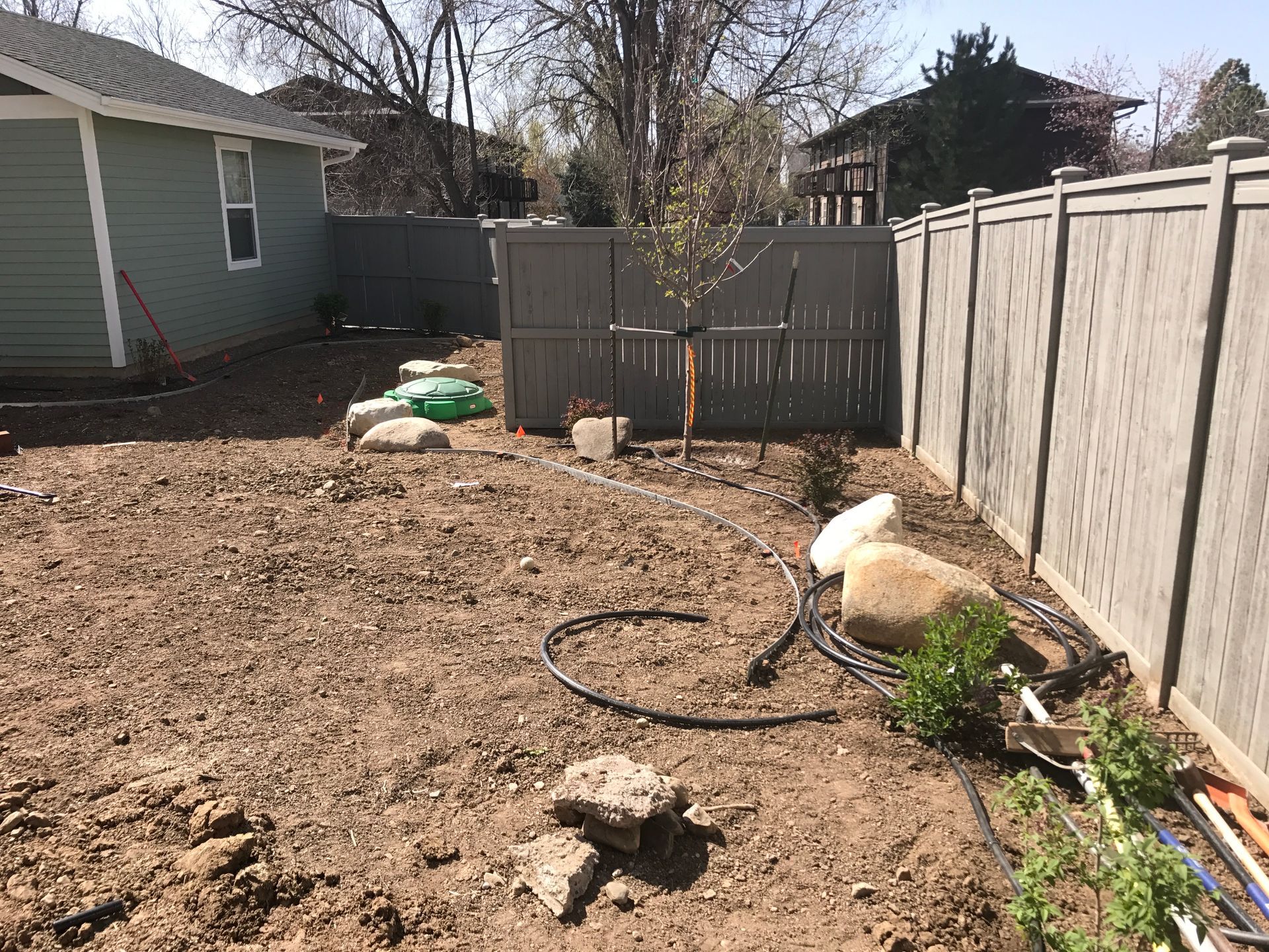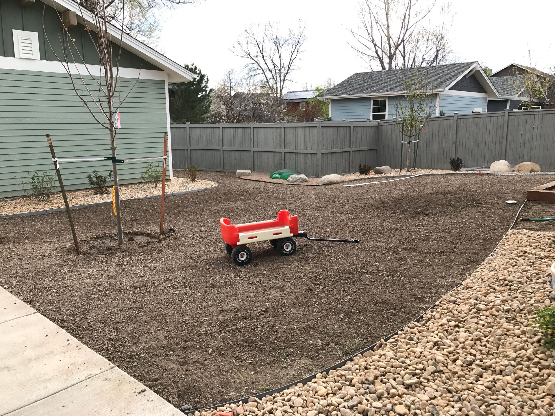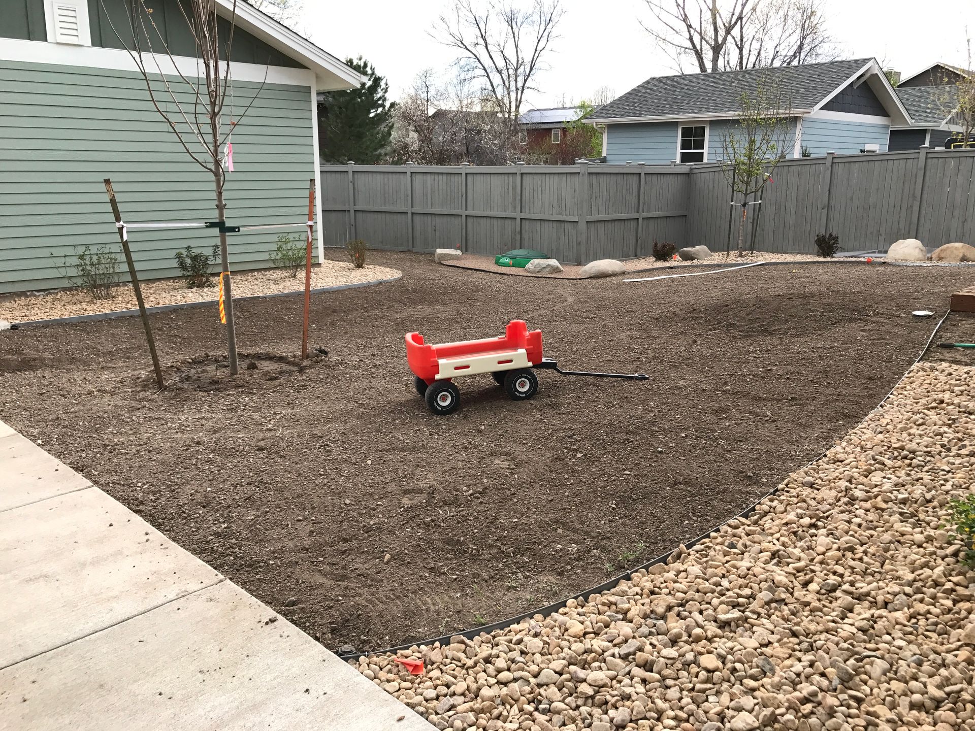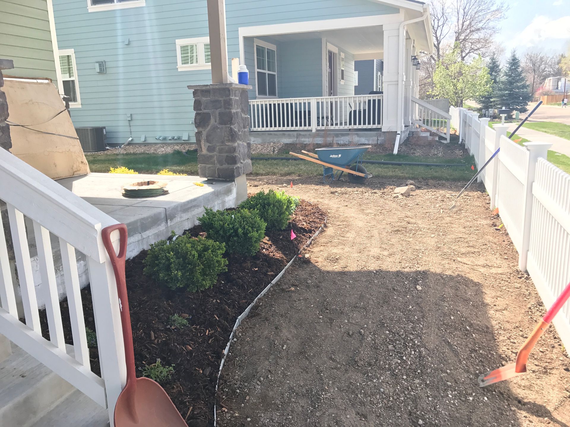 Full landscape remodel with decorative rock, plantings, sprinklers and grass. Lafayette, CO 2019