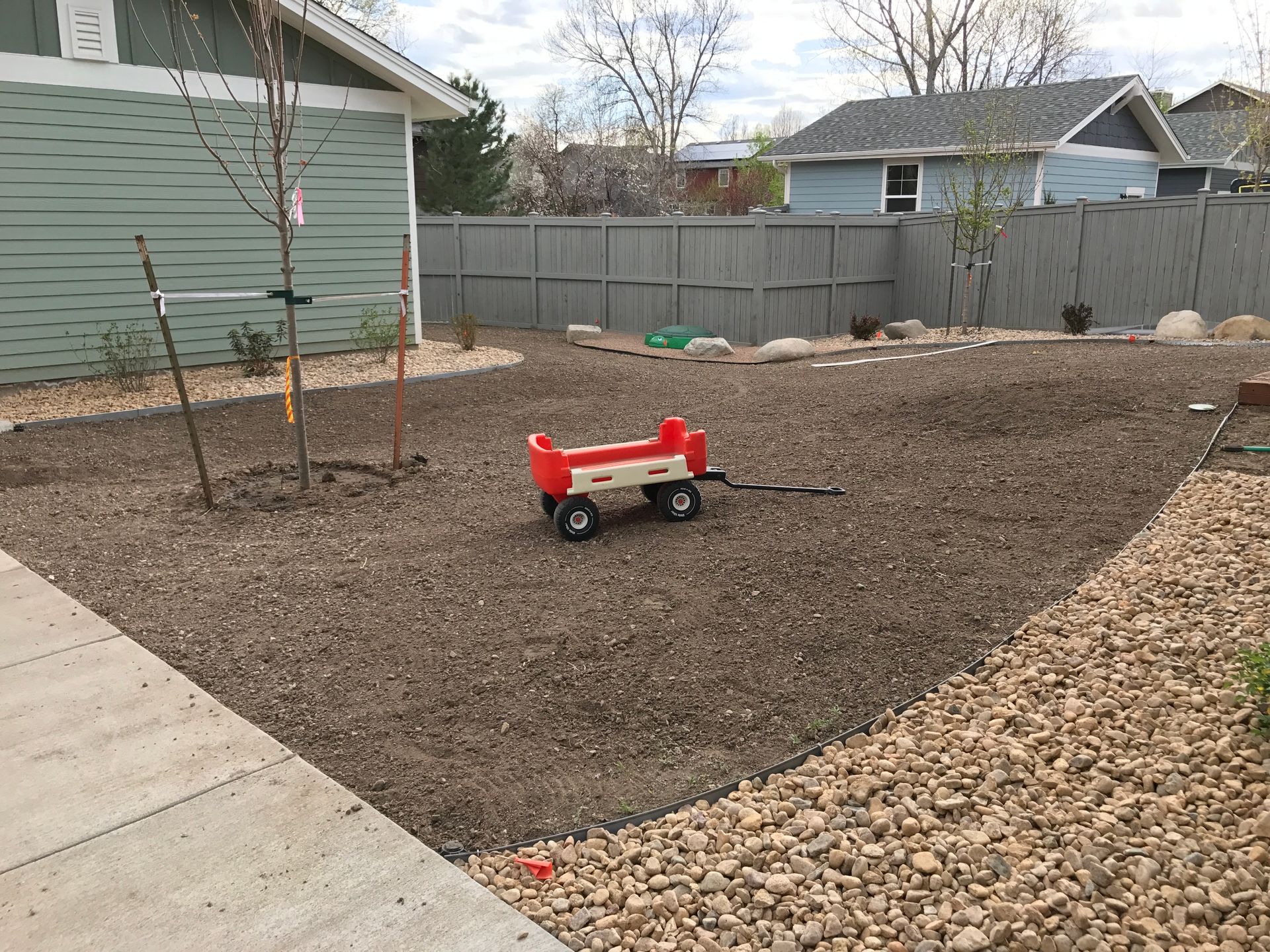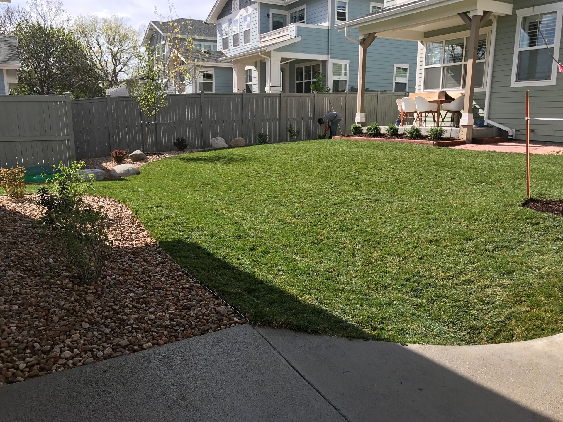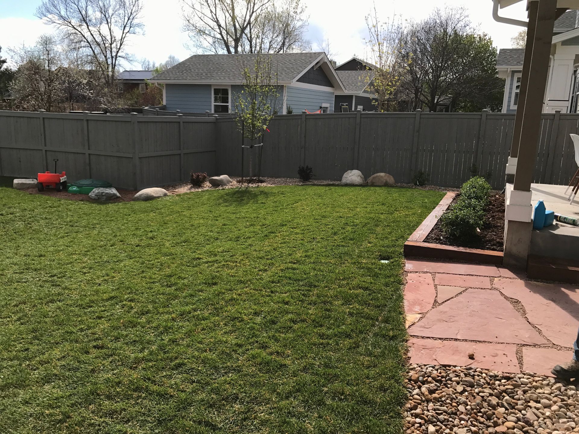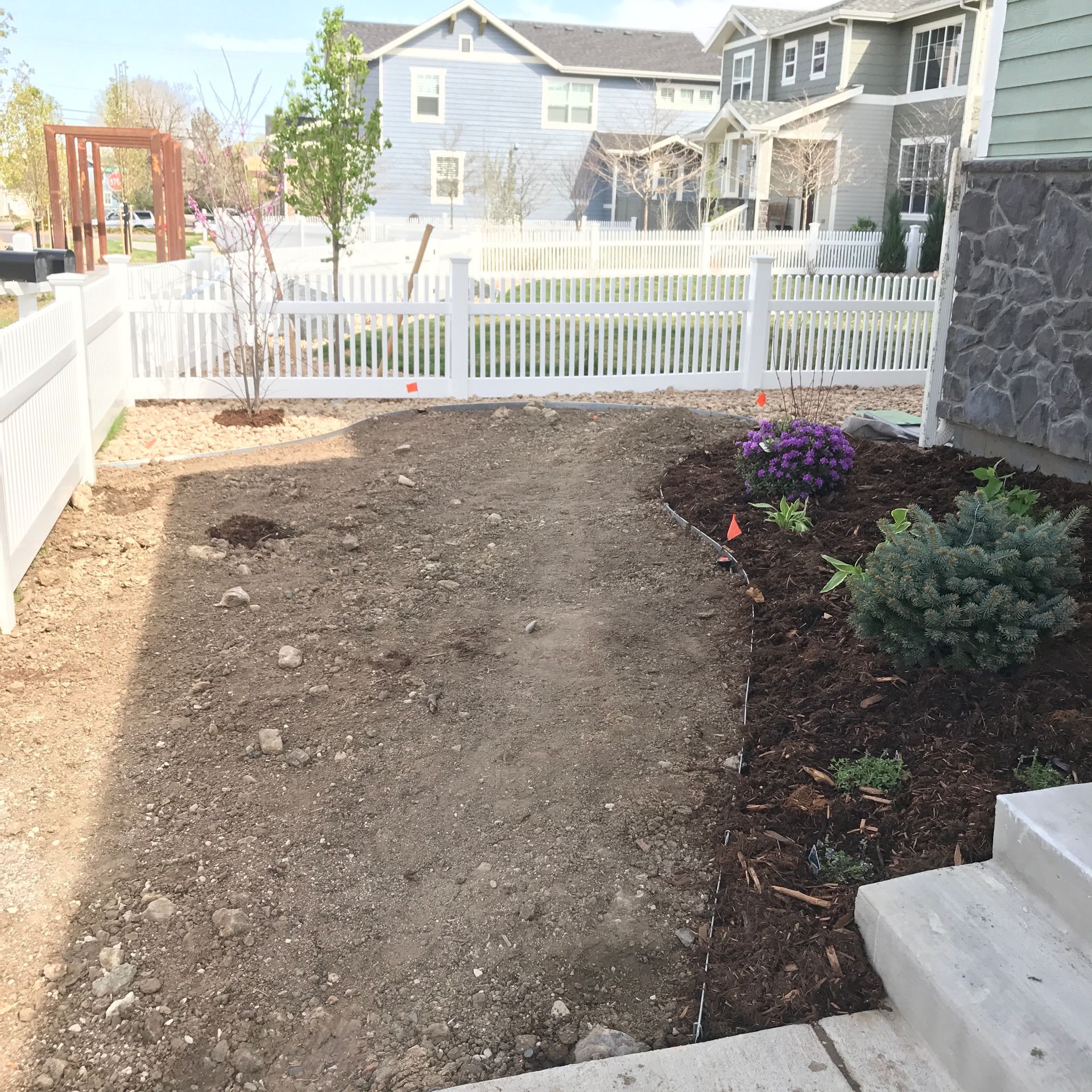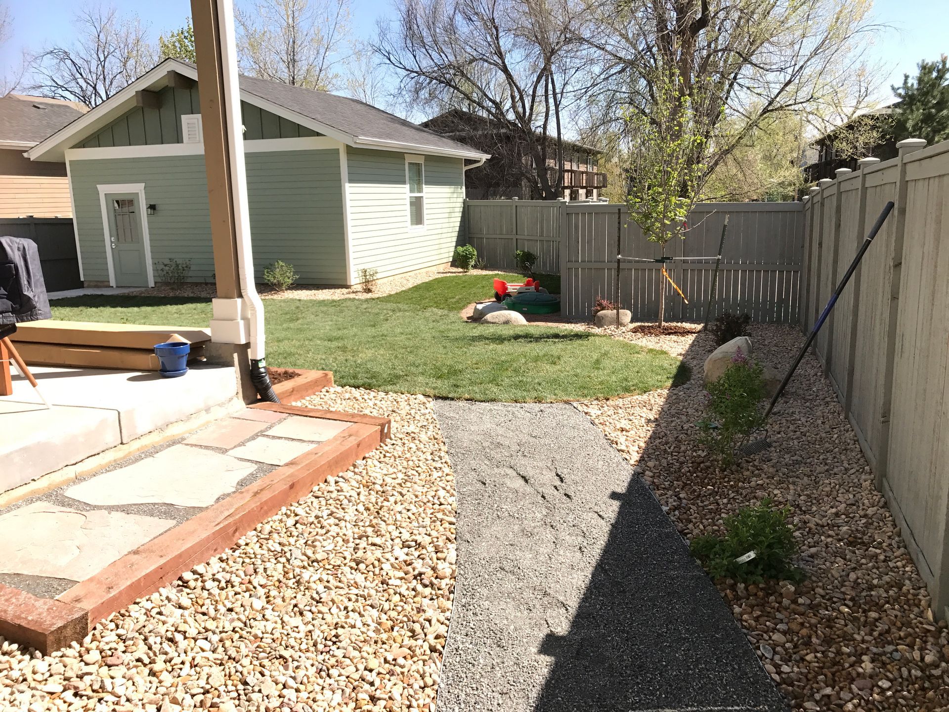 Full landscape remodel with decorative rock, plantings, sprinklers and grass. Lafayette, CO 2019