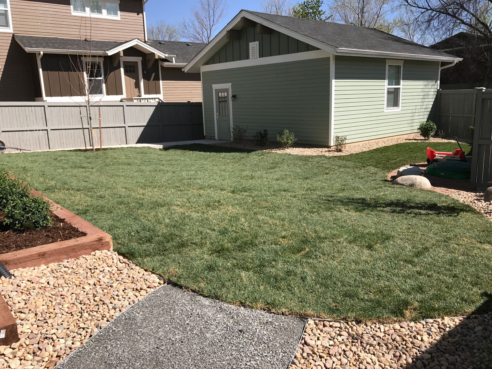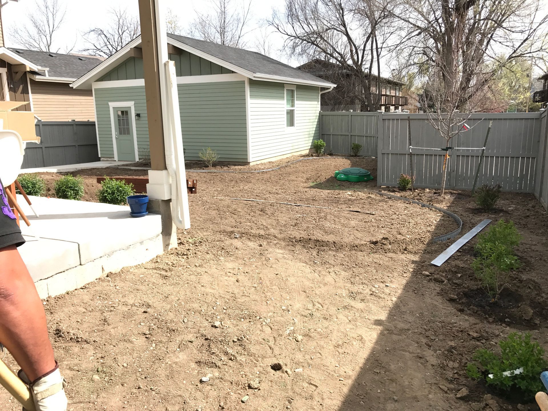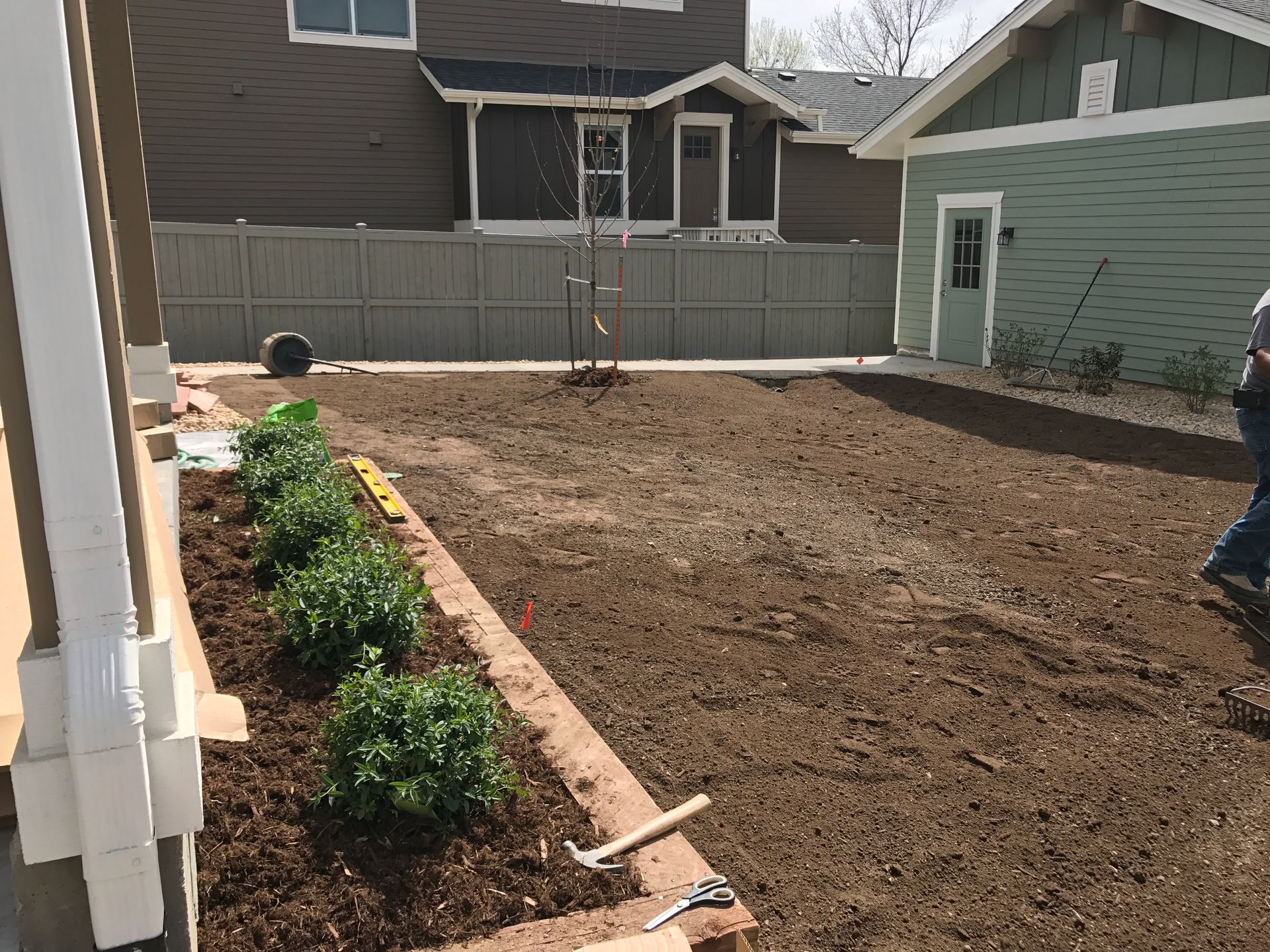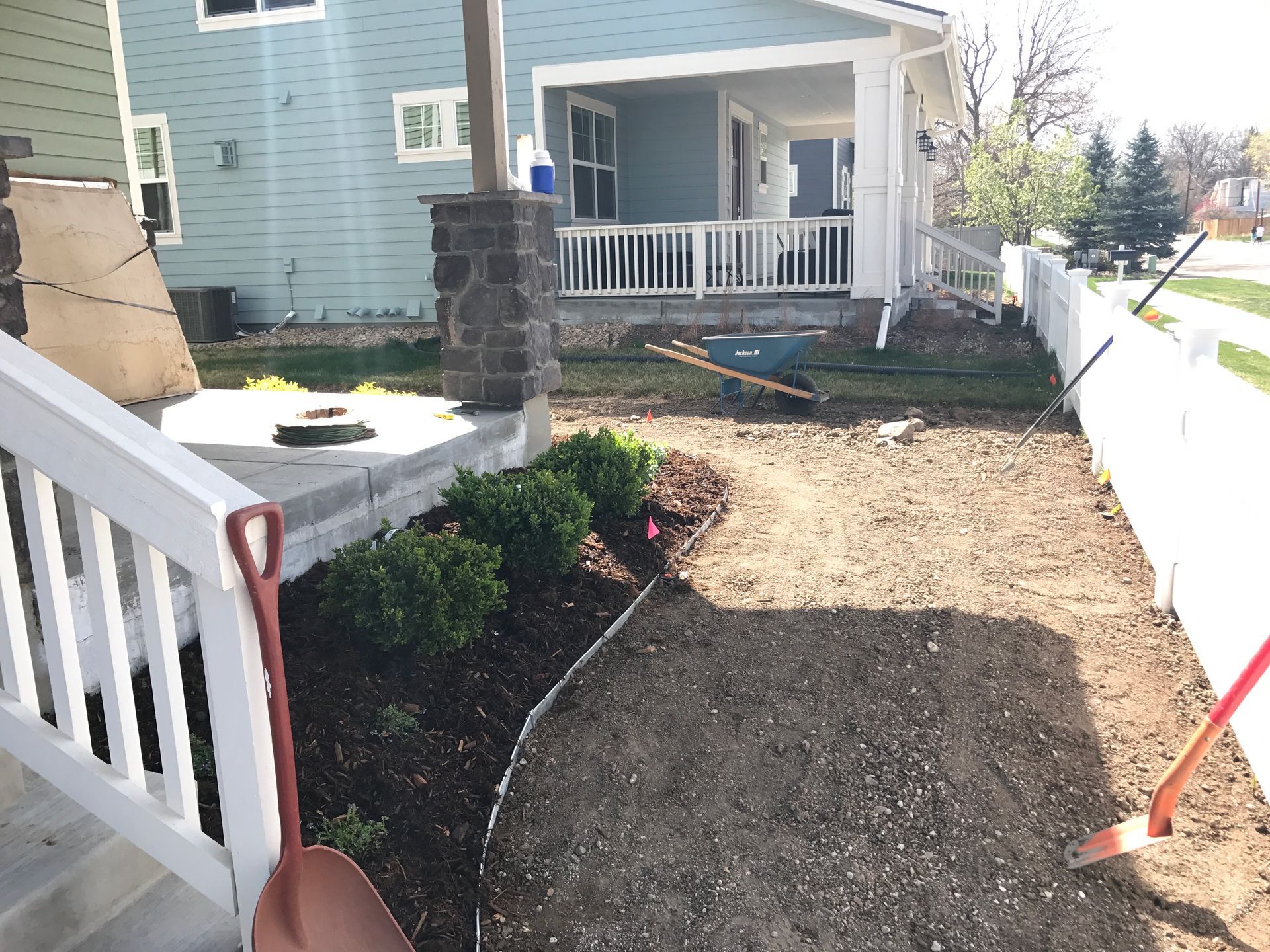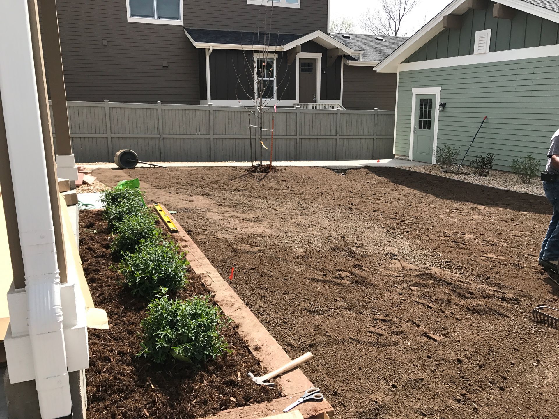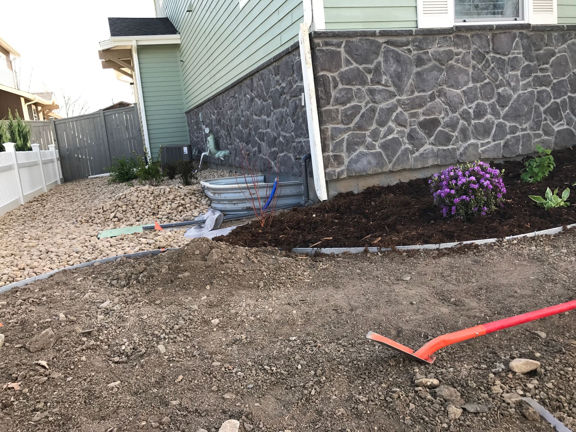 Full landscape remodel with decorative rock, plantings, sprinklers and grass. Lafayette, CO 2019