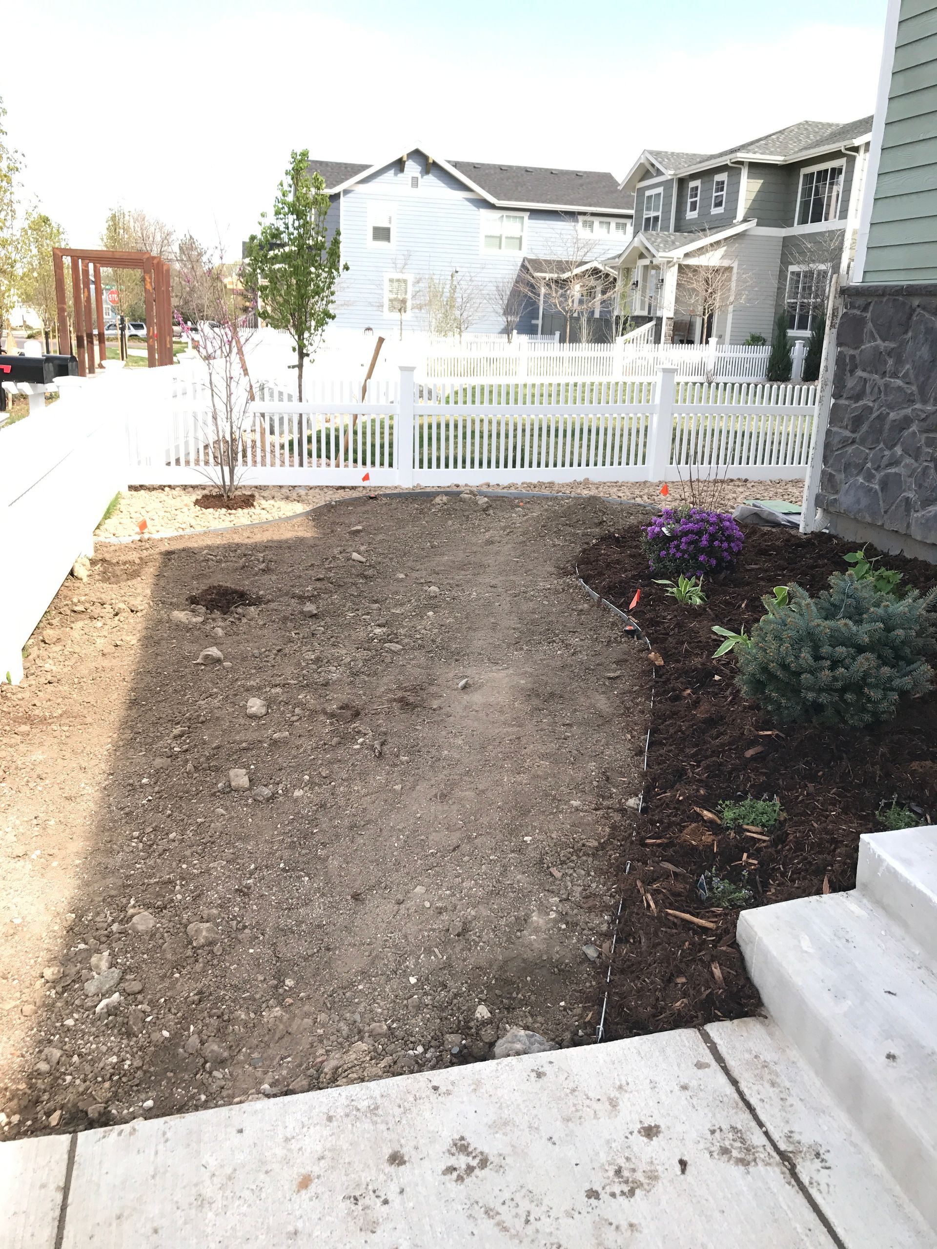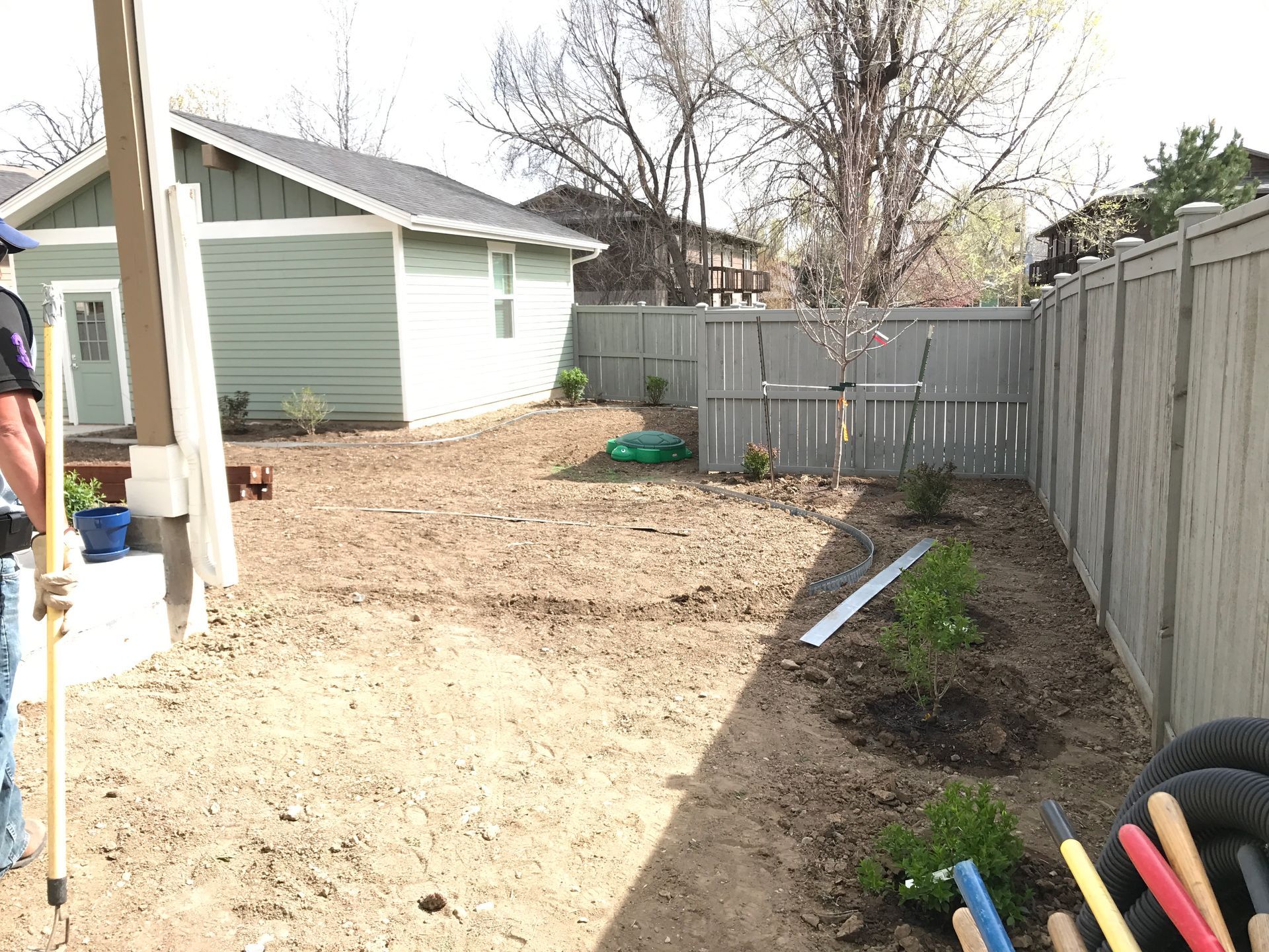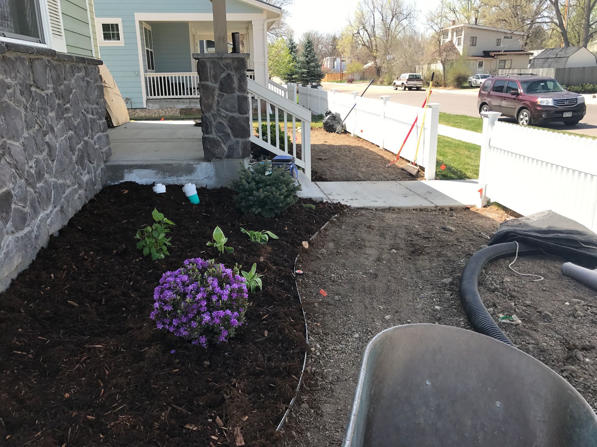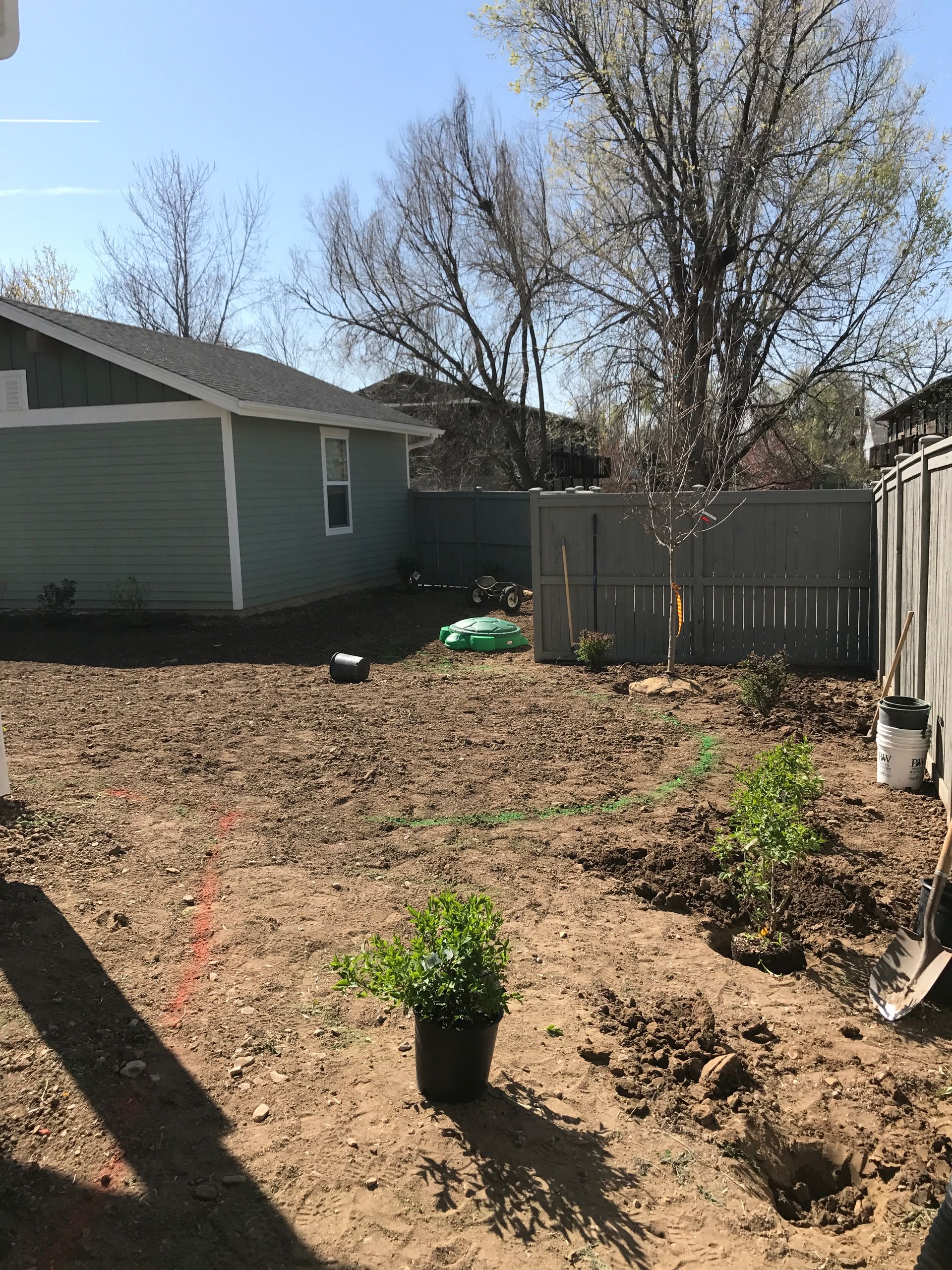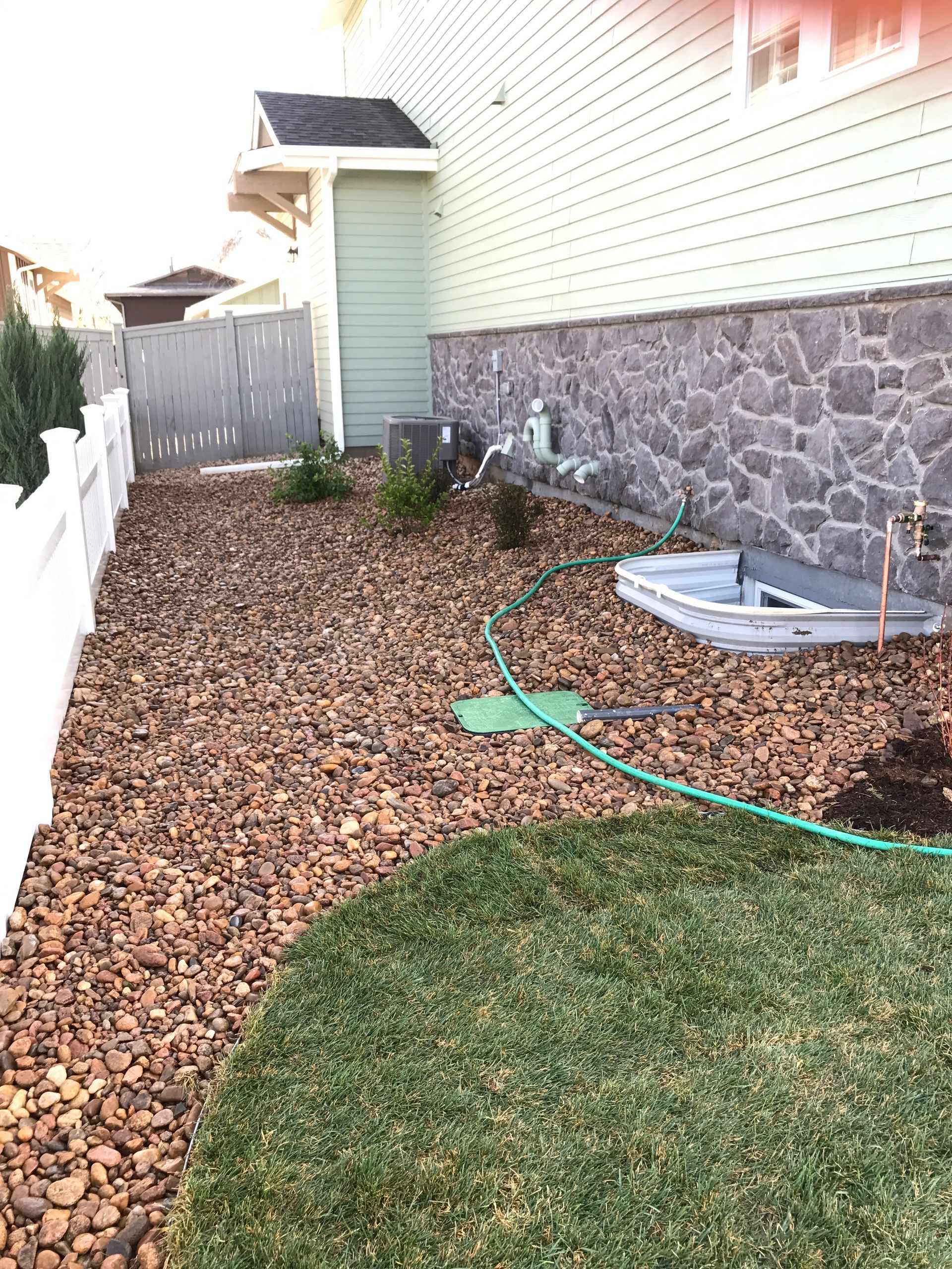 Full landscape remodel with decorative rock, plantings, sprinklers and grass. Lafayette, CO 2019
