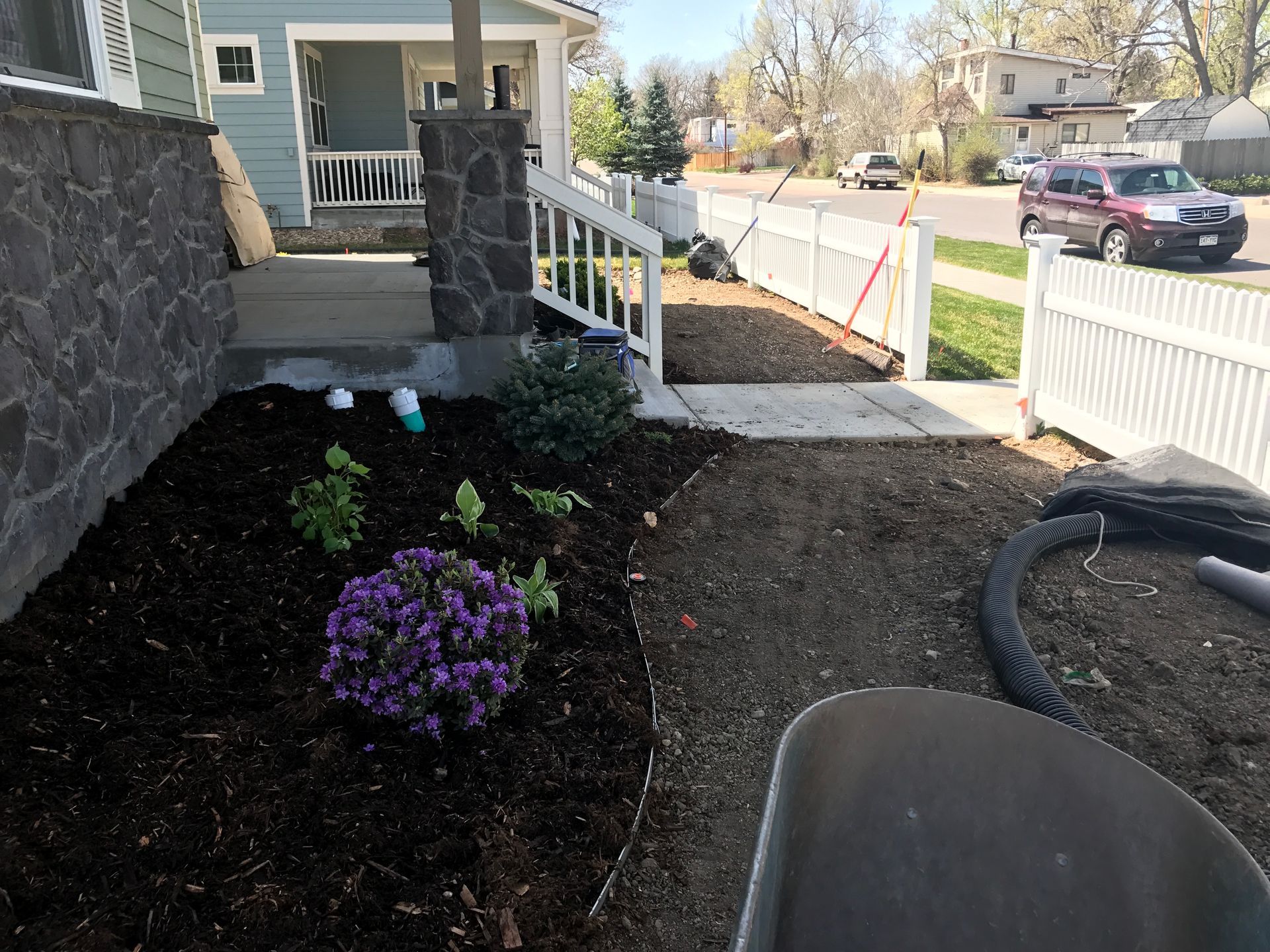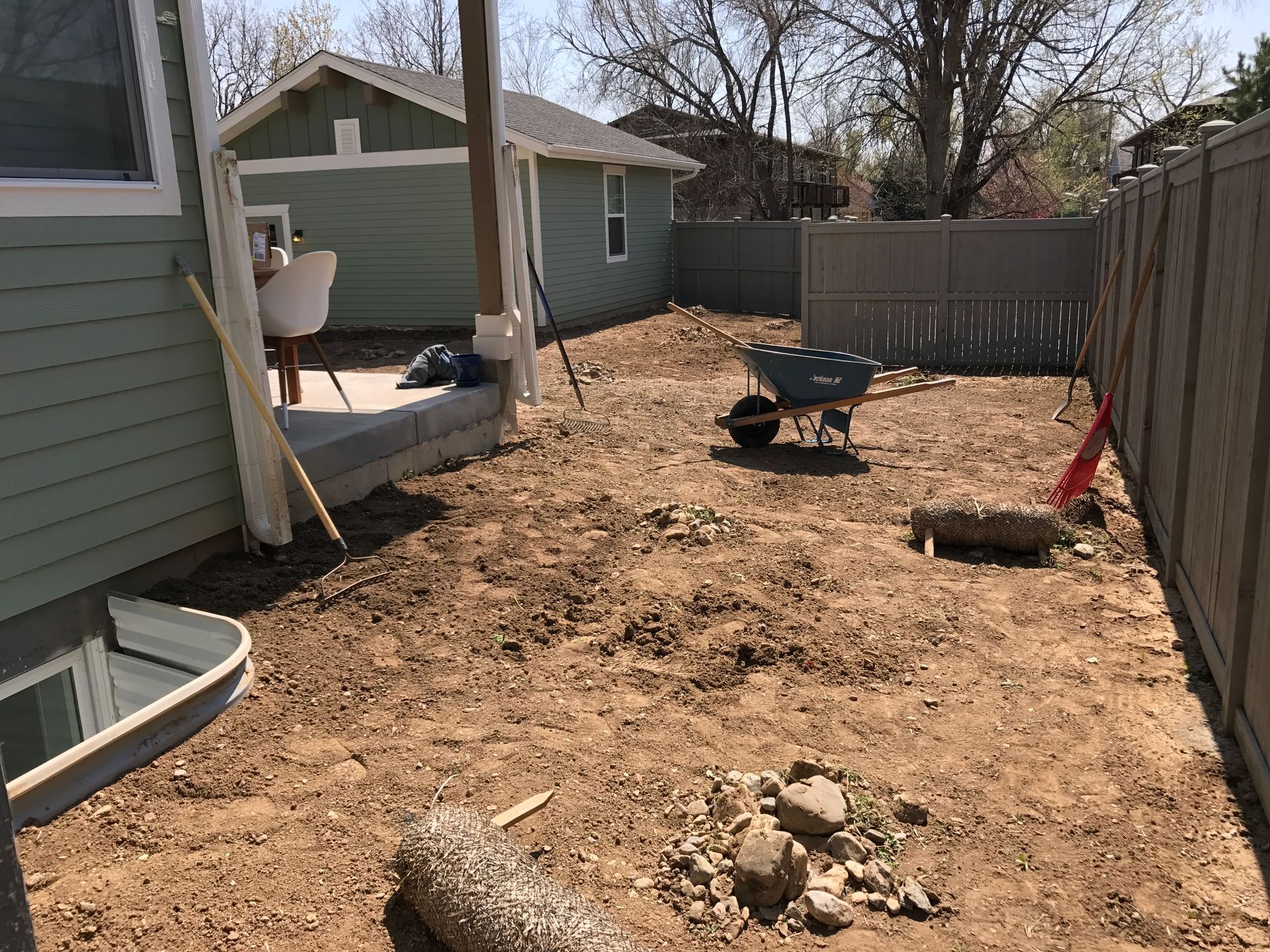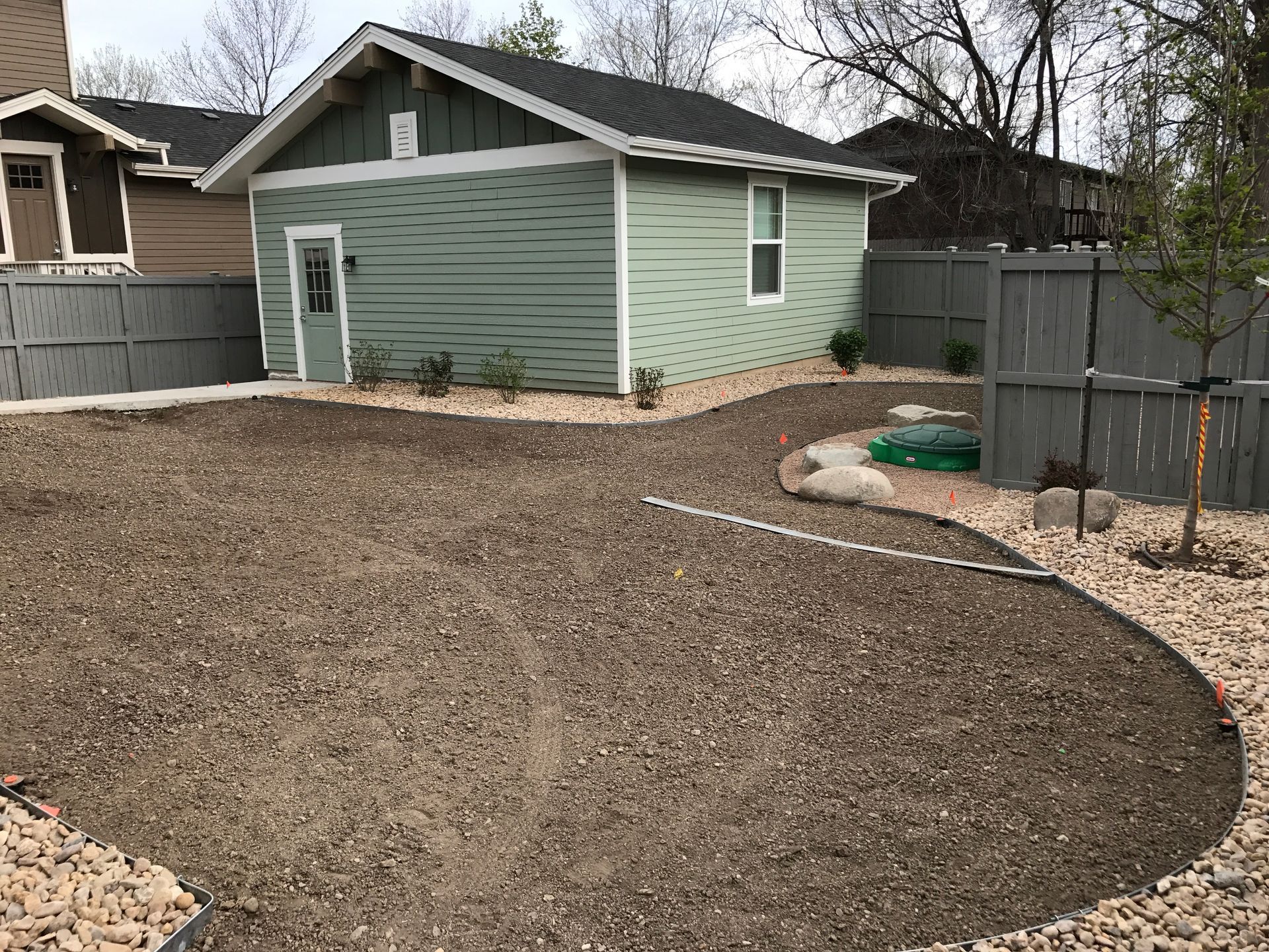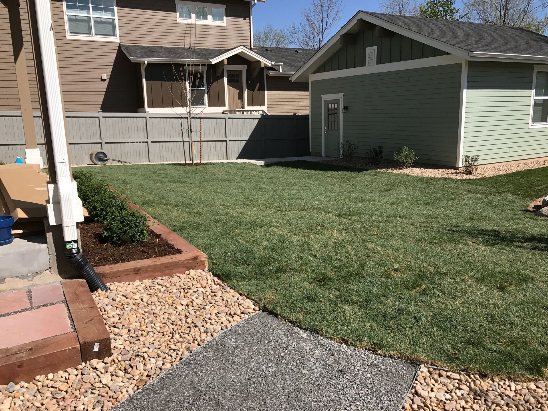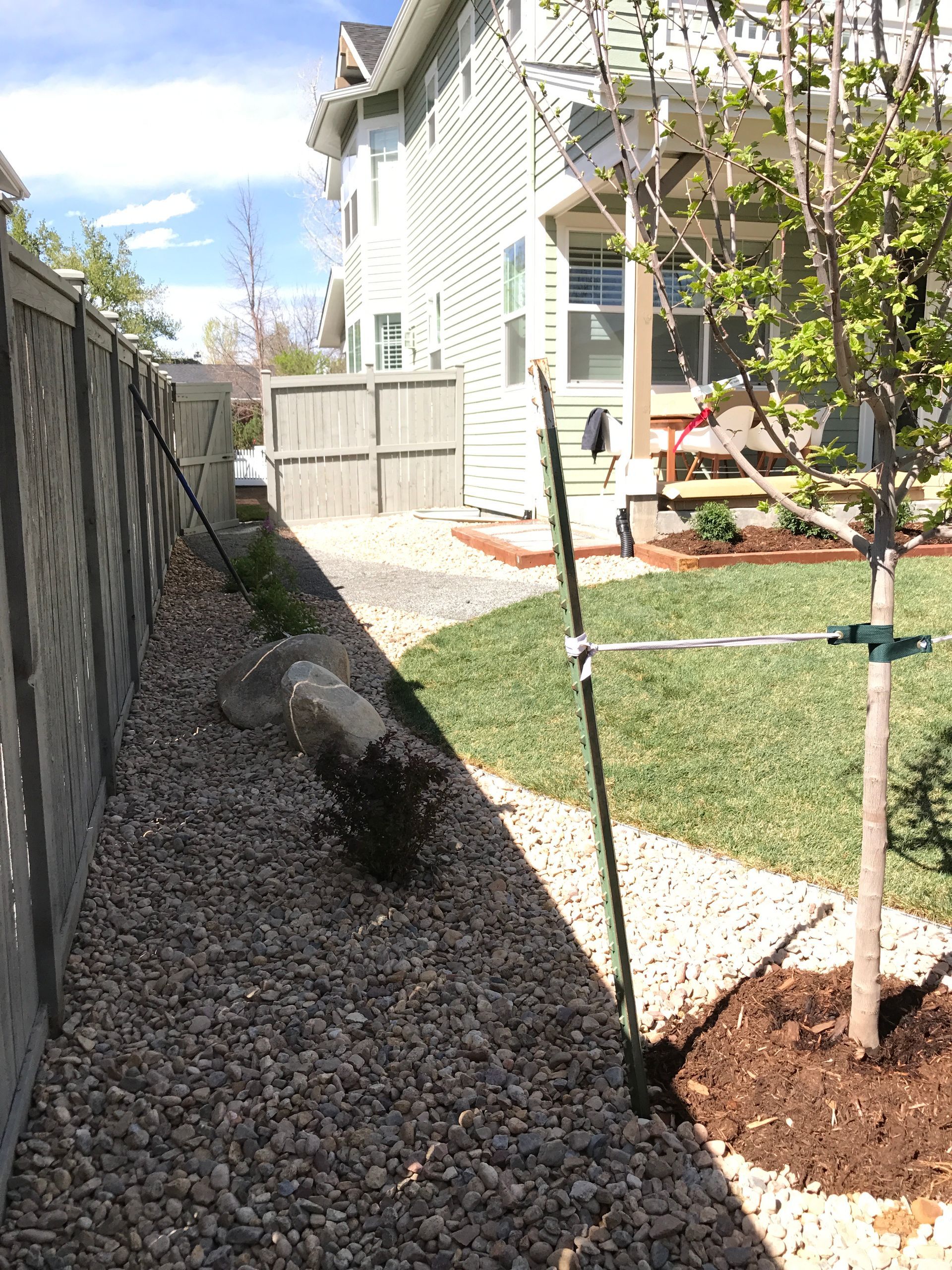 Full landscape remodel with decorative rock, plantings, sprinklers and grass. Lafayette, CO 2019