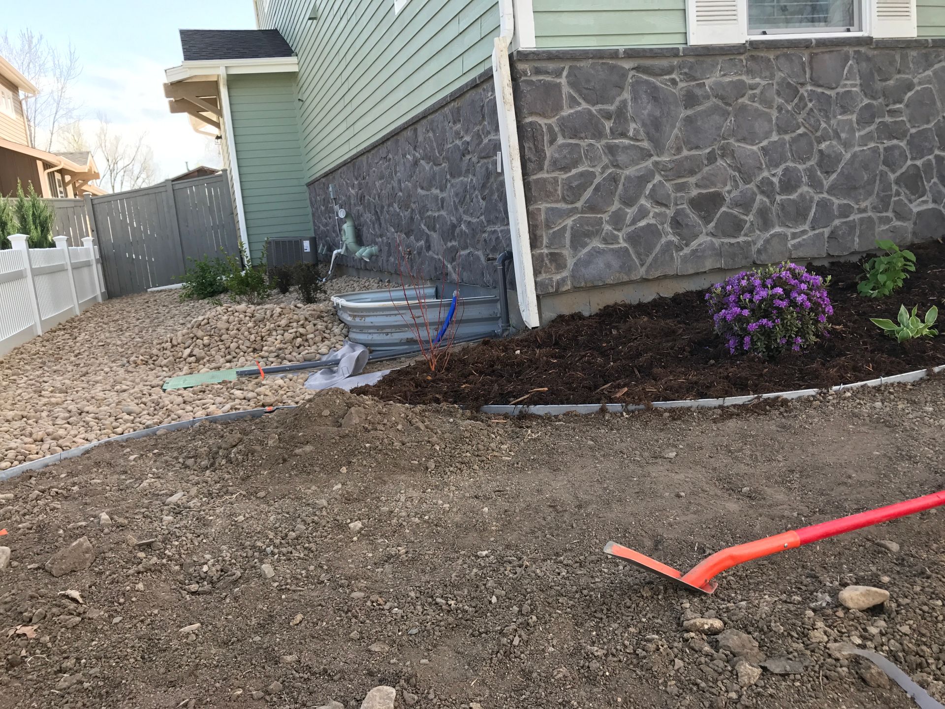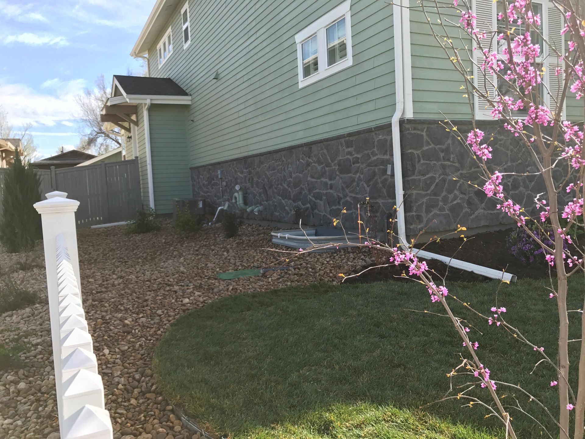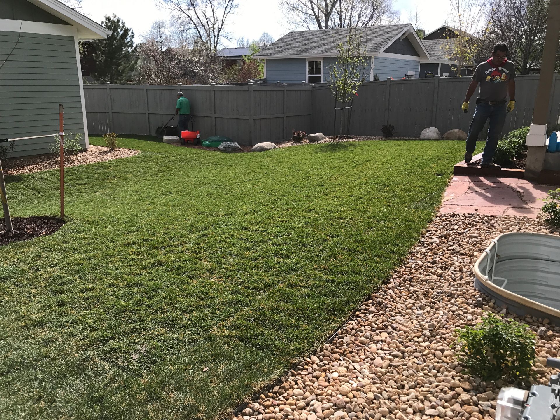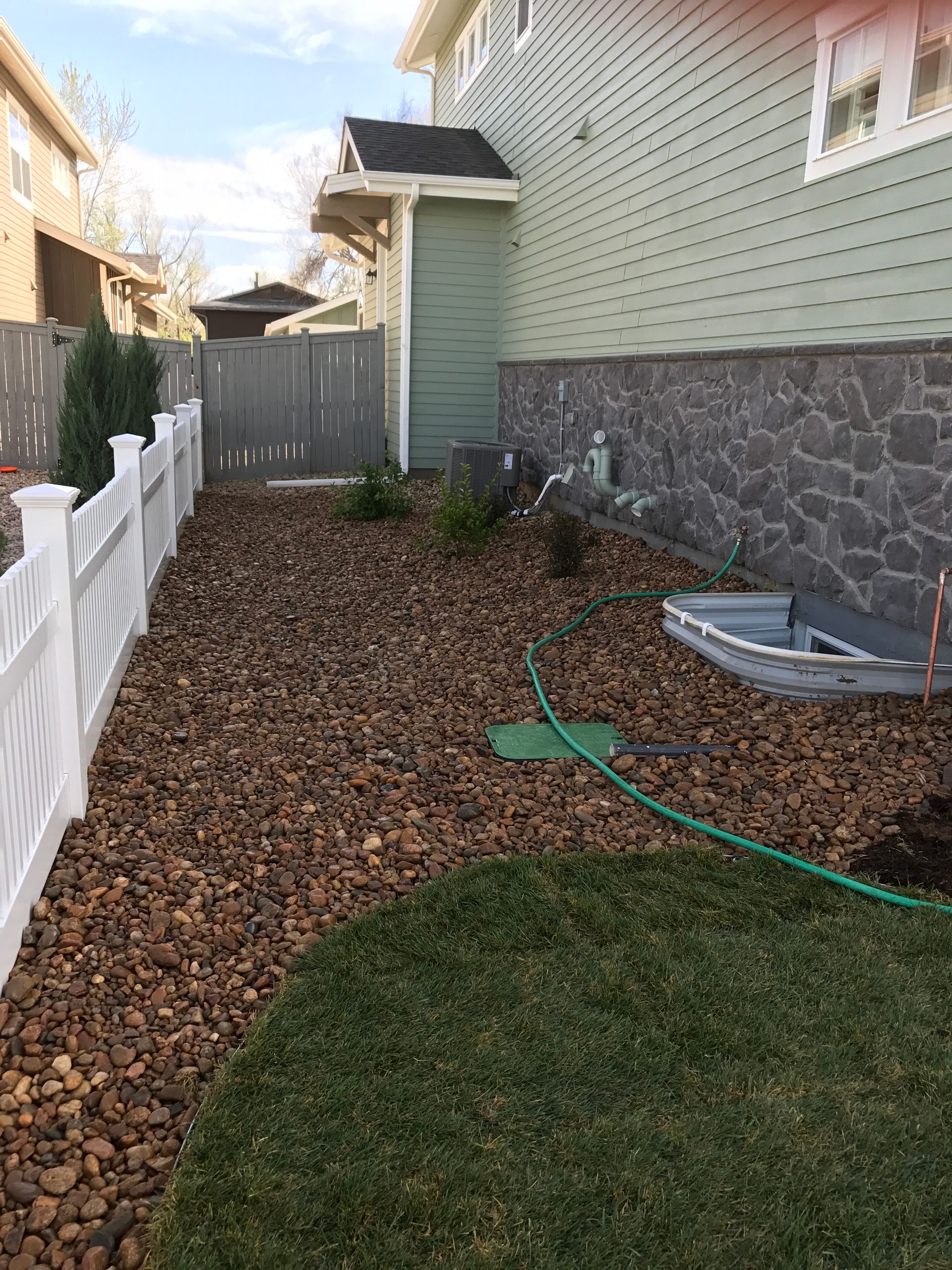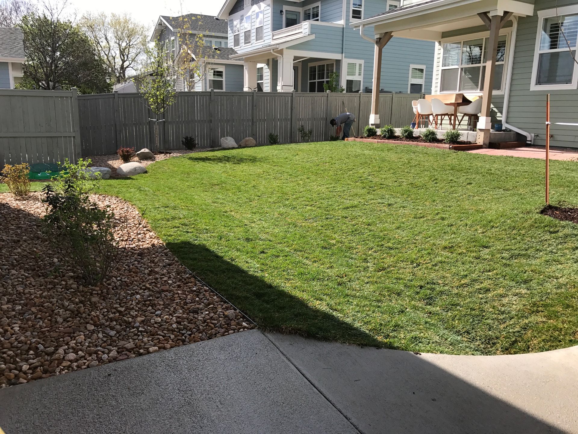 Full landscape remodel with decorative rock, plantings, sprinklers and grass. Lafayette, CO 2019