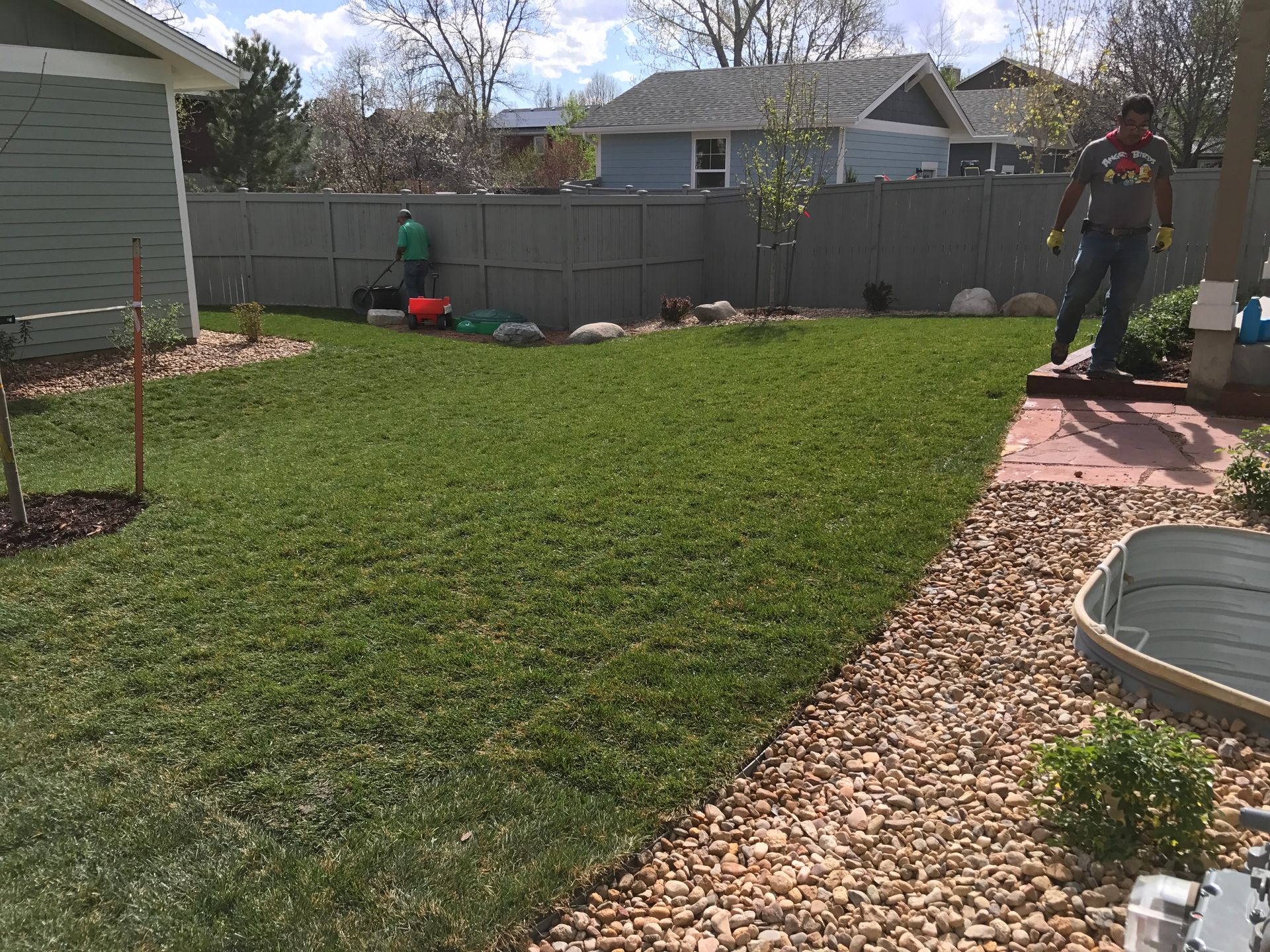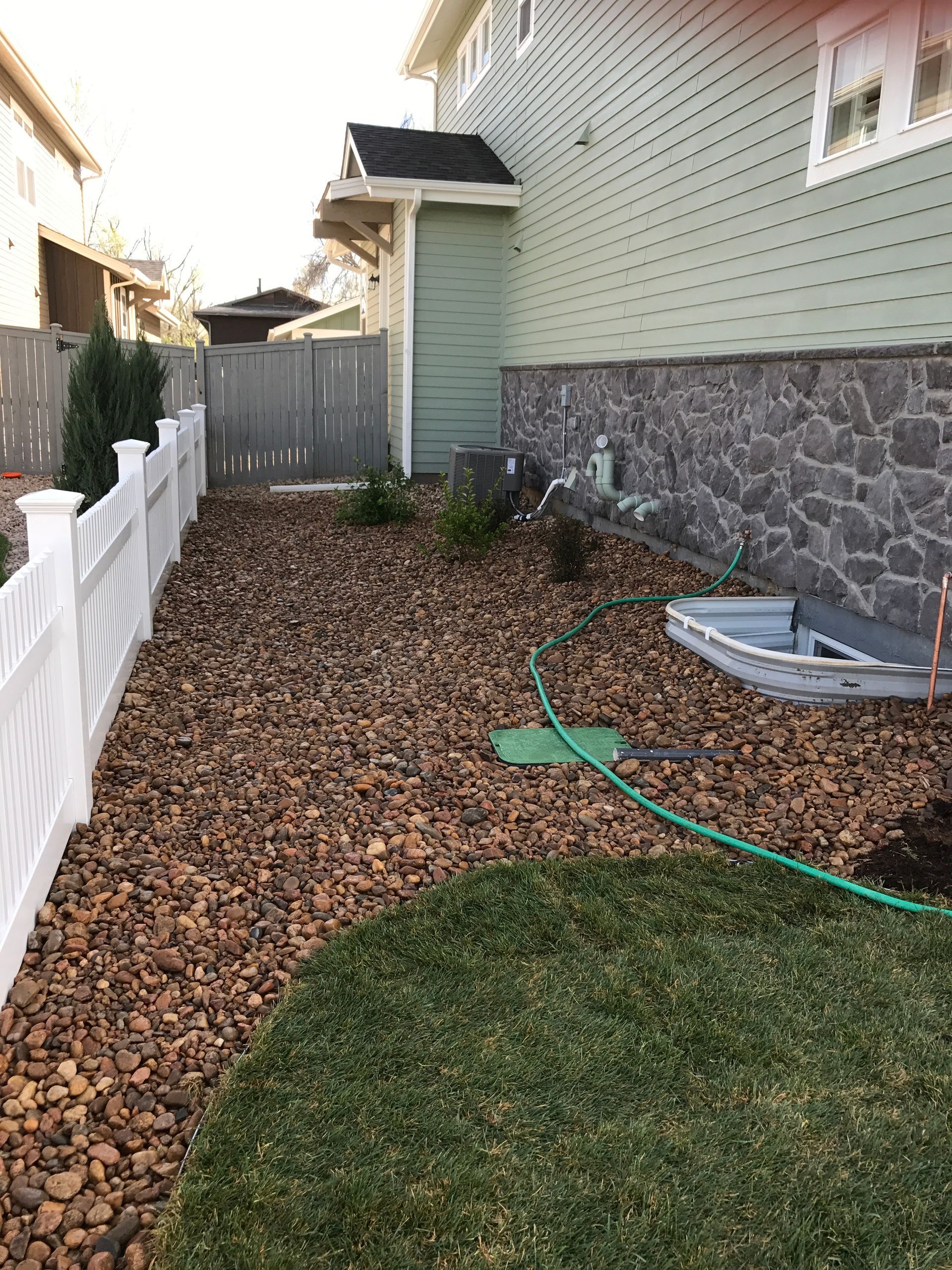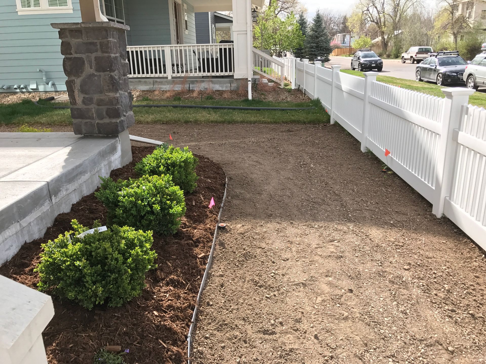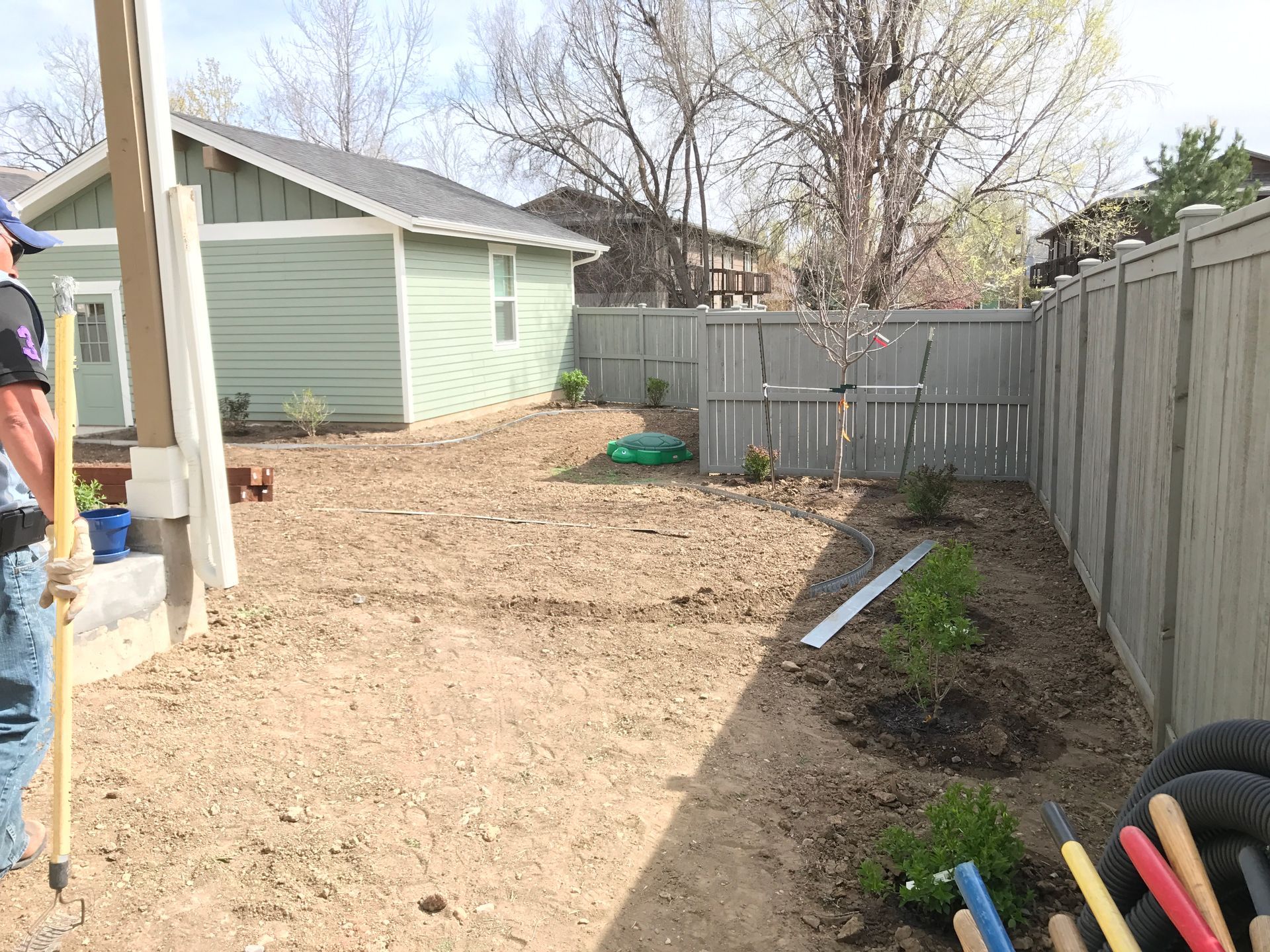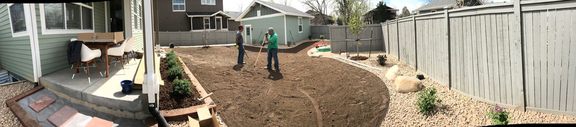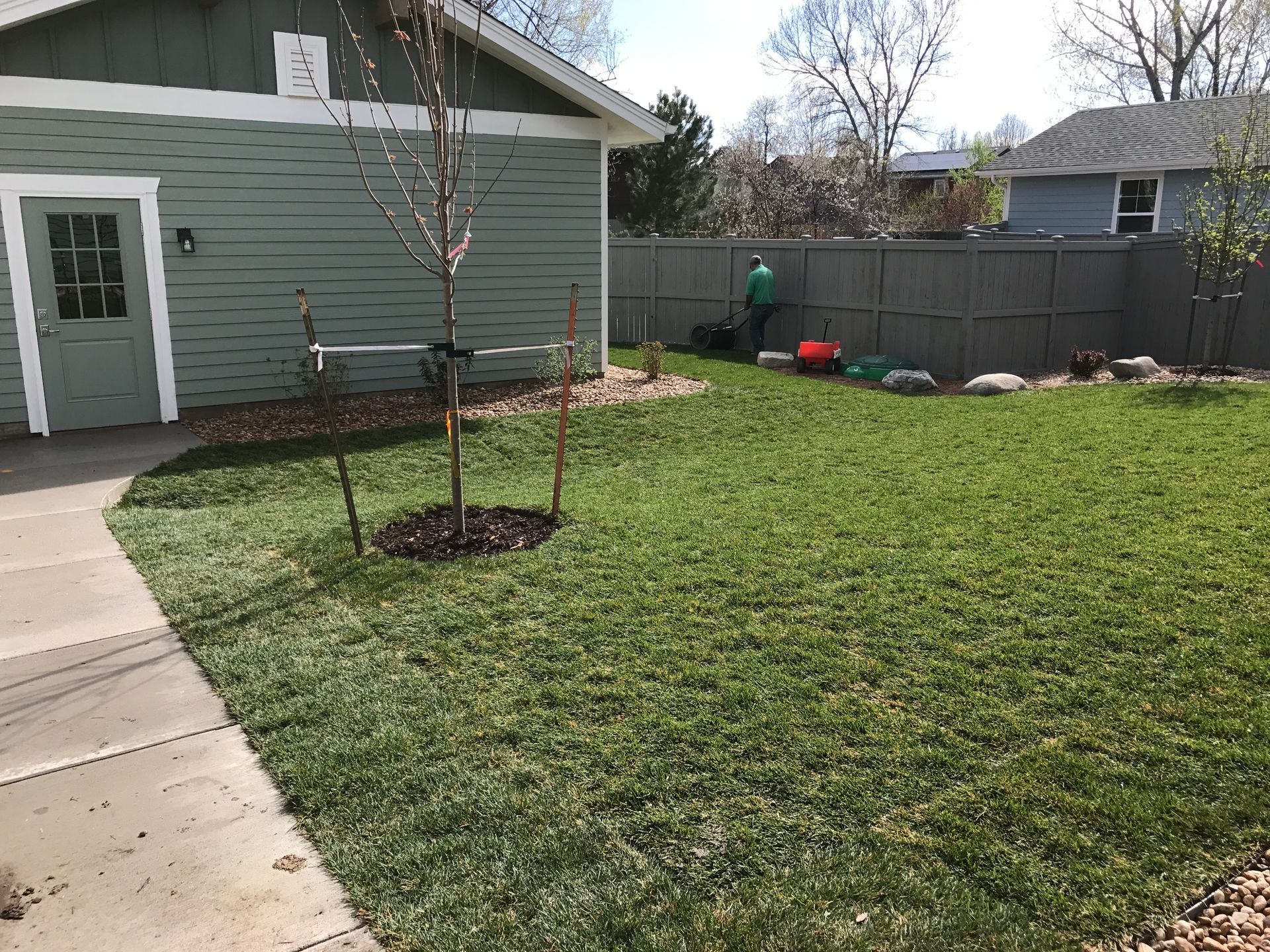 Full landscape remodel with decorative rock, plantings, sprinklers and grass. Lafayette, CO 2019