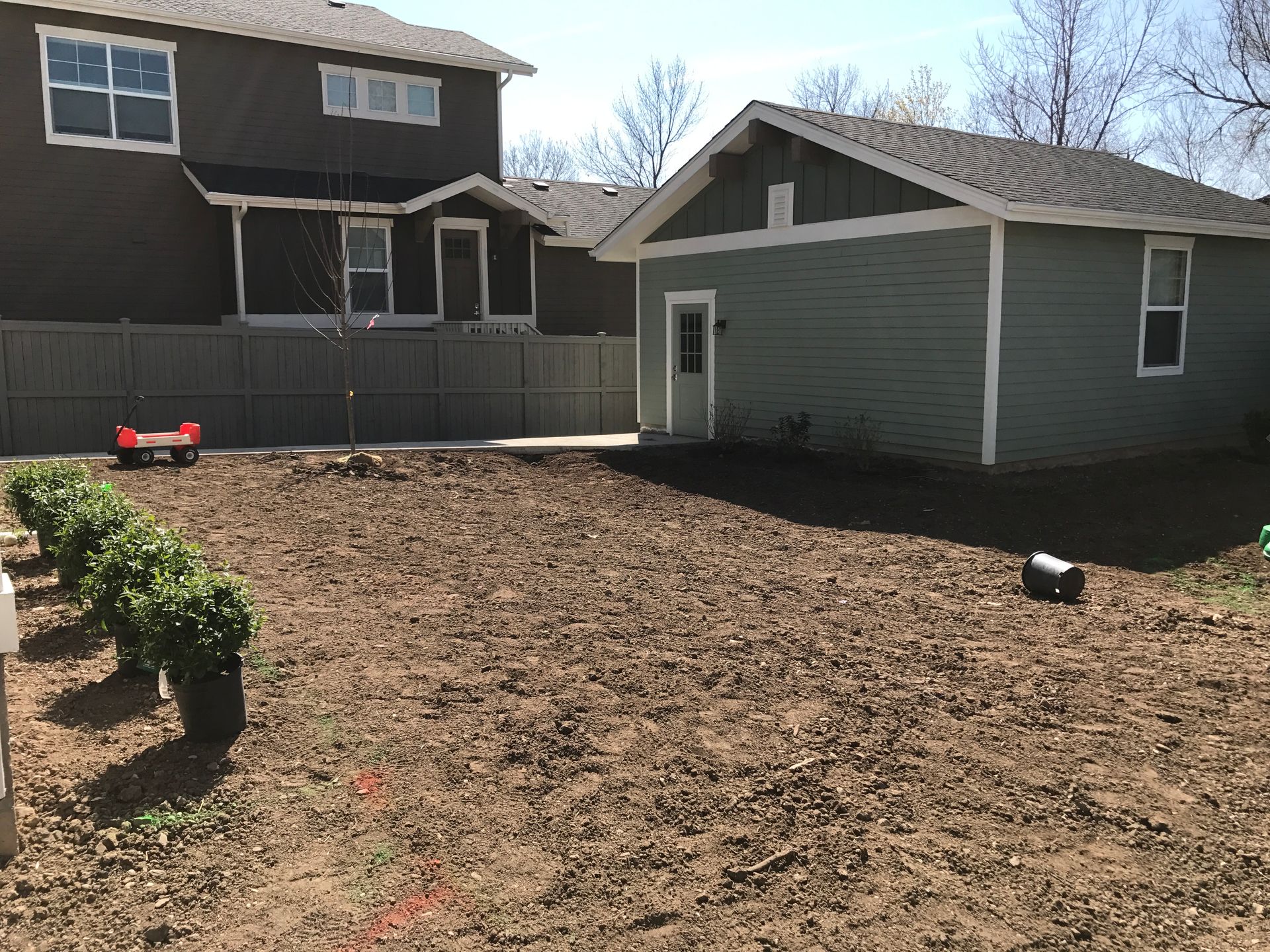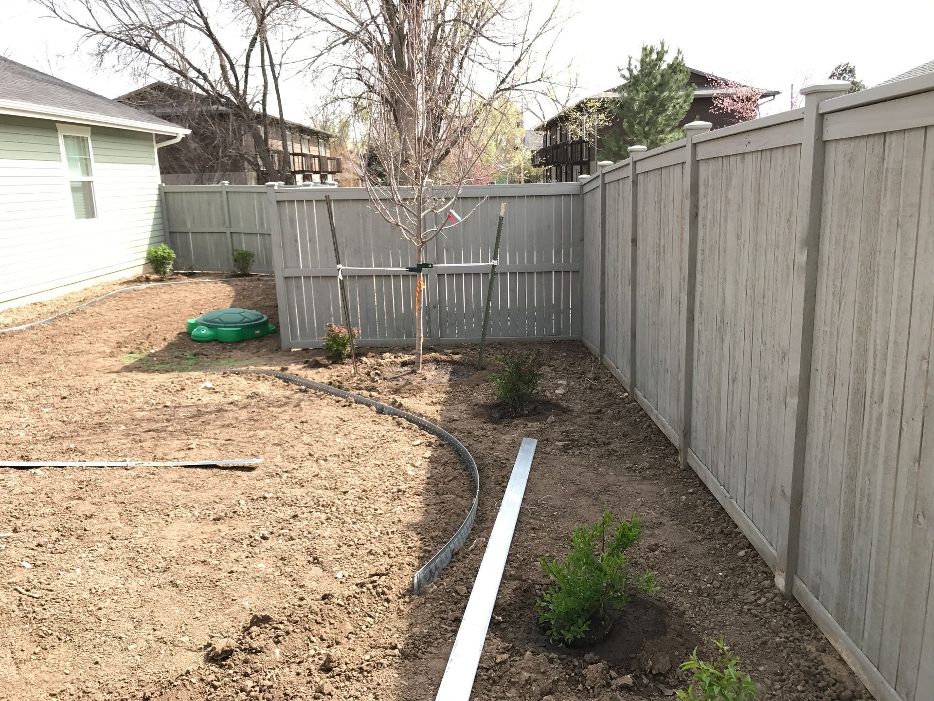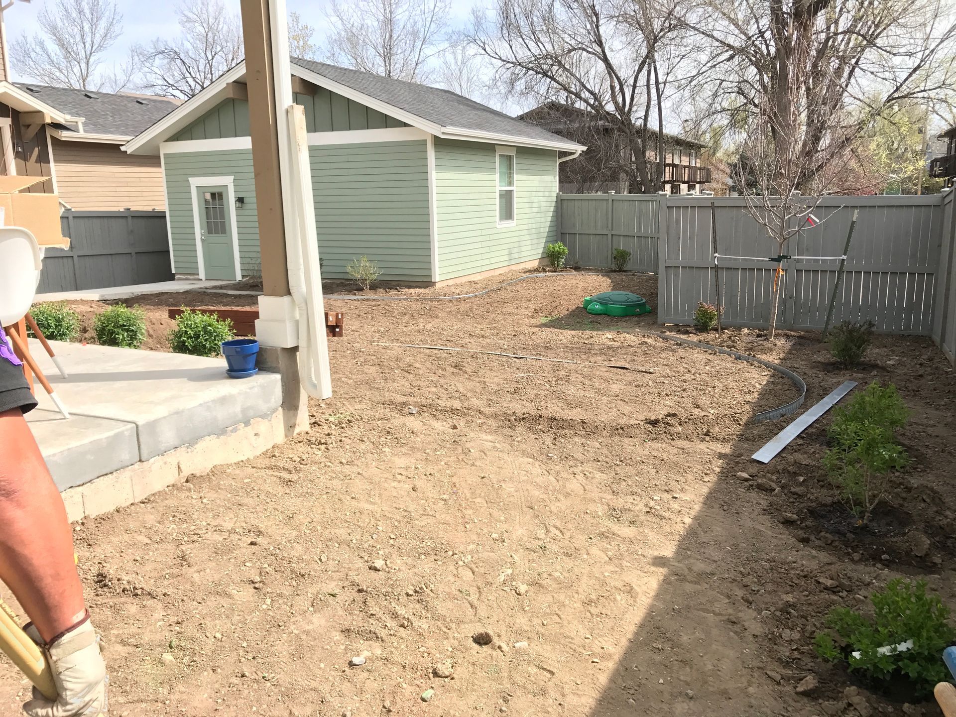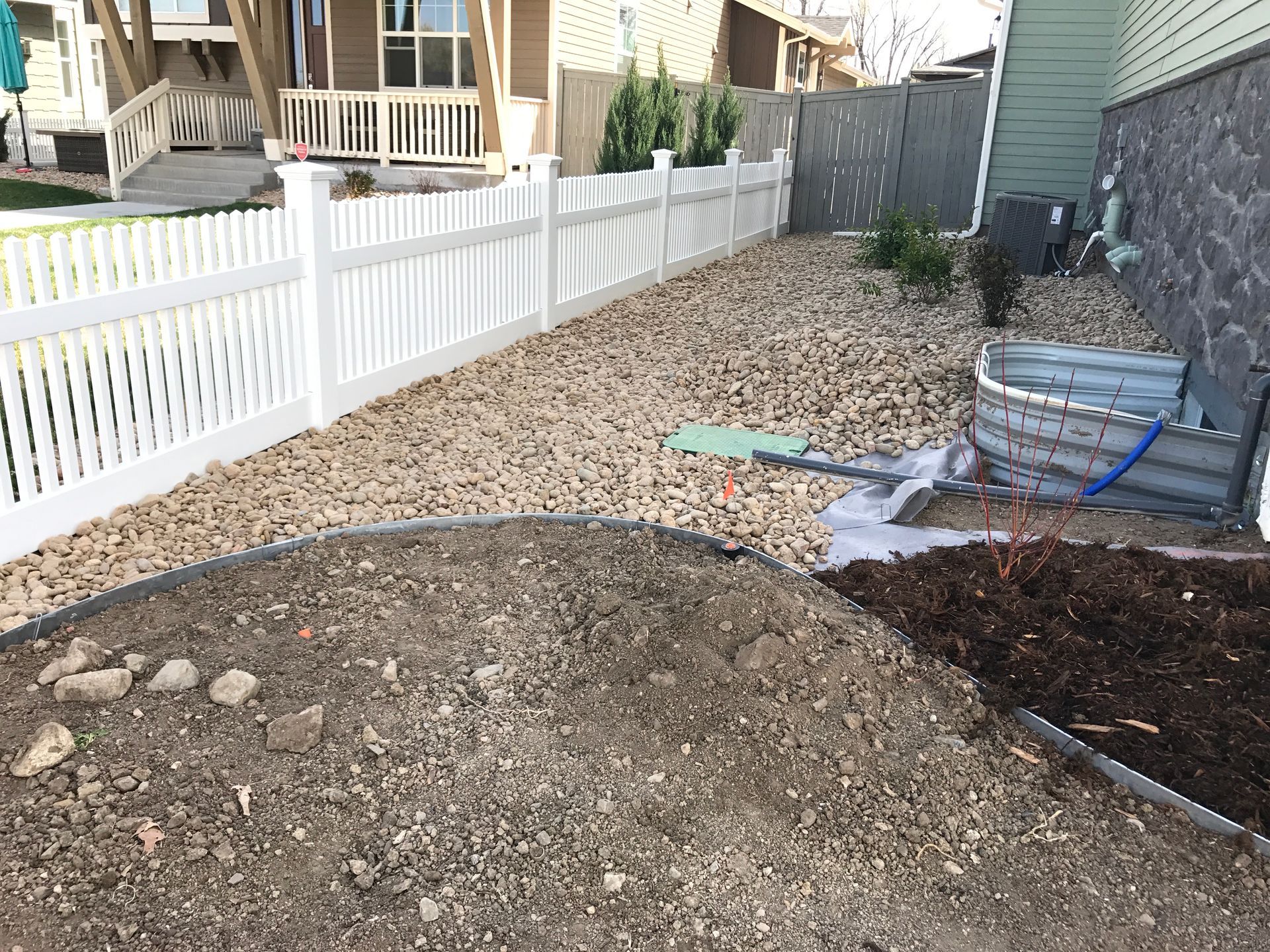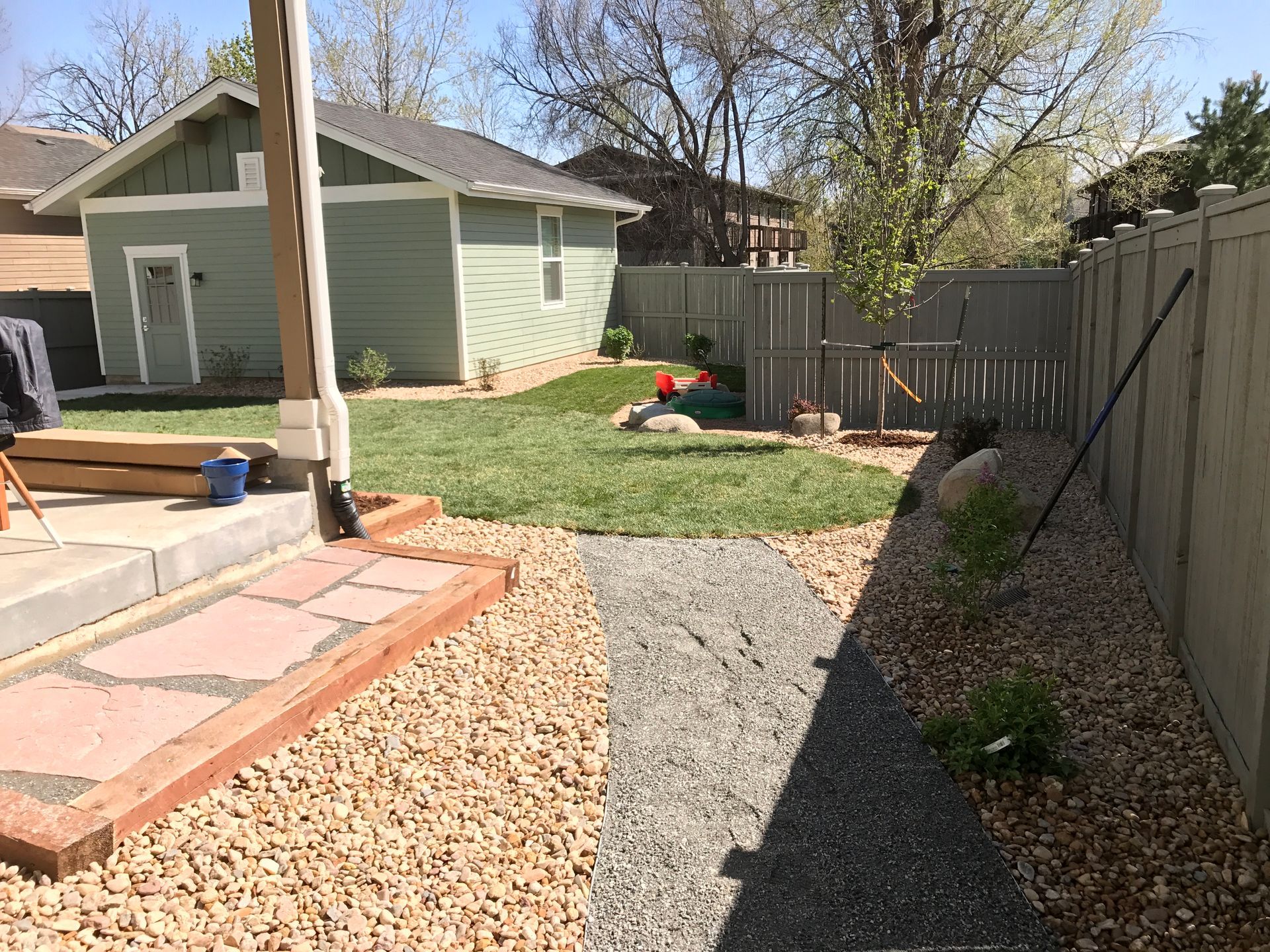 Full landscape remodel with decorative rock, plantings, sprinklers and grass. Lafayette, CO 2019
