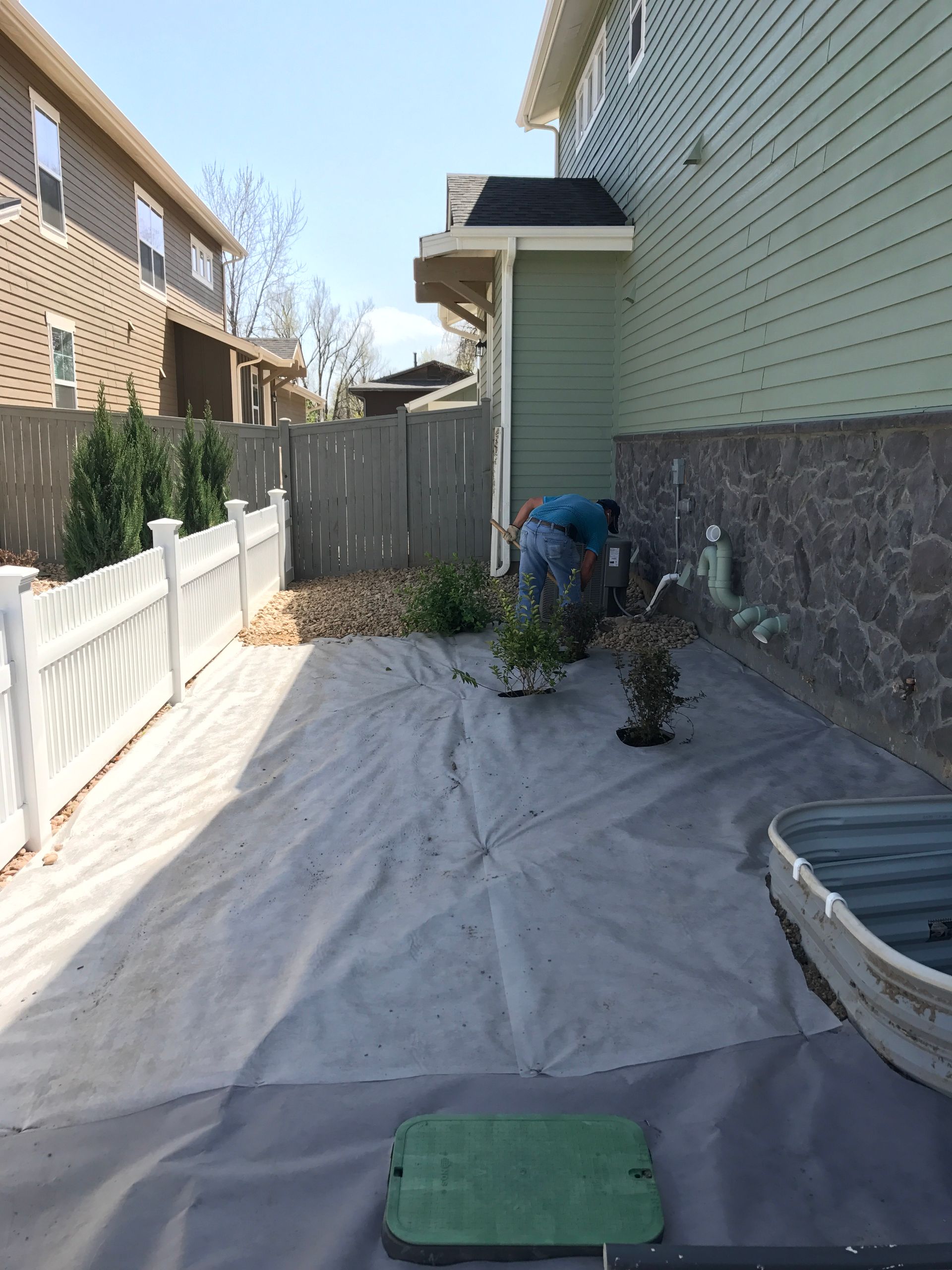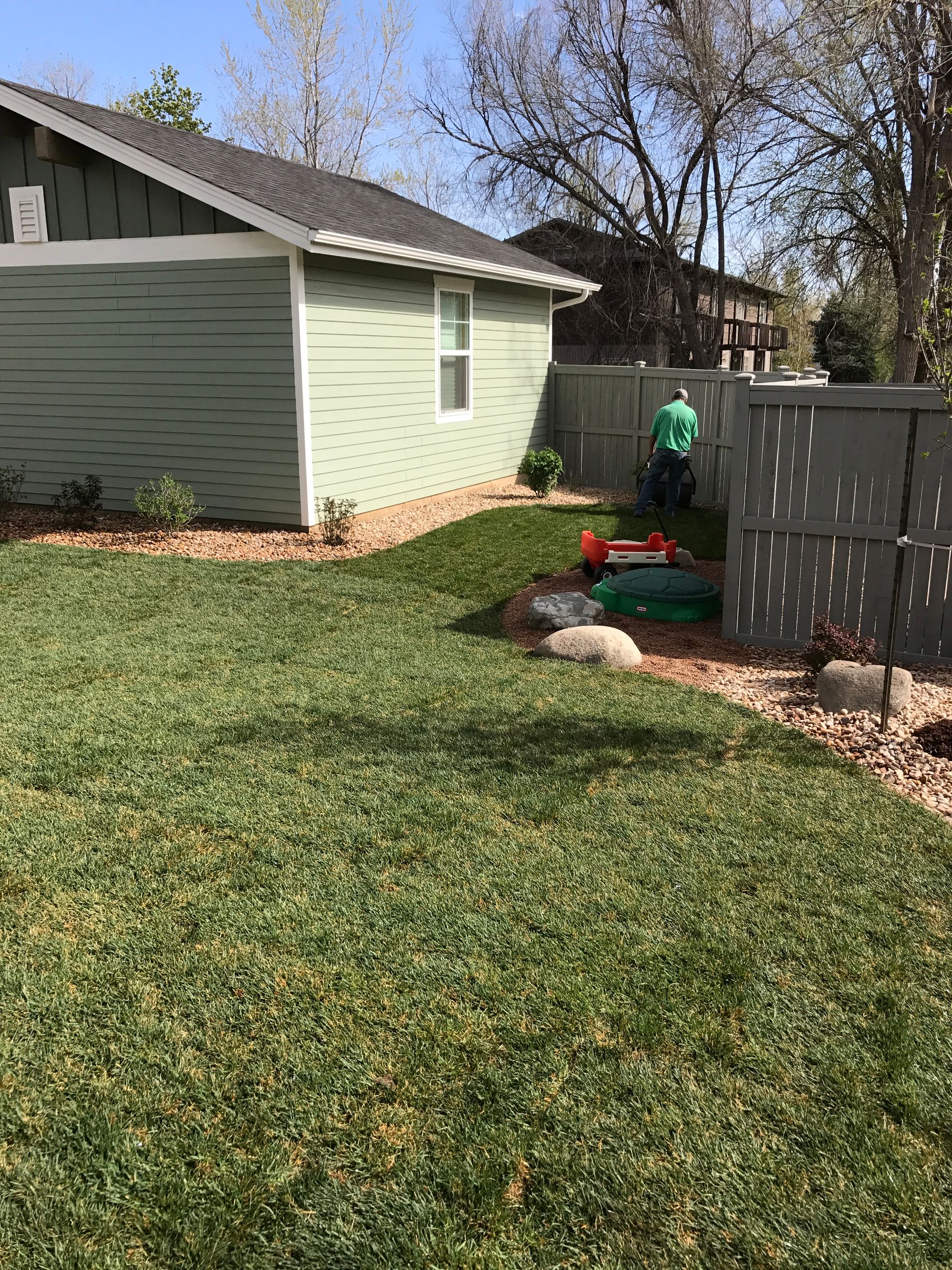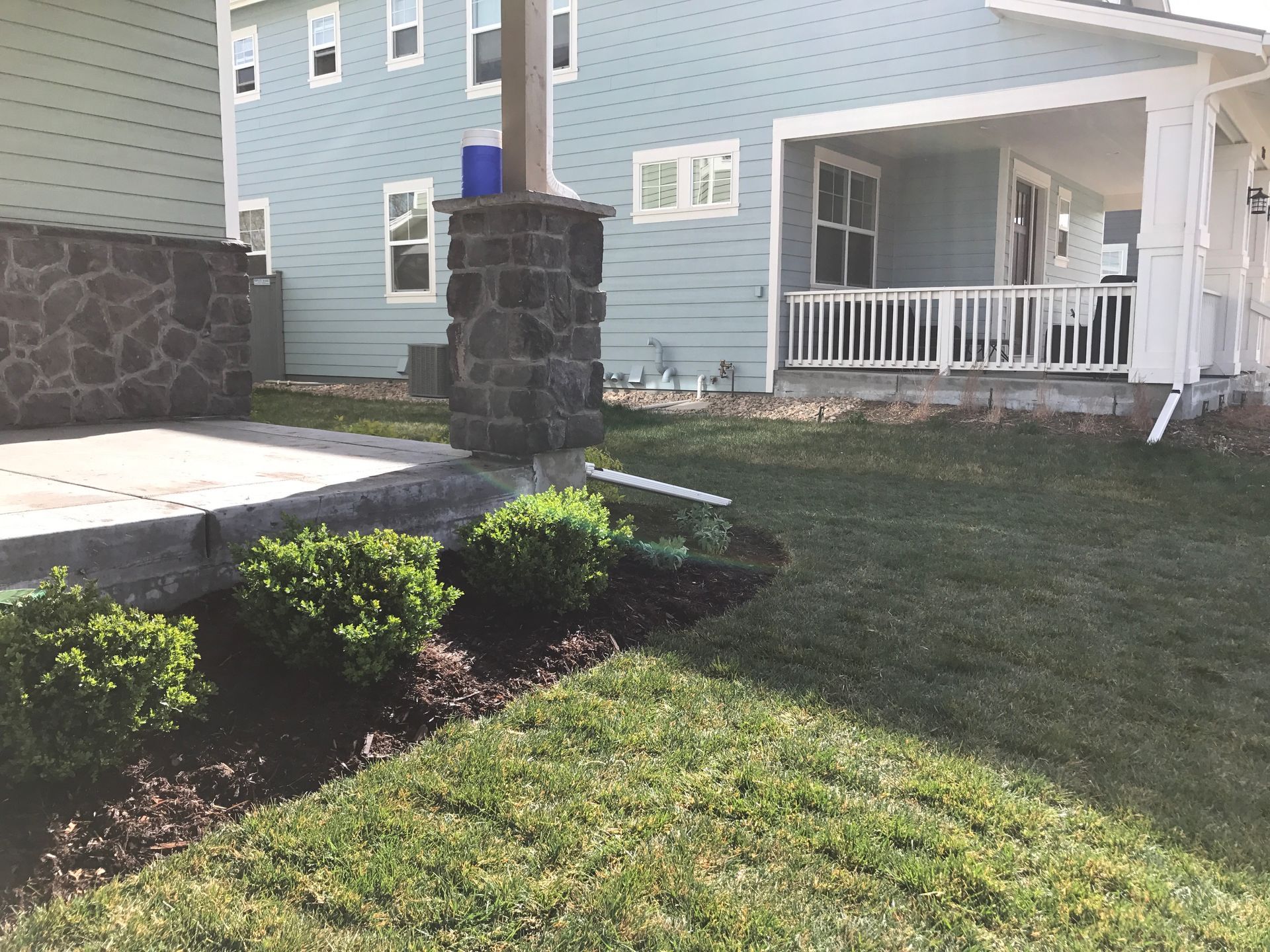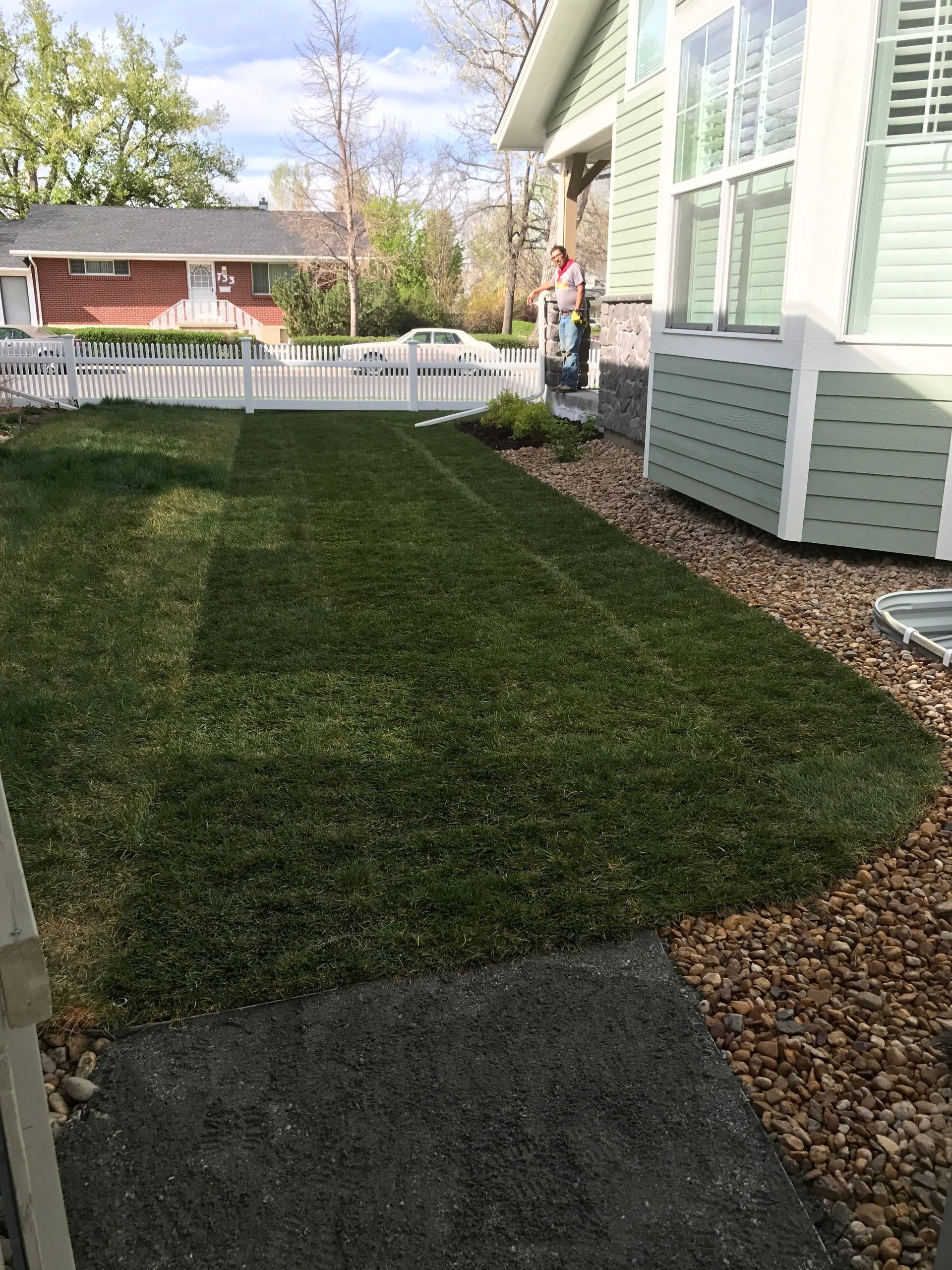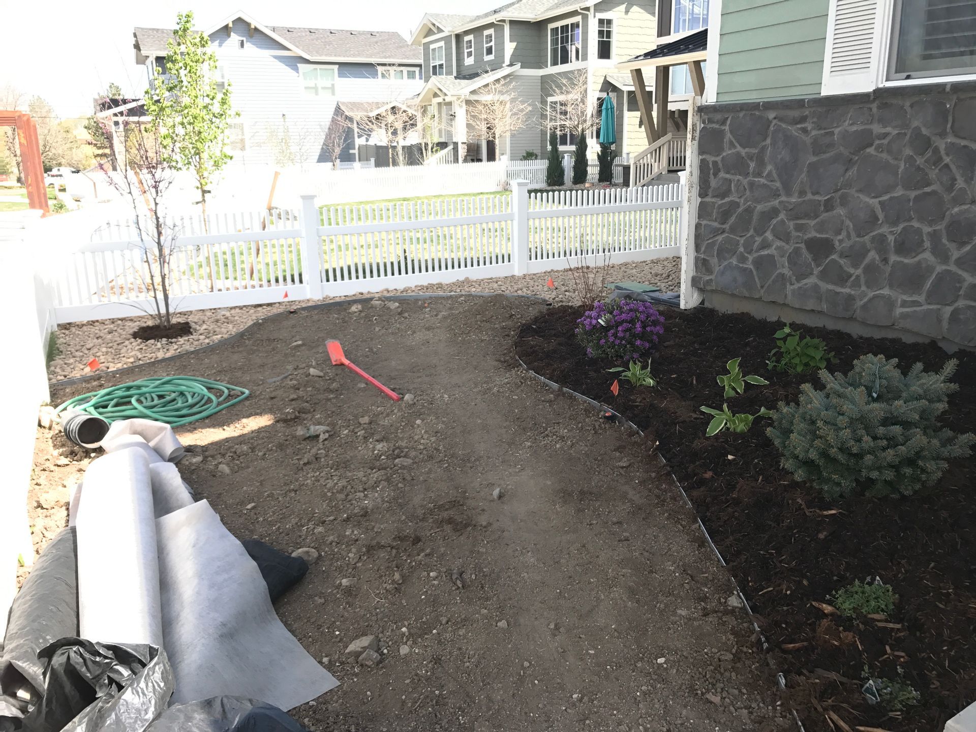Full landscape remodel with decorative rock, plantings, sprinklers and grass. Lafayette, CO 2019