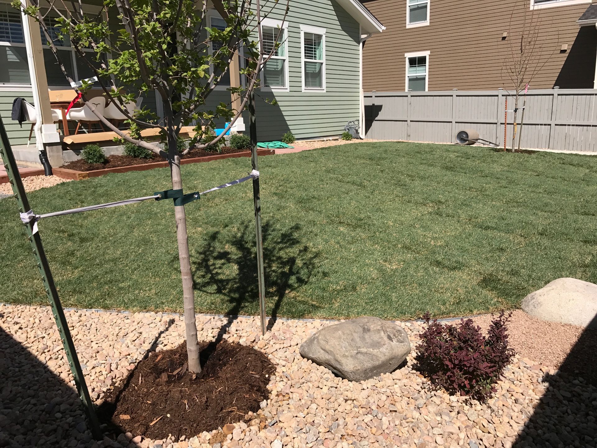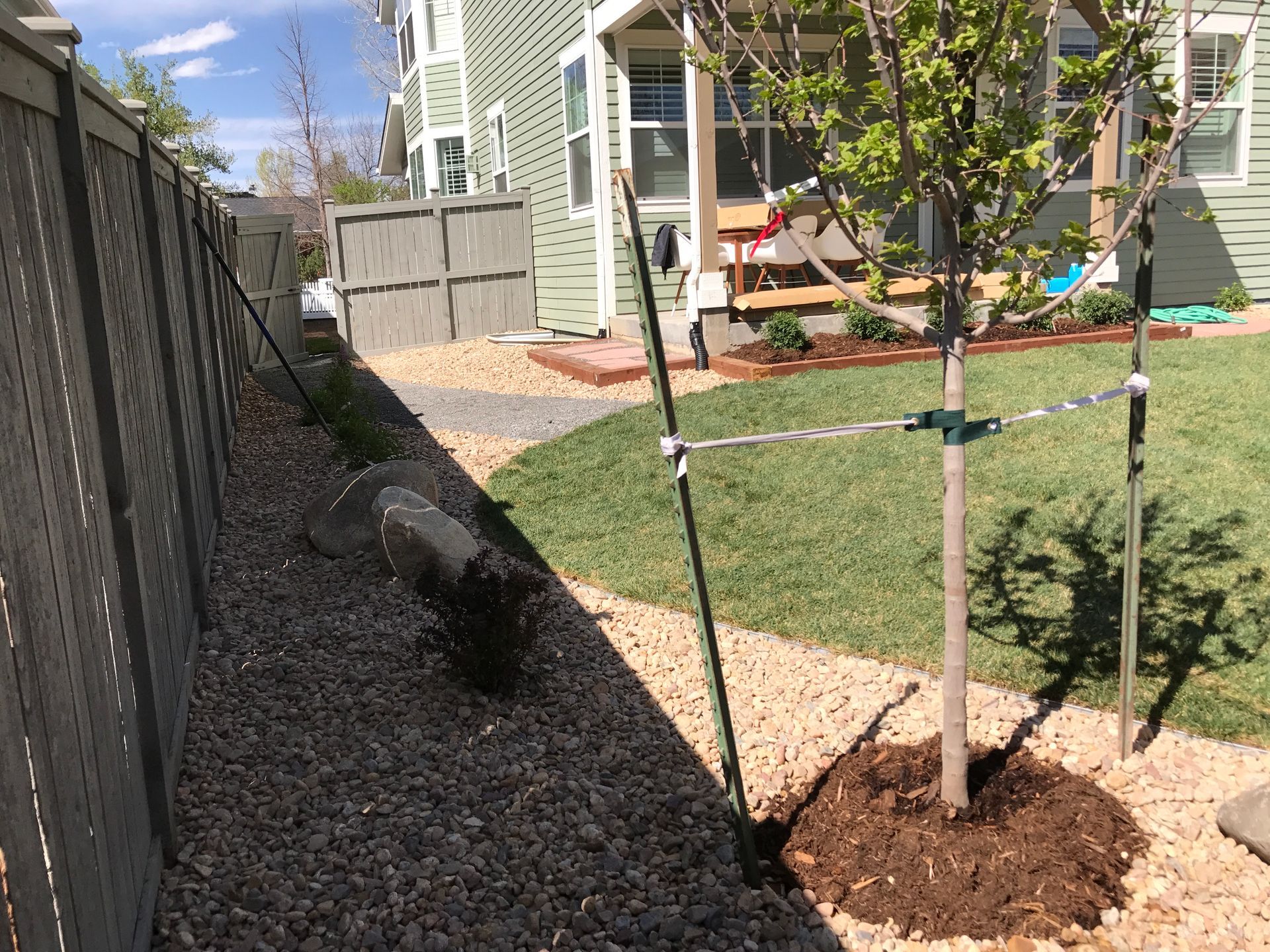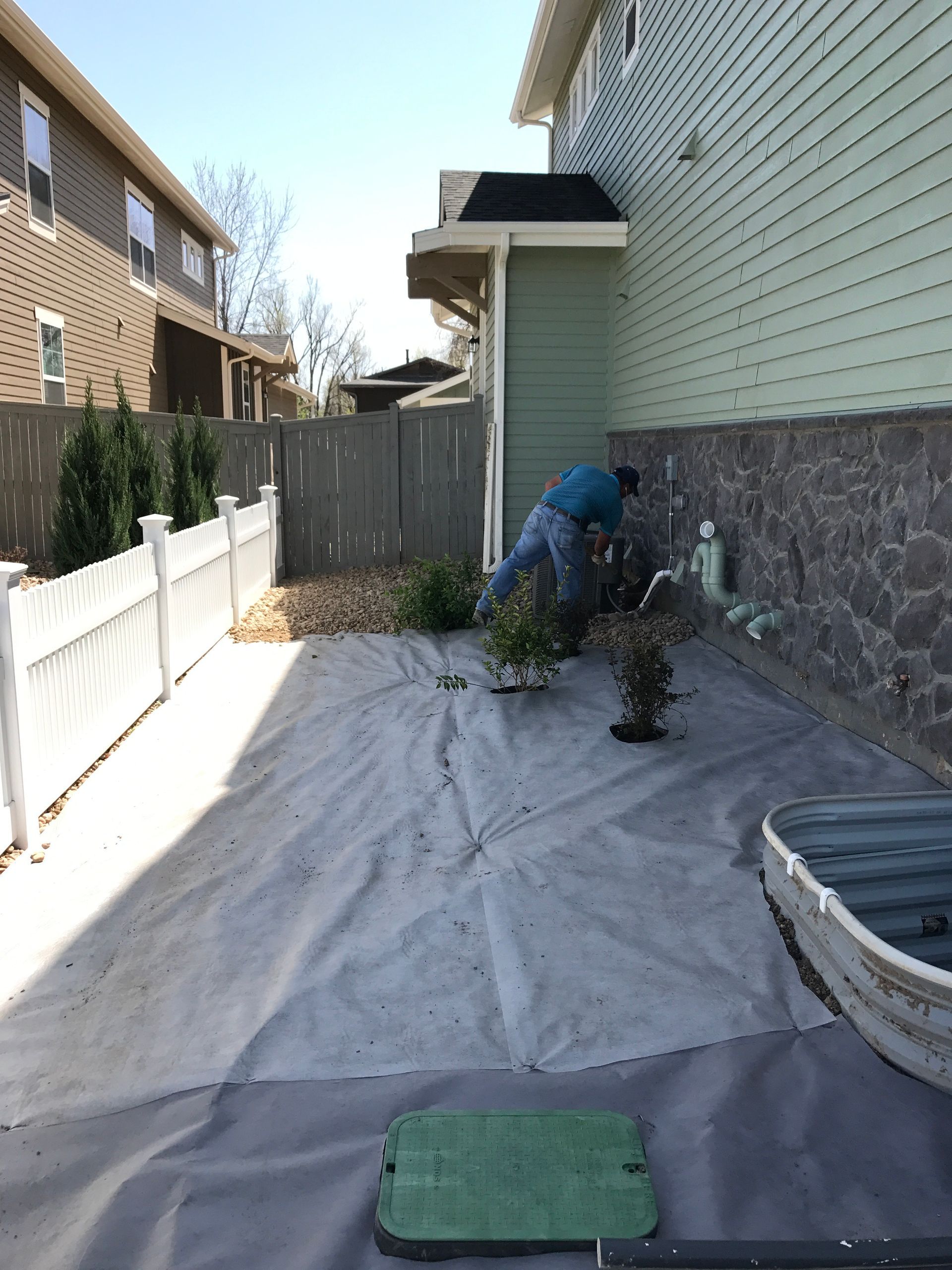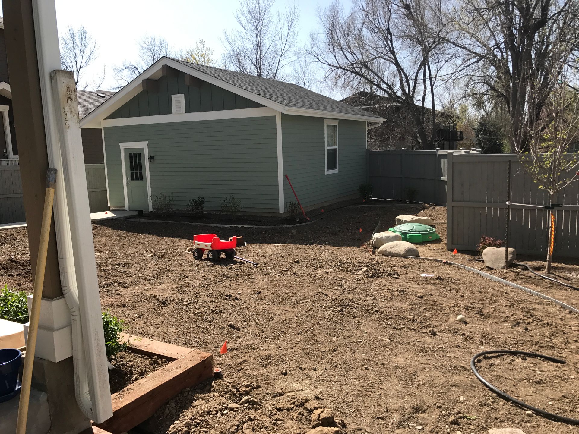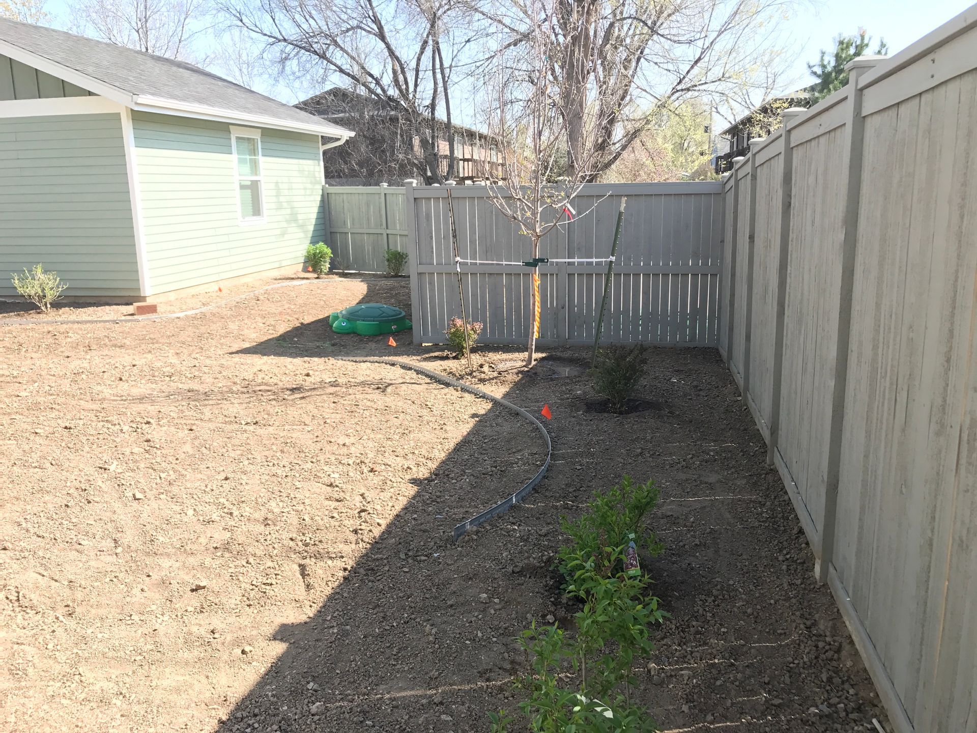 Full landscape remodel with decorative rock, plantings, sprinklers and grass. Lafayette, CO 2019