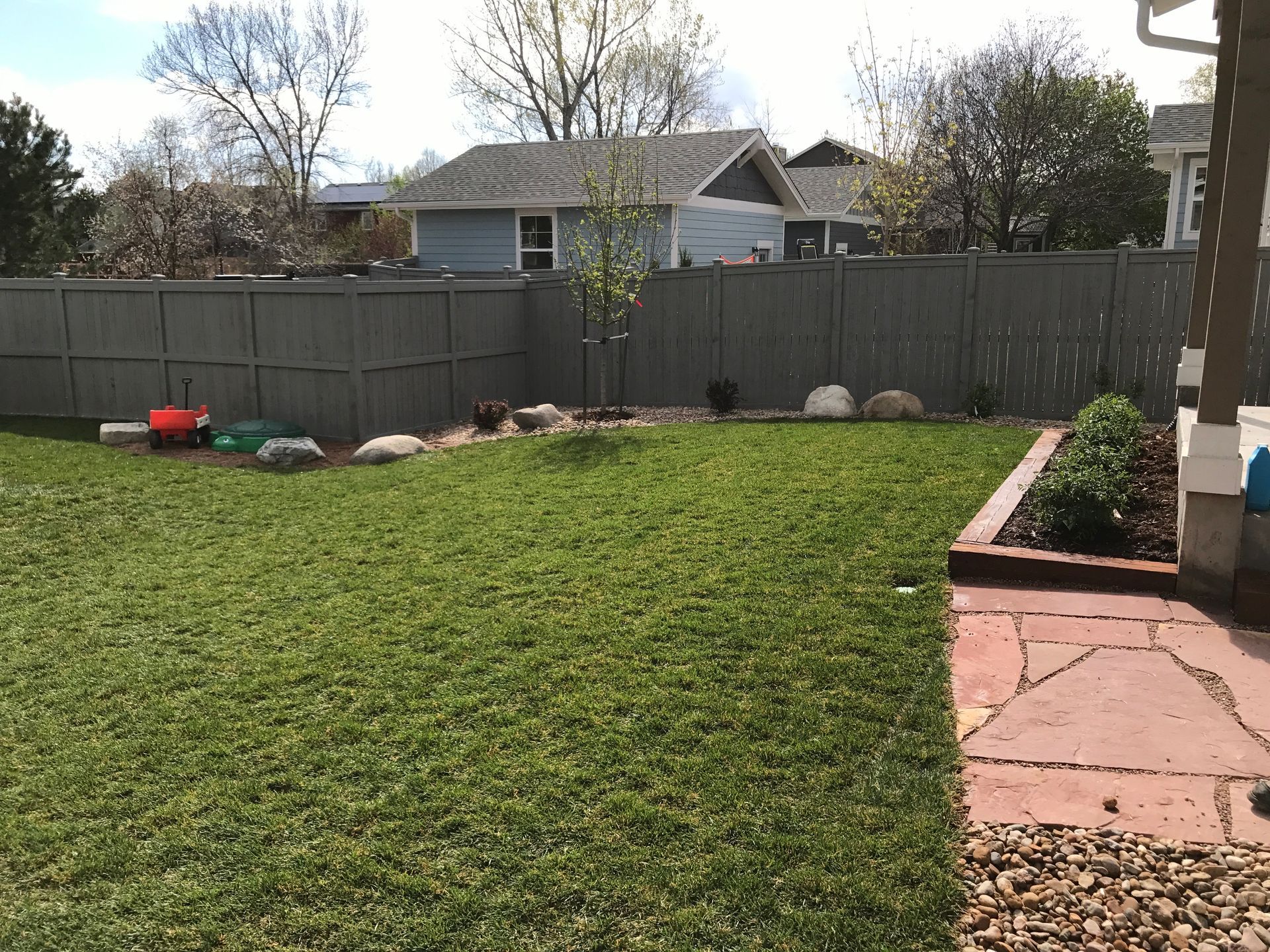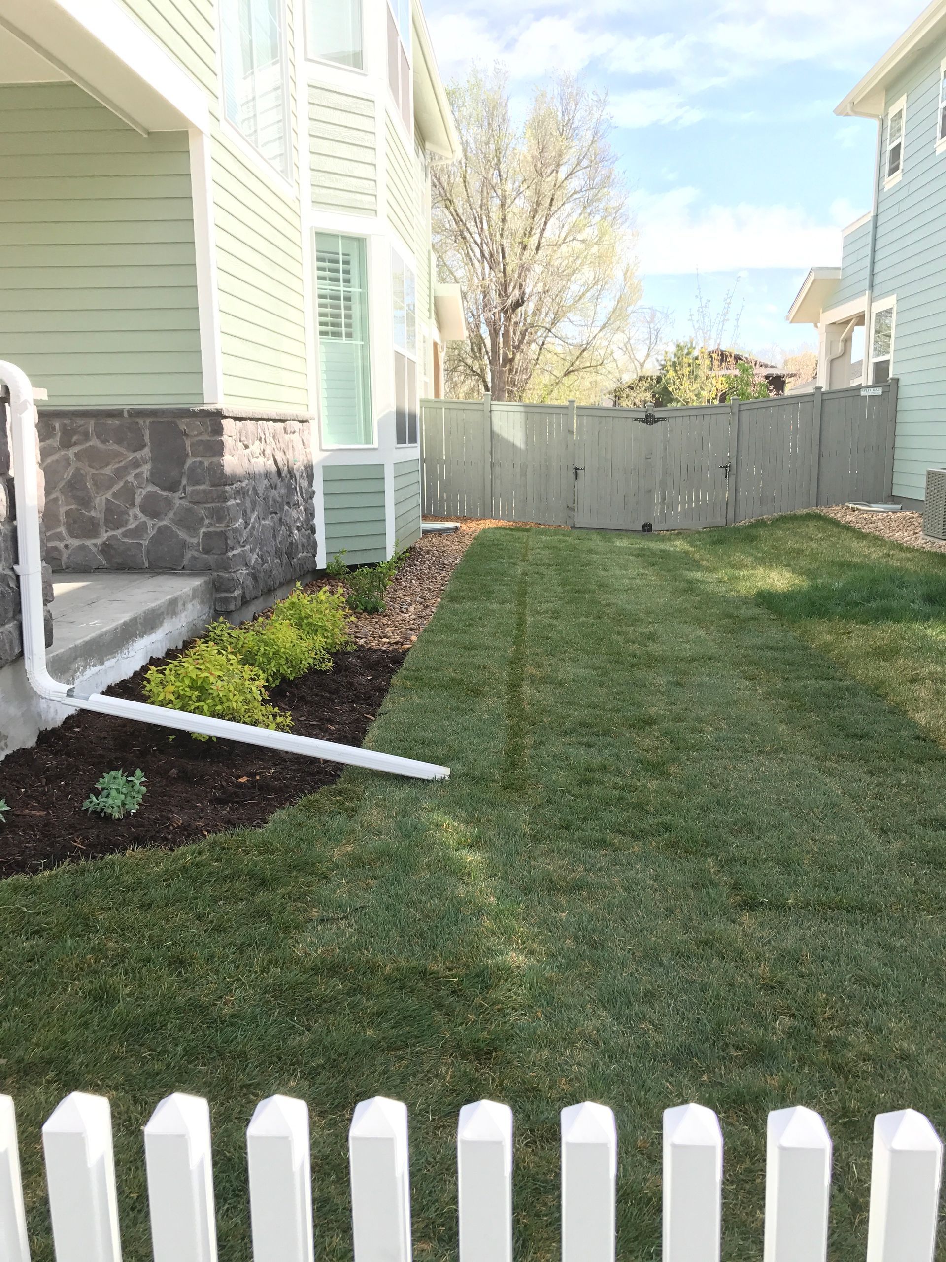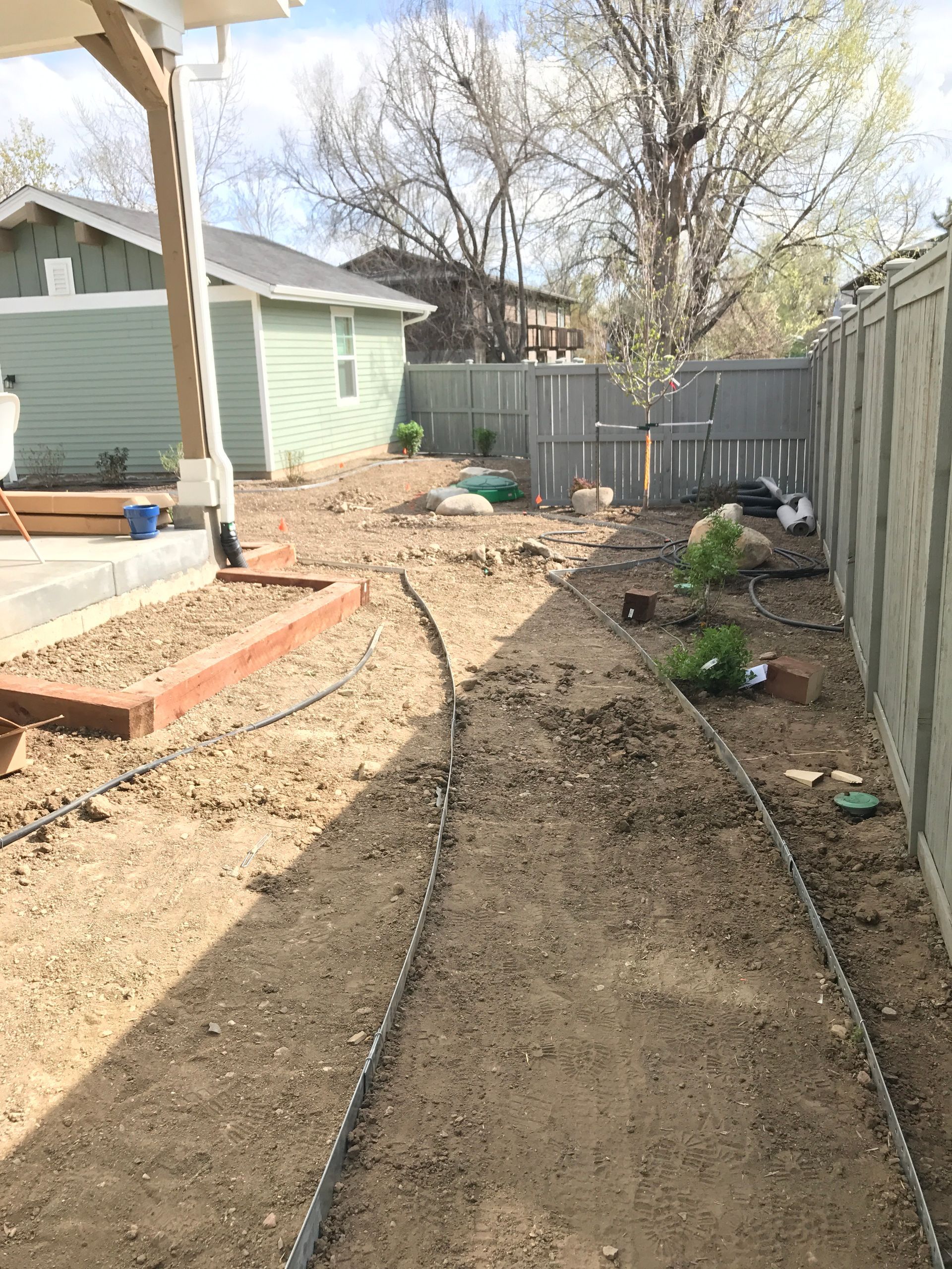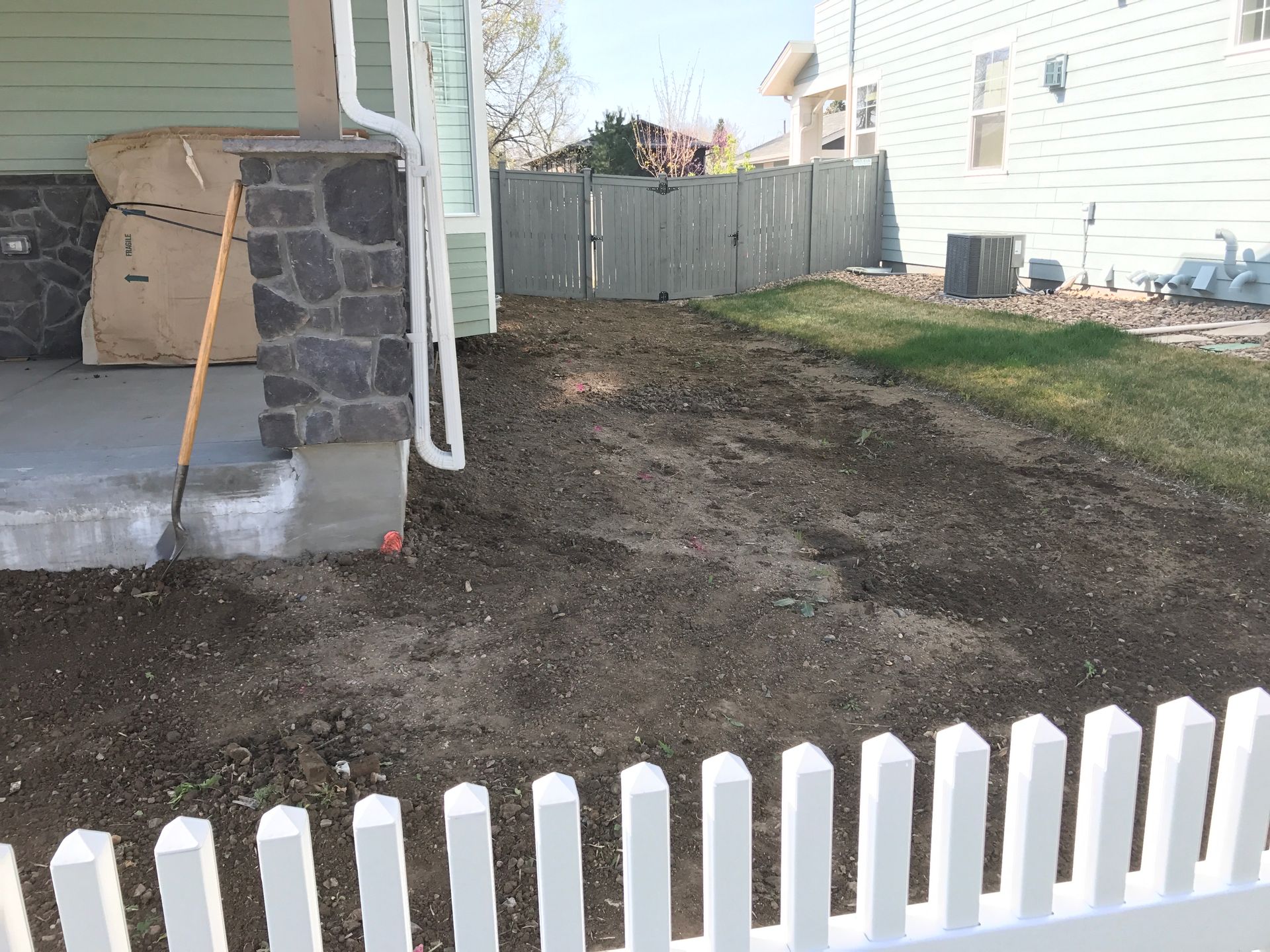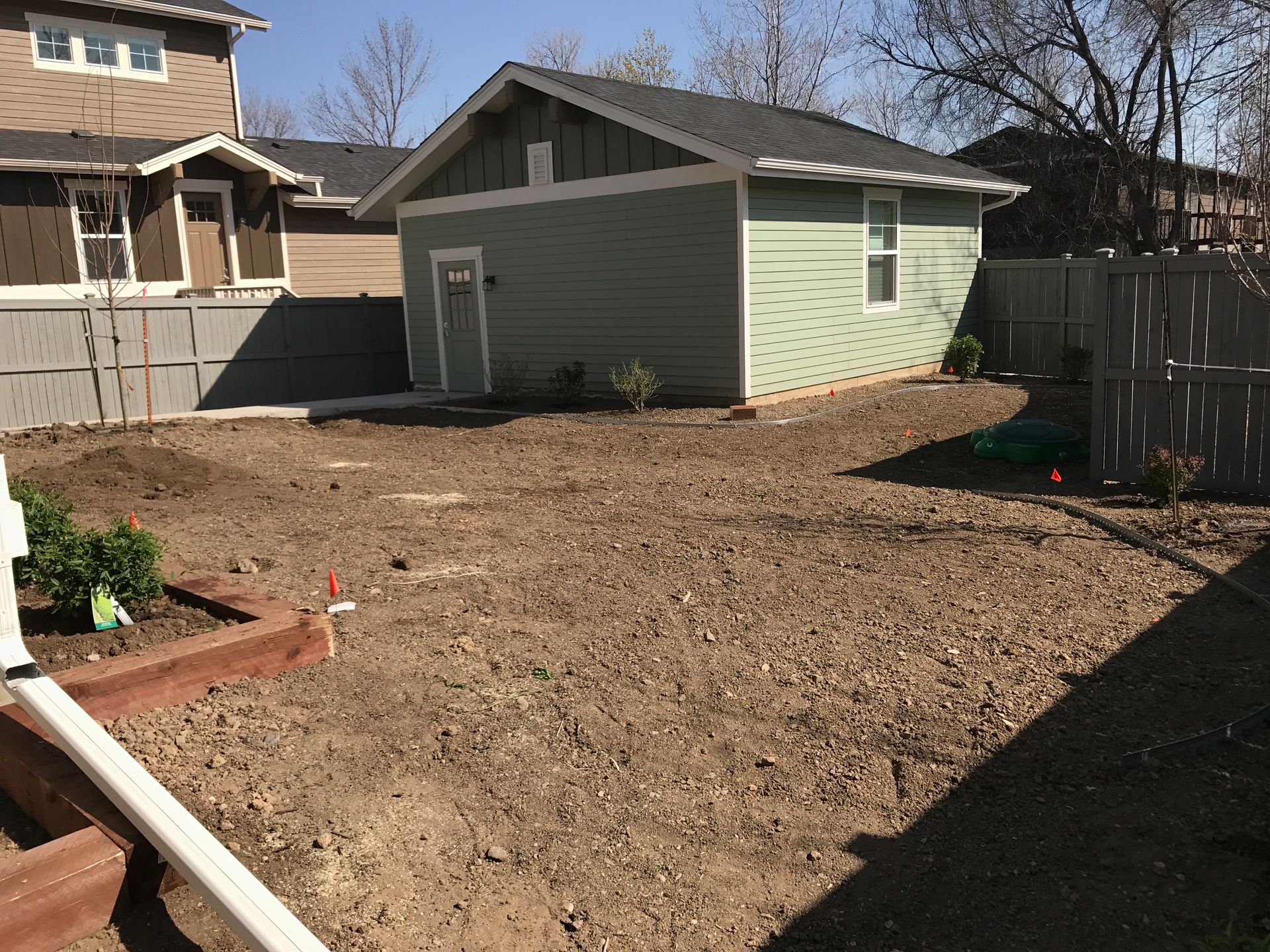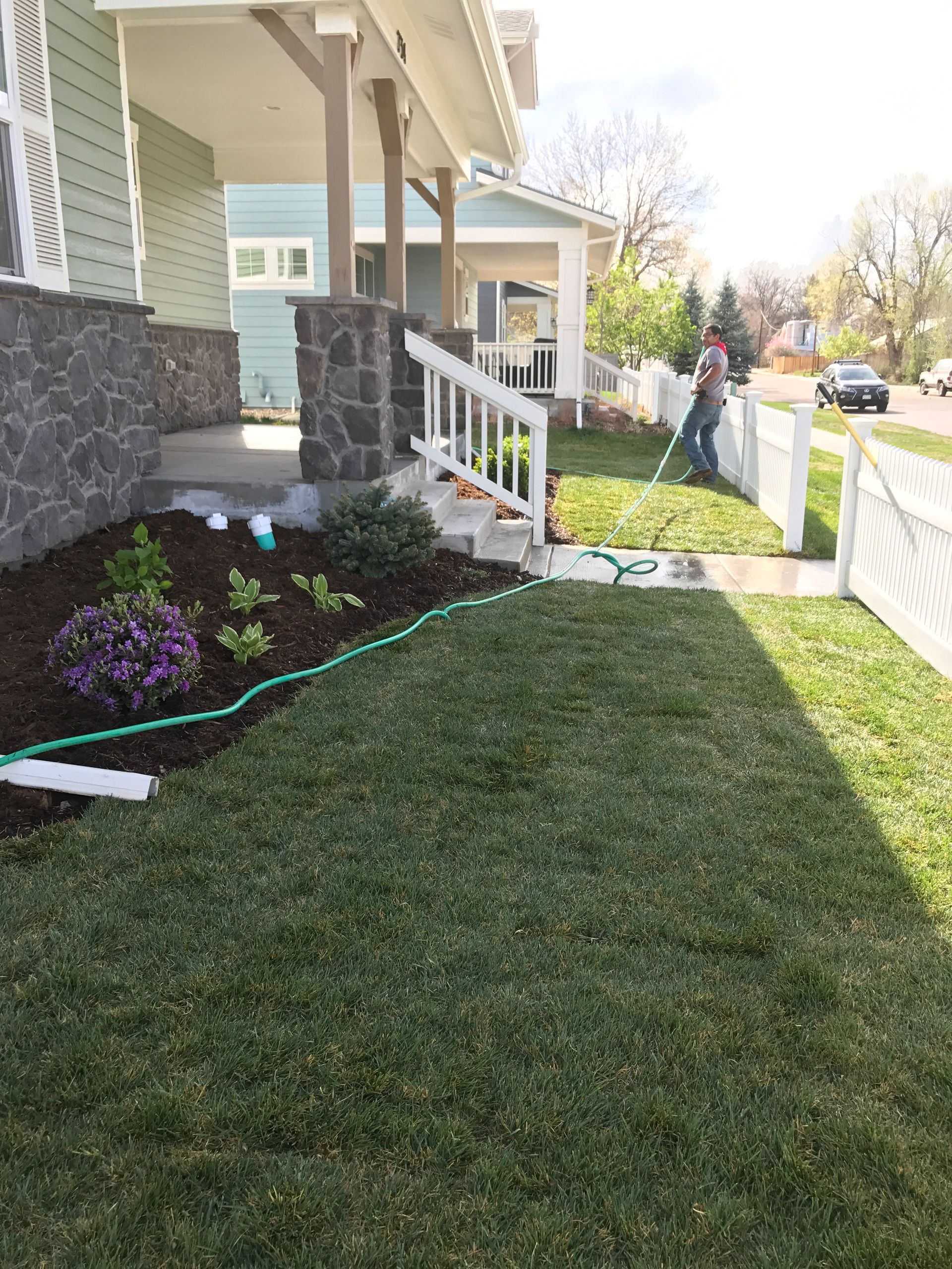 Full landscape remodel with decorative rock, plantings, sprinklers and grass. Lafayette, CO 2019