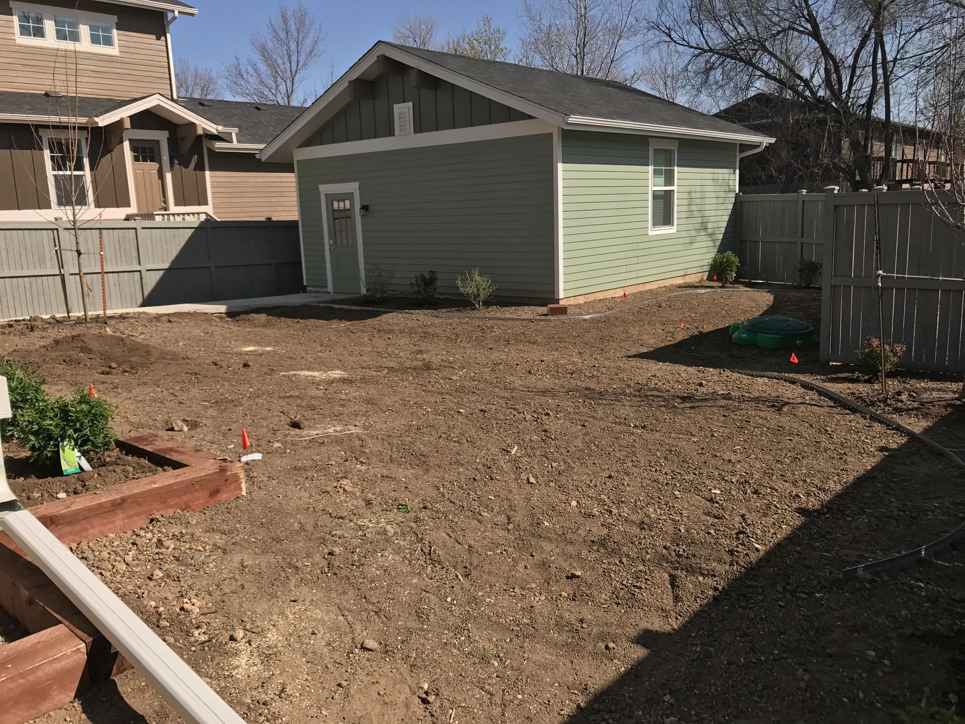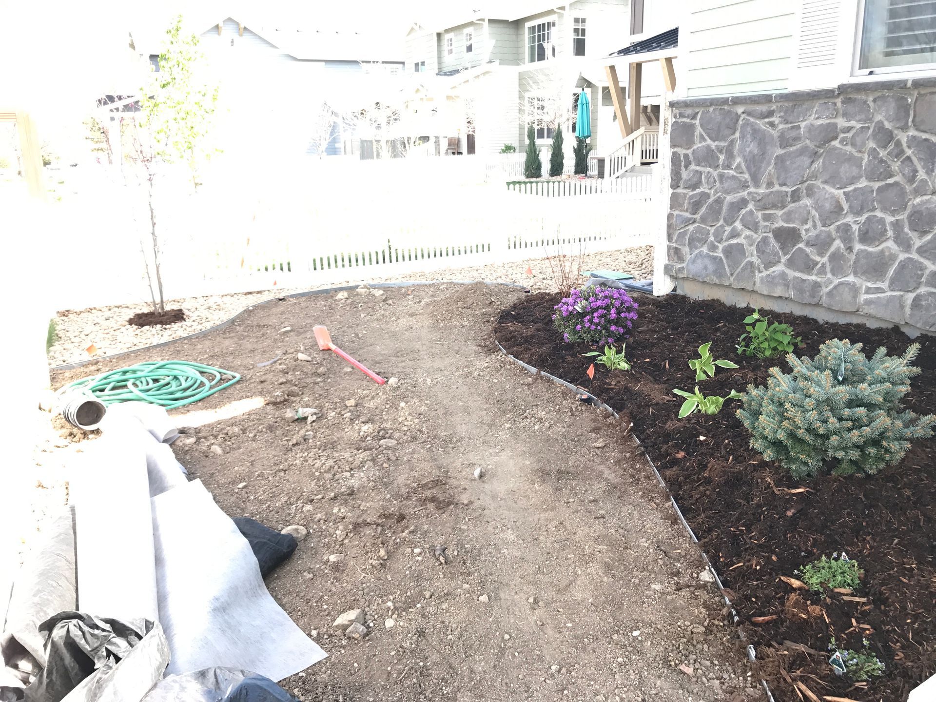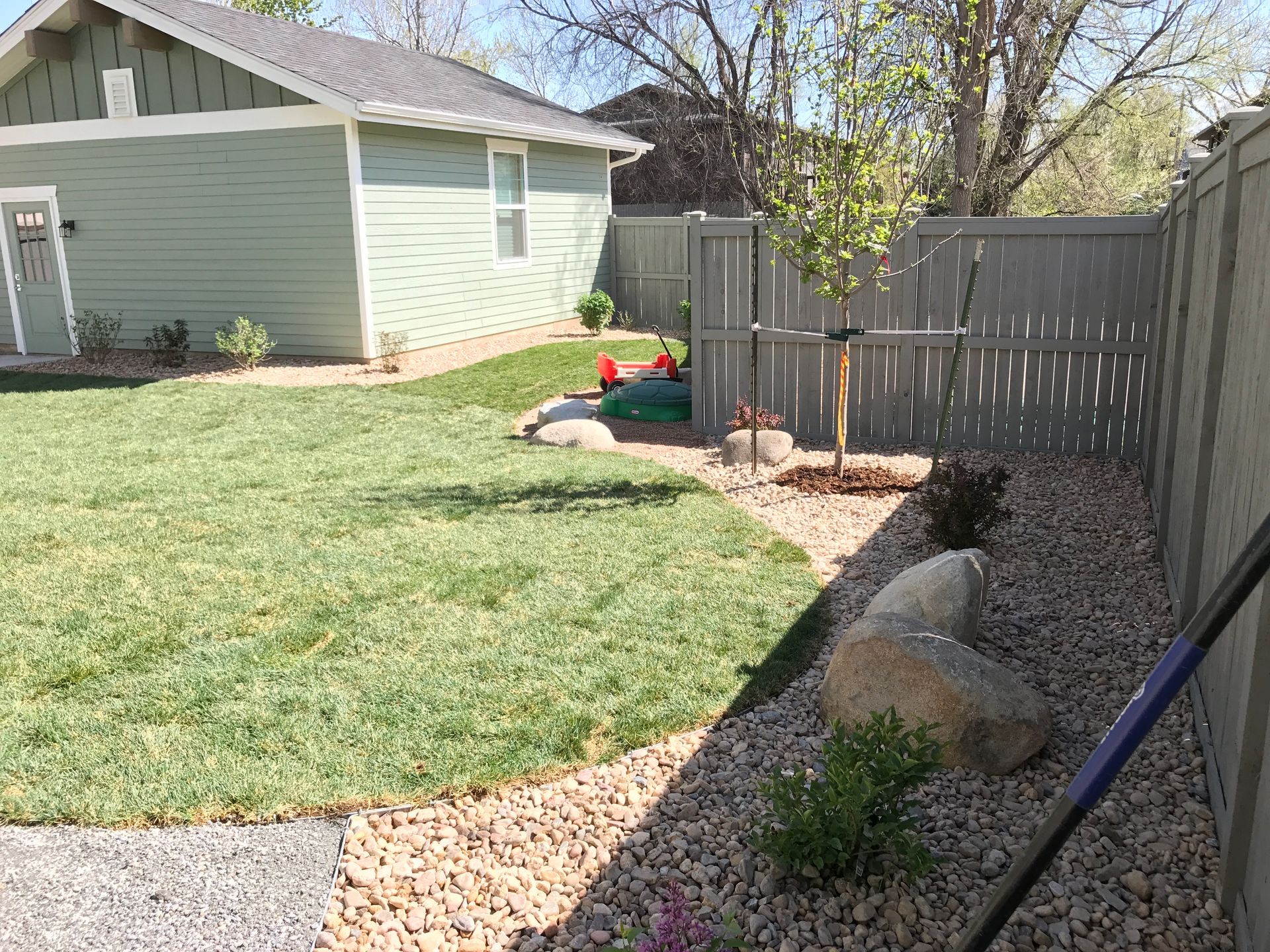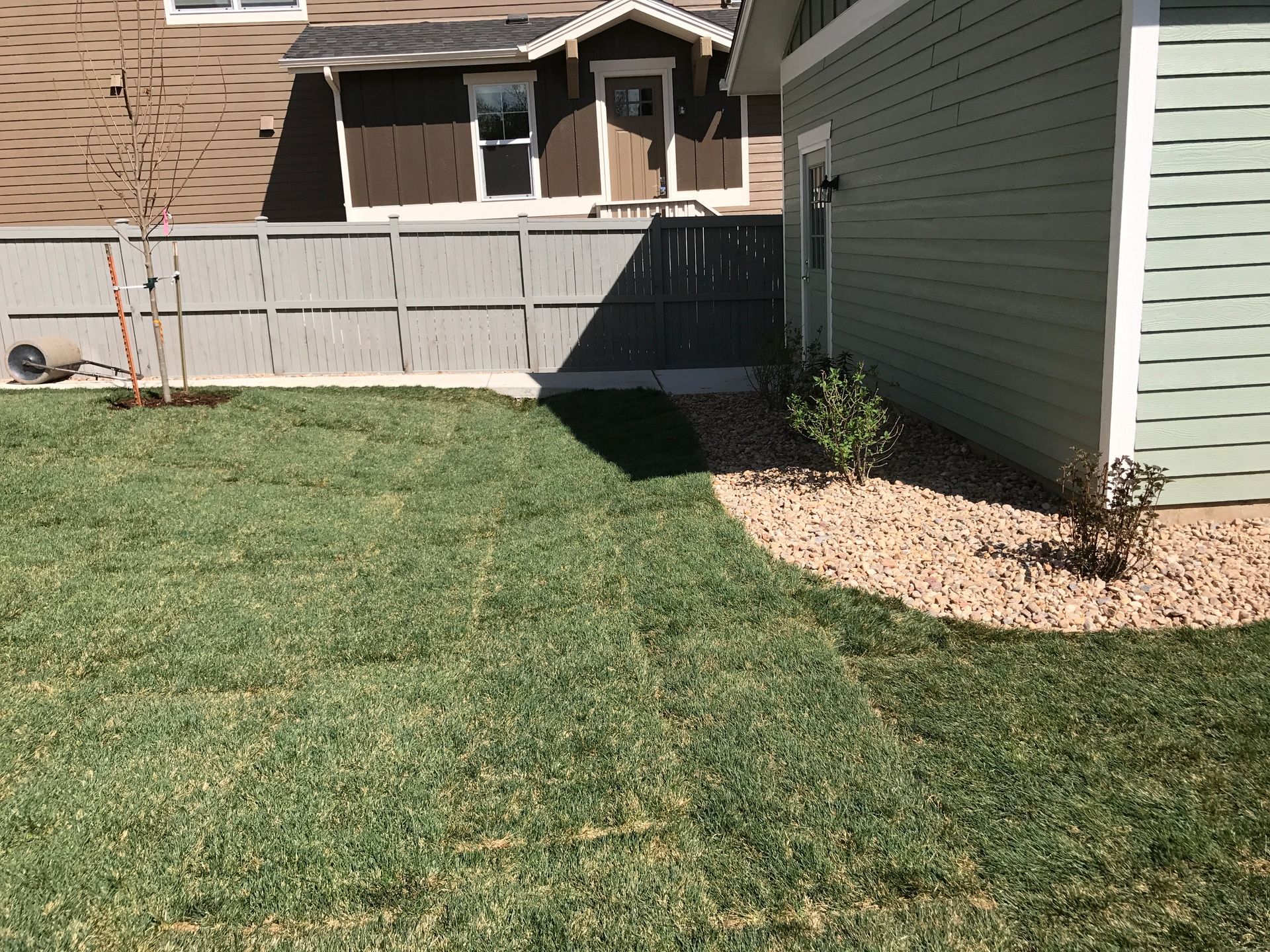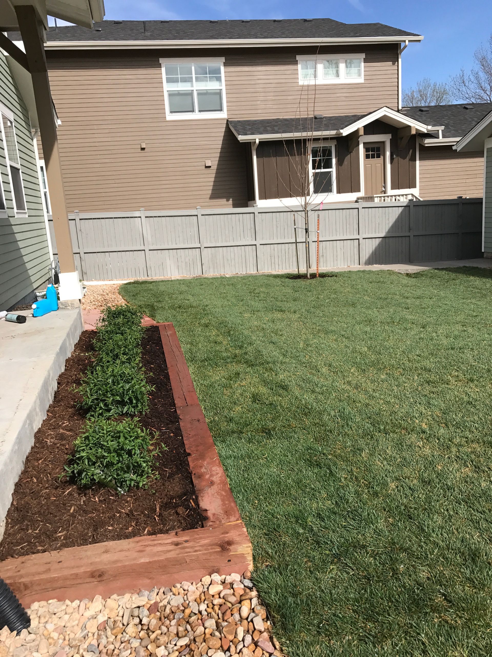 Full landscape remodel with decorative rock, plantings, sprinklers and grass. Lafayette, CO 2019