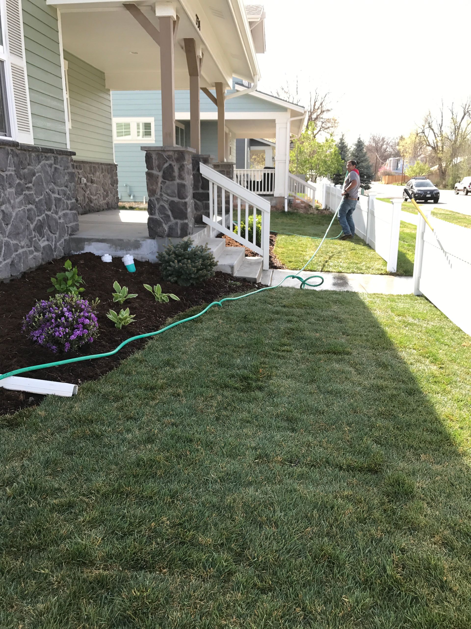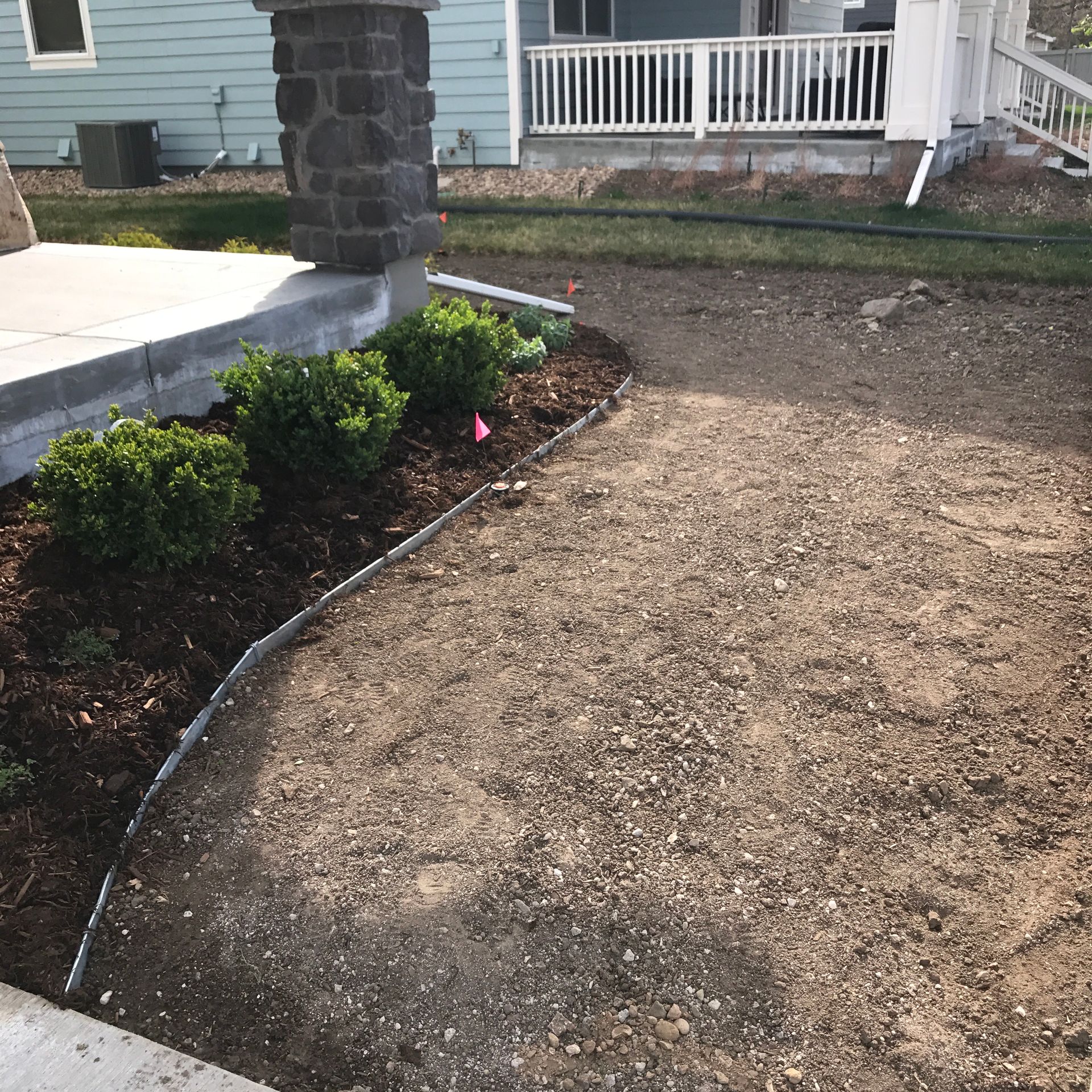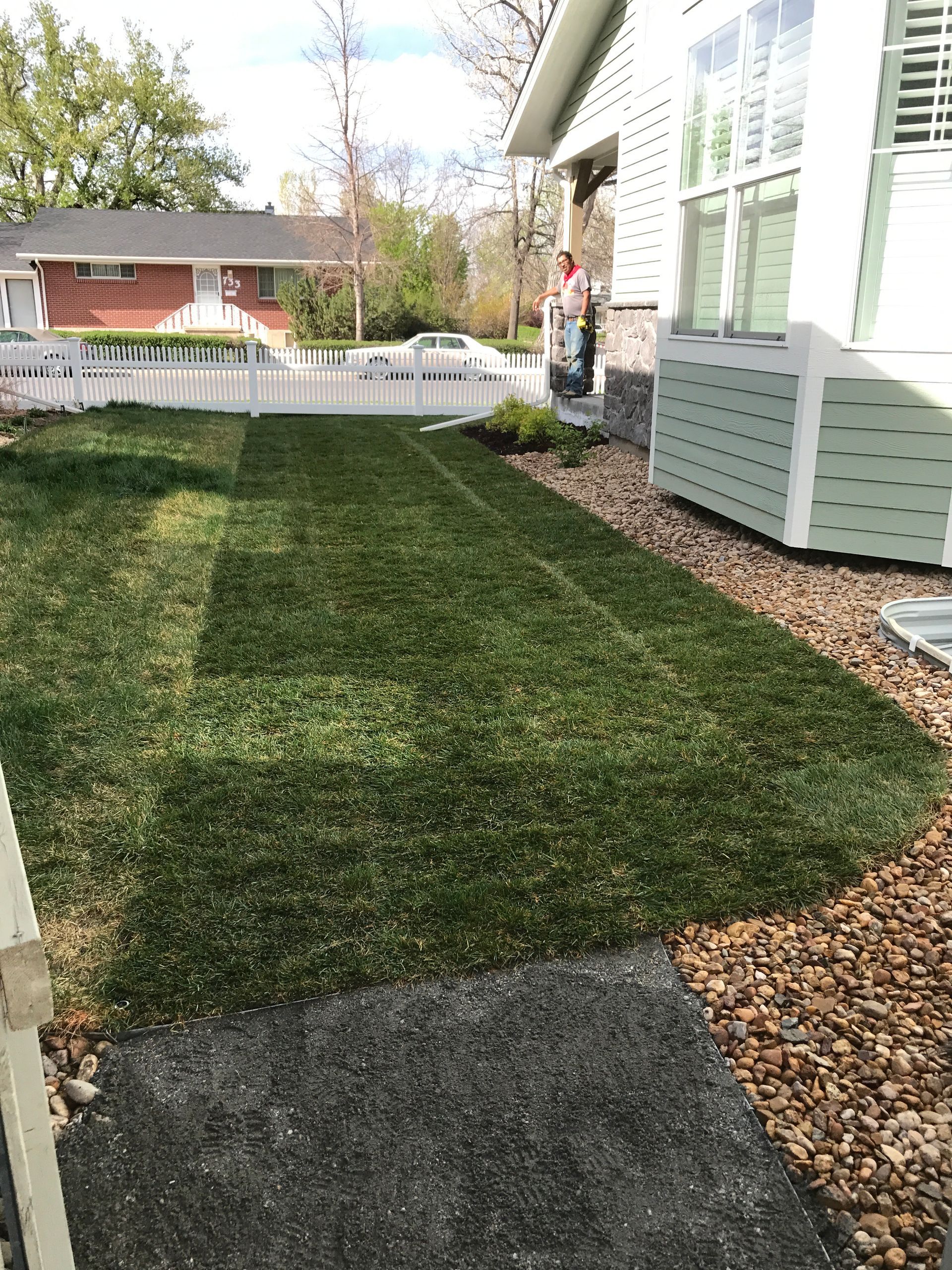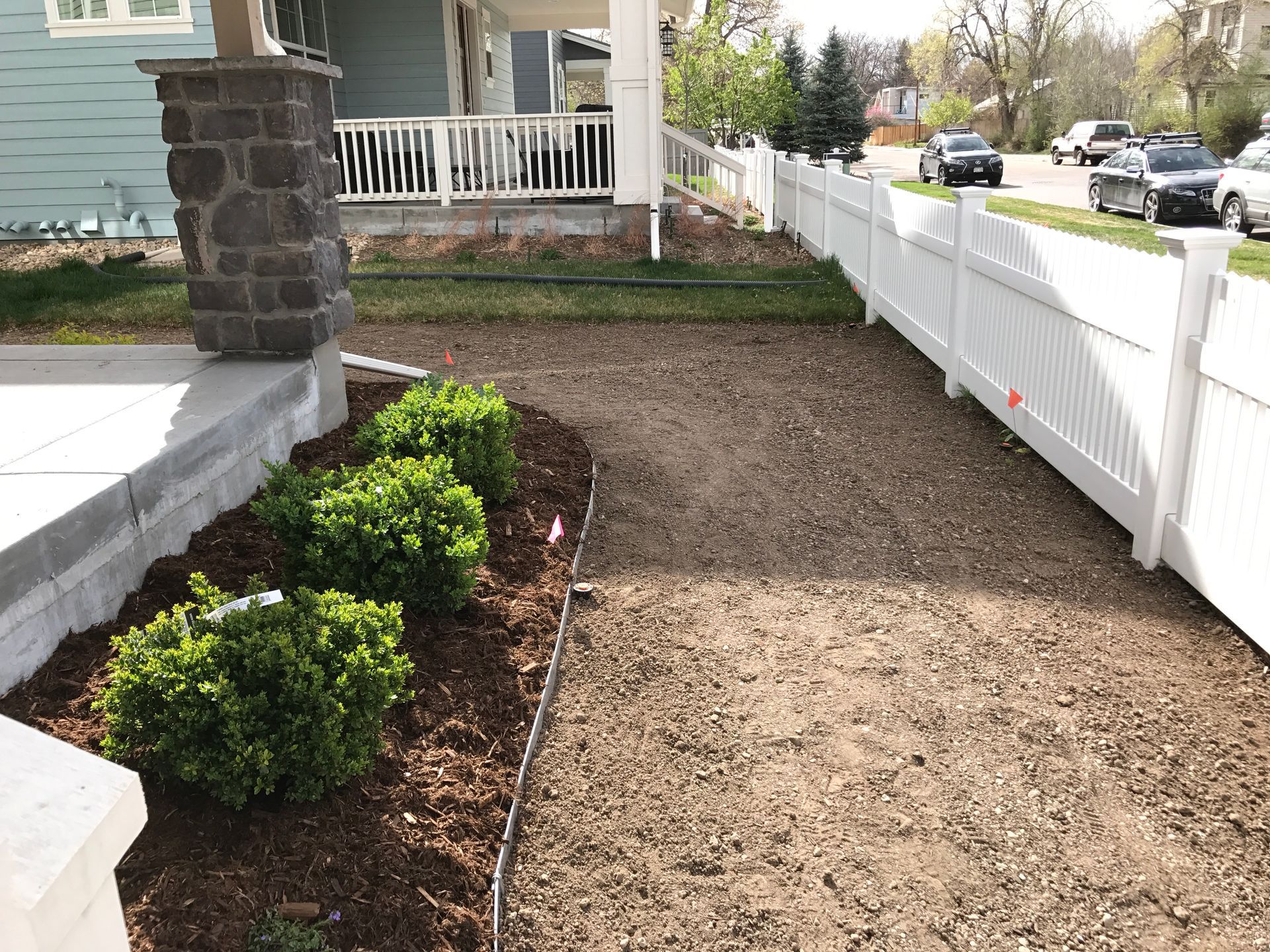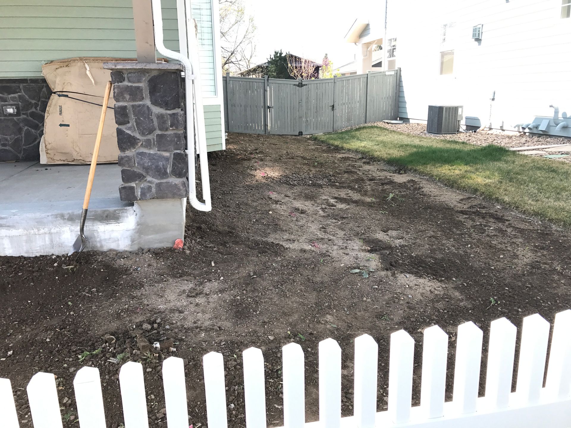 Full landscape remodel with decorative rock, plantings, sprinklers and grass. Lafayette, CO 2019