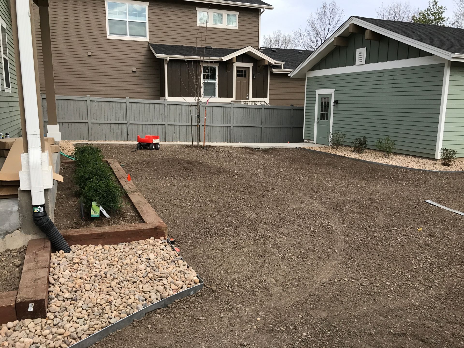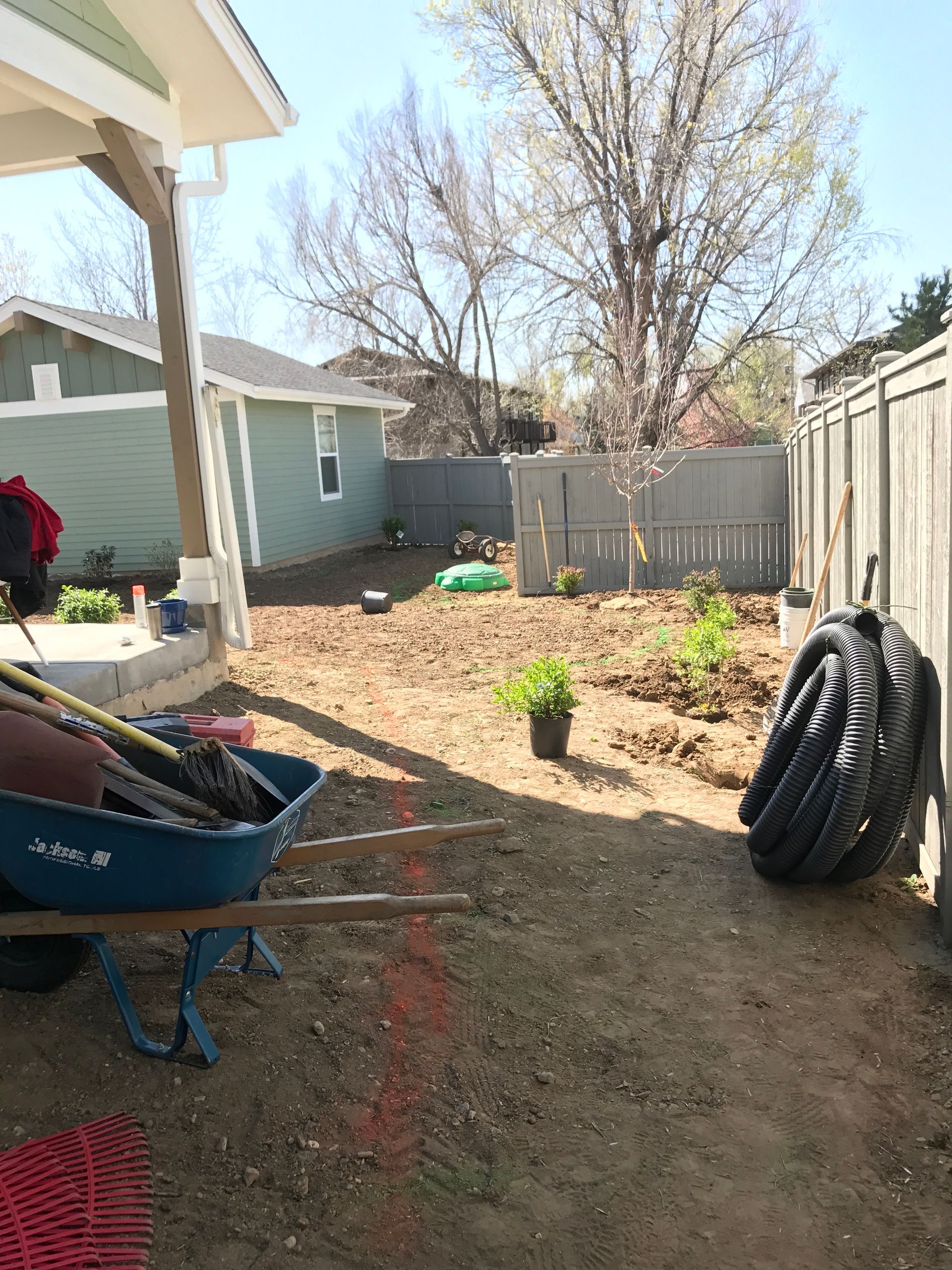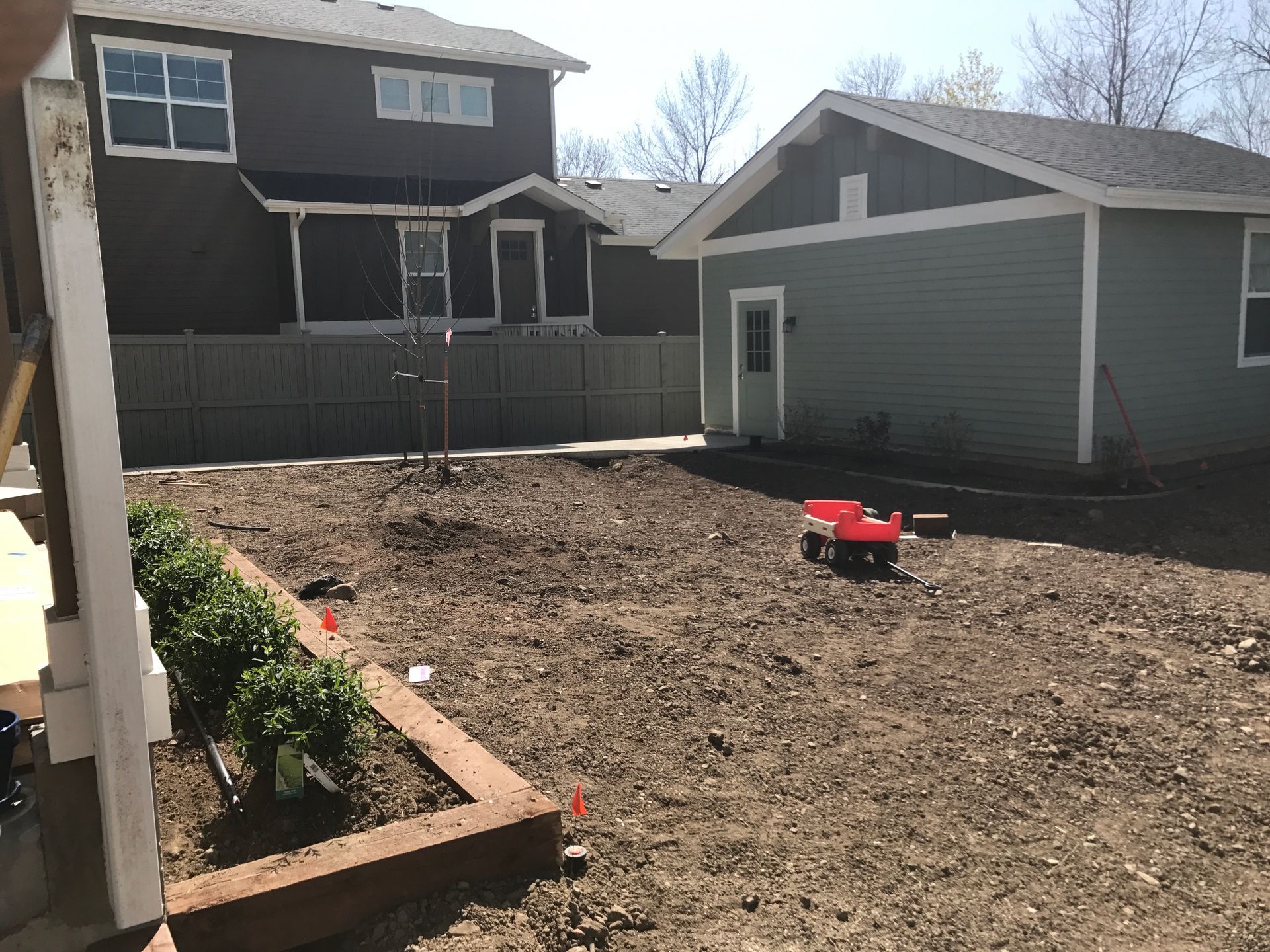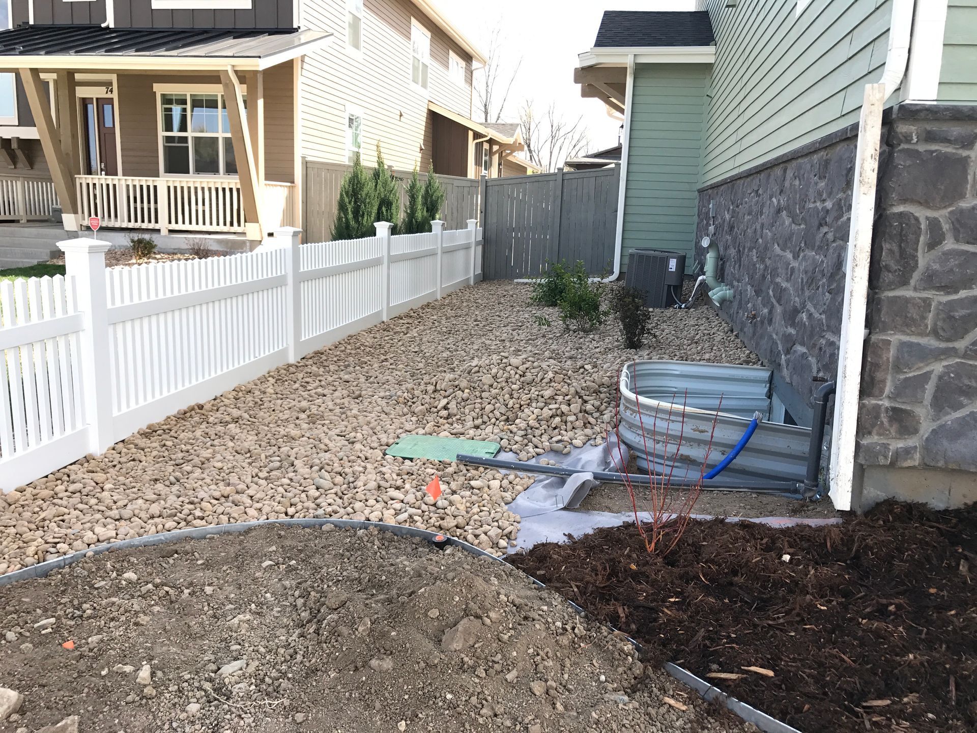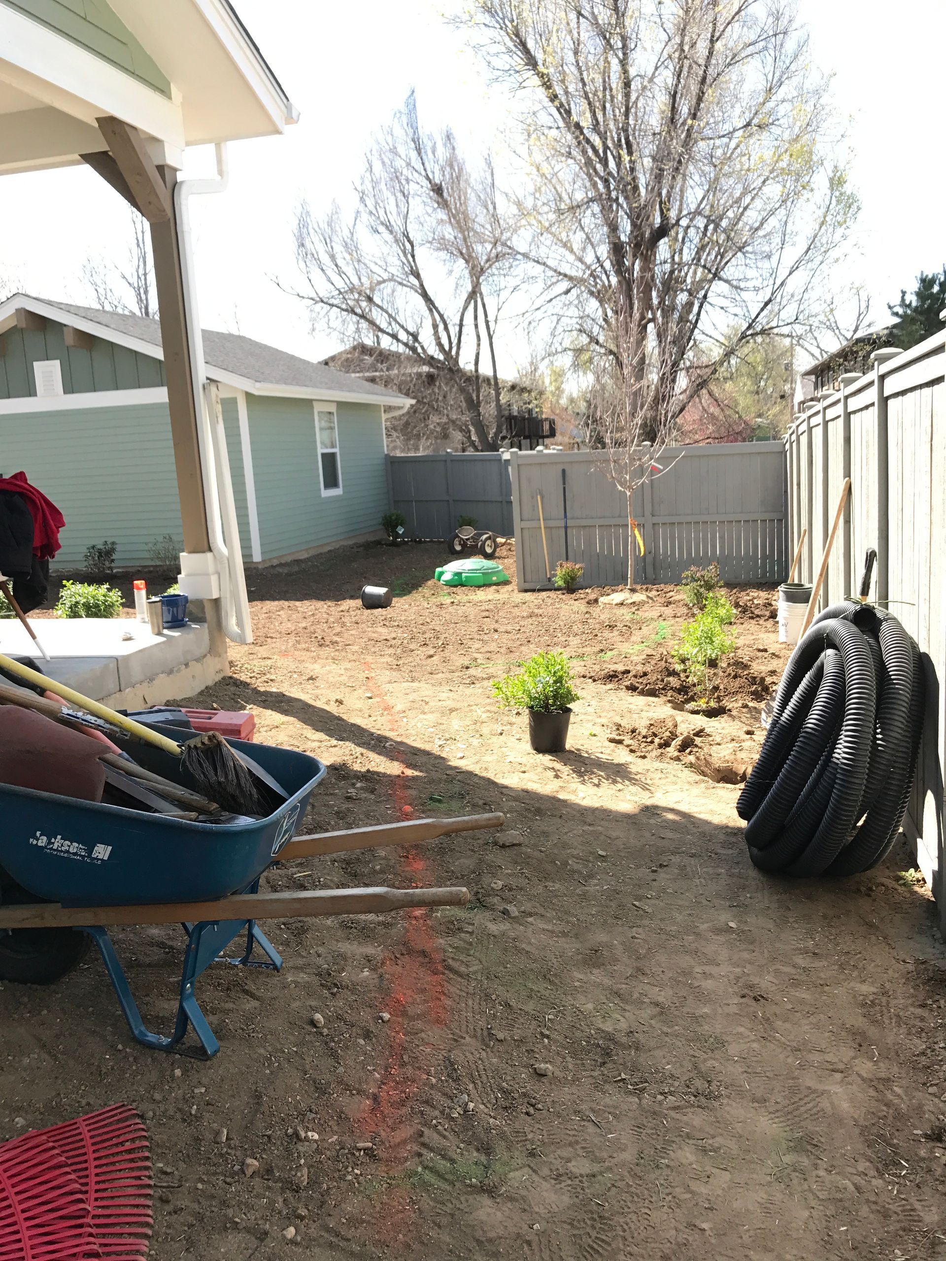 Full landscape remodel with decorative rock, plantings, sprinklers and grass. Lafayette, CO 2019