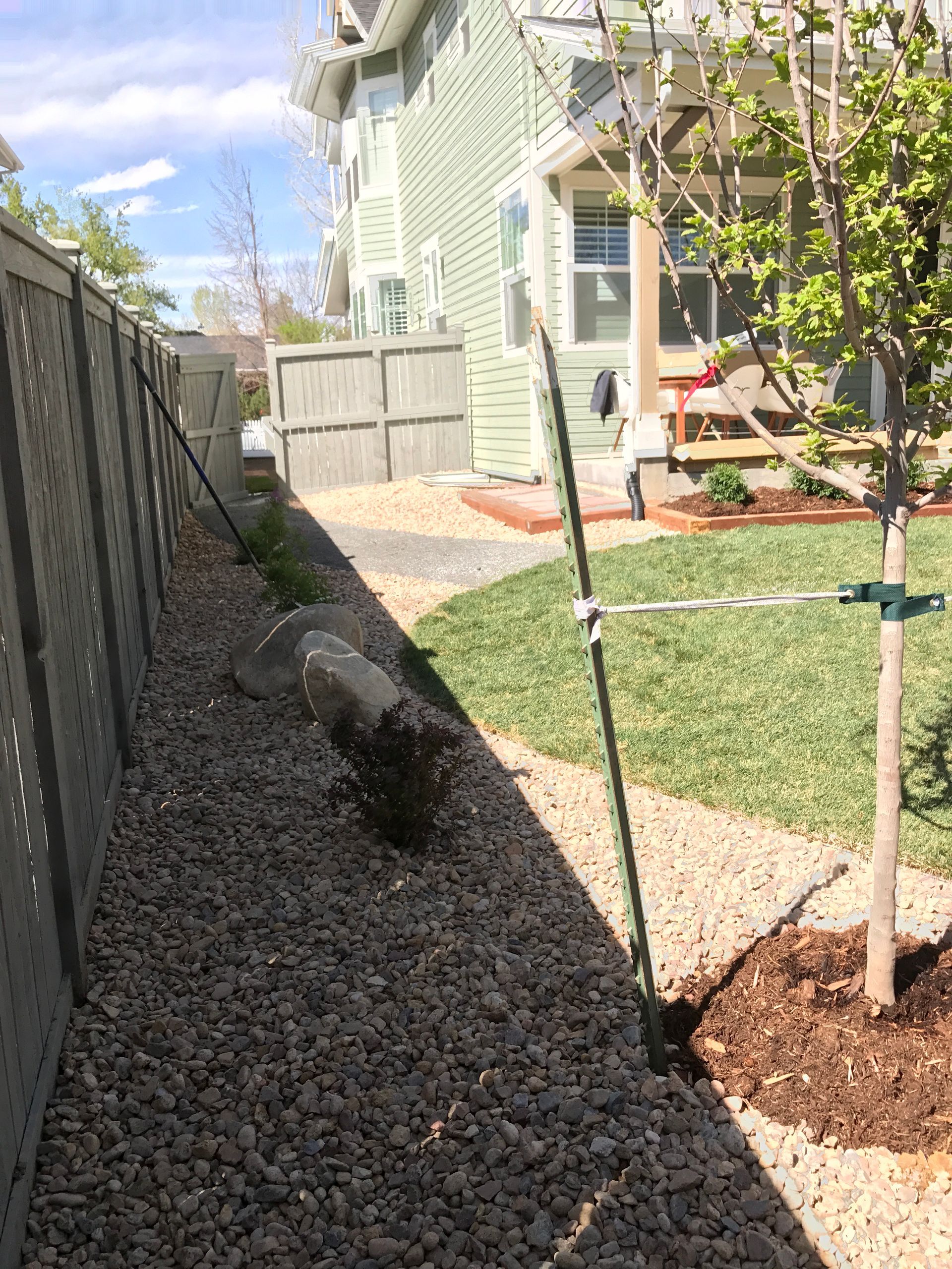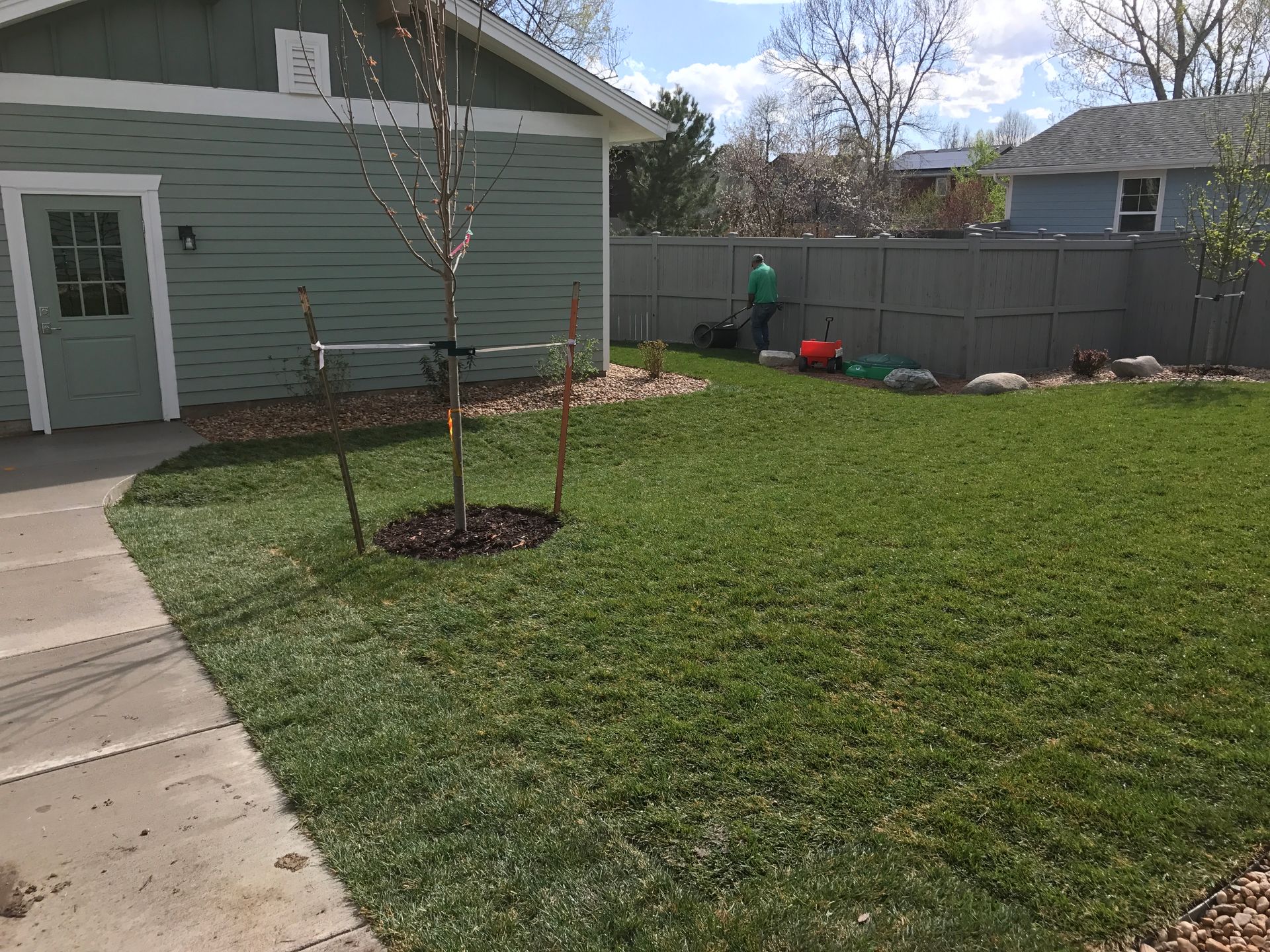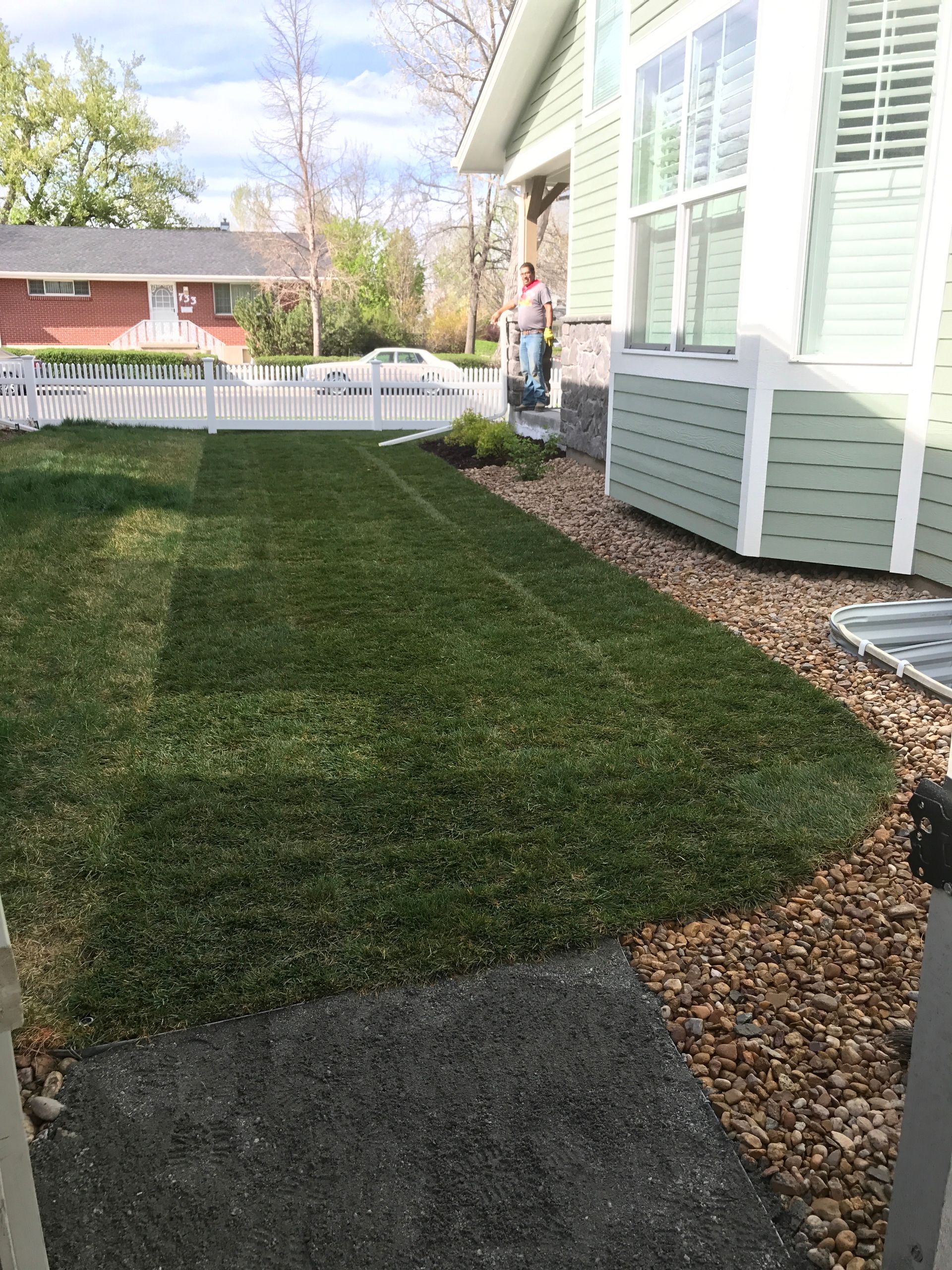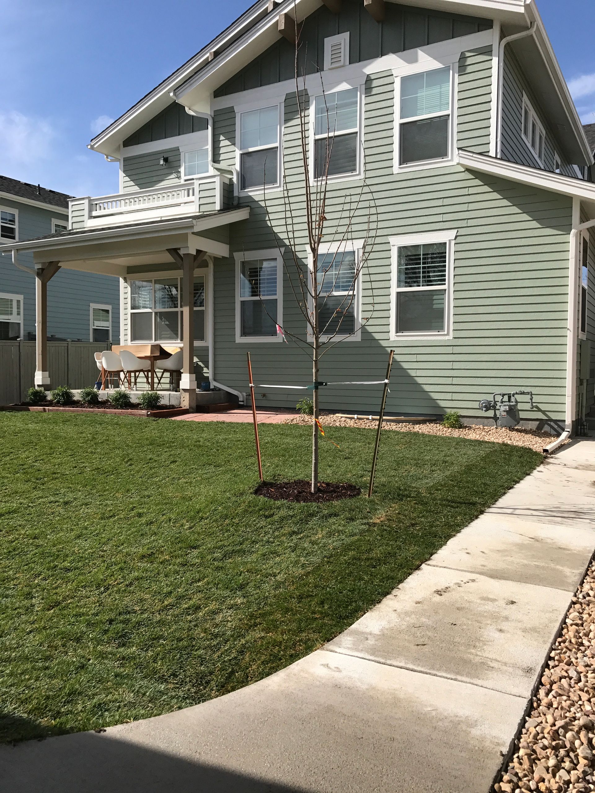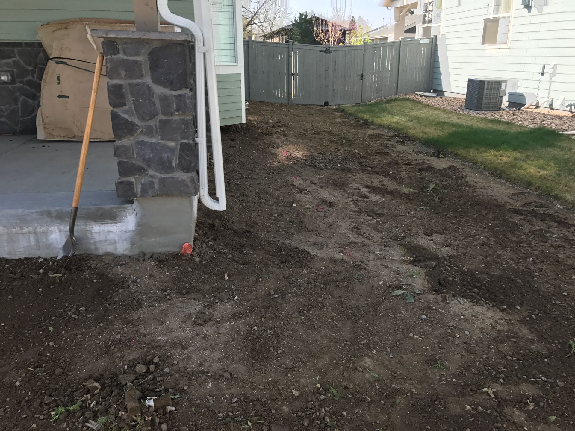 Full landscape remodel with decorative rock, plantings, sprinklers and grass. Lafayette, CO 2019