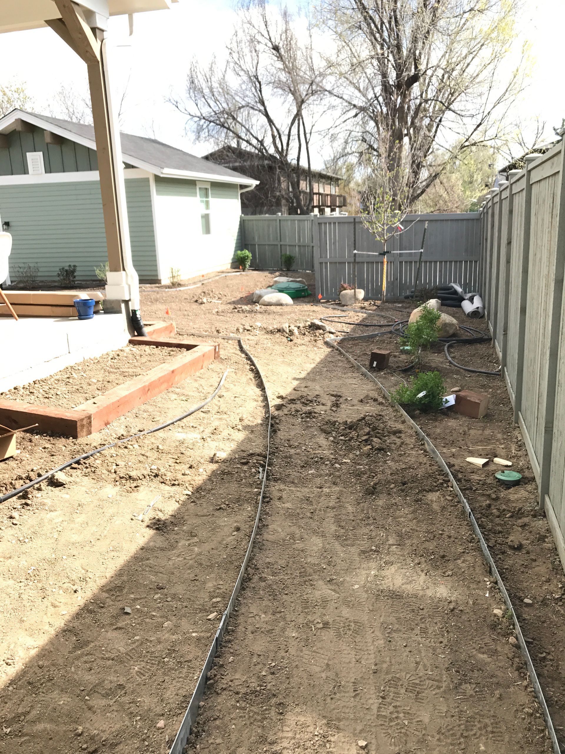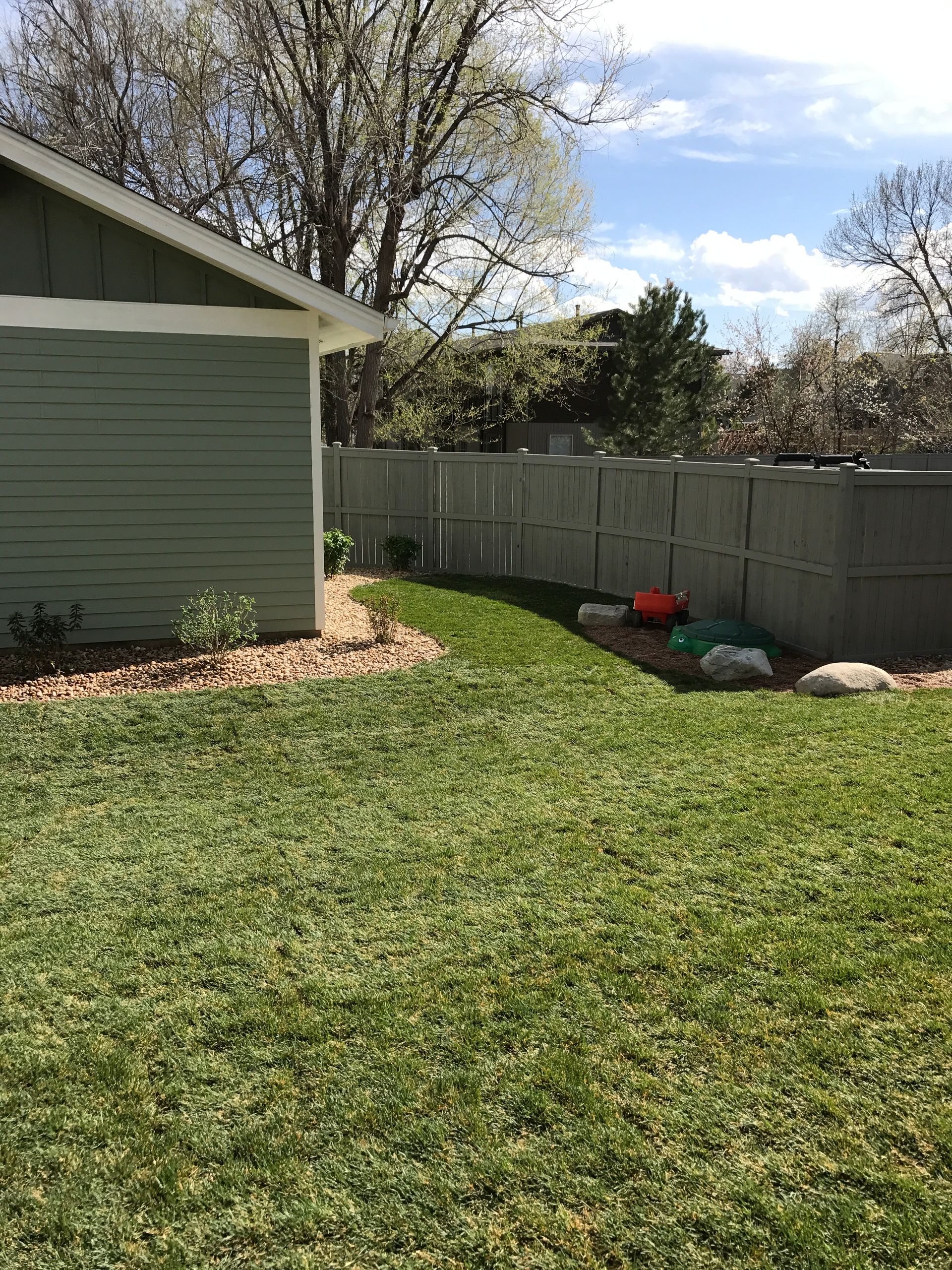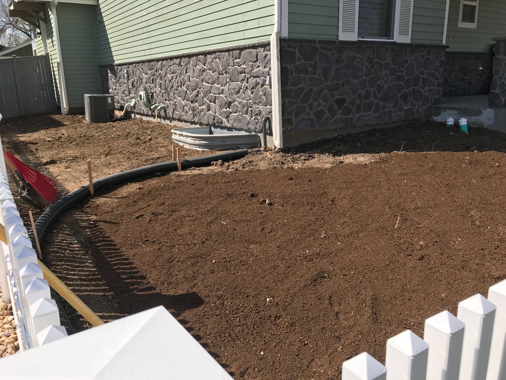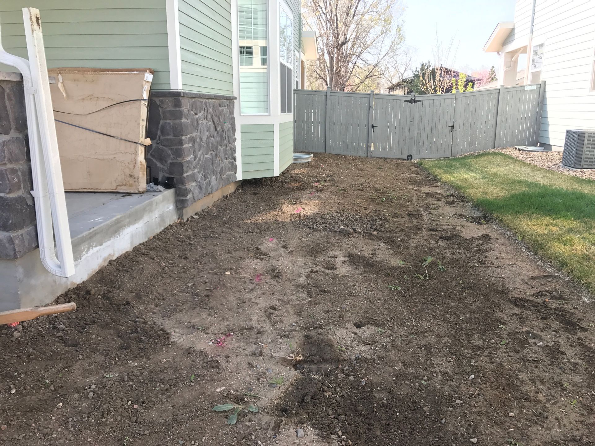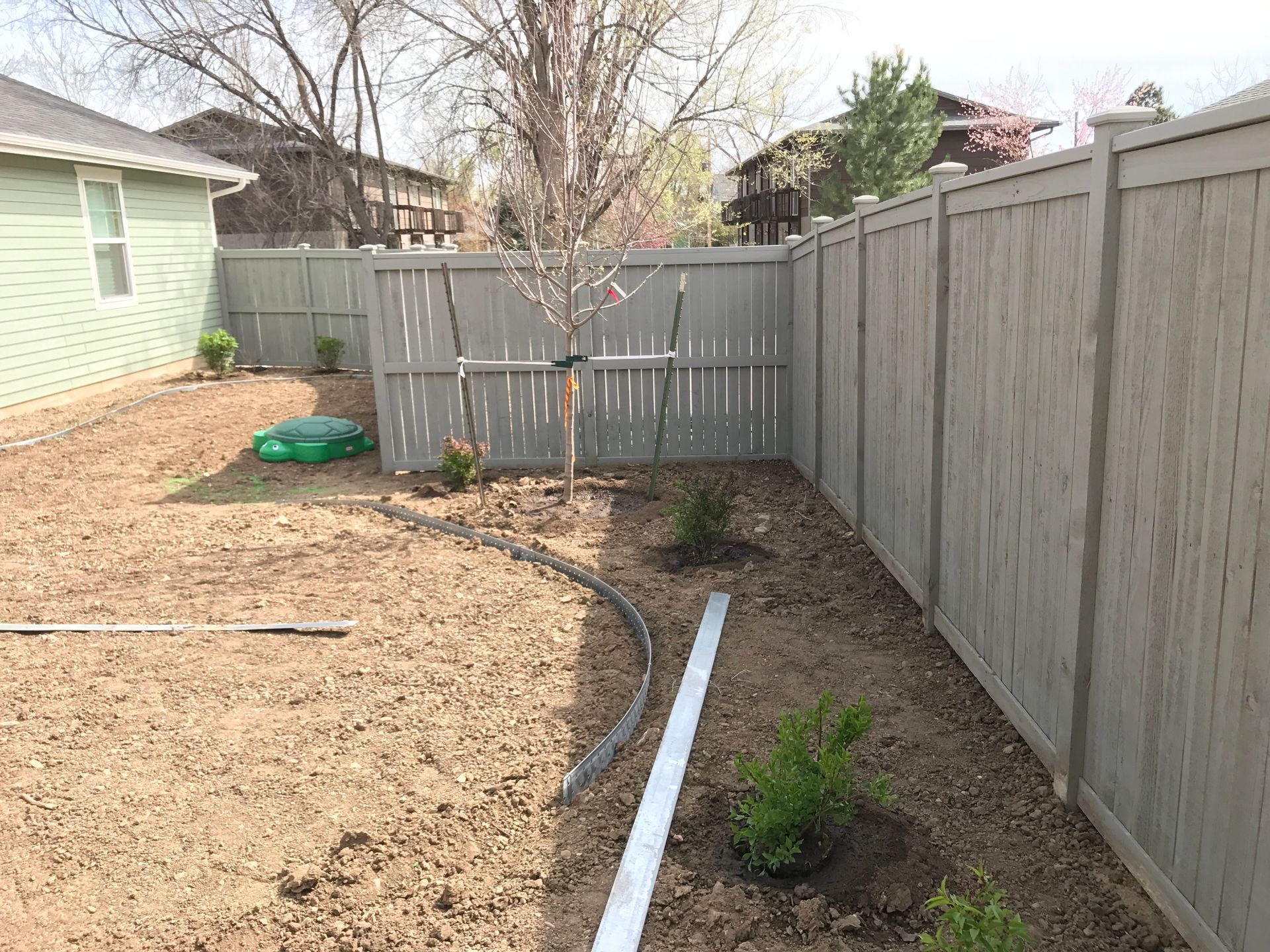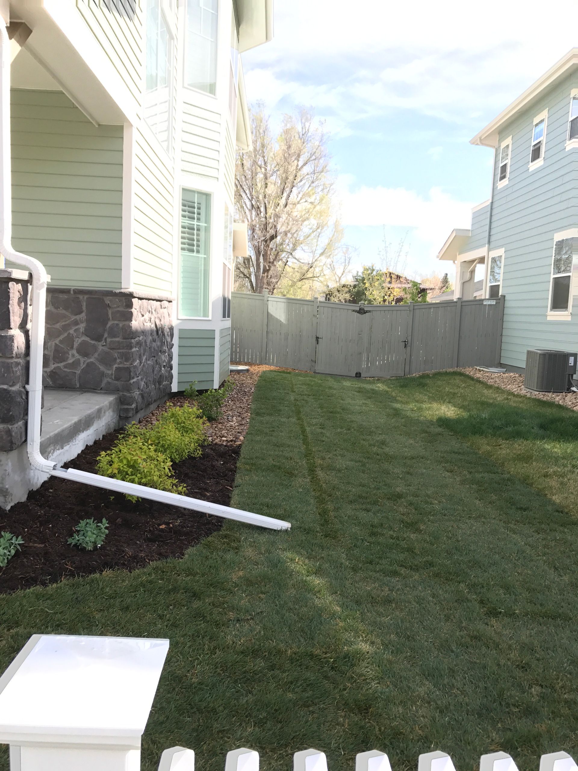 Full landscape remodel with decorative rock, plantings, sprinklers and grass. Lafayette, CO 2019