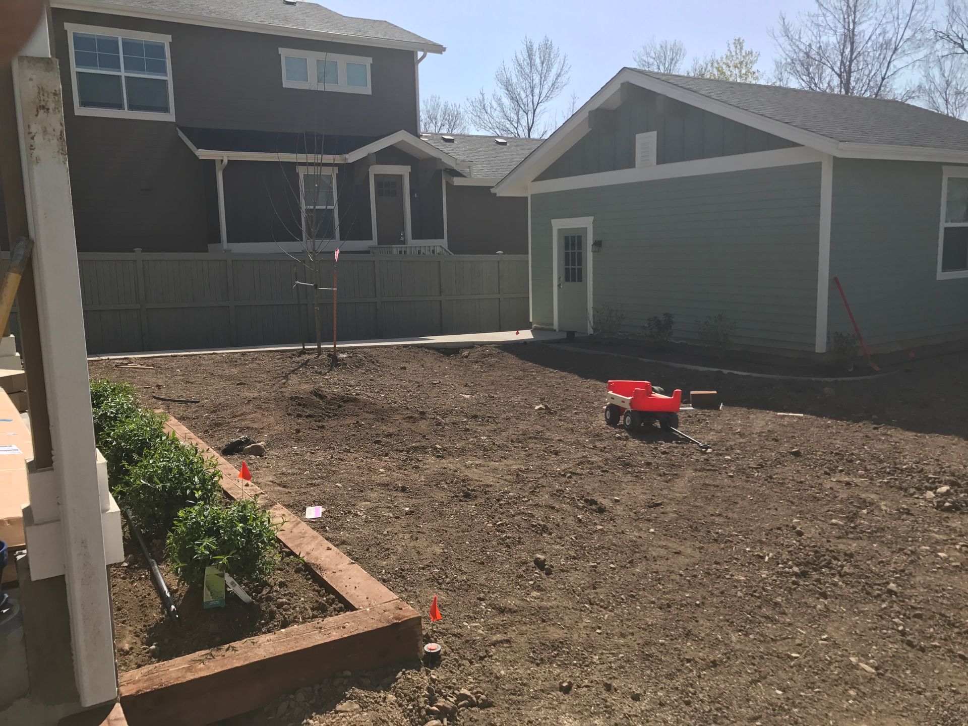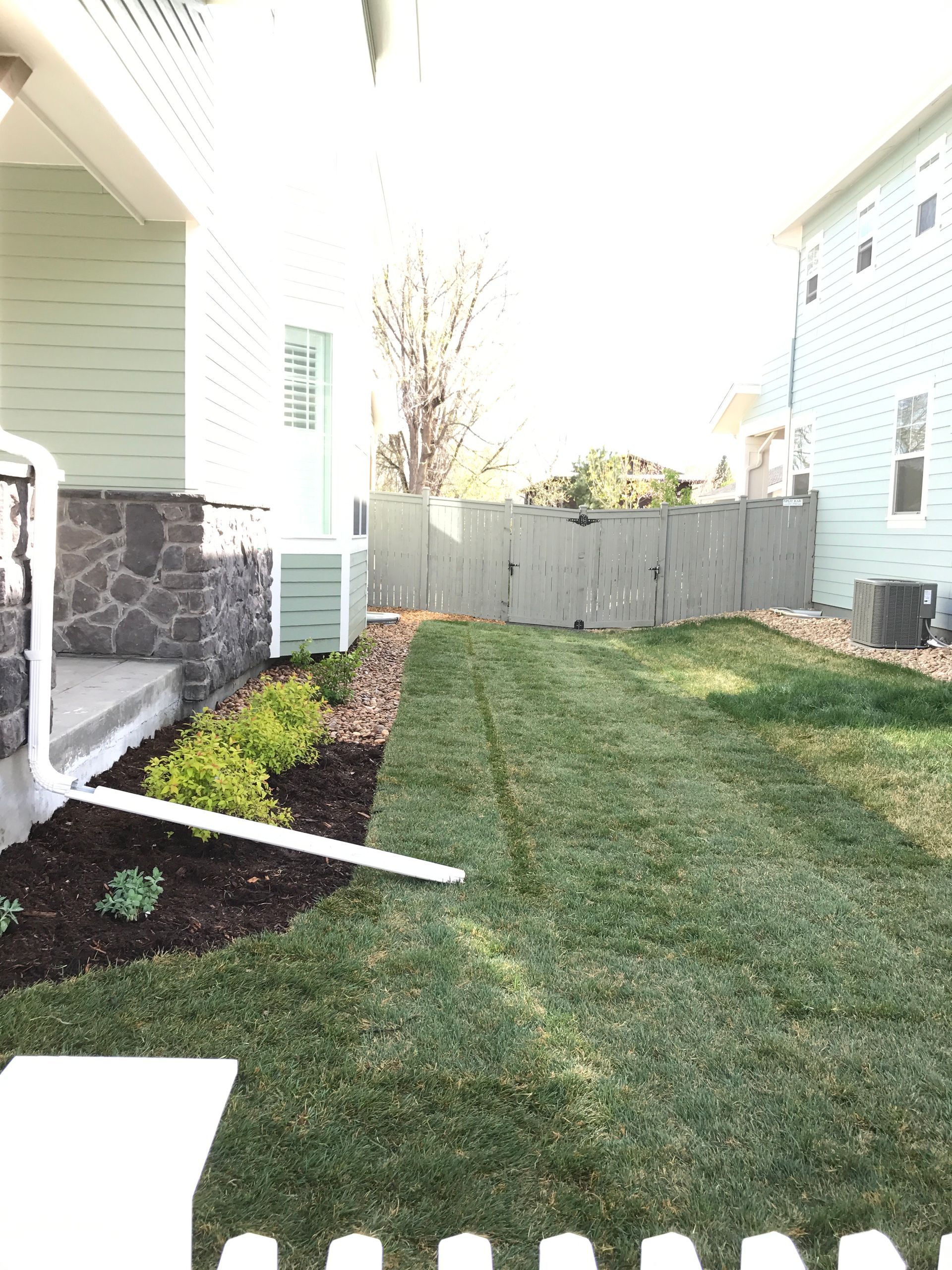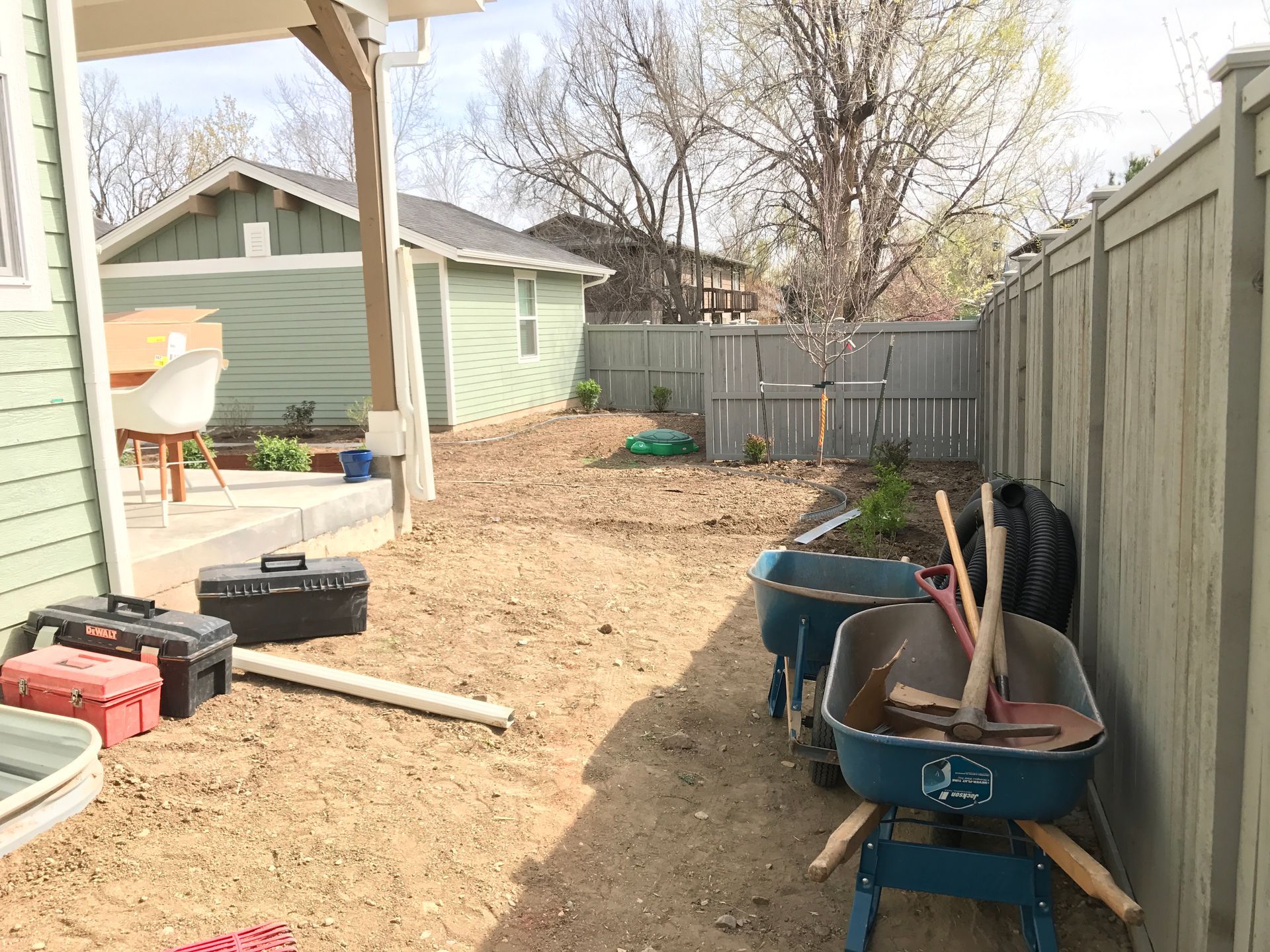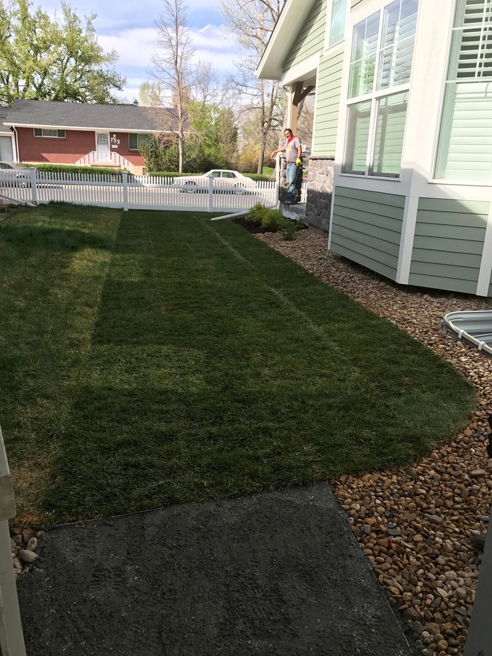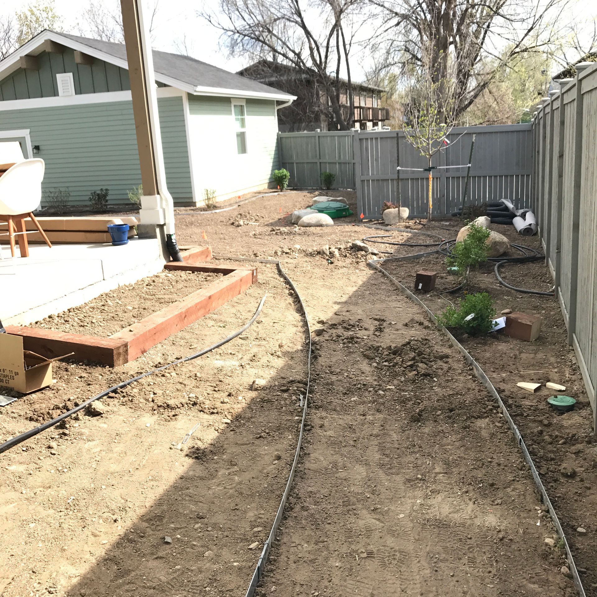 Full landscape remodel with decorative rock, plantings, sprinklers and grass. Lafayette, CO 2019